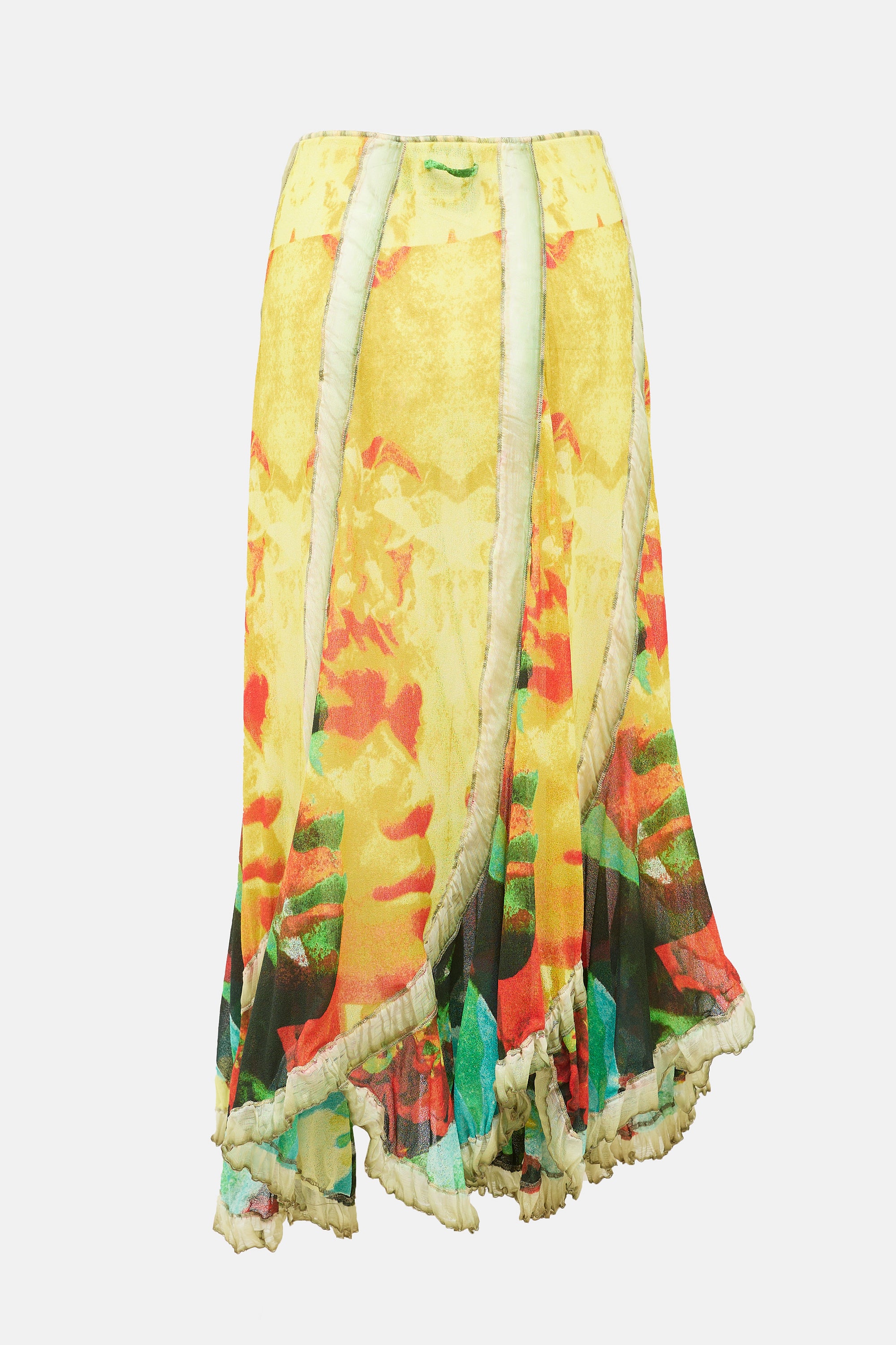 Pre-owned Jean Paul Gaultier Spring/Summer 2000 'Love Boat' yellow and multicolour sheer mesh skirt featuring psychedelic face print, elasticized waistband, gore design, and ruffle trim.