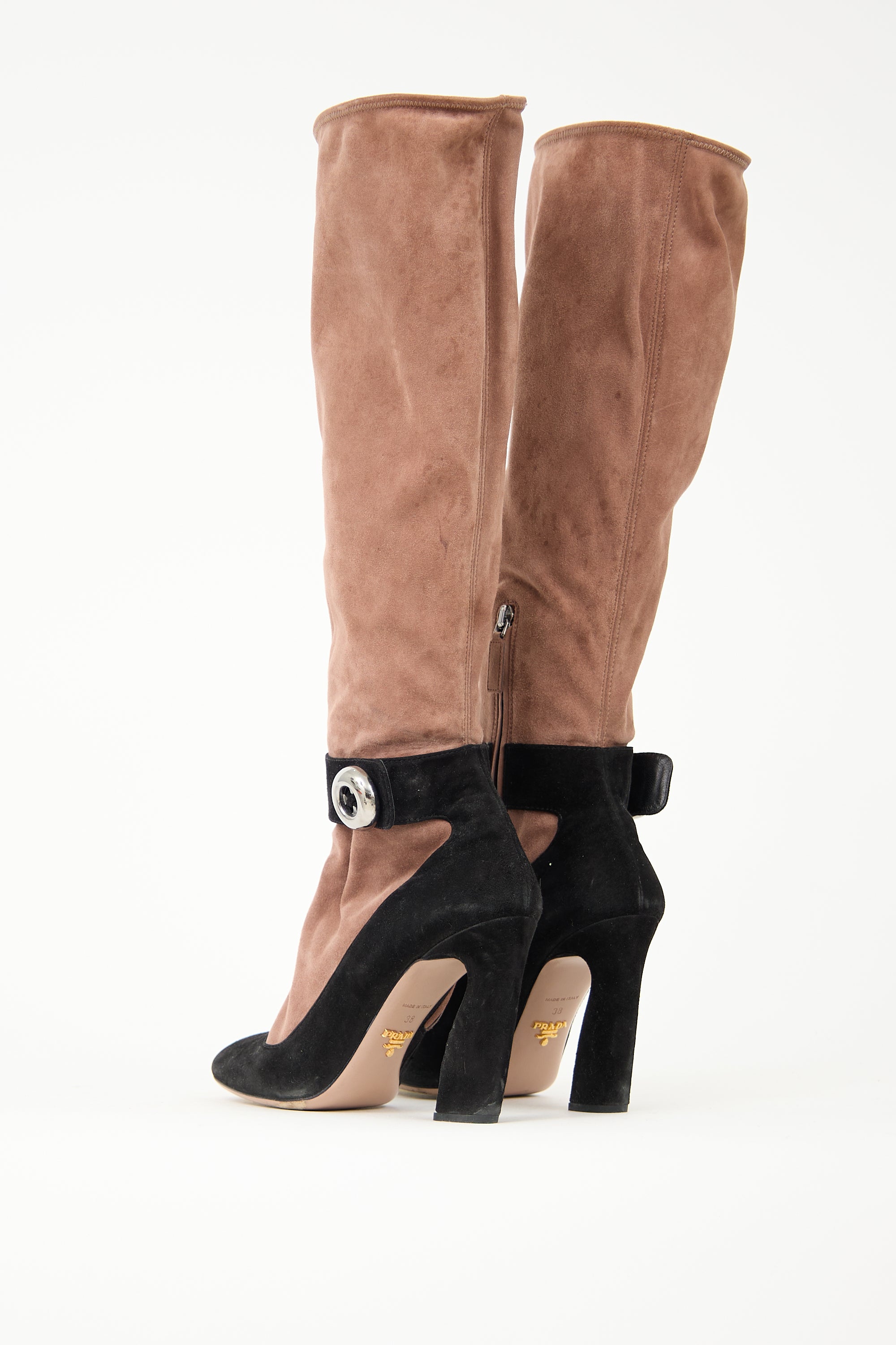 Pre-owned Prada Fall 2011 brown and black suede boots featuring rounded toe, Mary Jane trompe l'oeil, decorative silver tone buckle, zip closure at inner side, pull on entry, and slim block heel.