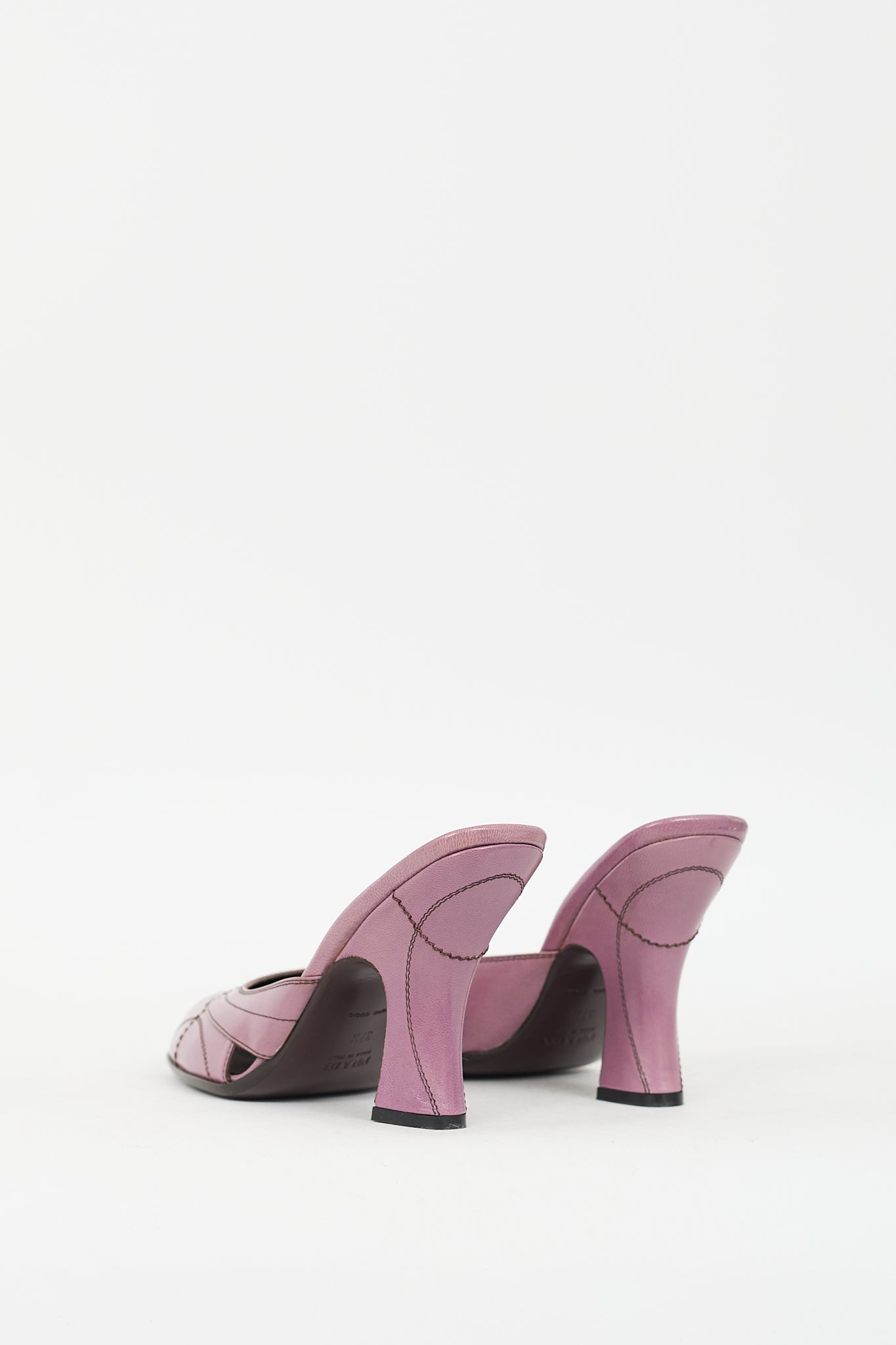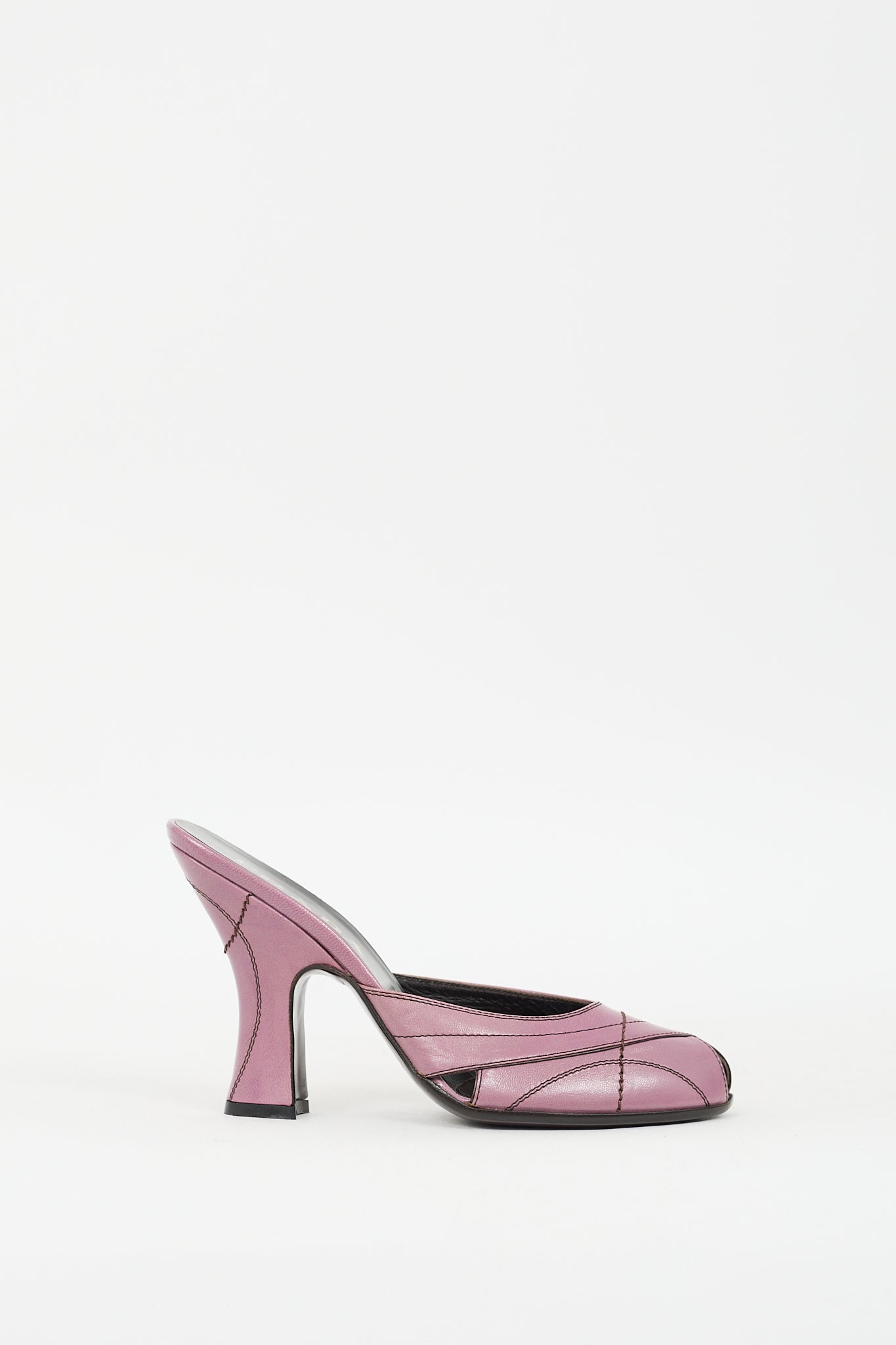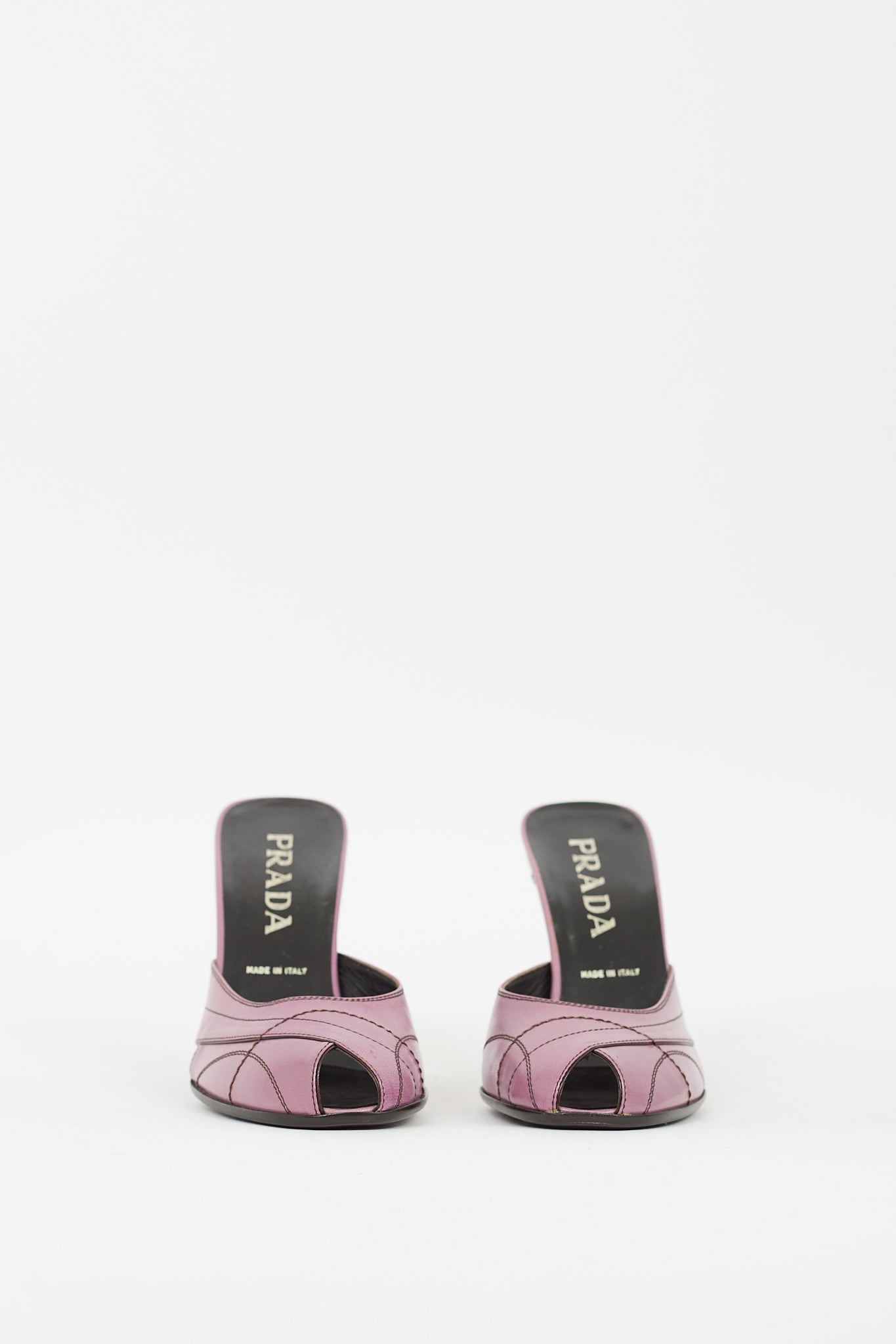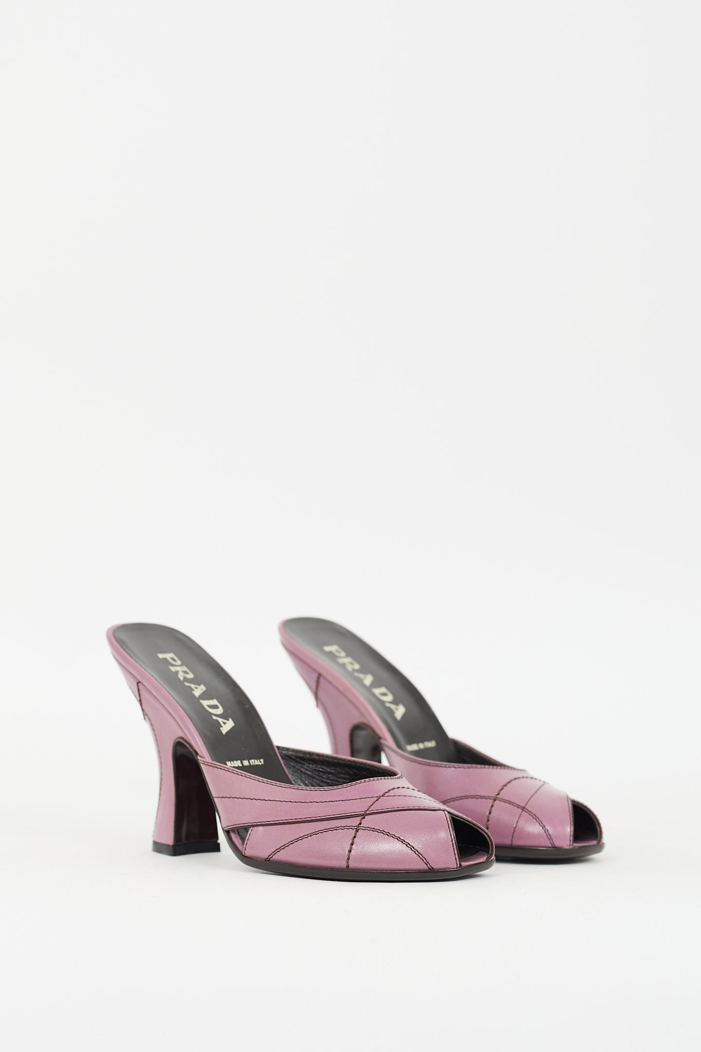 Pre-owned Prada purple leather heels featuring almond peep toe, tonal stitching throughout, side cut out, covered comma block heel, and slip on entry. Comes with original dust bag.