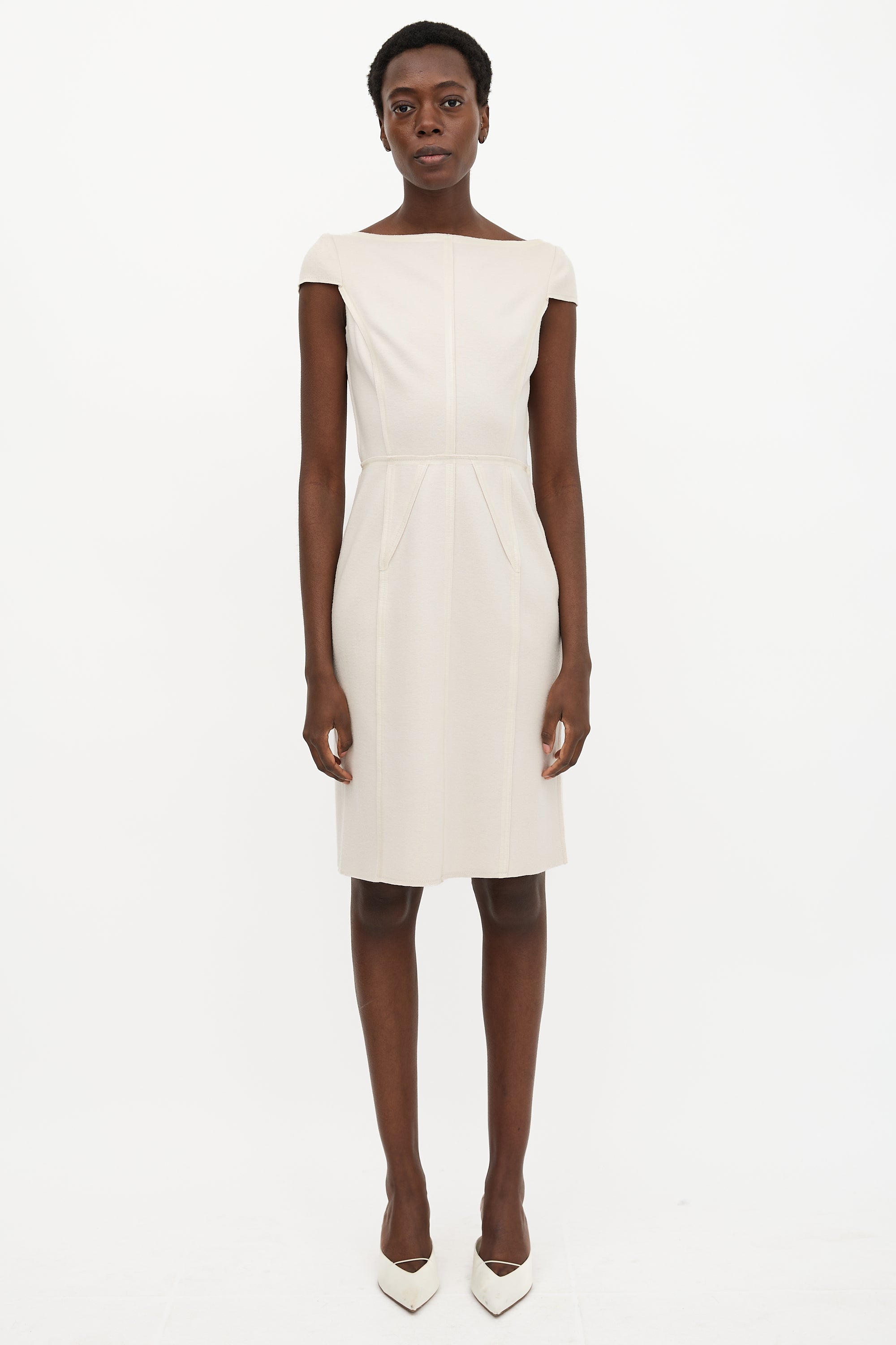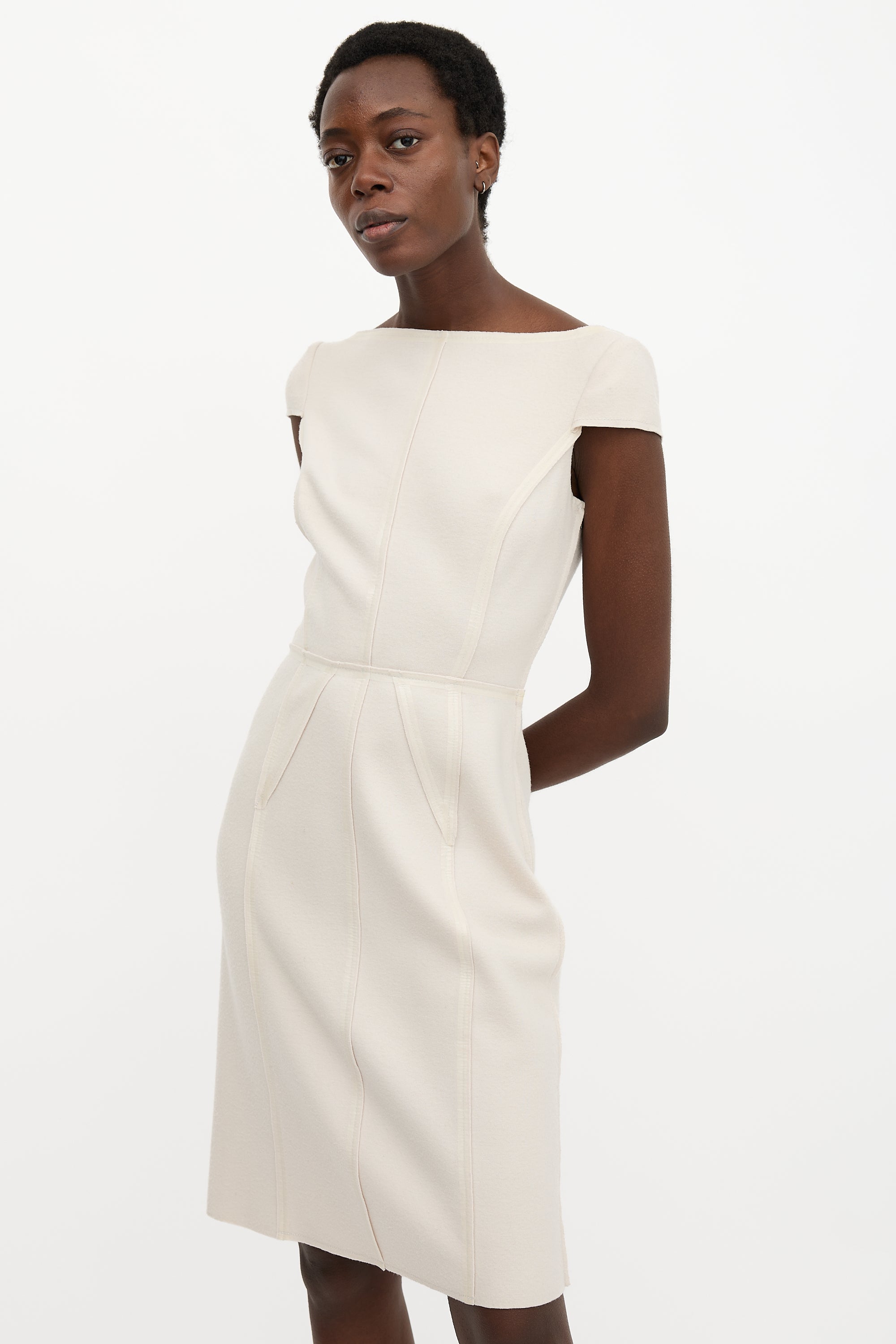 Pre-owned Prada vintage beige knit midi dress featuring inverted seams with tonal coating, bateau neckline, cap sleeves, and concealed side zip. Unlined.