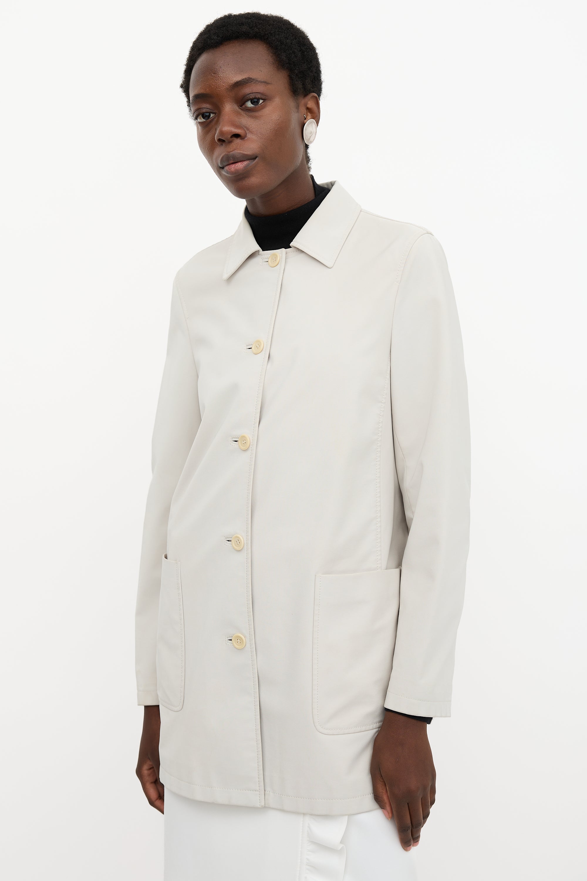 Pre-owned Prada vintage beige jacket featuring a spread collar, button front, patch pockets, back strap, and back vent. Lined. c. 2000s.