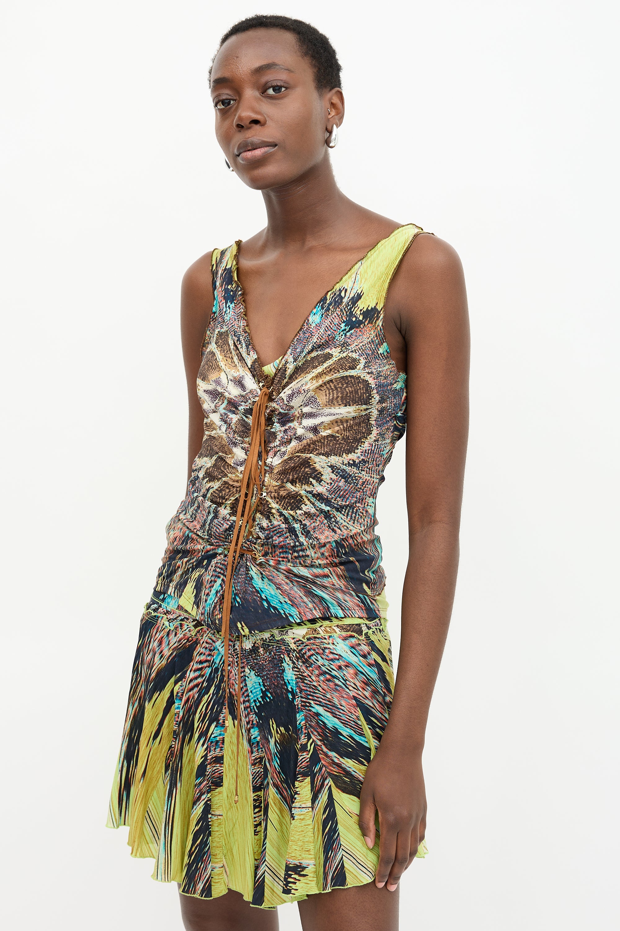 Pre-owned Roberto Cavalli Spring 2004 silk blend tank top featuring multicolour abstract print, ruched front, front and back lace up details, and ruffle trim.