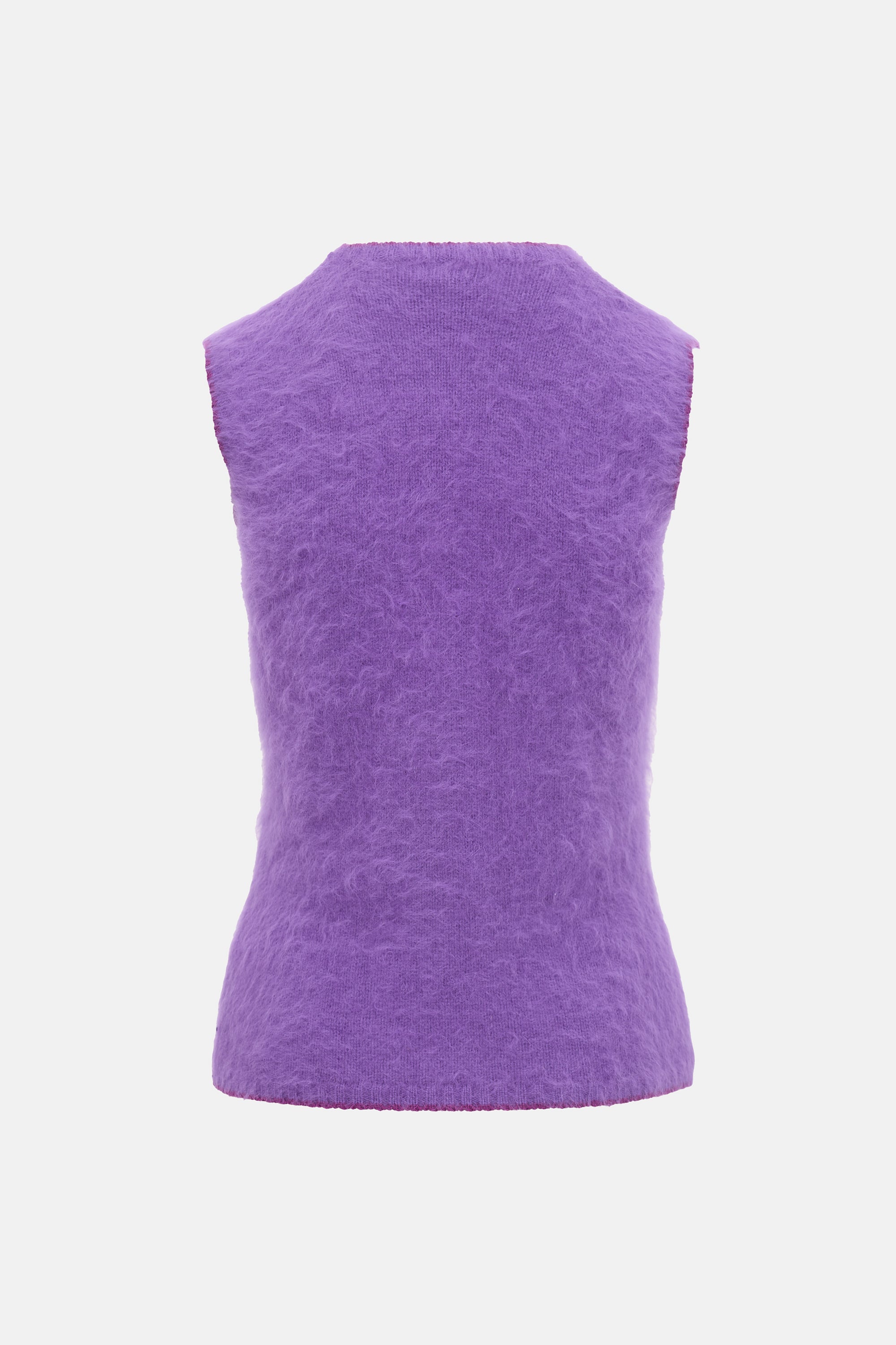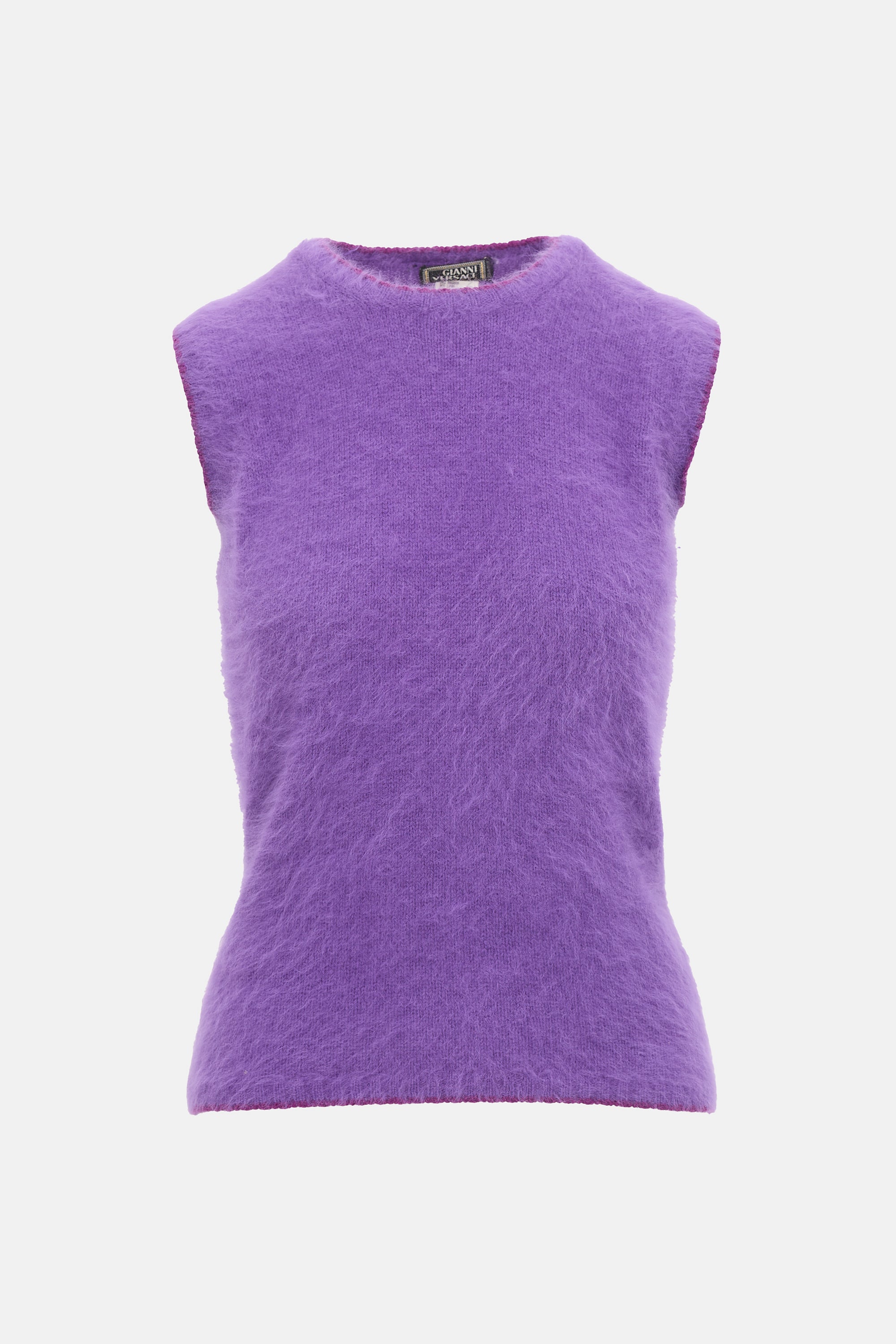 Pre-owned Gianni Versace 1990's purple angora sweater vest featuring a crew neckline, dark purple trimmed edges, and a ribbed hem and cuffs.