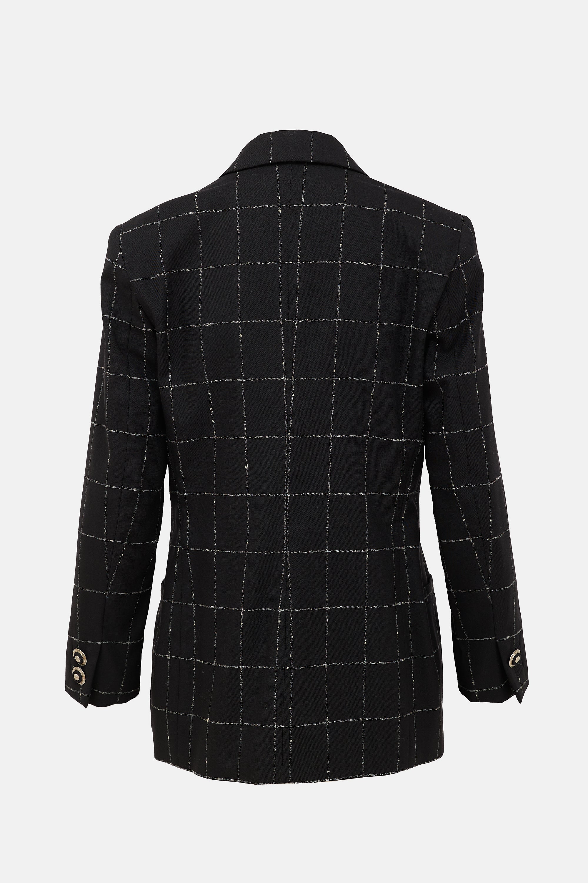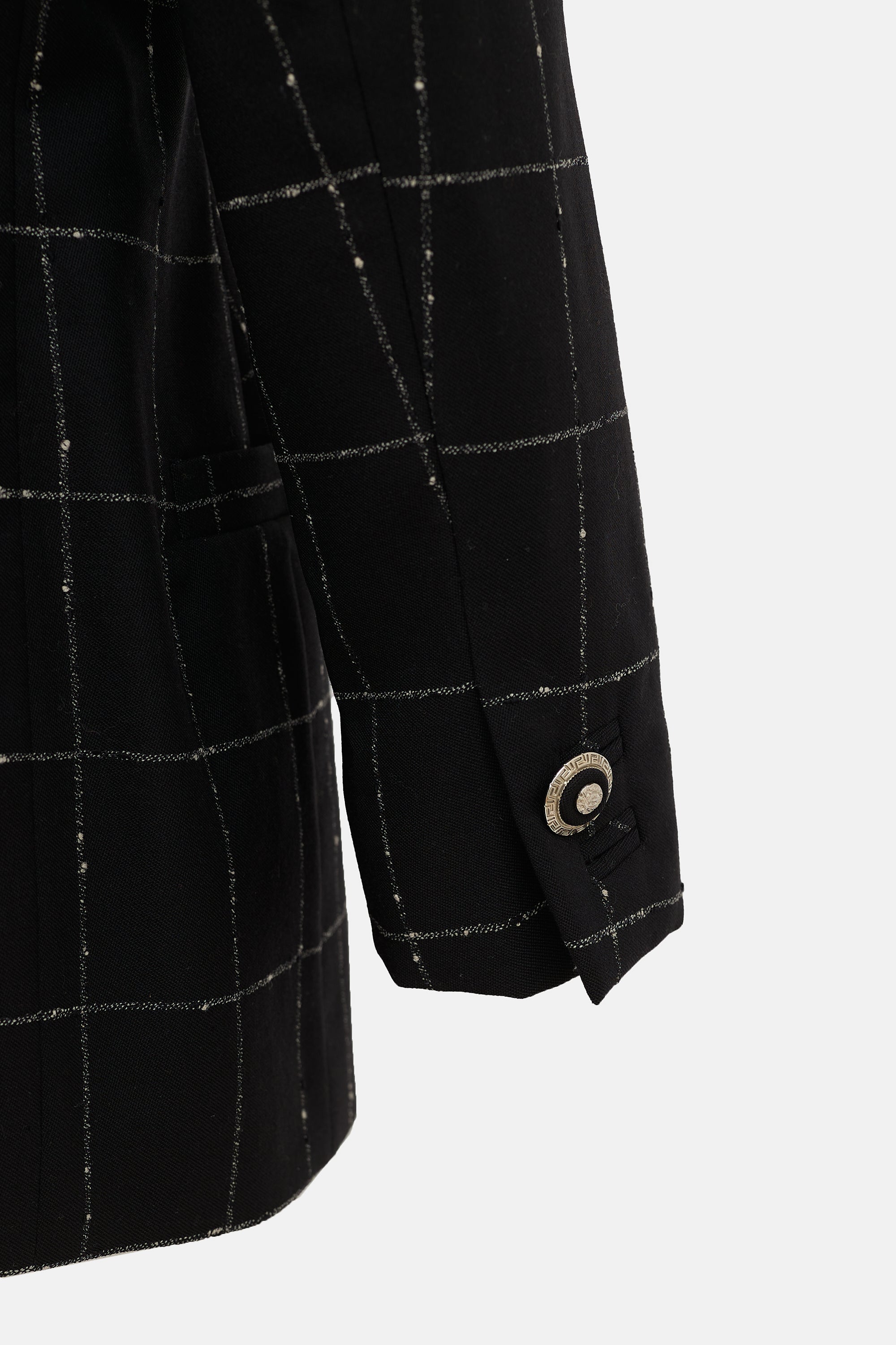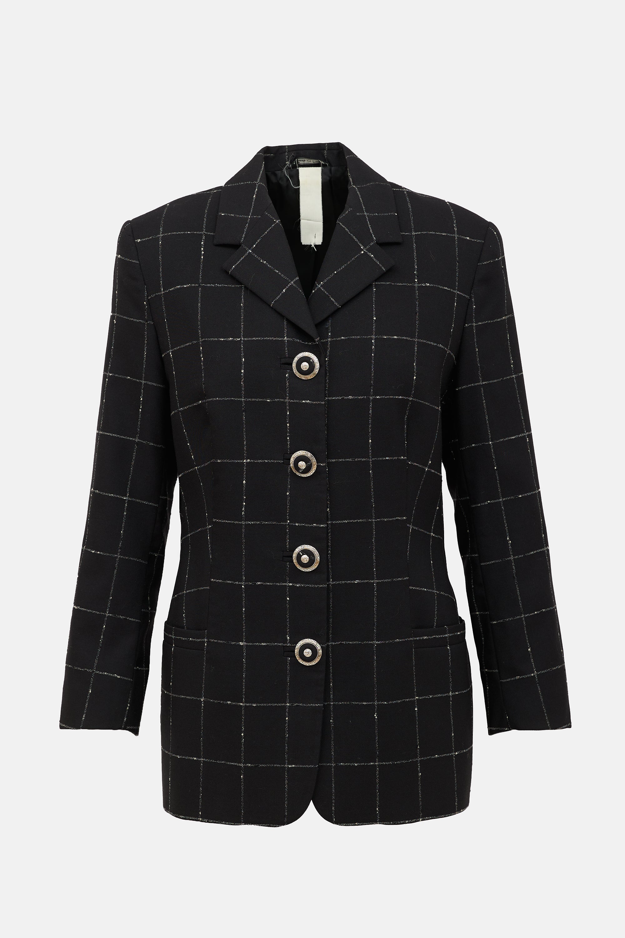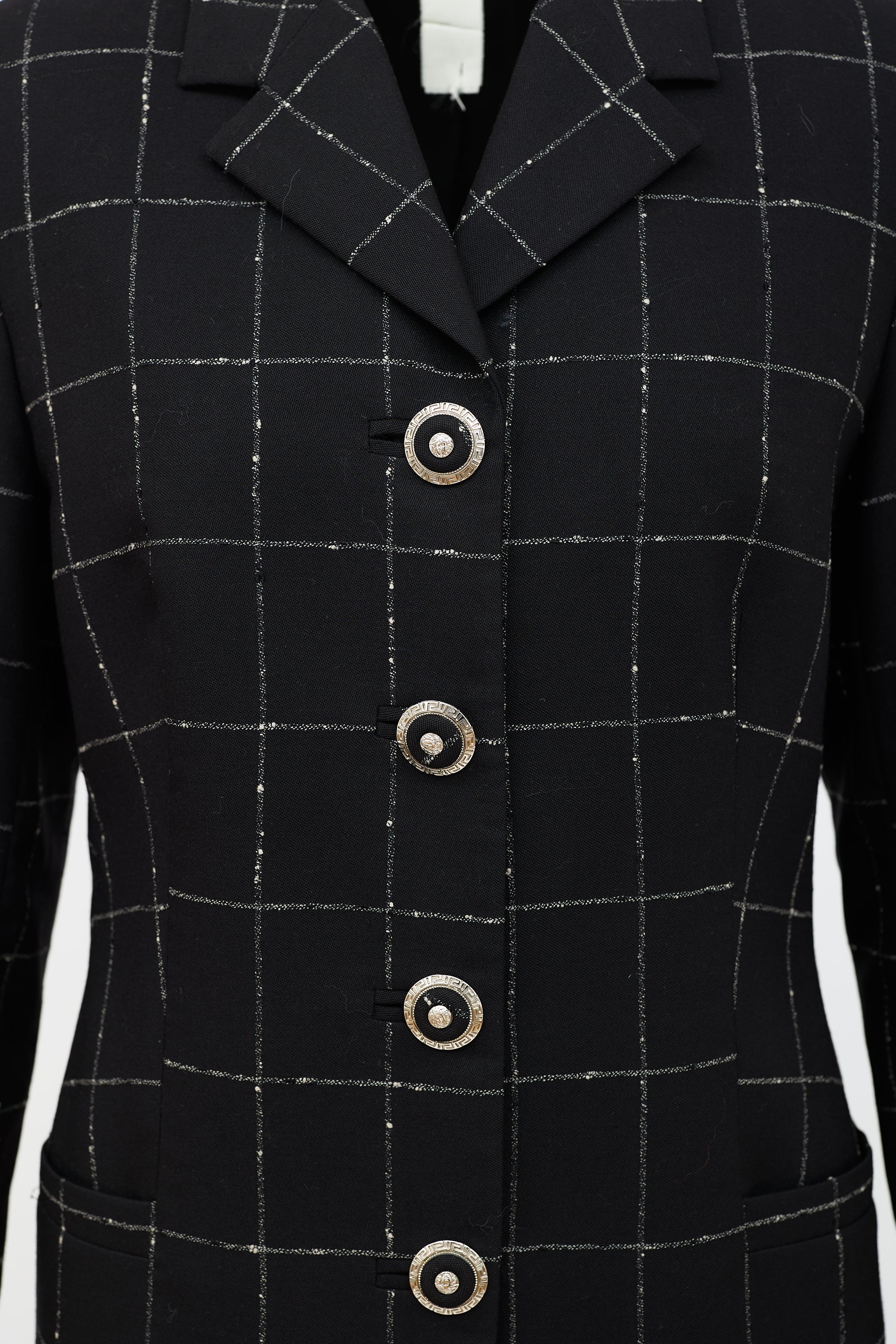 Pre-owned Gianni Versace Collection Fall/Winter 1995 black blazer featuring white checked pattern, silver tone Medusa button front, buttoned cuffs, and two patch pockets. Lined. Gianni Versace era design.