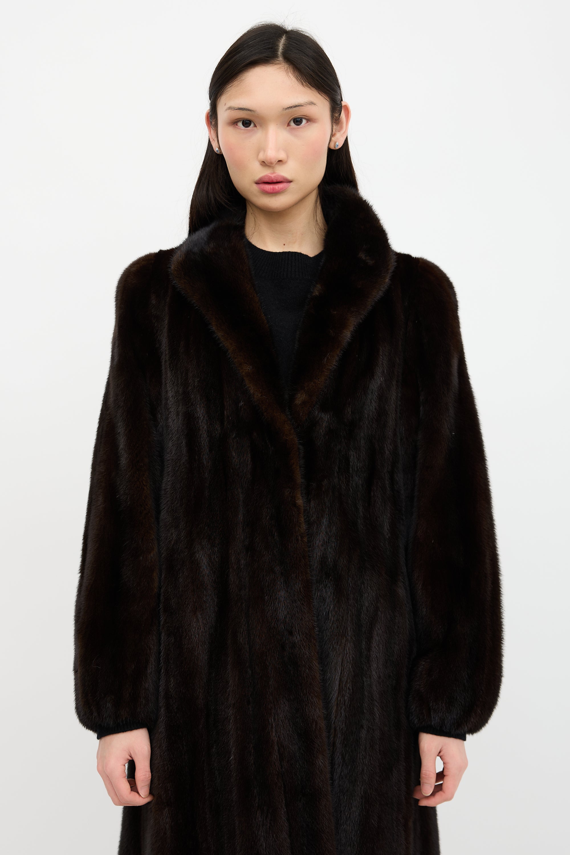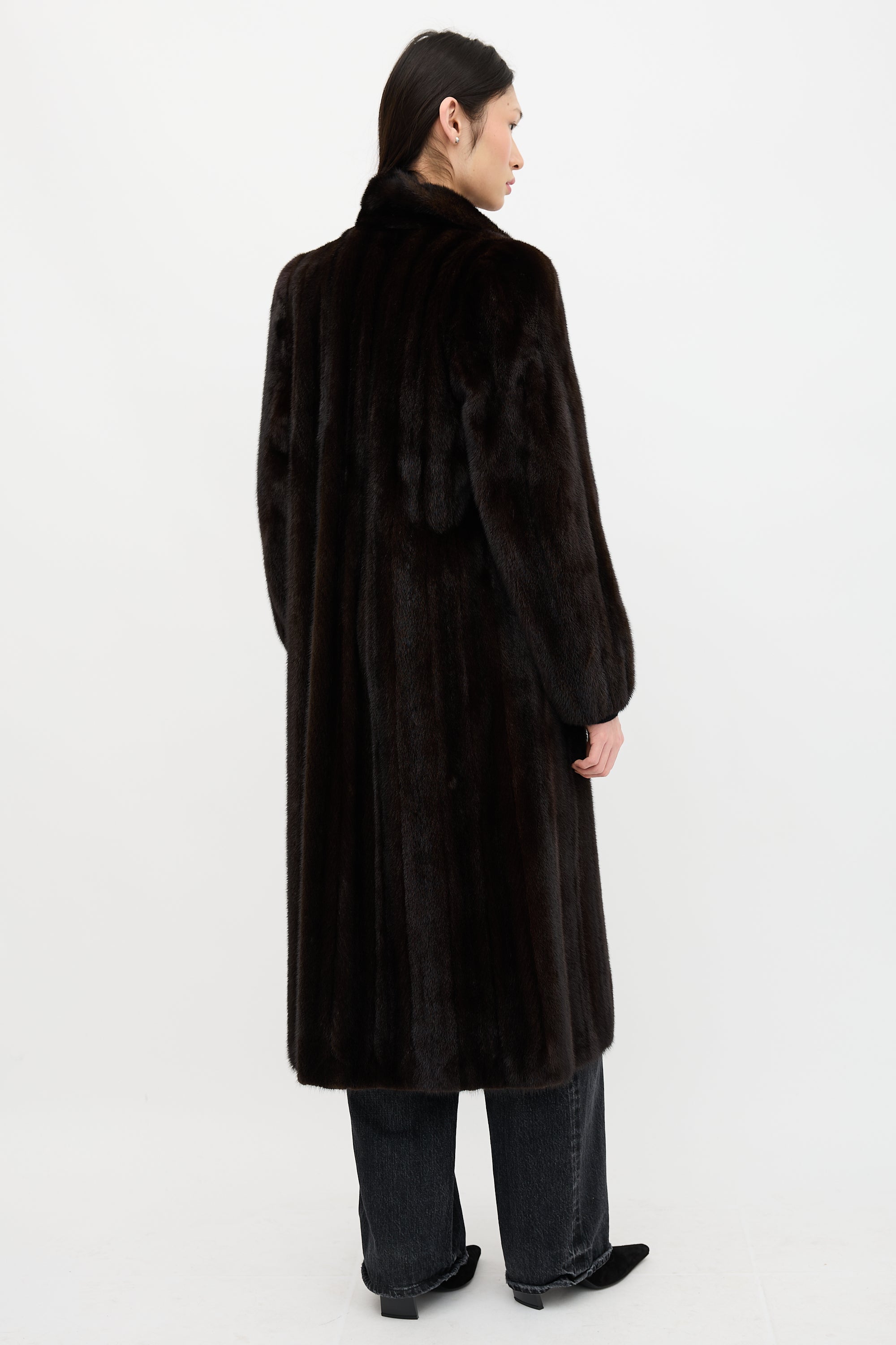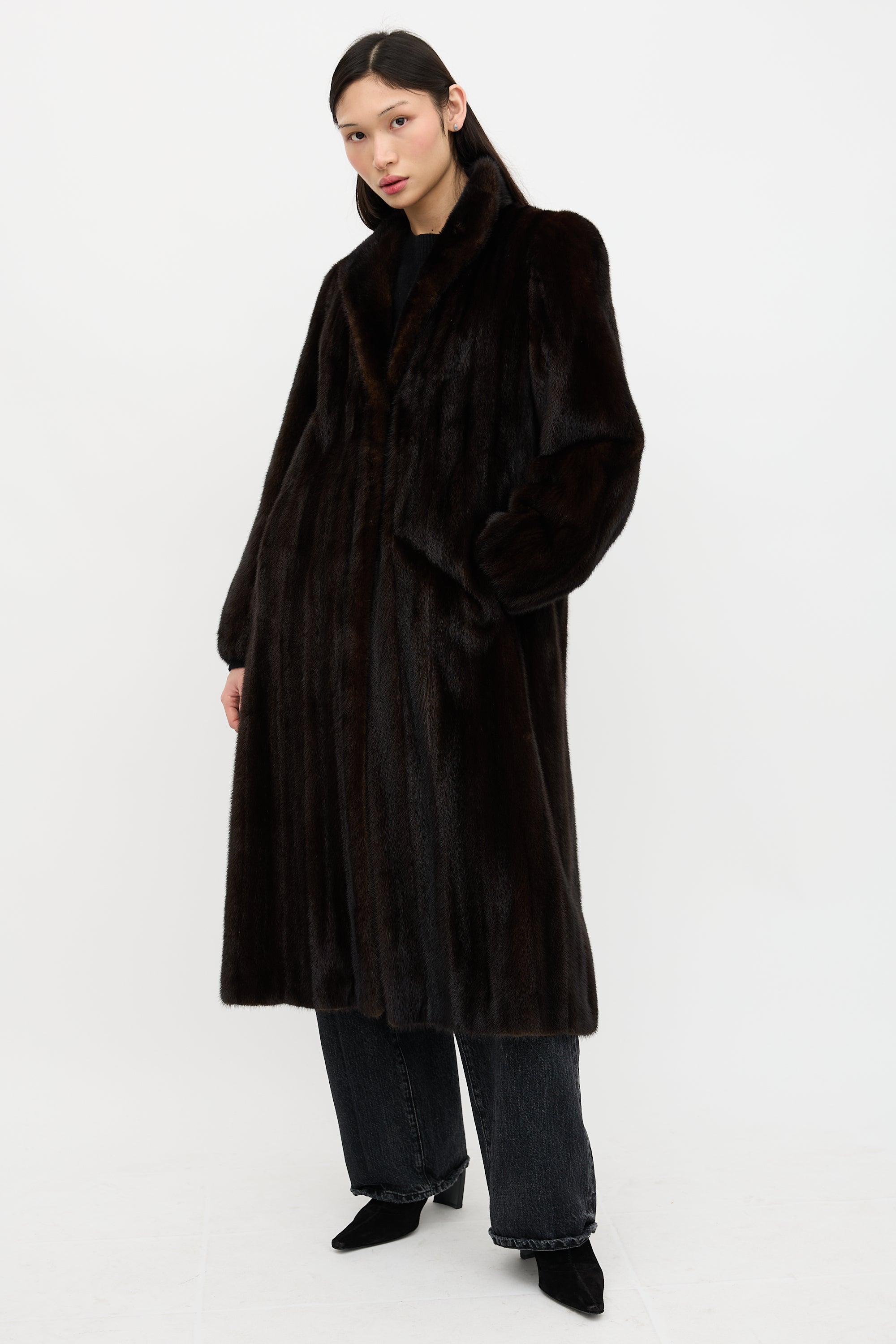 Pre-owned Creeds brown mink fur coat featuring a shawl collar, padded collar, hook and eye front closure, and in seam pockets. Lined.