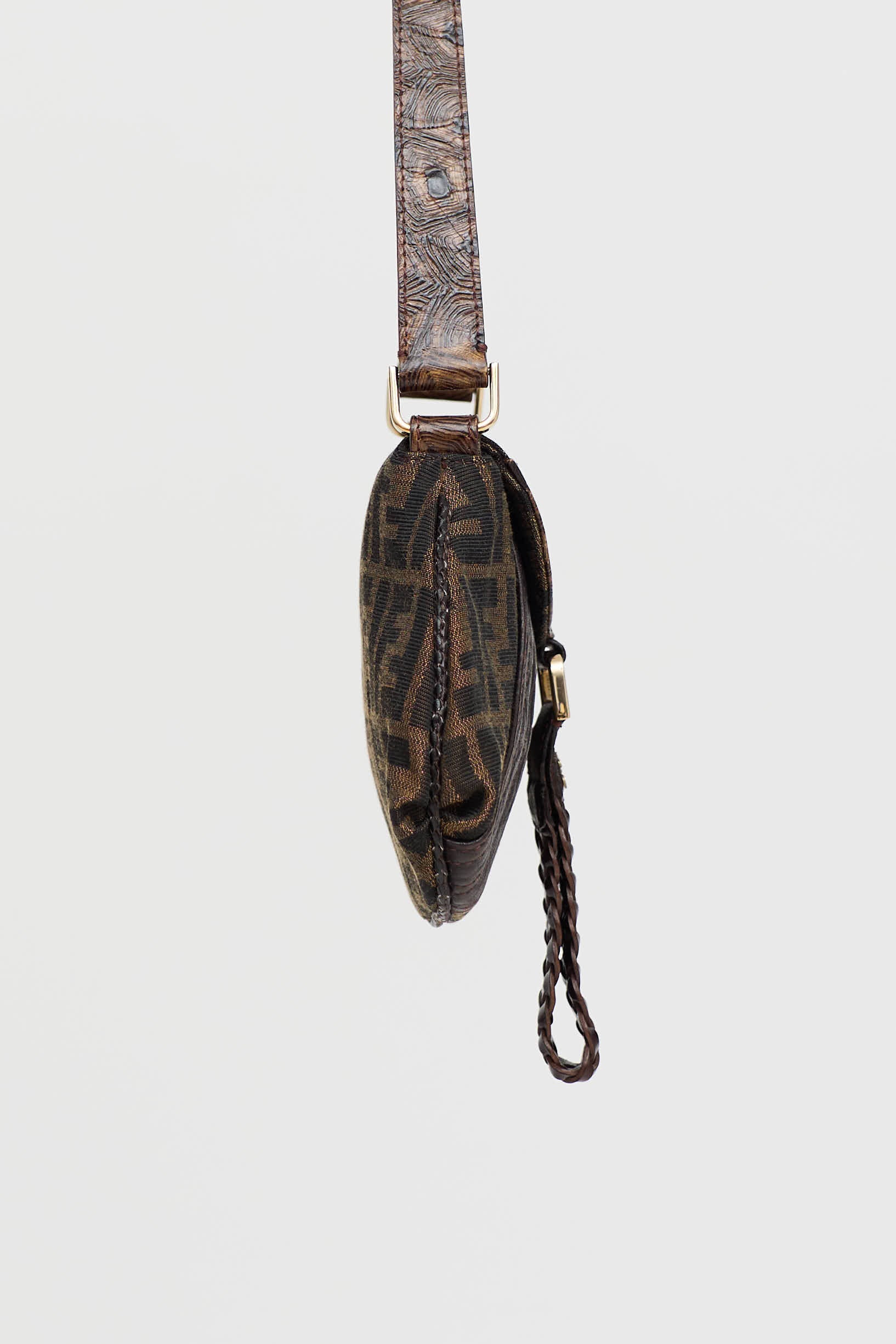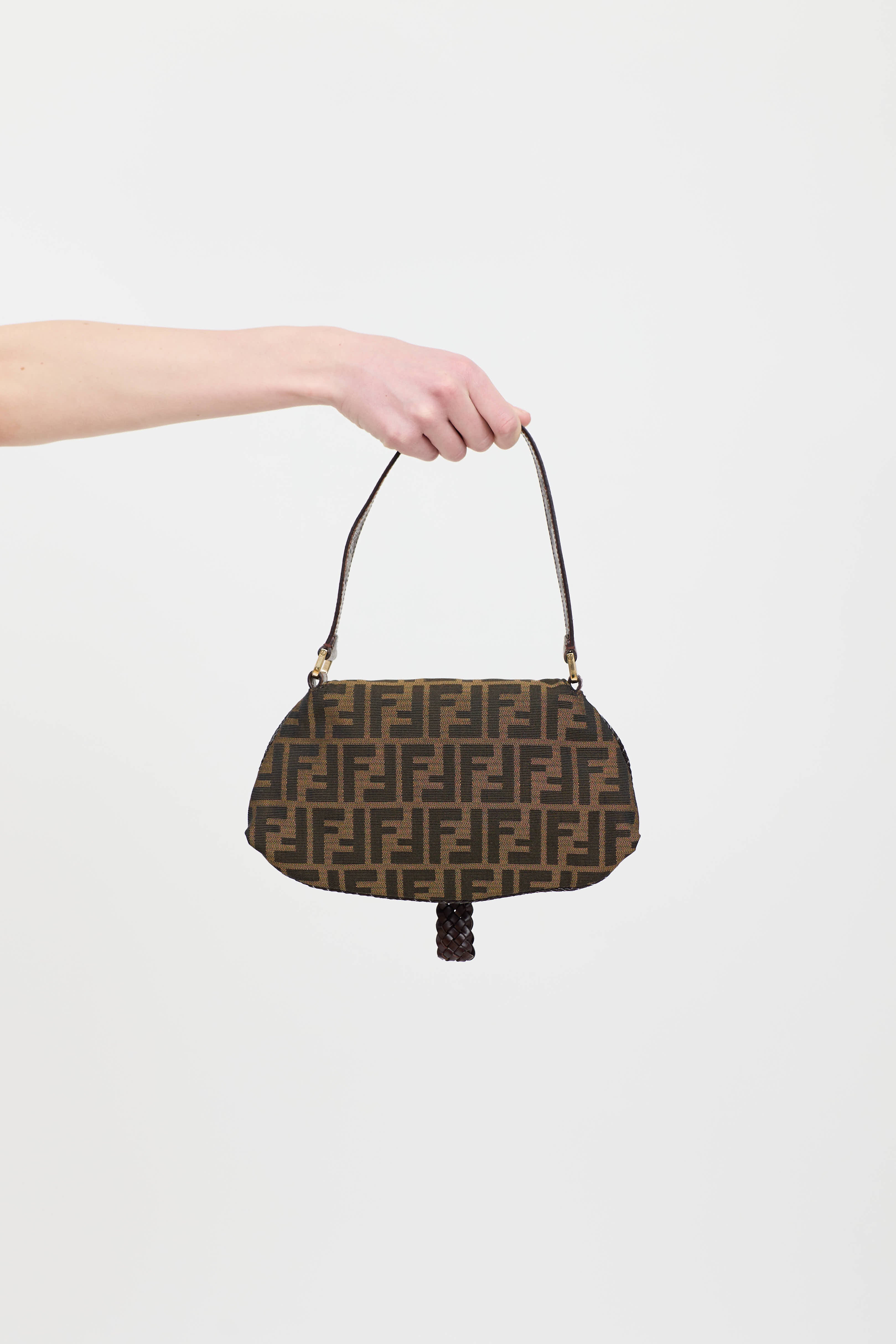 Pre-owned Fendi brown Spy mini bag featuring tonal zucca monogram throughout, tonal tortoise trim, top flap, one main compartment with one slip pocket, and magnetic snap closure with braided logo pull tab. Includes original dust bag.