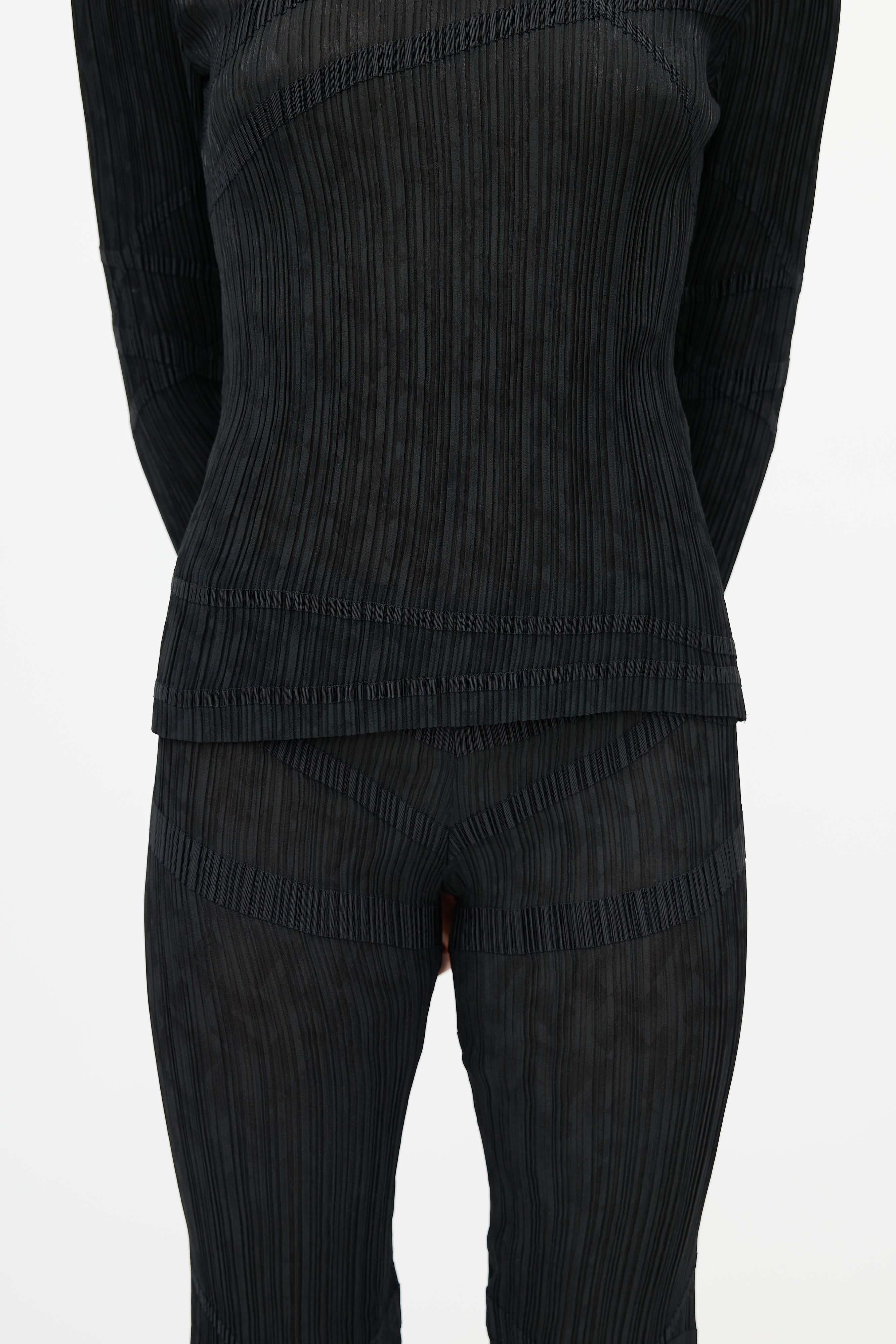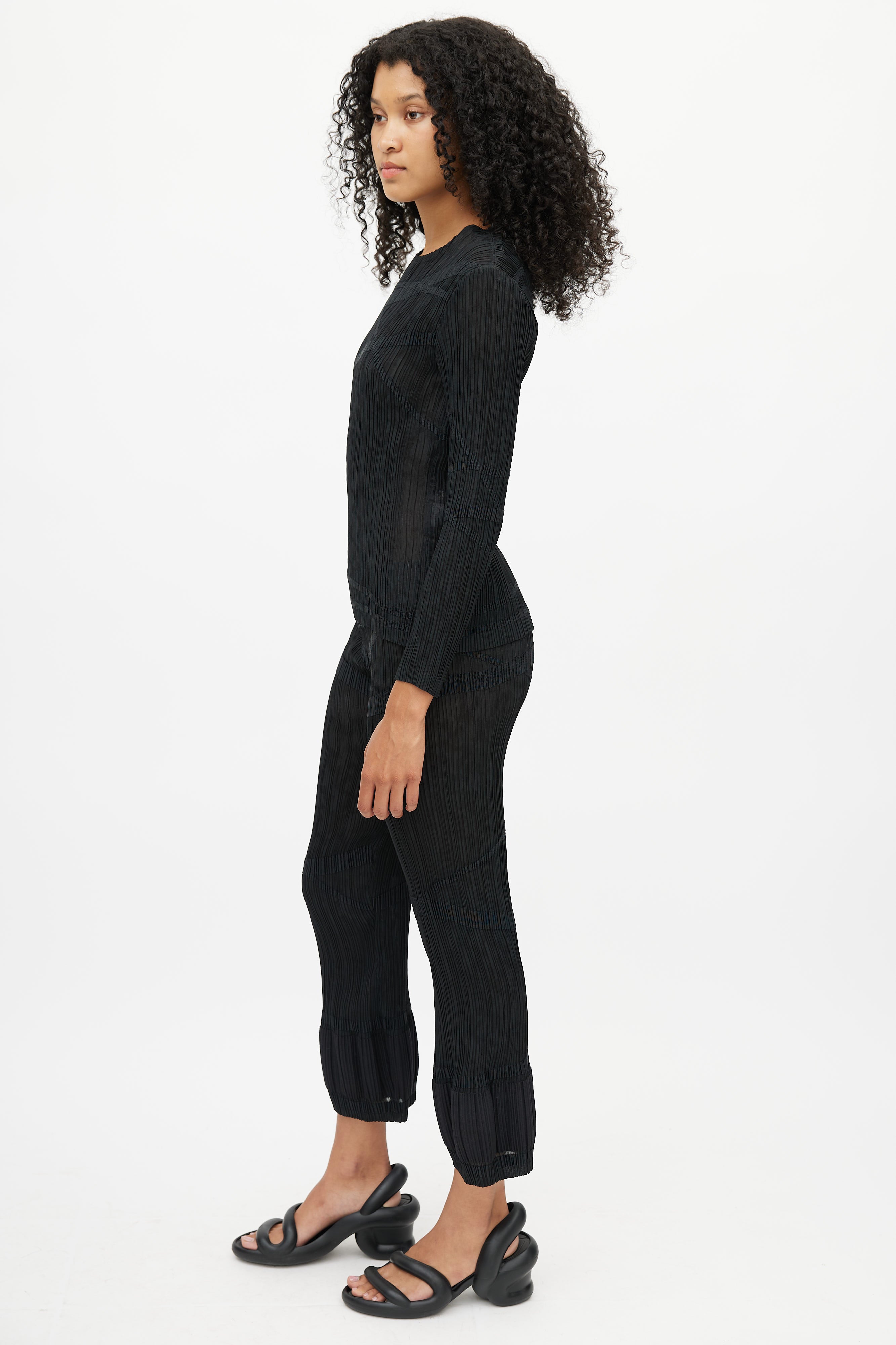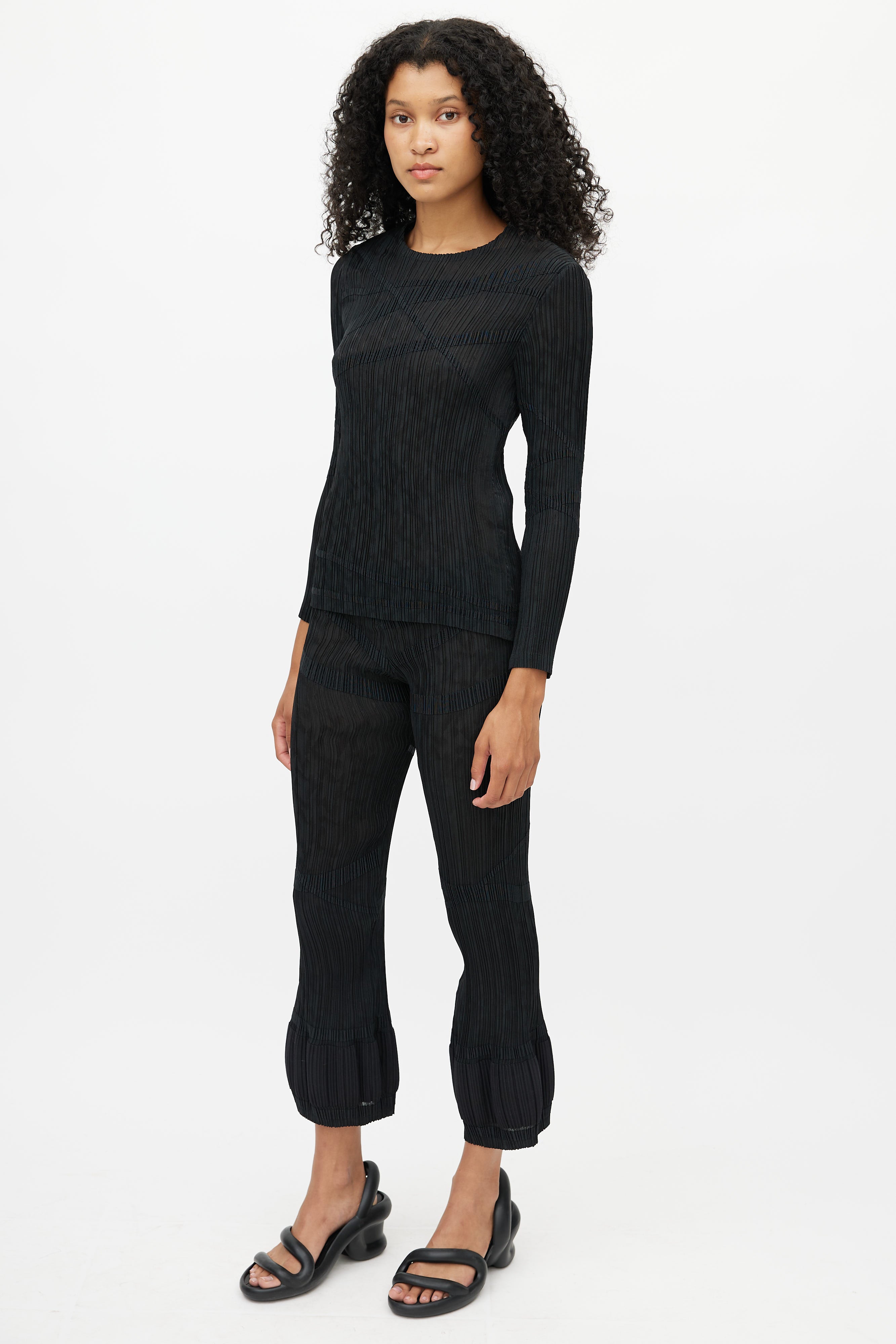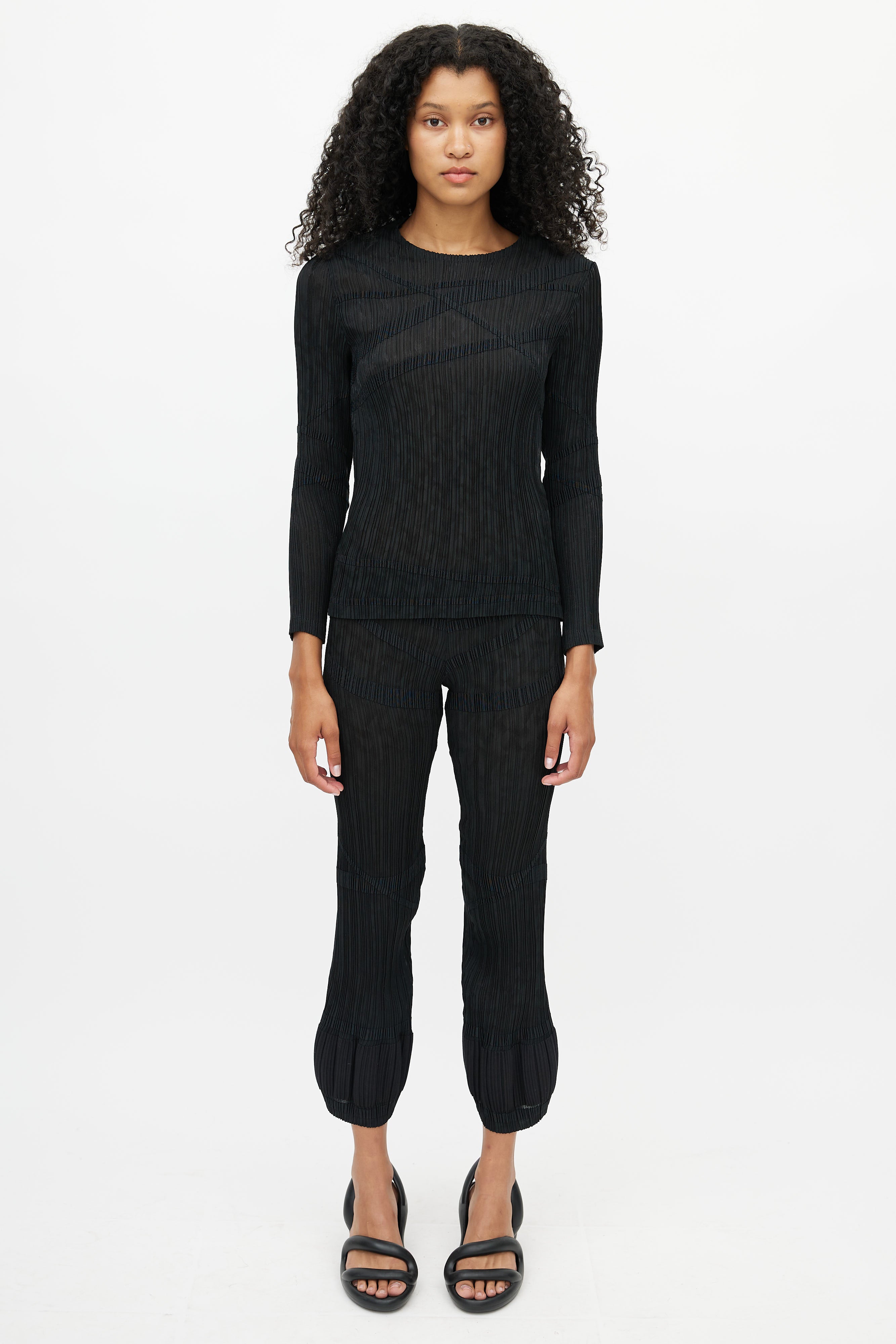 Pre-owned Issey Miyake black top featuring round neckline, plisse throughout, and criss cross grosgrain trim throughout. Matching pants featuring elasticized waist and flared hem.