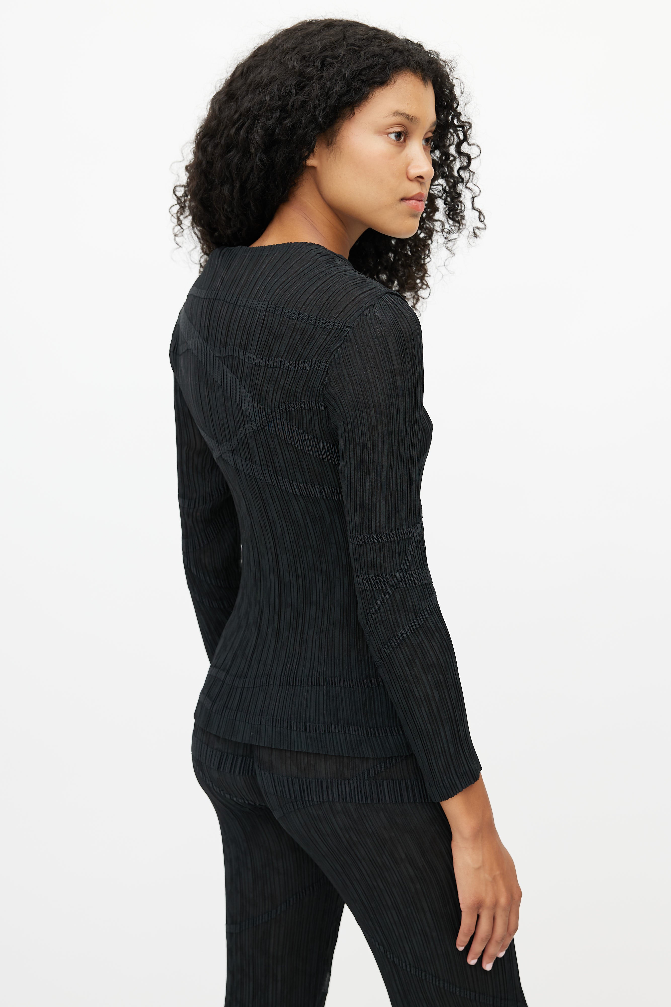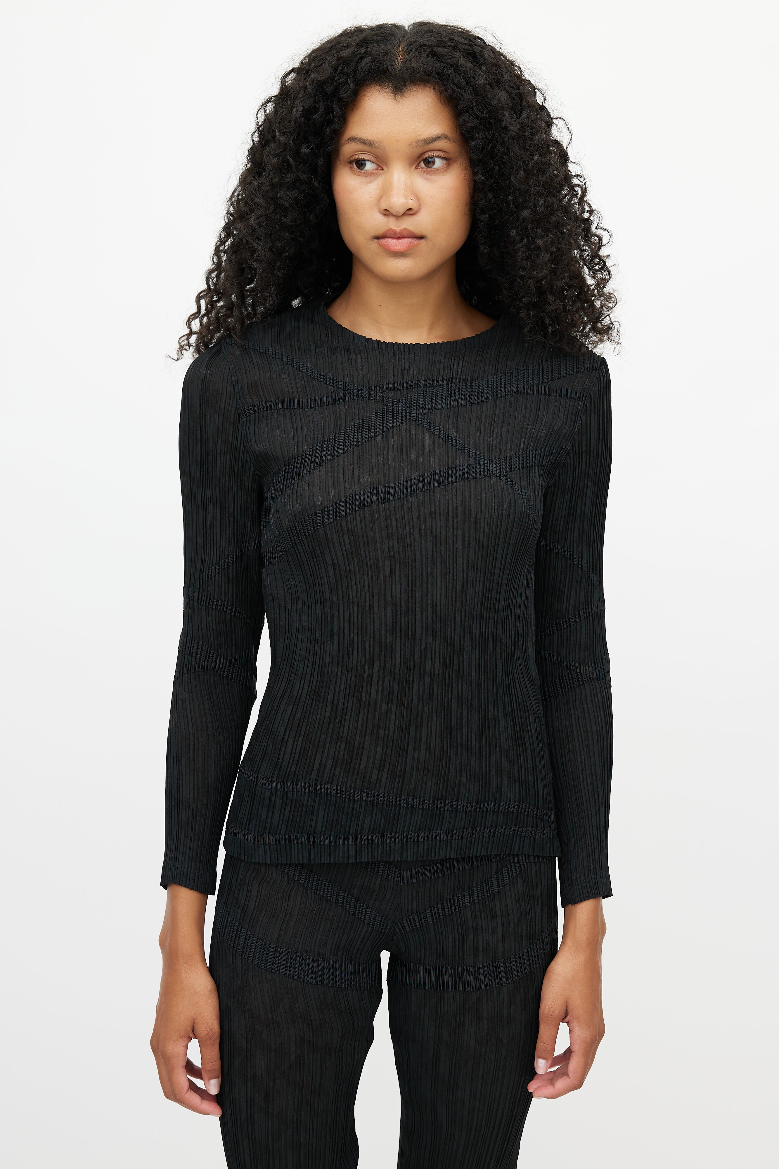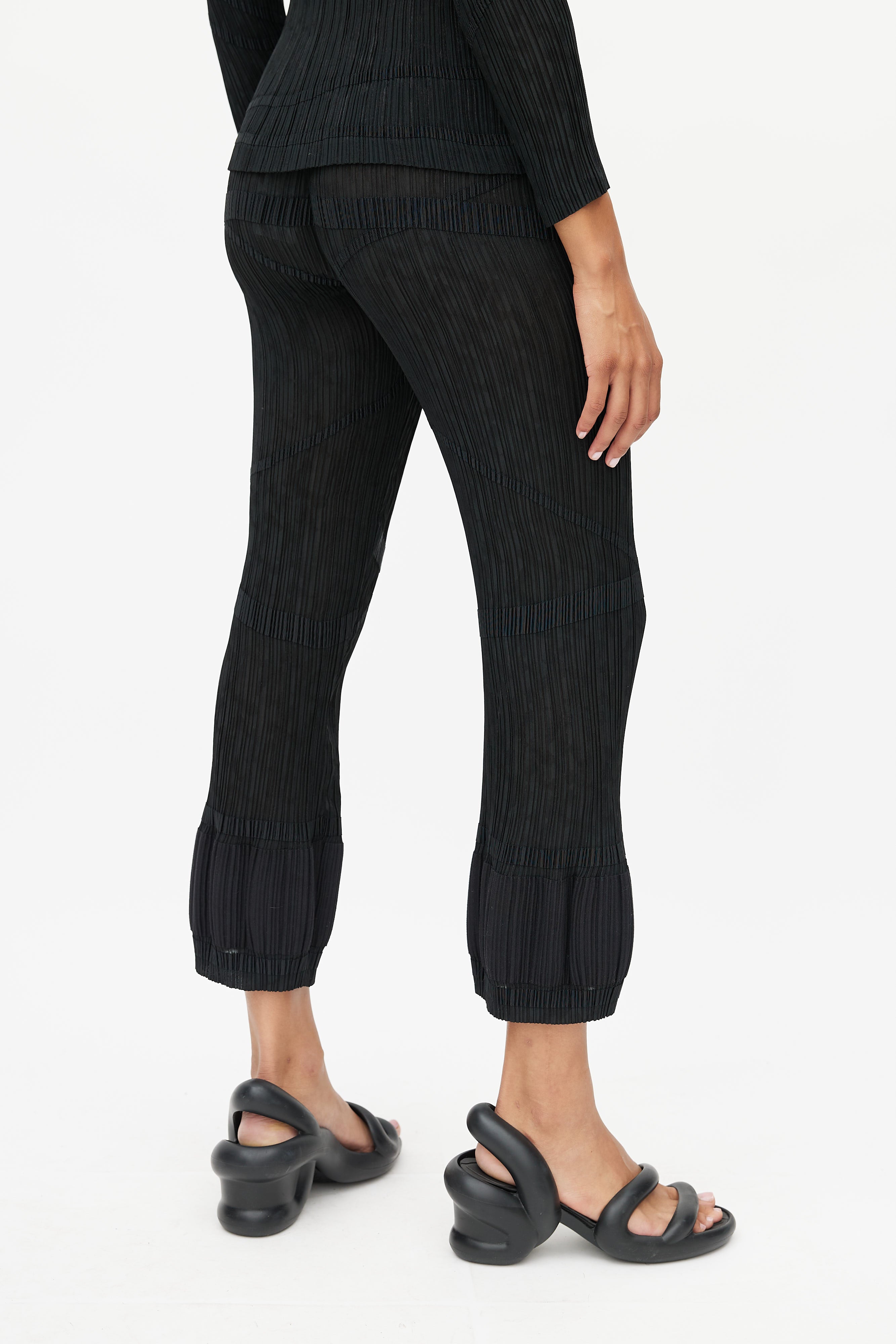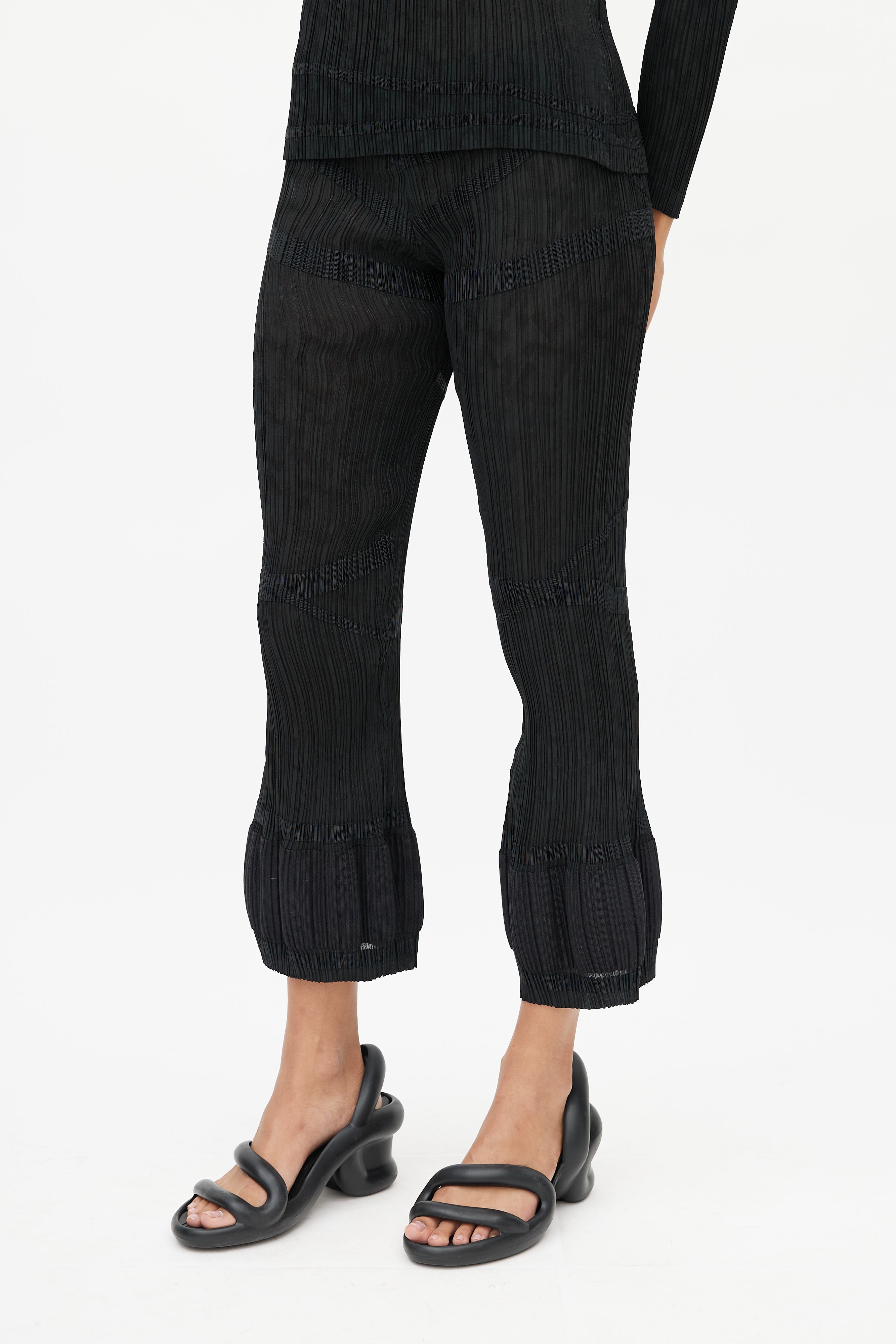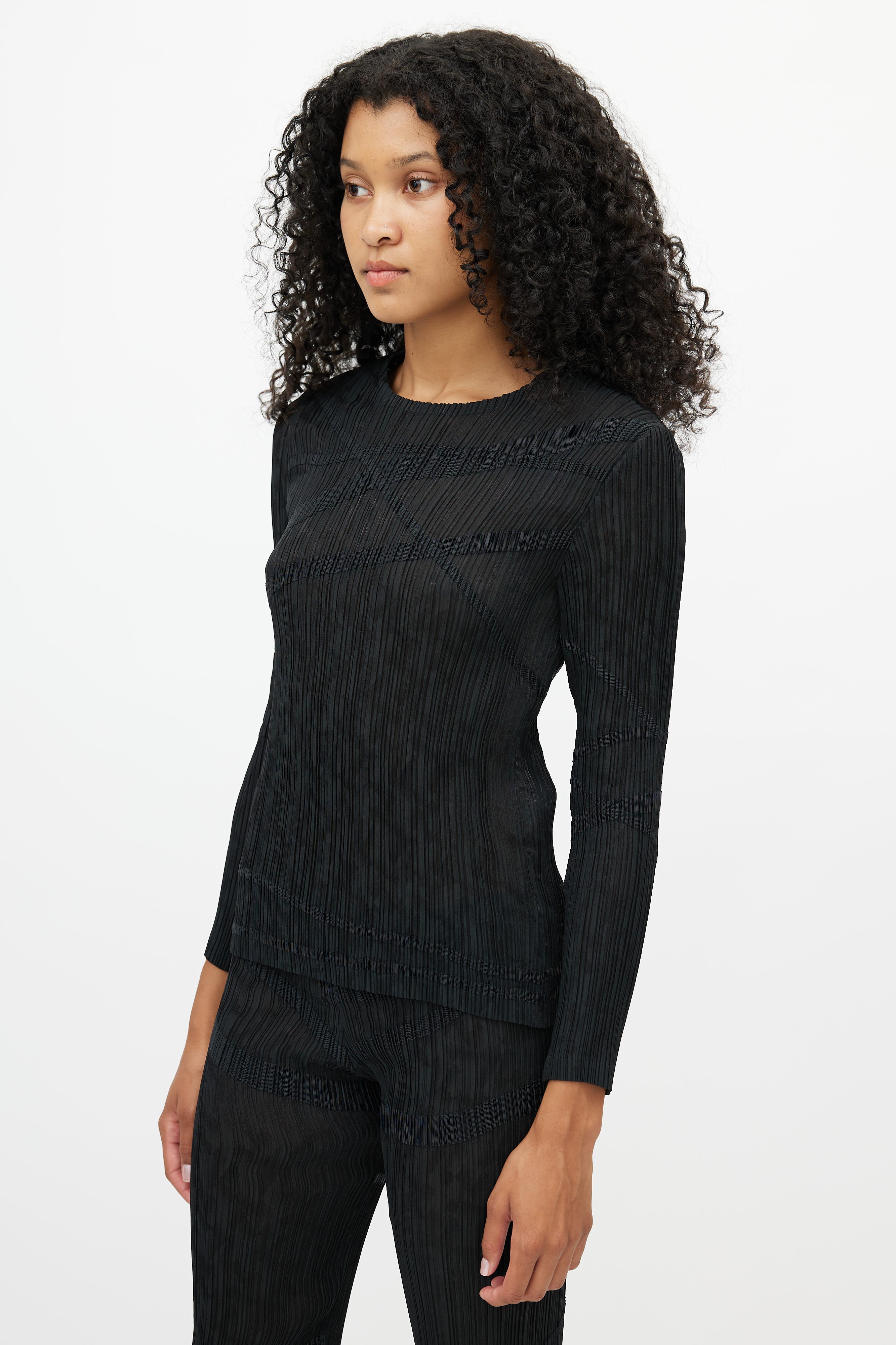 Pre-owned Issey Miyake black top featuring round neckline, plisse throughout, and criss cross grosgrain trim throughout. Matching pants featuring elasticized waist and flared hem.