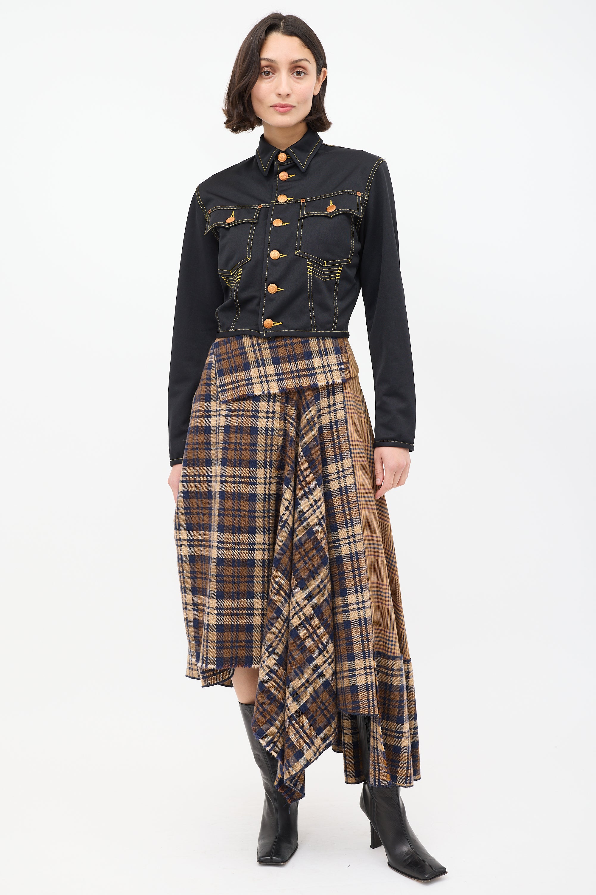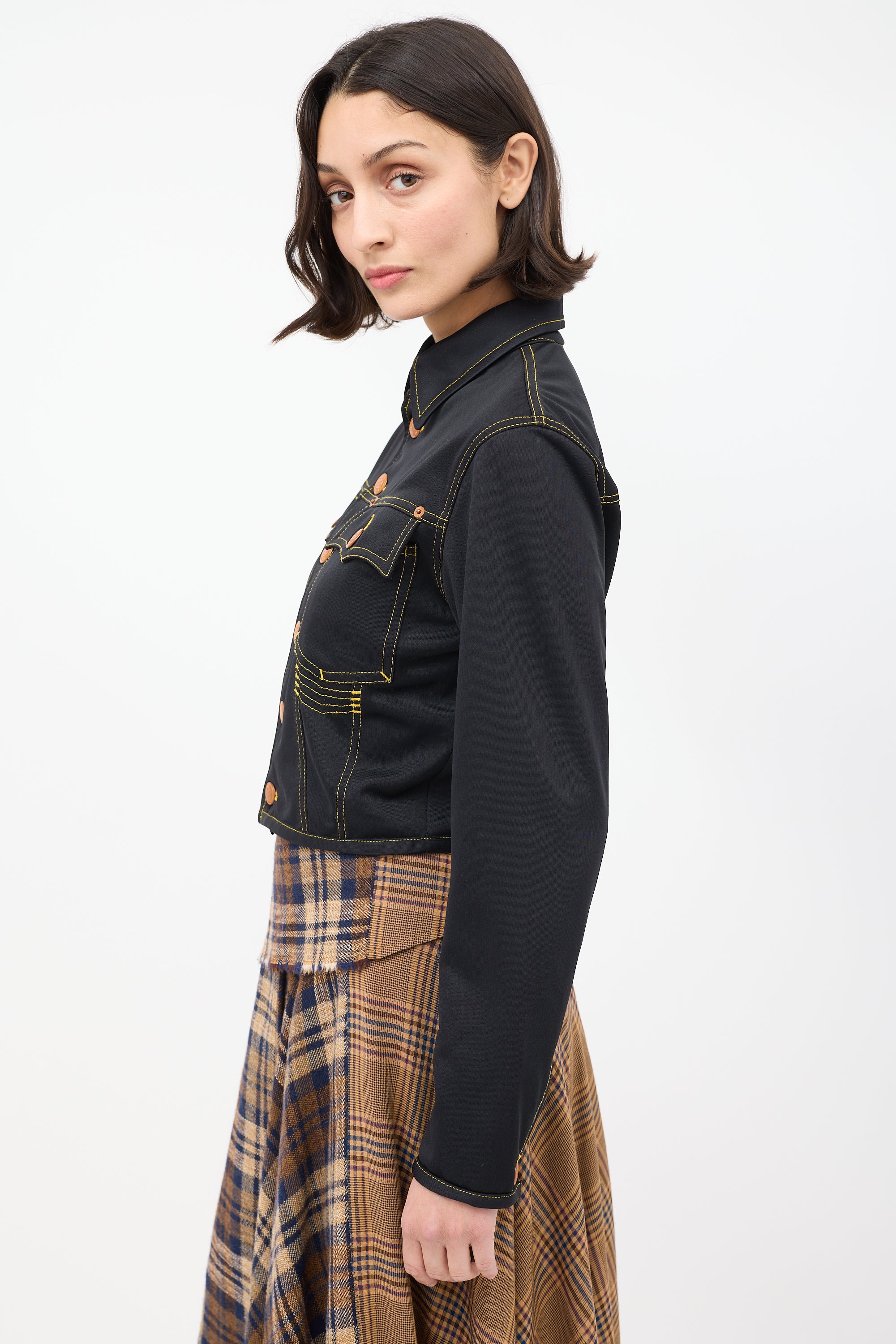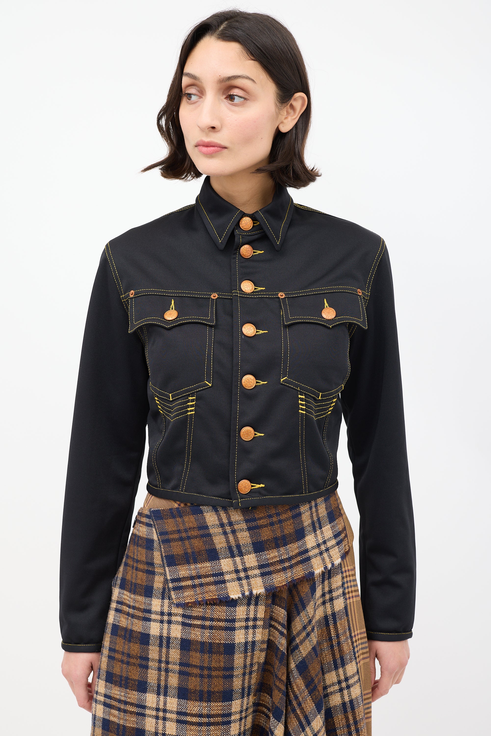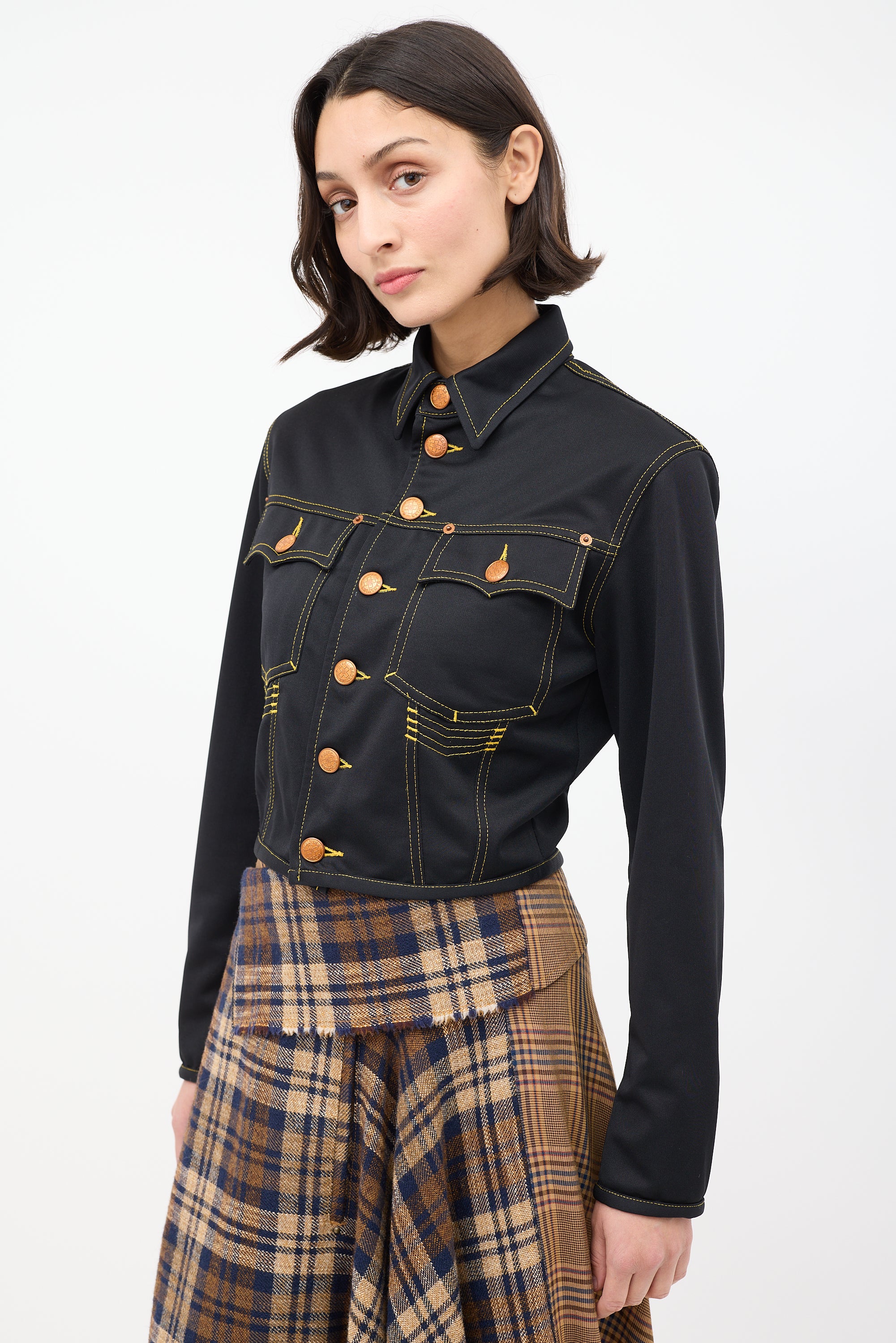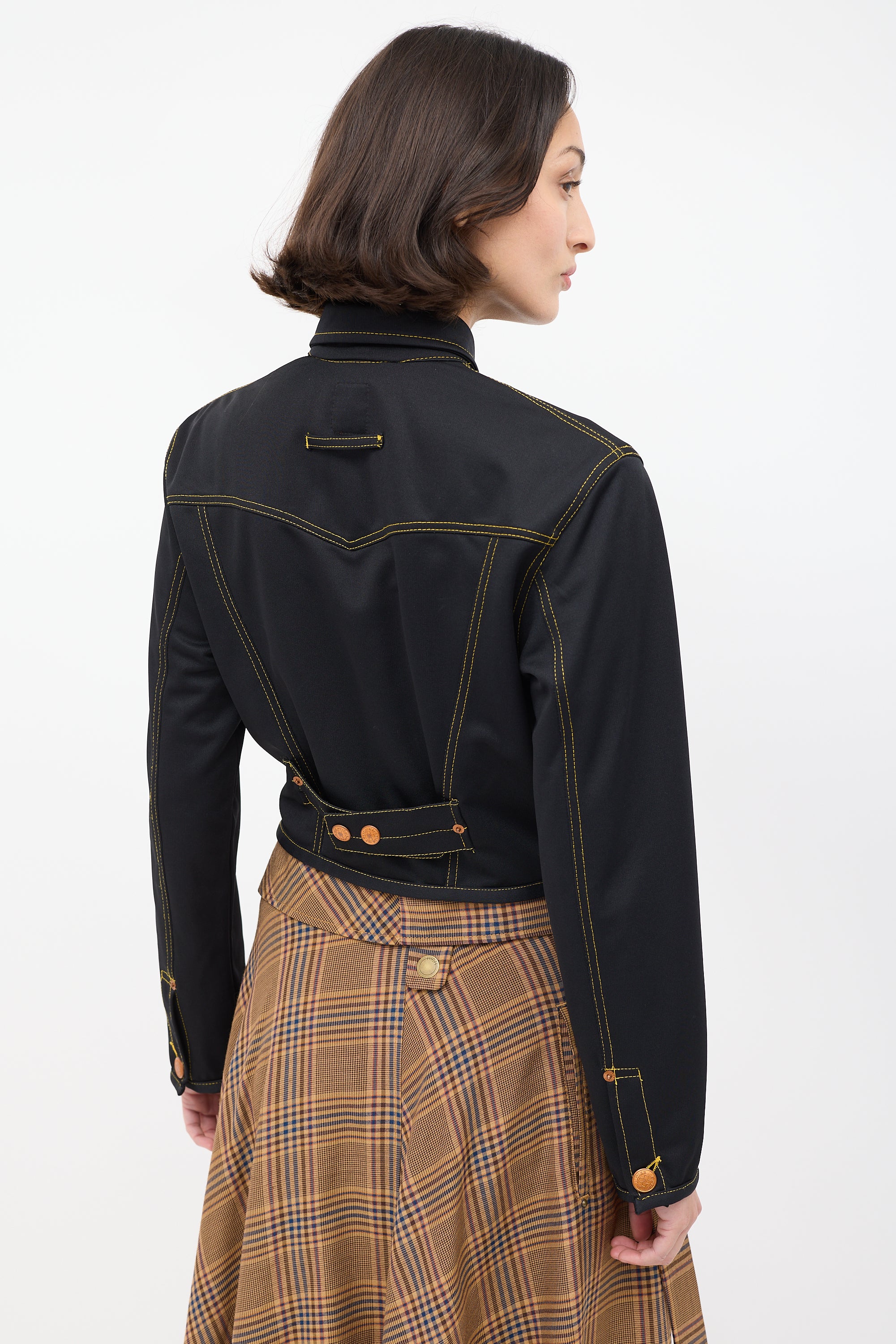 Pre-owned Jean Paul Gaultier Jeans vintage black cropped jacket featuring a point collar, bronze tone buttons with cross motif, button up front, two buttoned flap pockets at chest, adjustable Martingale belt, even hem, long sleeves with buttoned cuffs, and yellow contrast stitching throughout. c. mid 1990s.