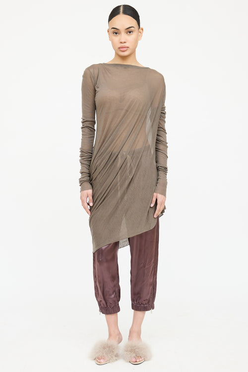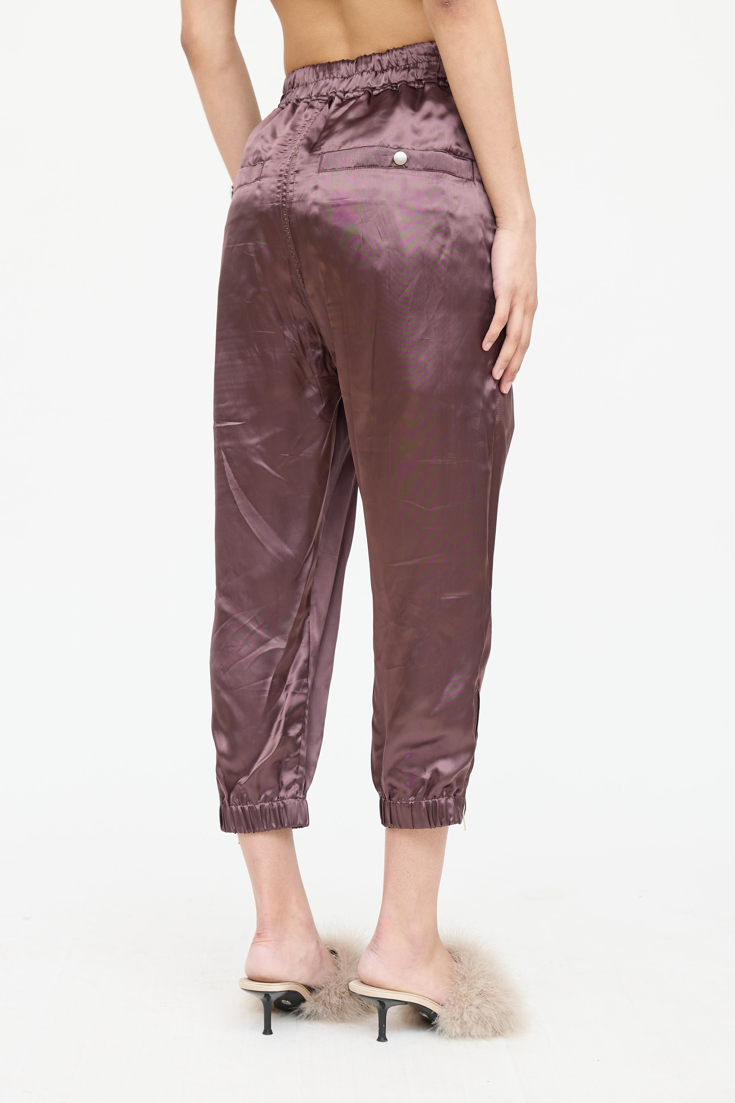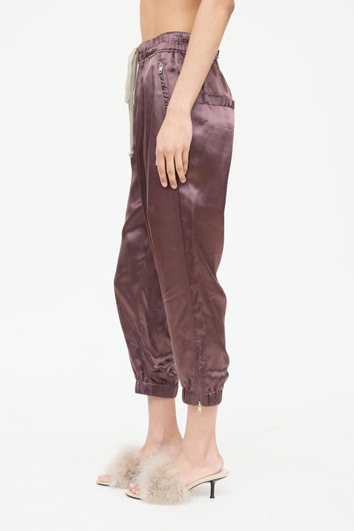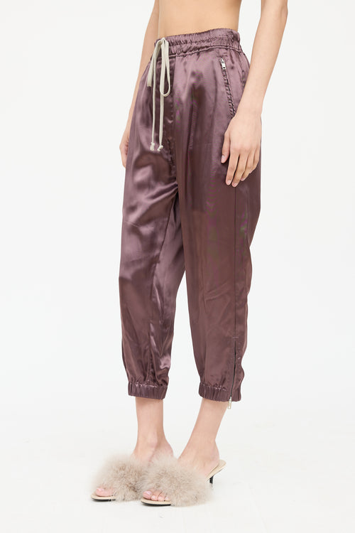 Pre-owned Rick Owens Fall Winter 2023 purple cropped jogger pants featuring drawstring at waist, button fly closure, two zip pockets at front, zip at cuffs and two buttoned slip pockets at back.