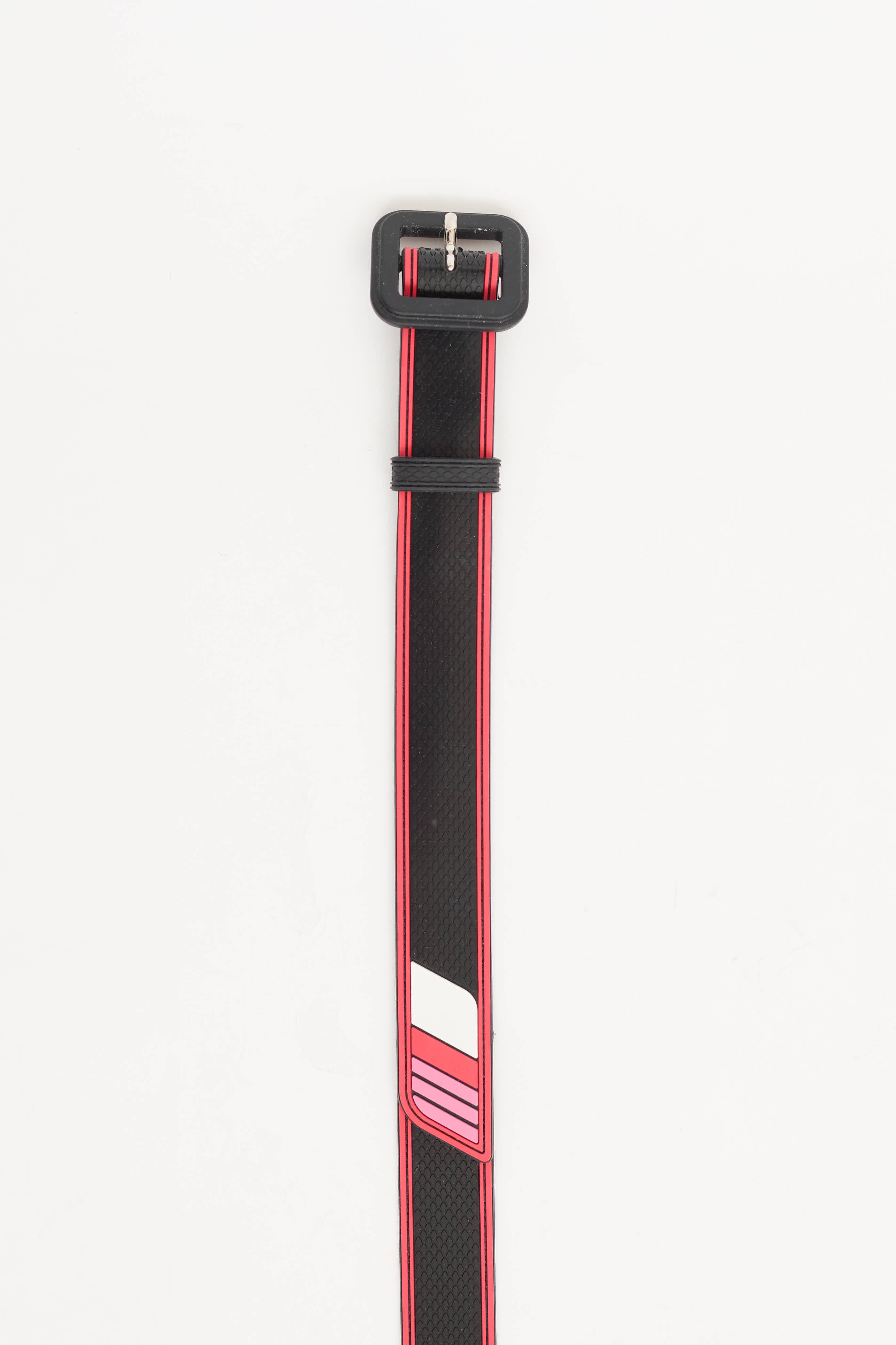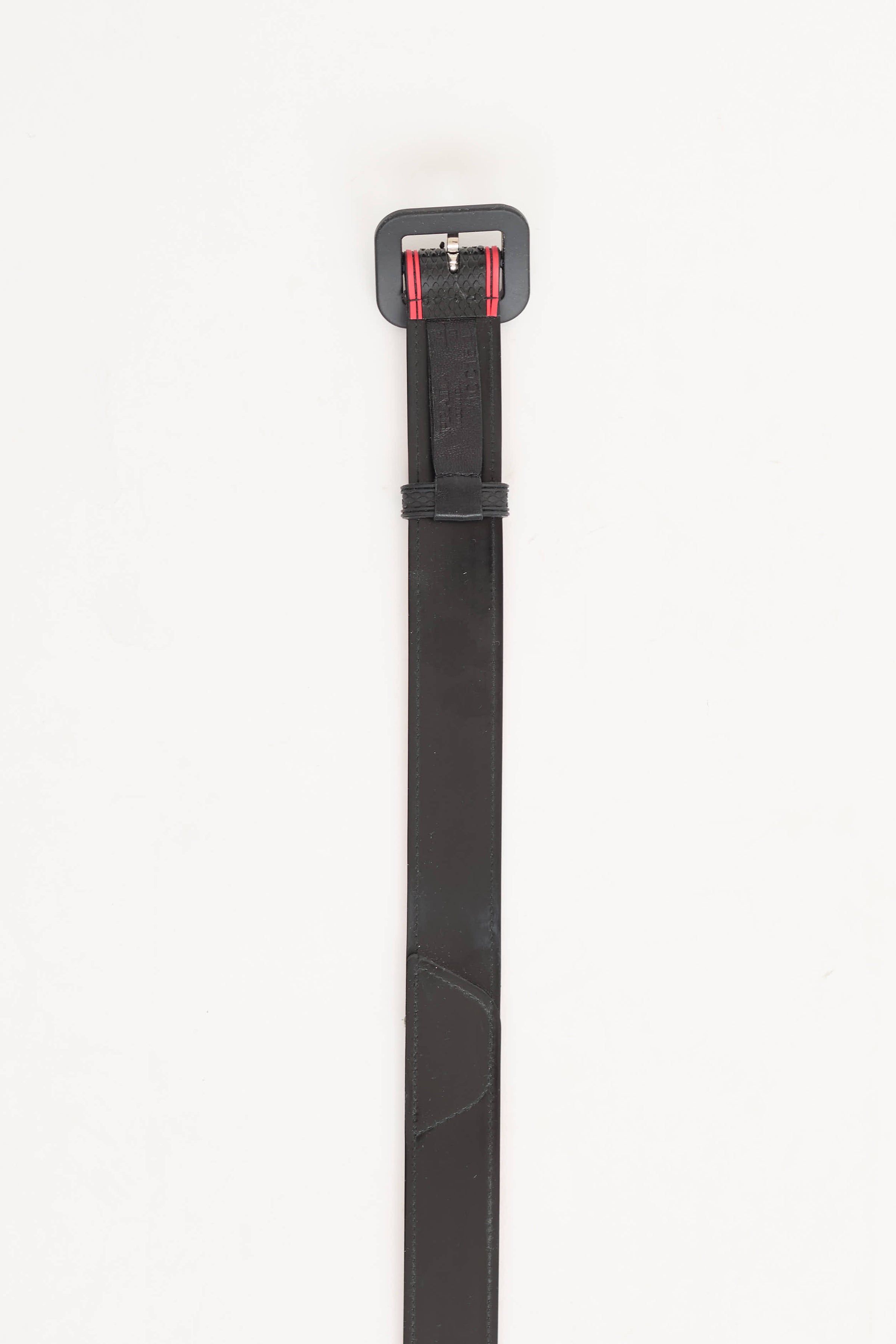 Pre-owned Prada FW 2018 black belt featuring red trim, rubber on outside and buckle, leather backing and pin buckle closure.