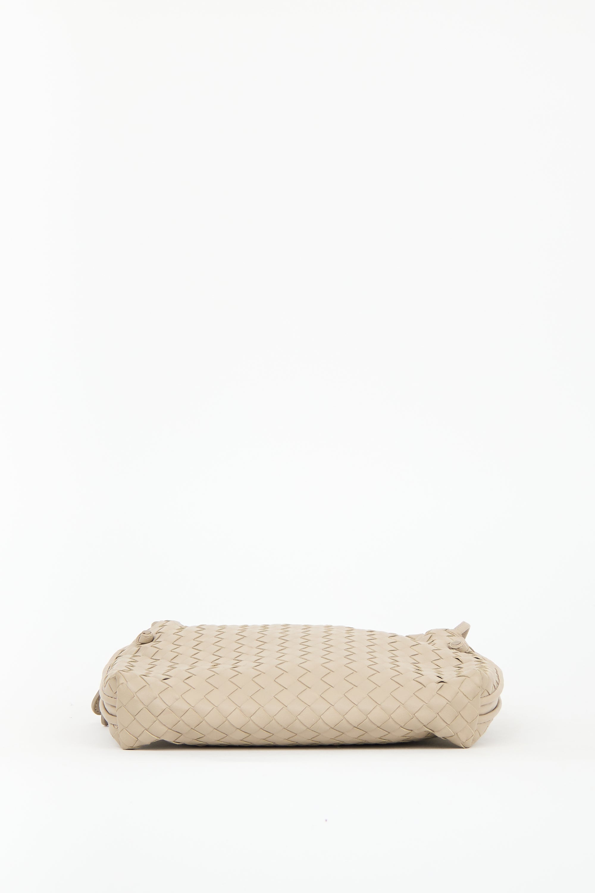 Pre-owned Bottega Veneta beige Nodini crossbody bag featuring Intrecciato woven leather body, single adjustable shoulder strap, top zip closure, and one lined main compartment with one zip pocket and one slip pocket.