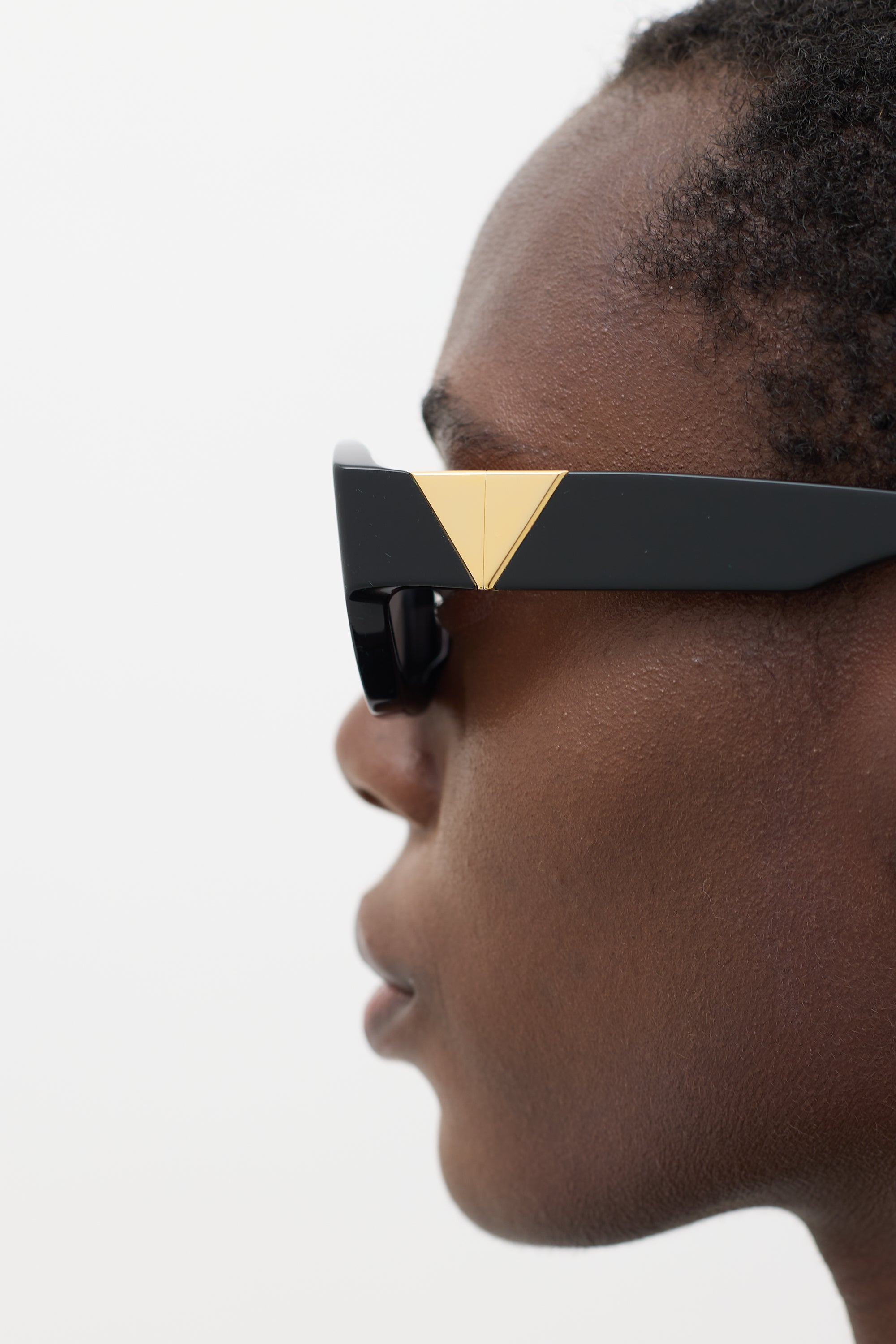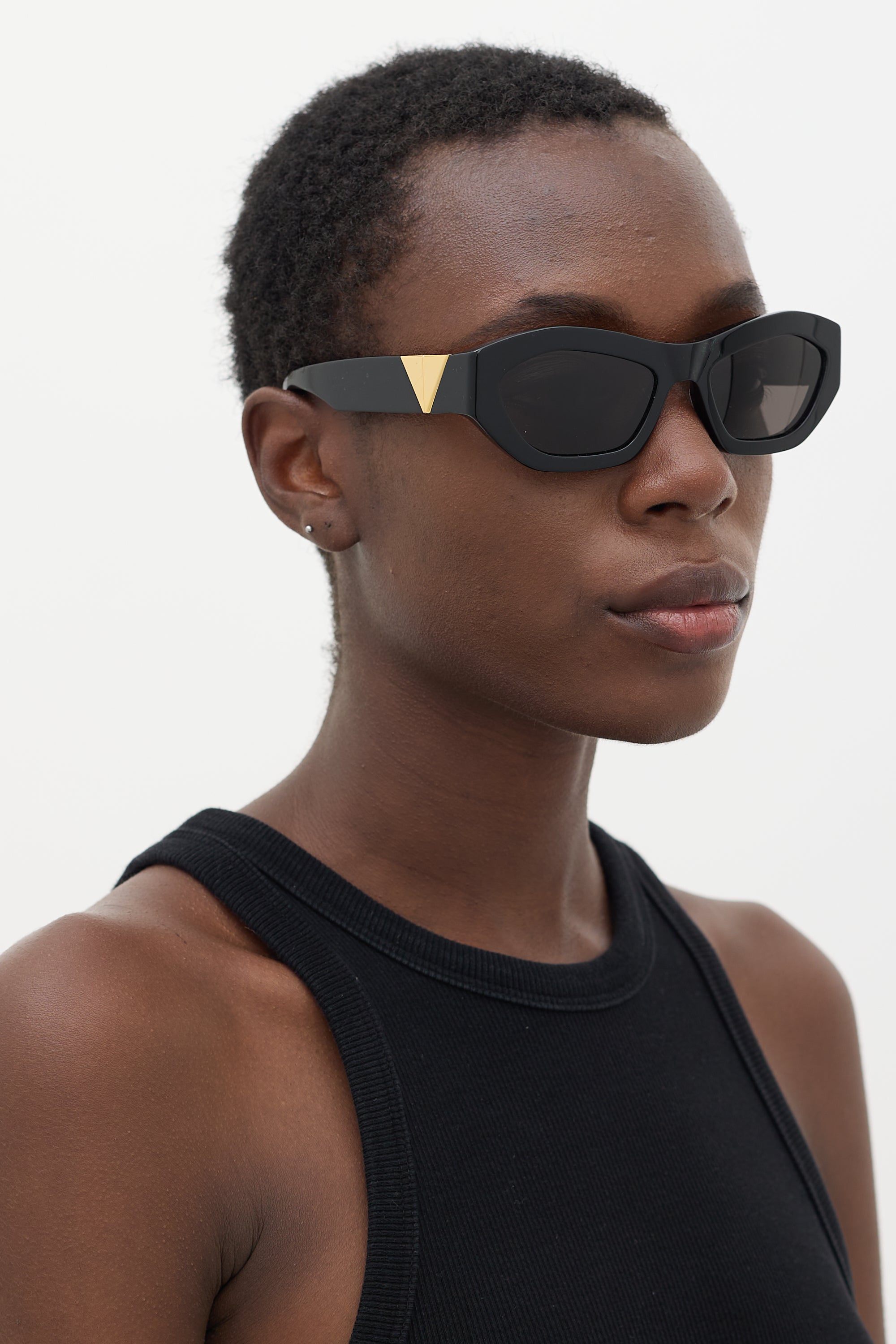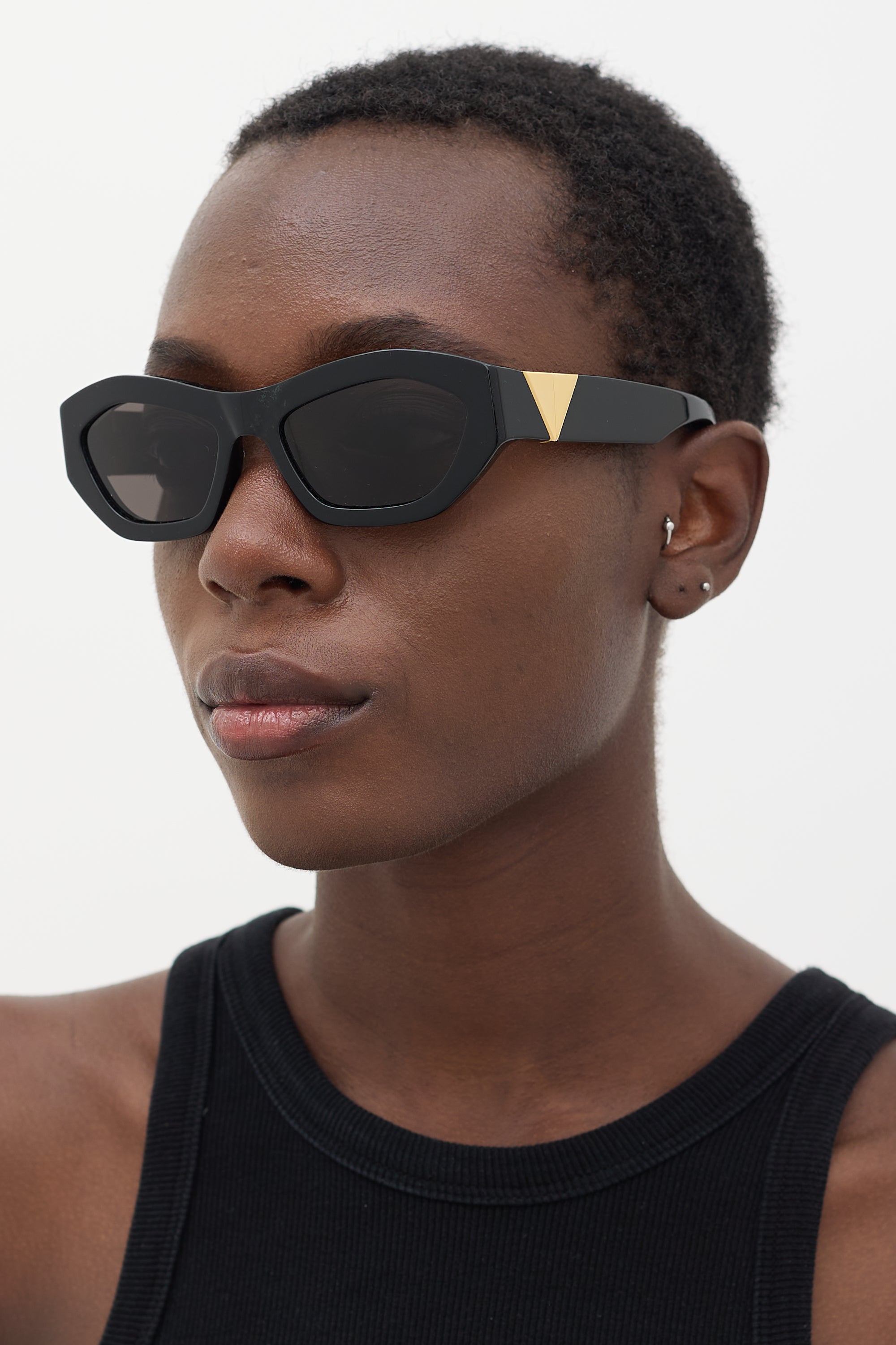 Pre-owned Bottega Veneta black BV1221S sunglasses featuring tinted lenses, nose pads, and gold tone hardware at temples. Comes with original case.