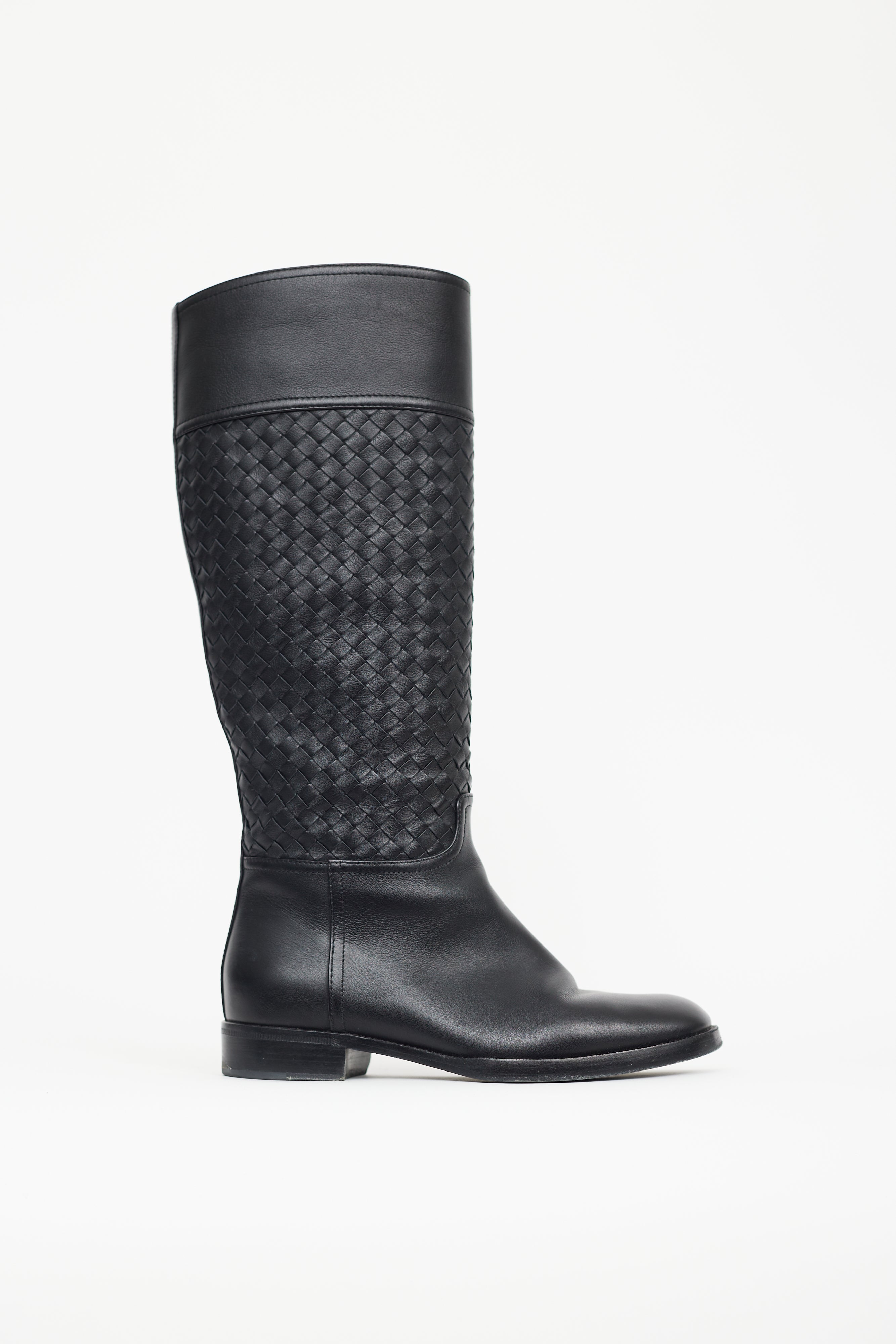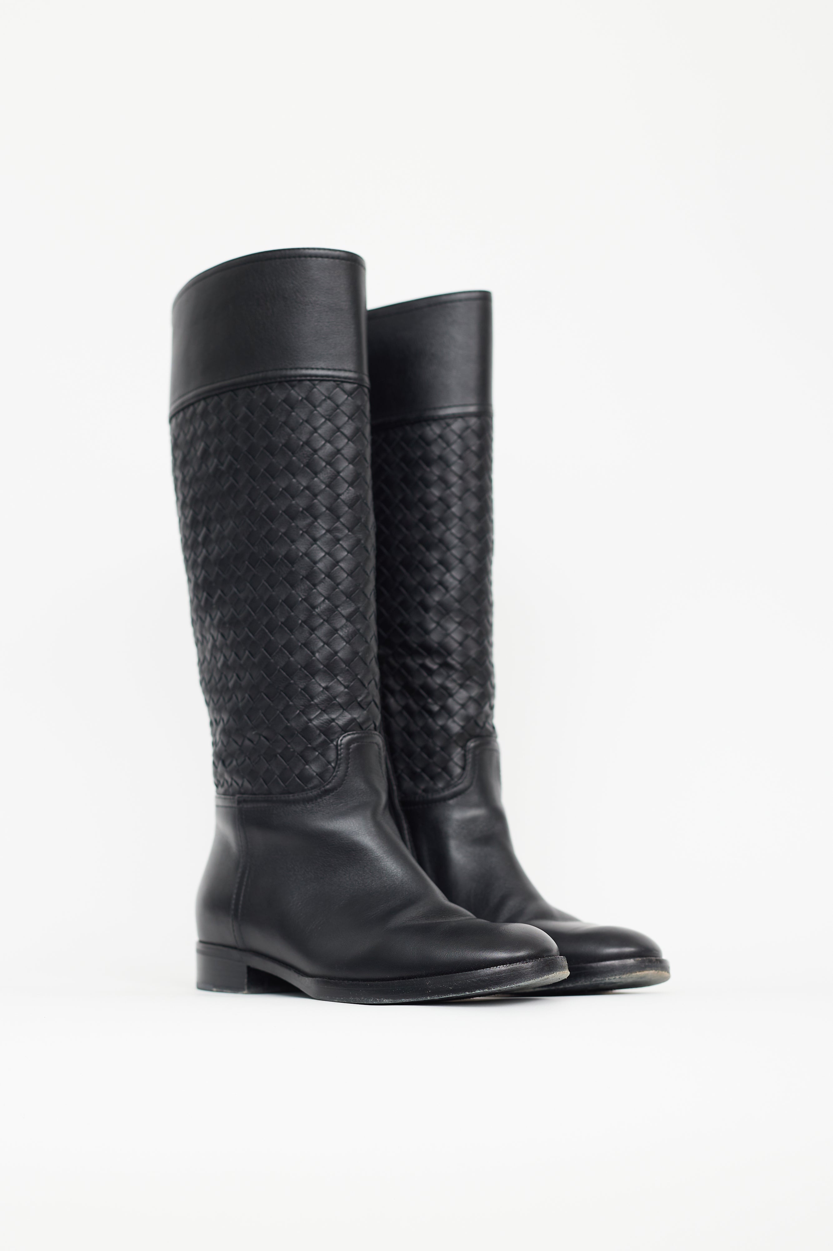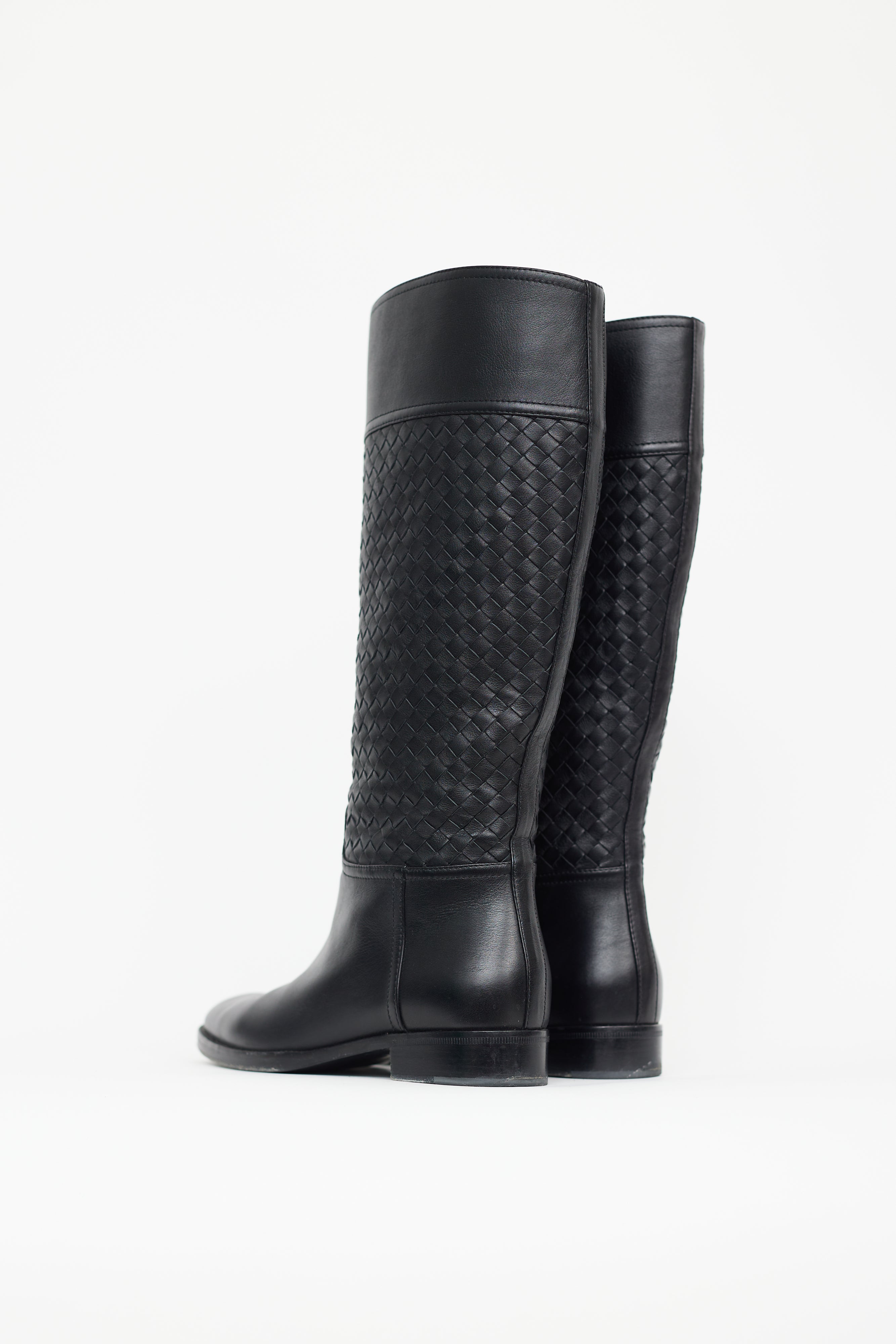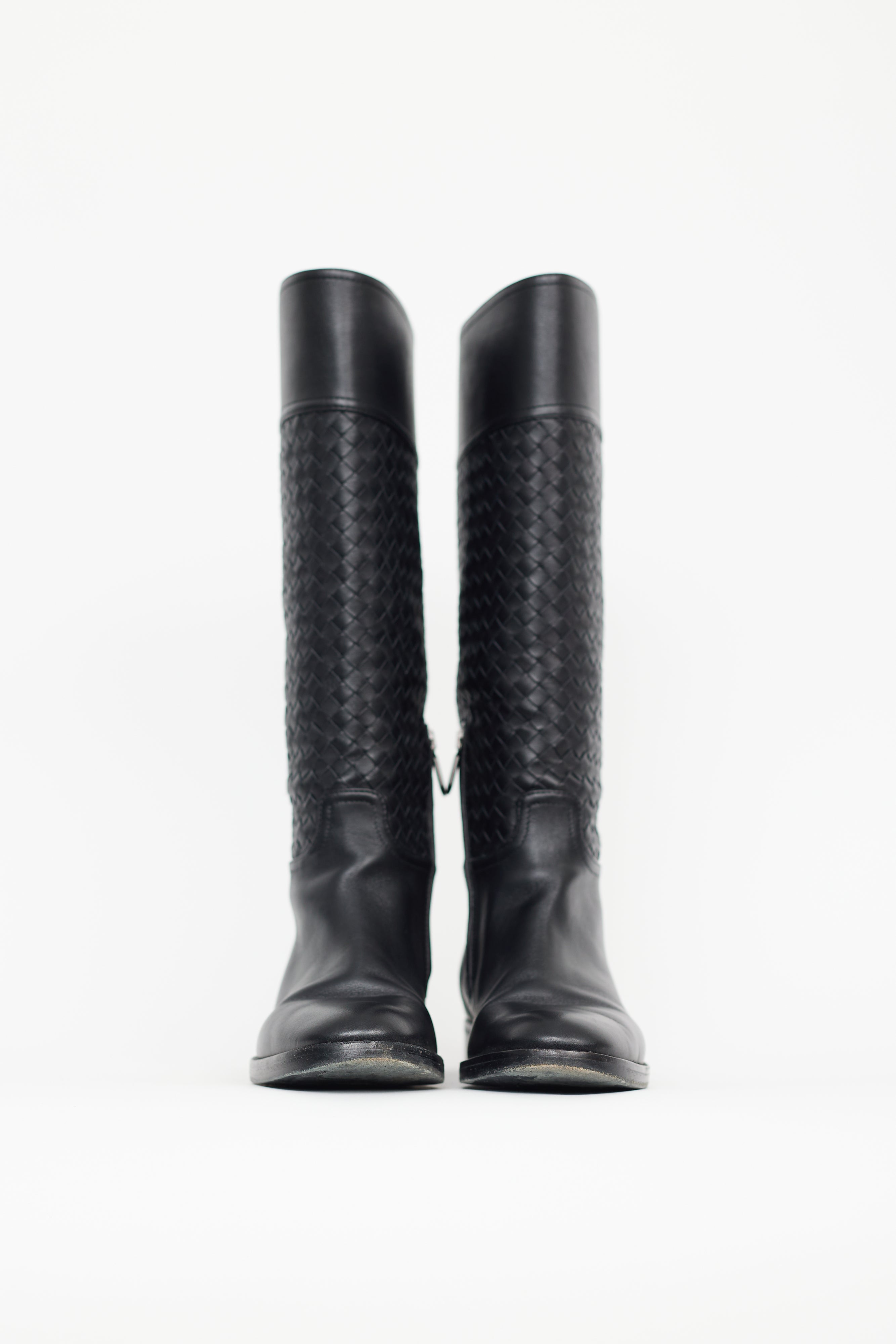 Pre-owned Bottega Veneta black leather riding boot featuring round toe, intrecciato pattern at sides, covered inner zipper at side, and leather insoles. Comes with dust bags.