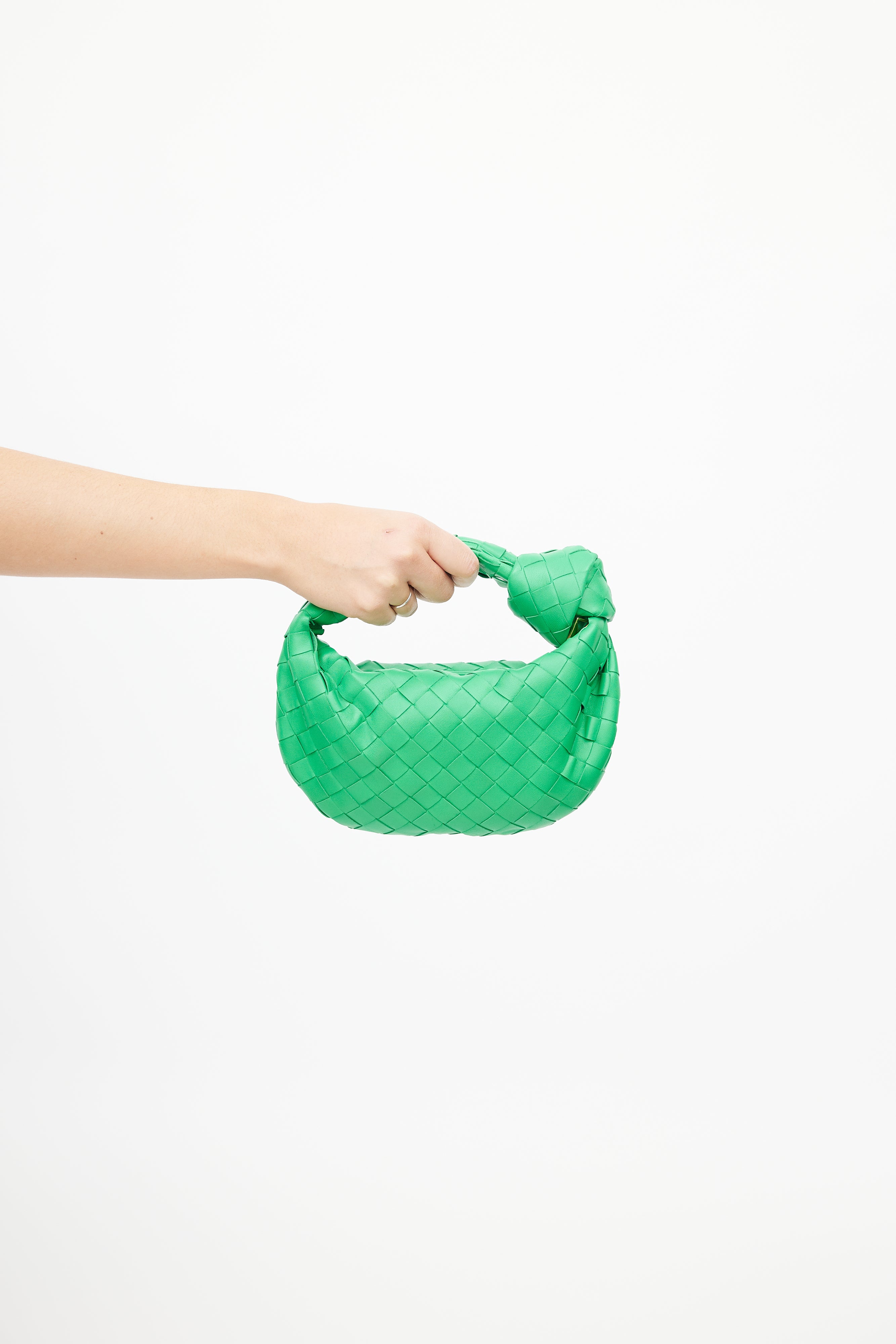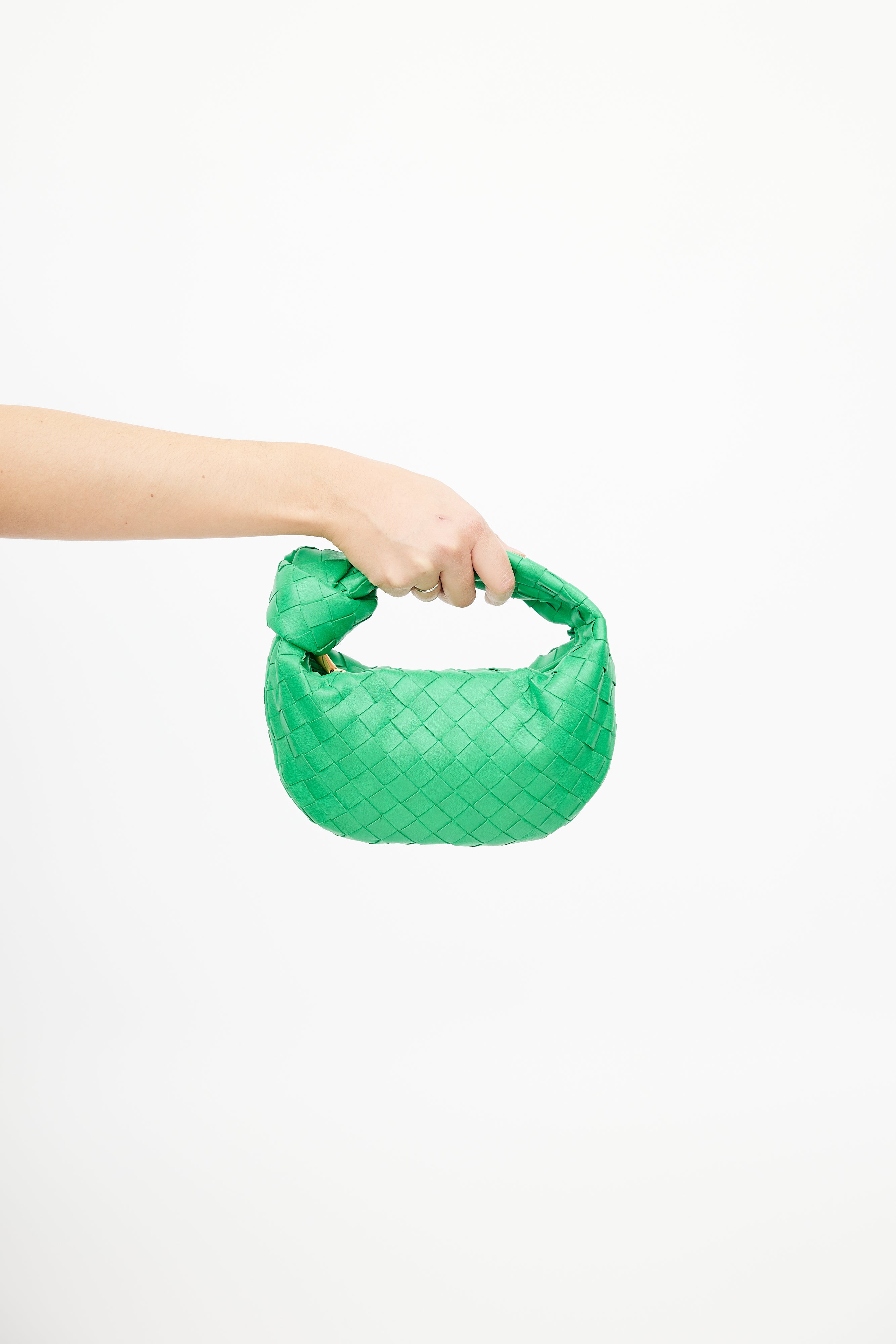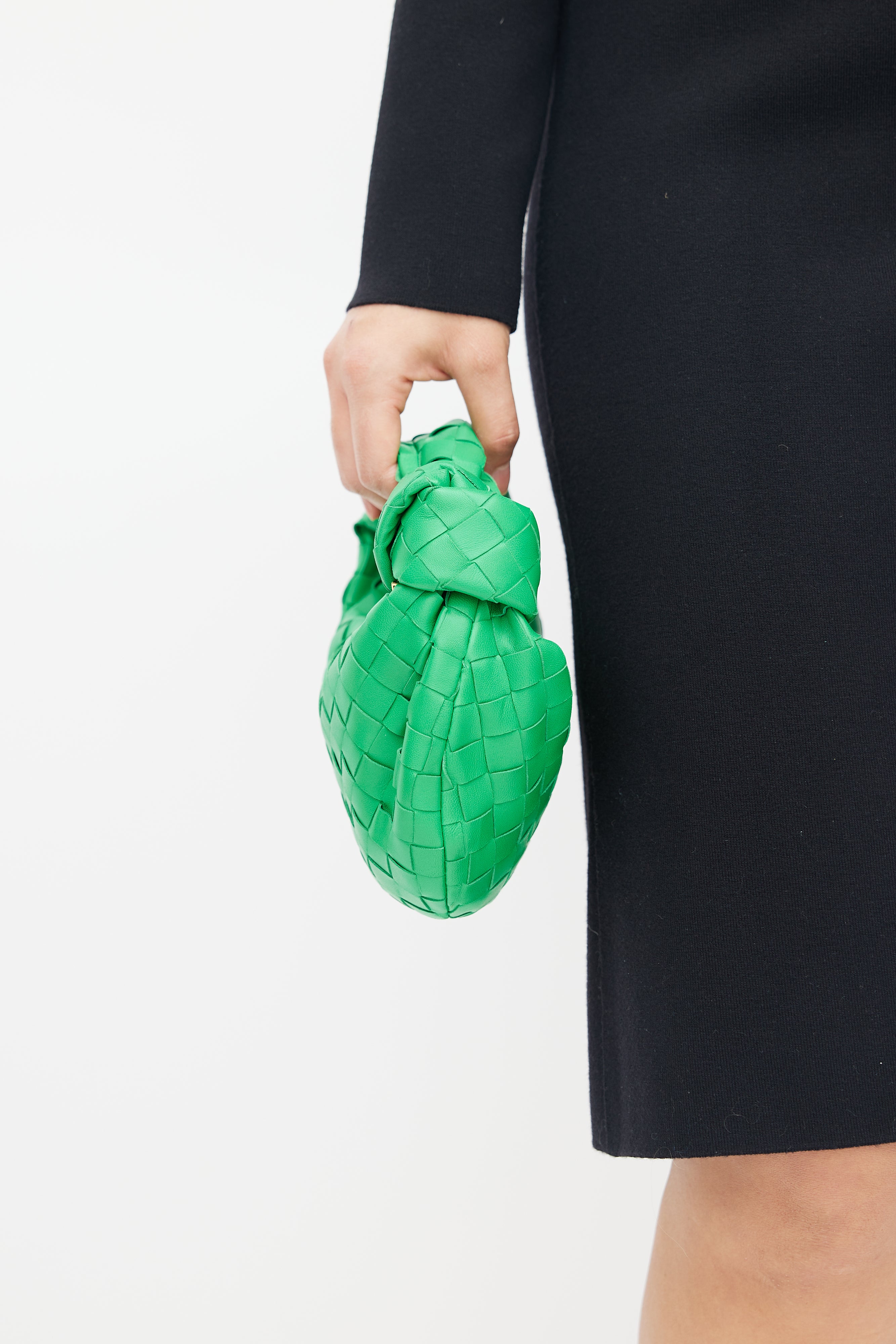 Pre-owned Bottega Veneta bright green mini Jodie bag featuring Intrecciato woven exterior, signature knot top handle, zip closure at top, and one main compartment. Comes with original dust bag.