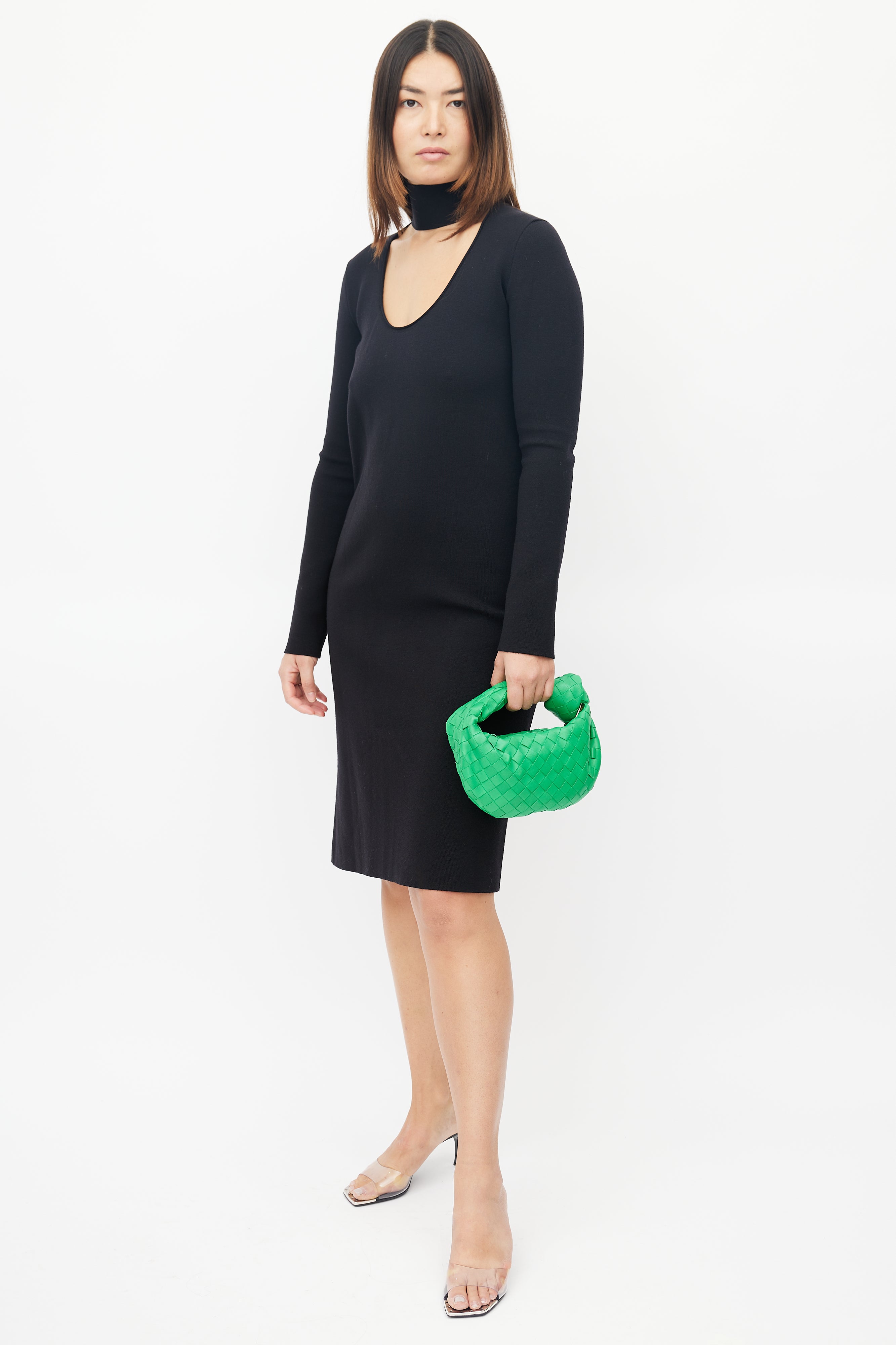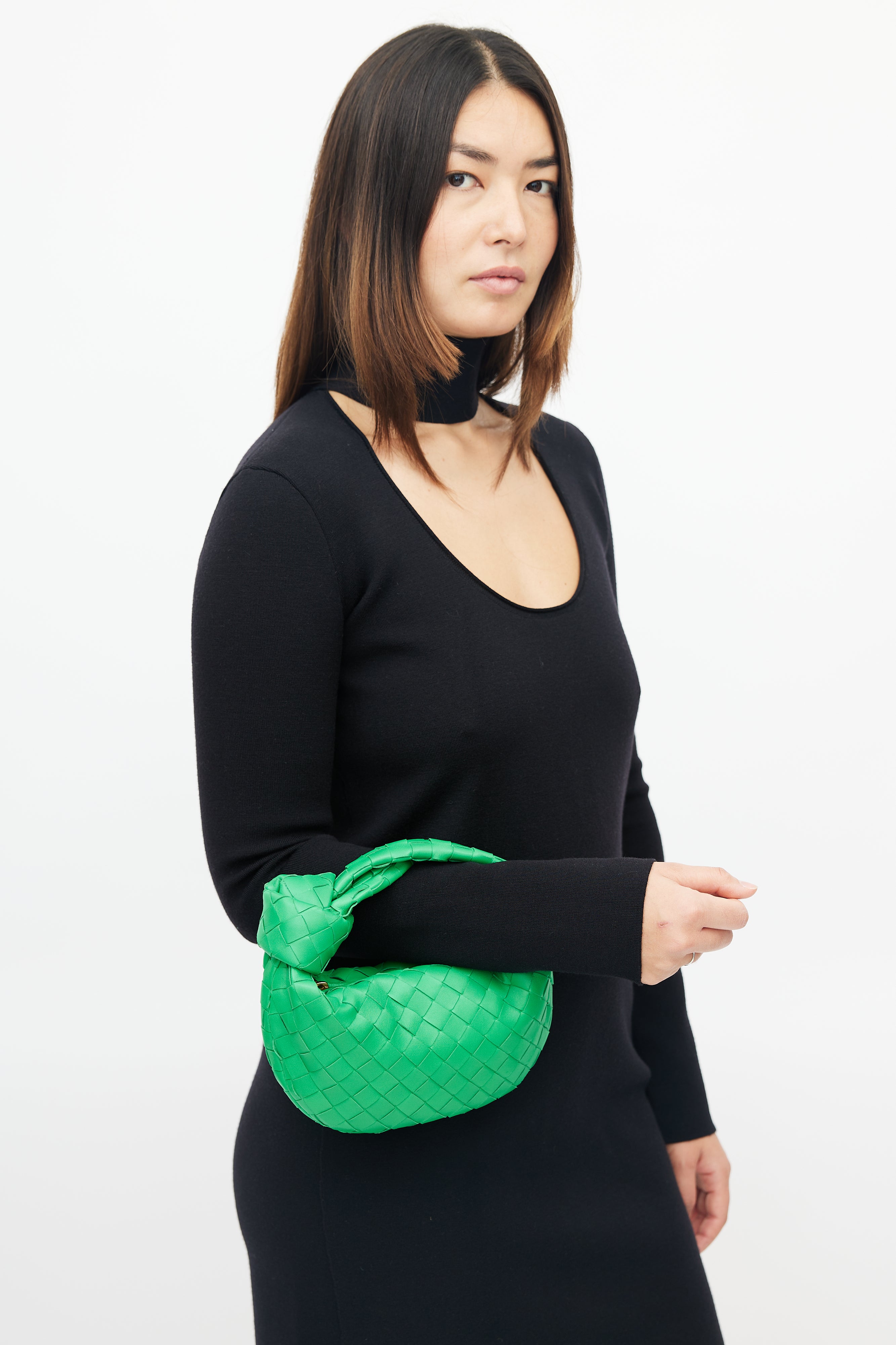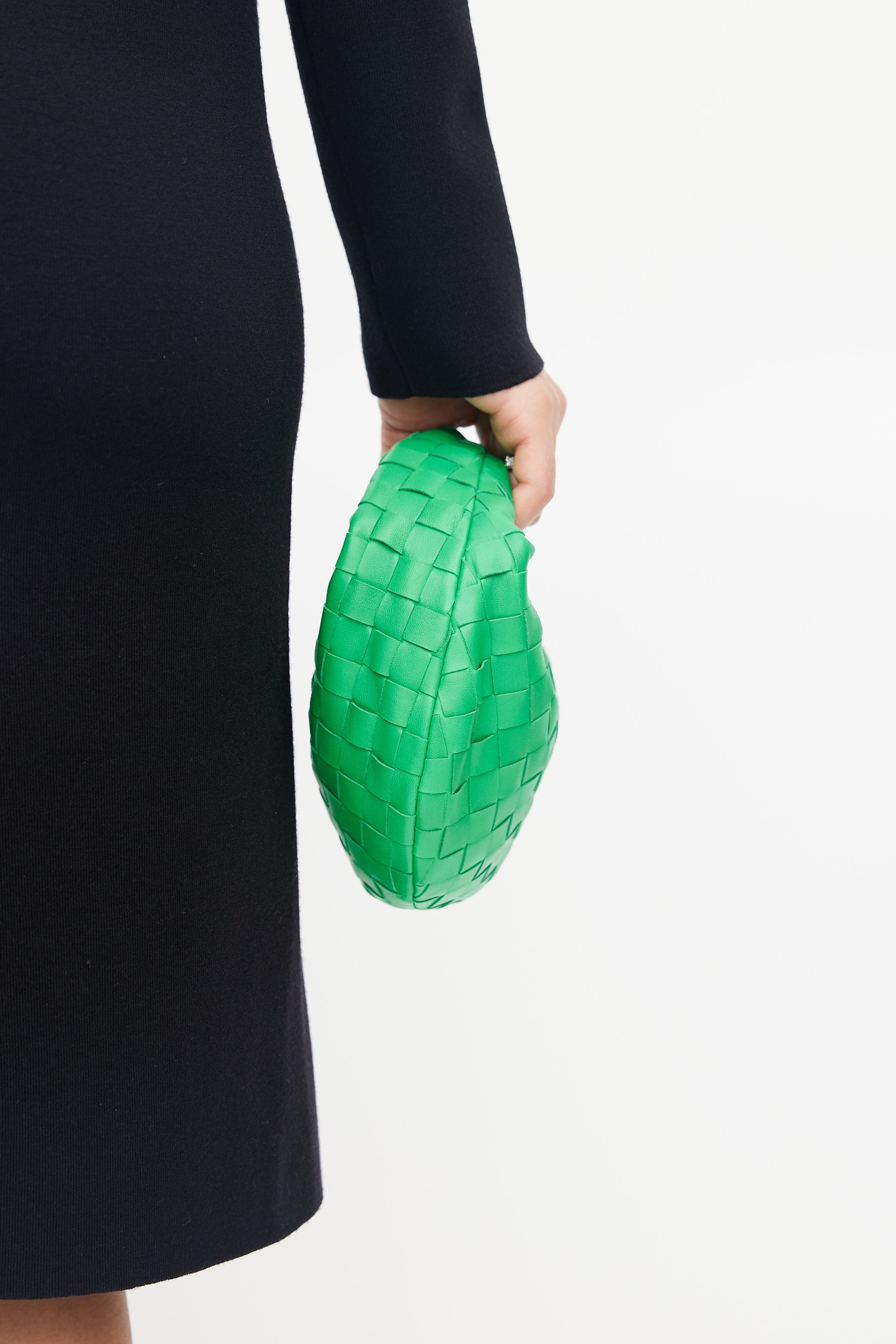 Pre-owned Bottega Veneta bright green mini Jodie bag featuring Intrecciato woven exterior, signature knot top handle, zip closure at top, and one main compartment. Comes with original dust bag.