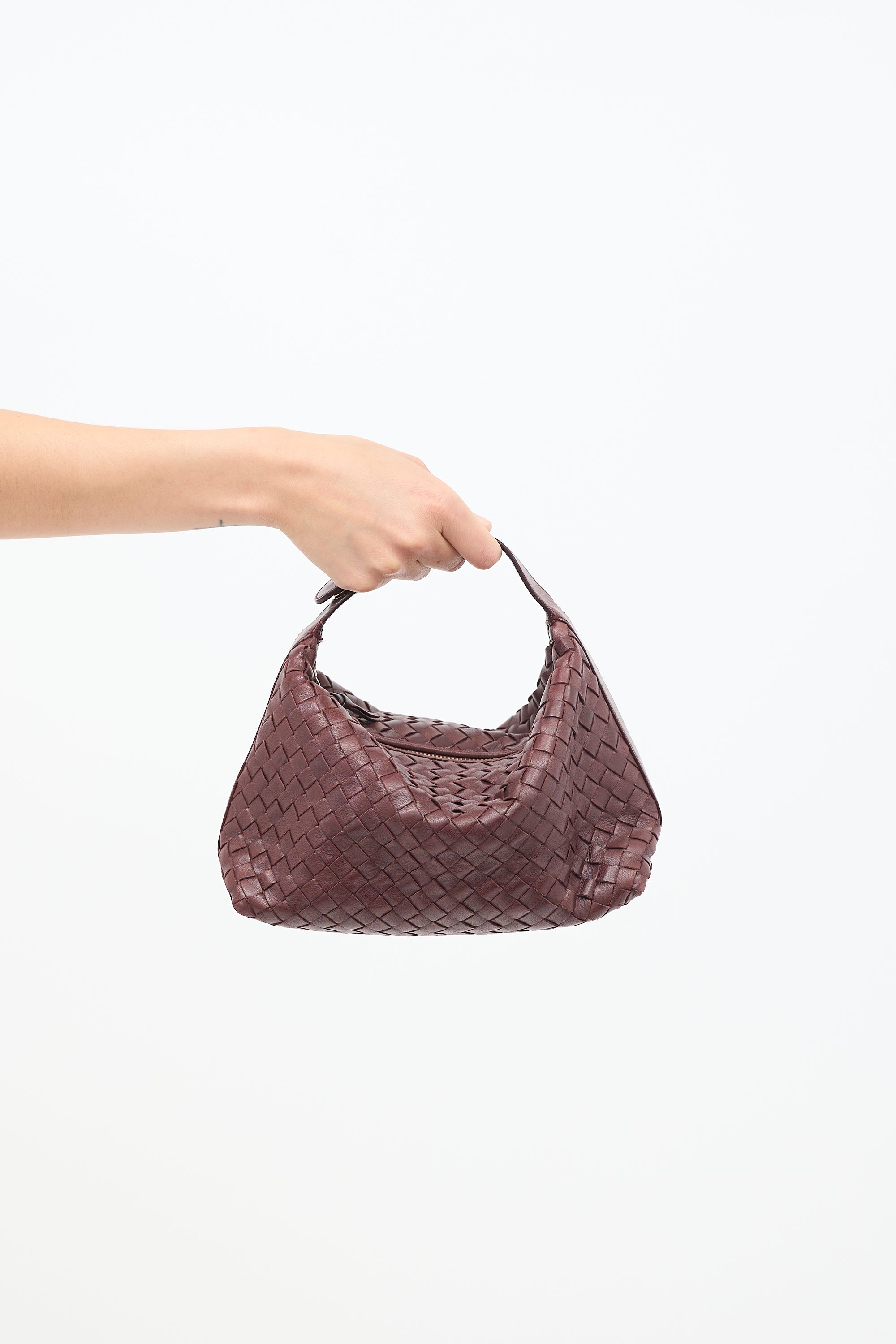 Pre-owned Bottega Veneta brown bag featuring Intrecciato weave, snap button closure at top handle, zip closure at top, and suede lined main compartment.