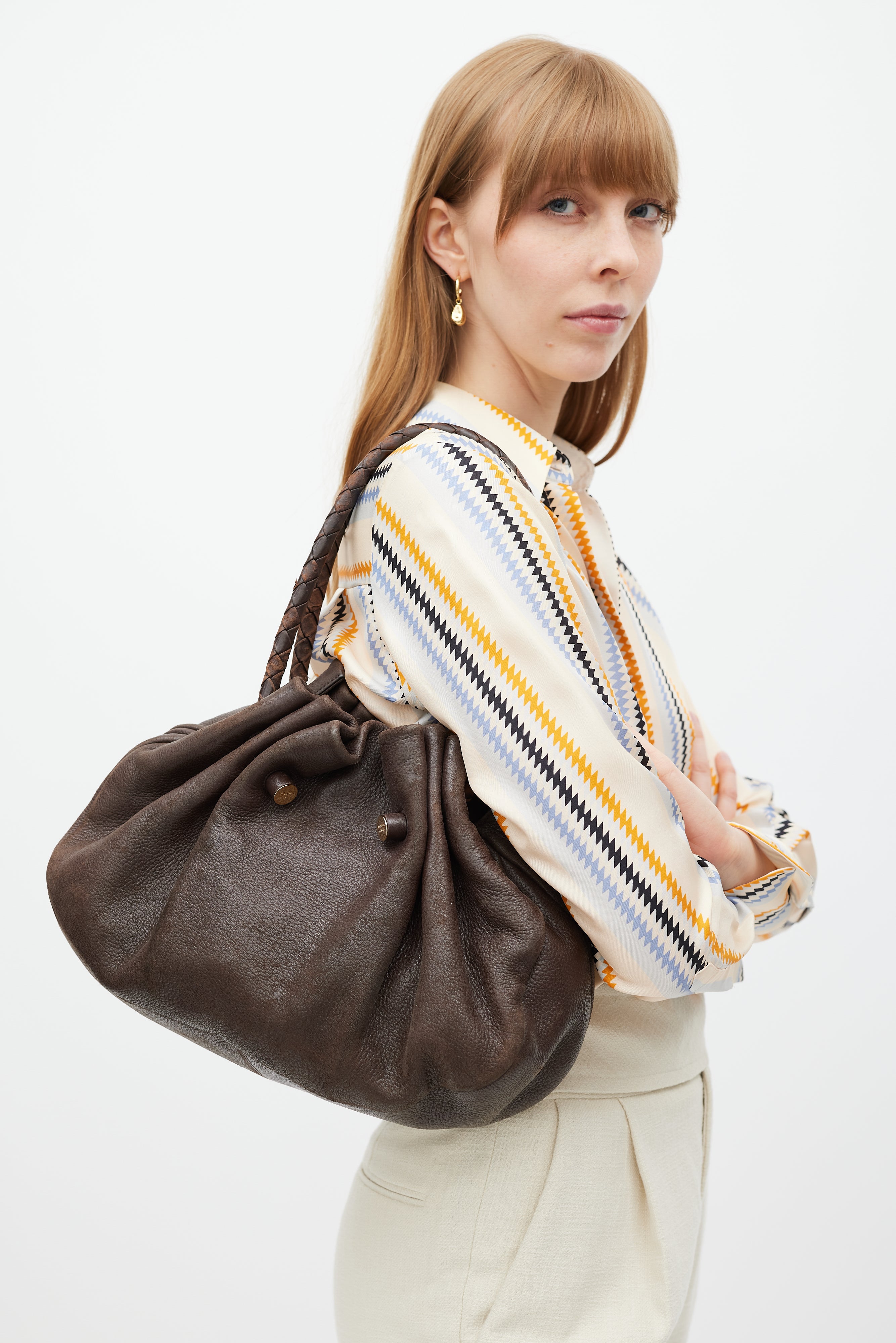 Brown Leather Woven Handle Shoulder Bag