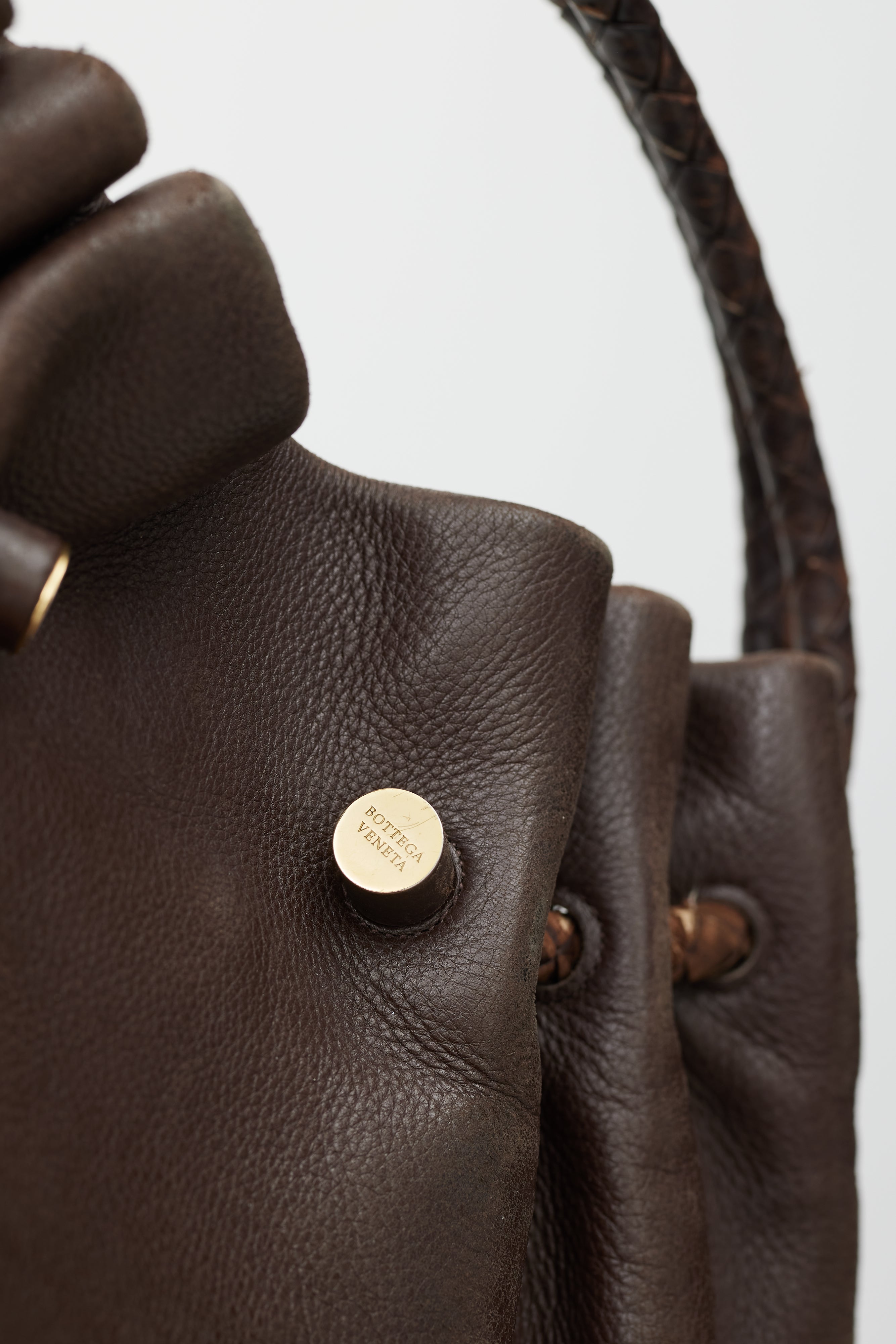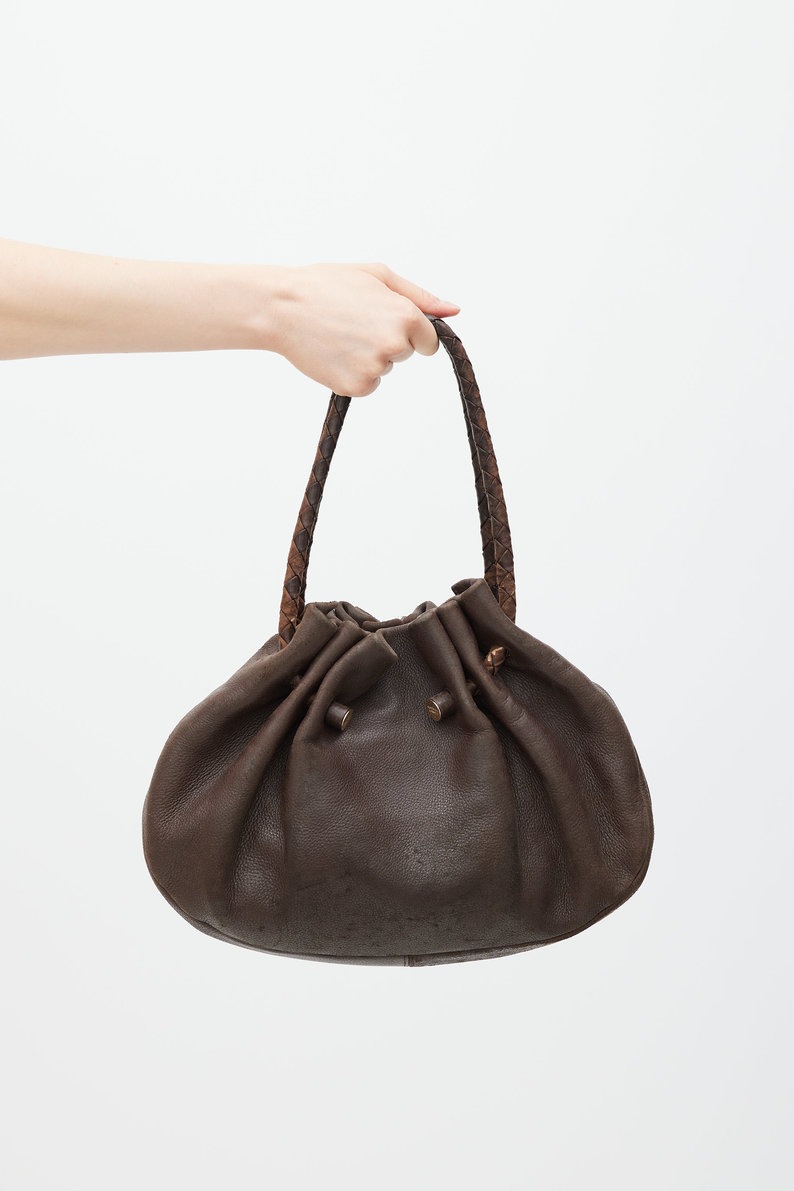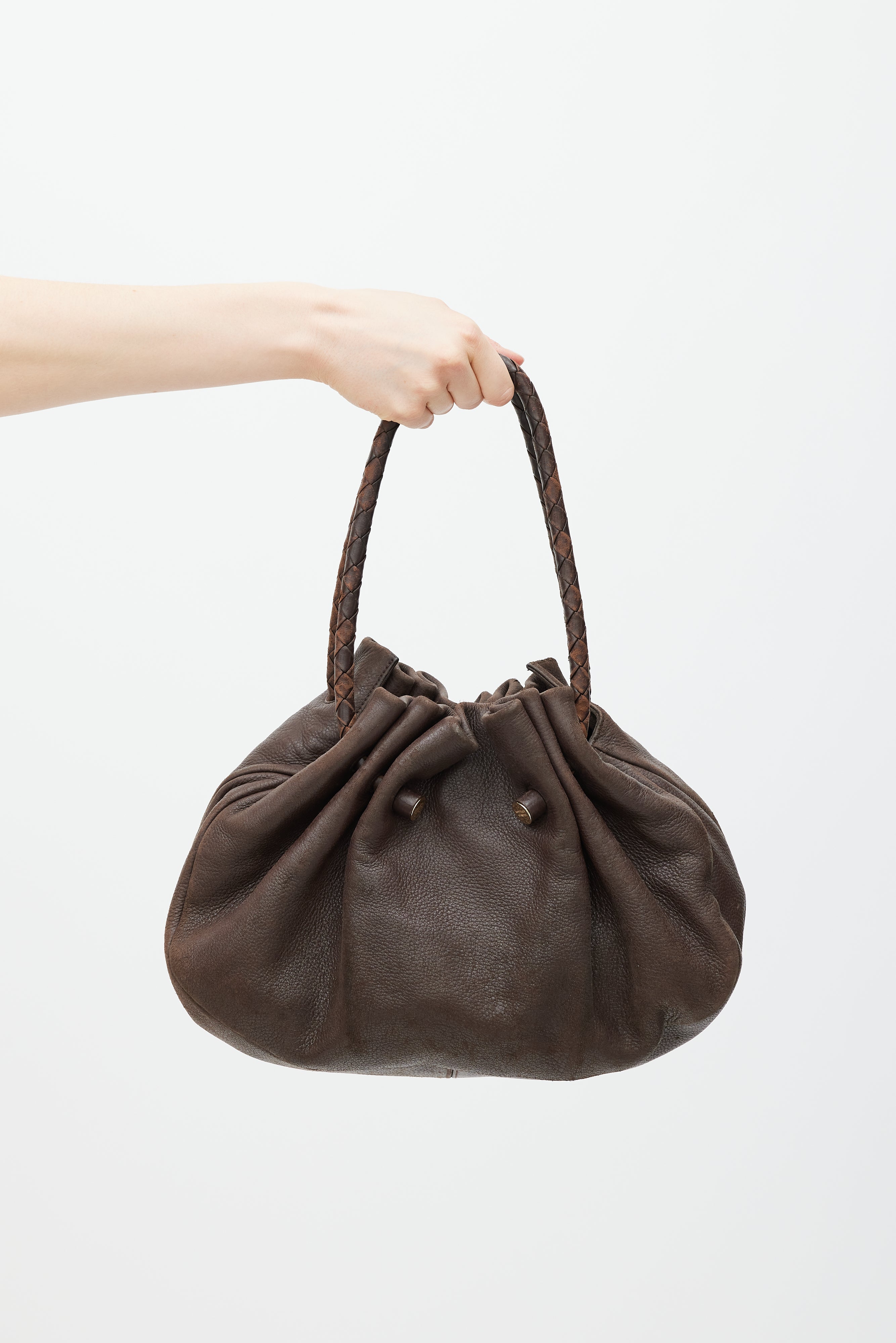 Pre-owned Bottega Veneta brown leather bag featuring gathered opening, dual woven top handles with gold tone engraved logo hardware, magnetic closure, and one lined main compartment with single zip pocket.