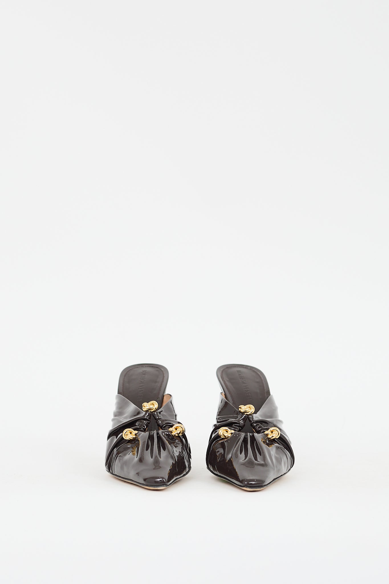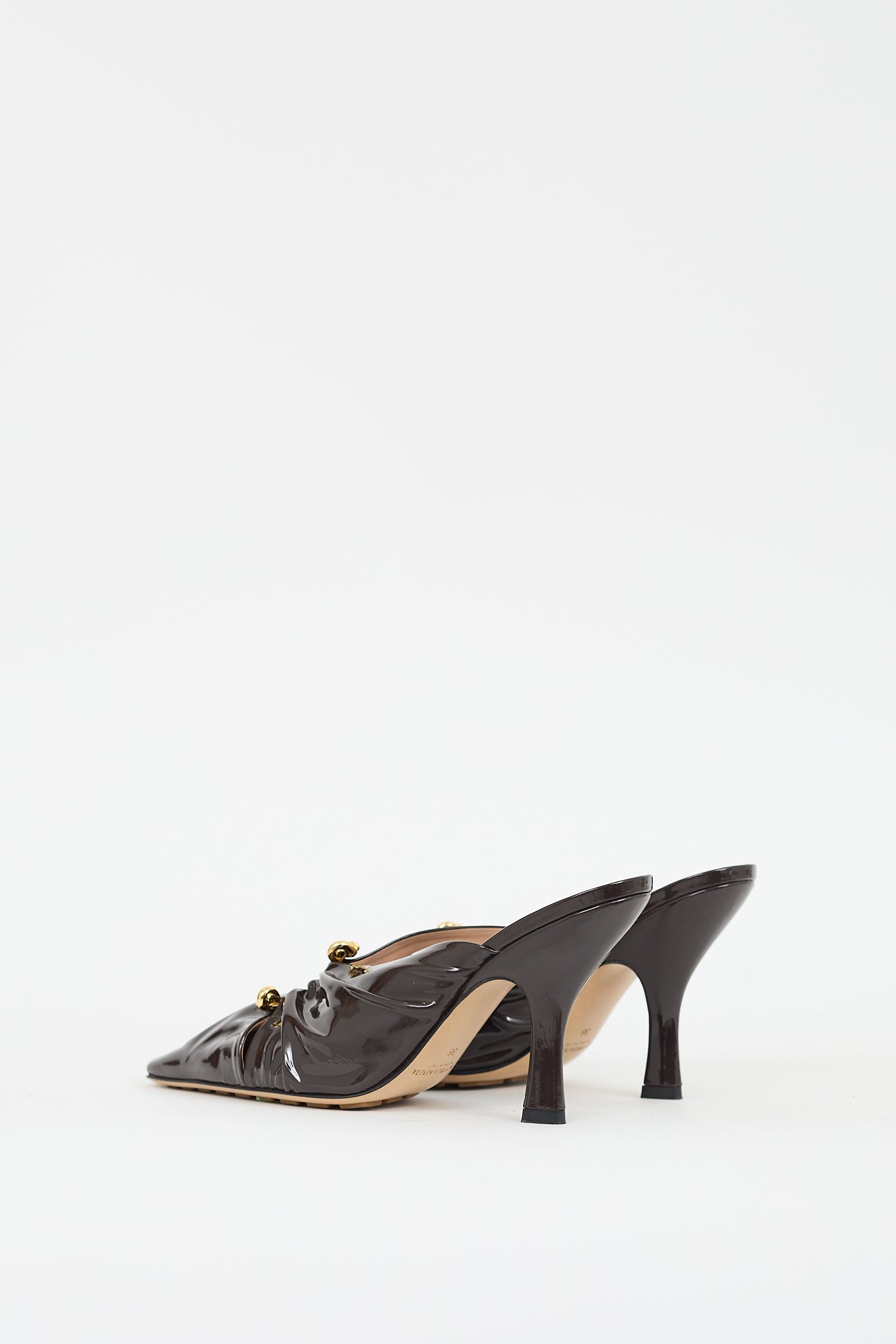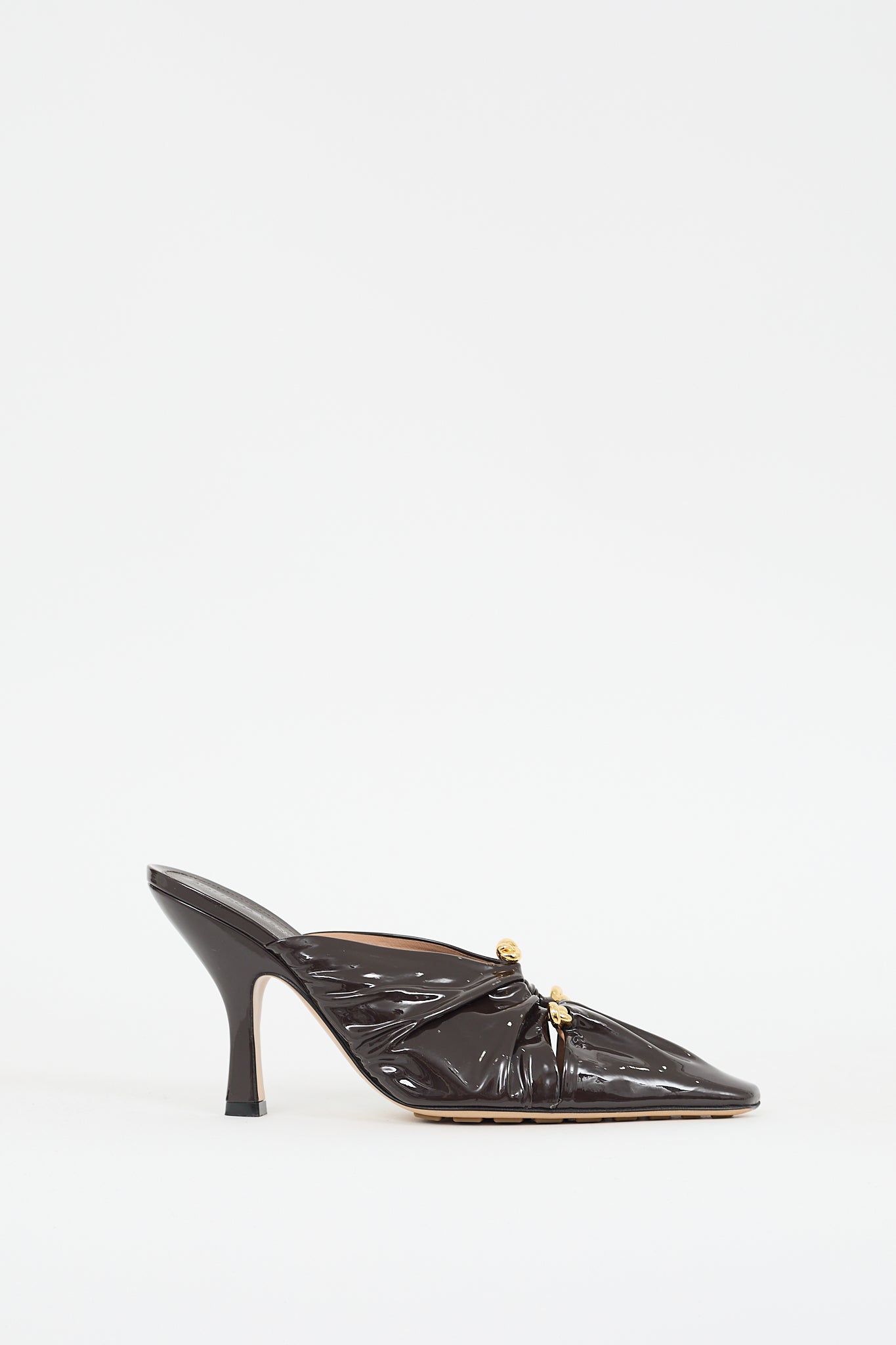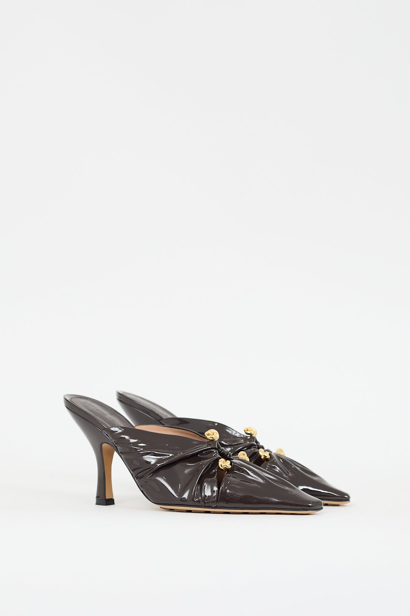 Pre-owned Bottega Veneta brown patent leather Bunnie mules featuring a pointed toe, gathered upper design with gold tone knotted triangle motif hardware, covered continental heel, leather insole and outsole, and rubber dots at outsole. Comes with original box.