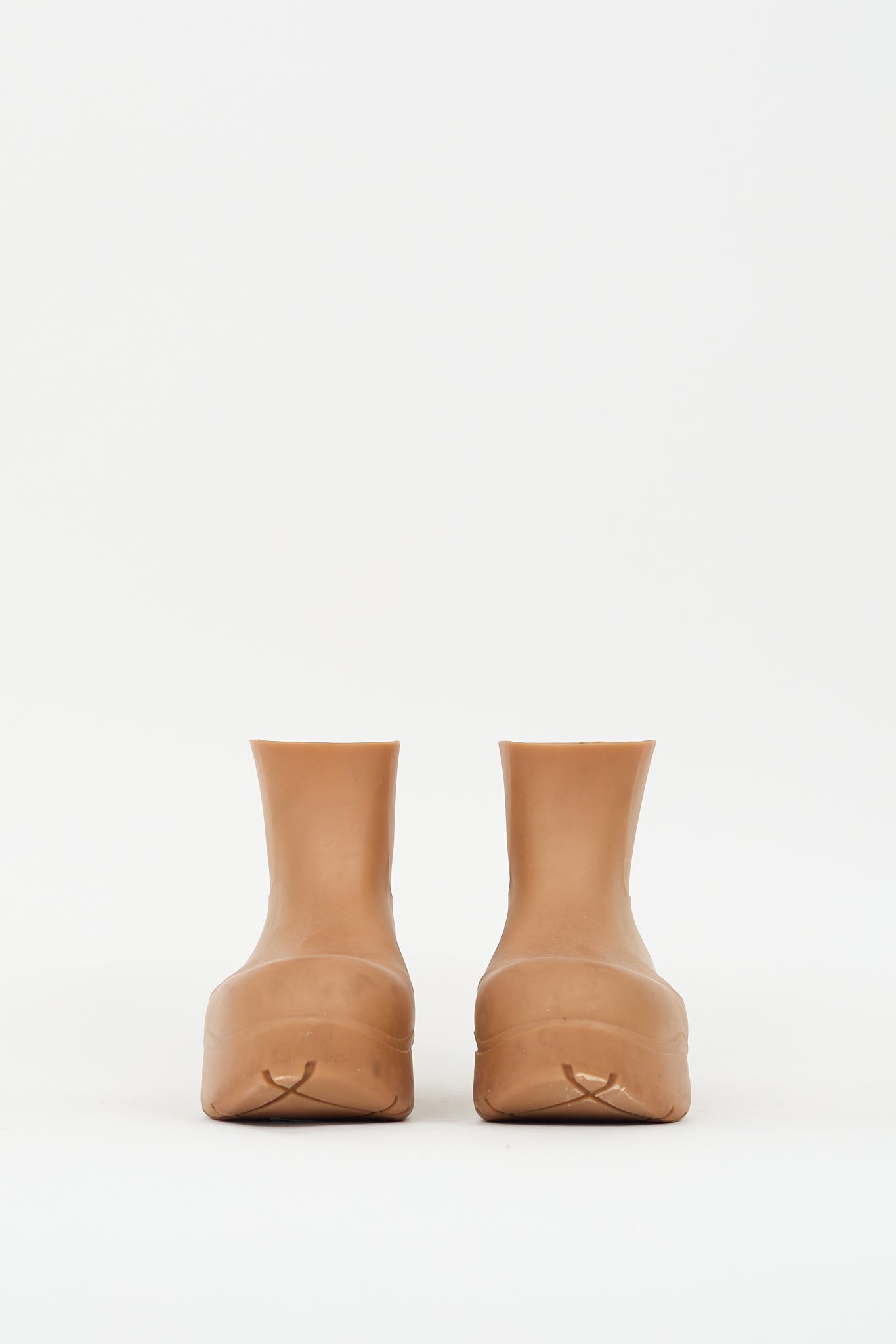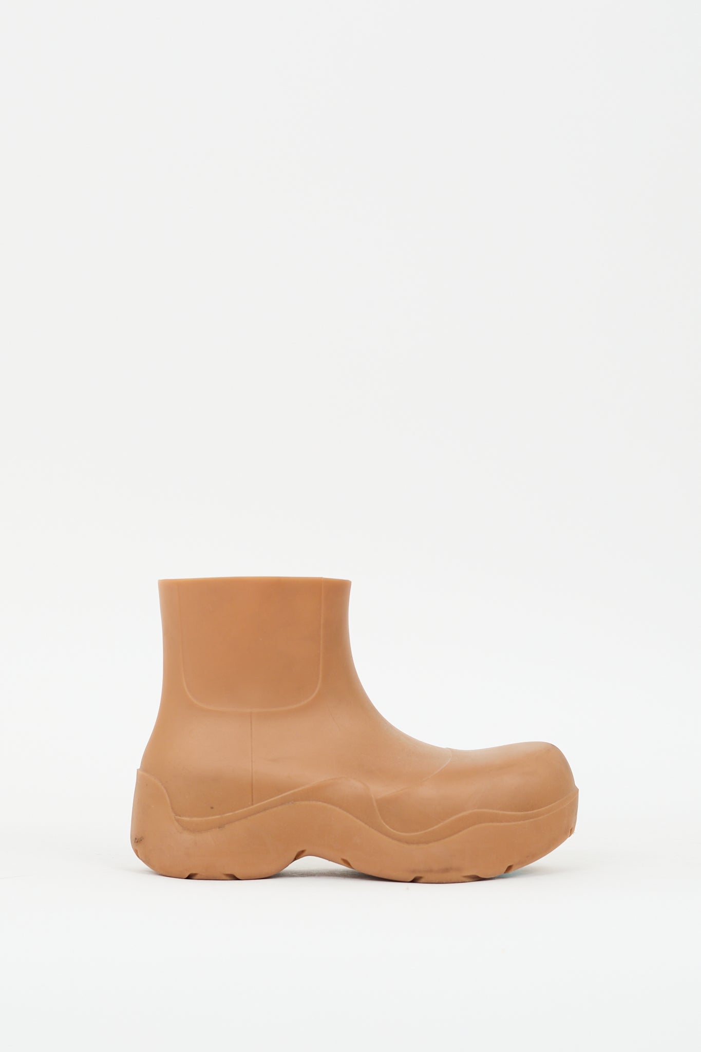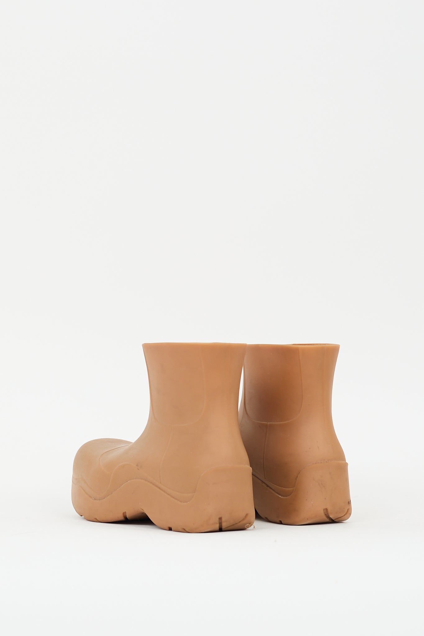 Pre-owned Bottega Veneta brown Puddle ankle boots featuring rounded toe, debossed gusset sides, platform midsole, and tonal treaded rubber outsole.