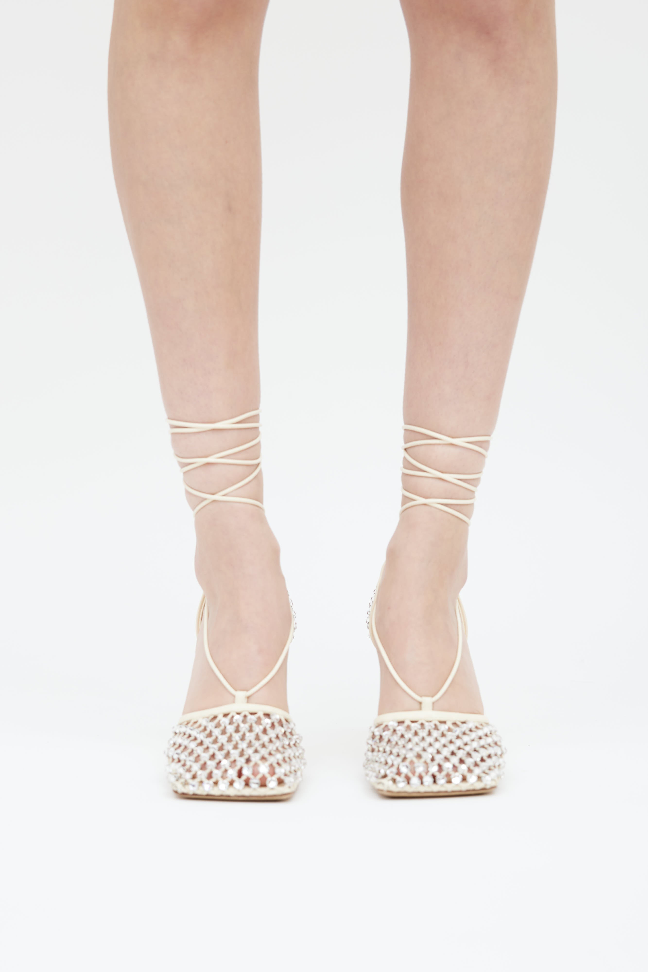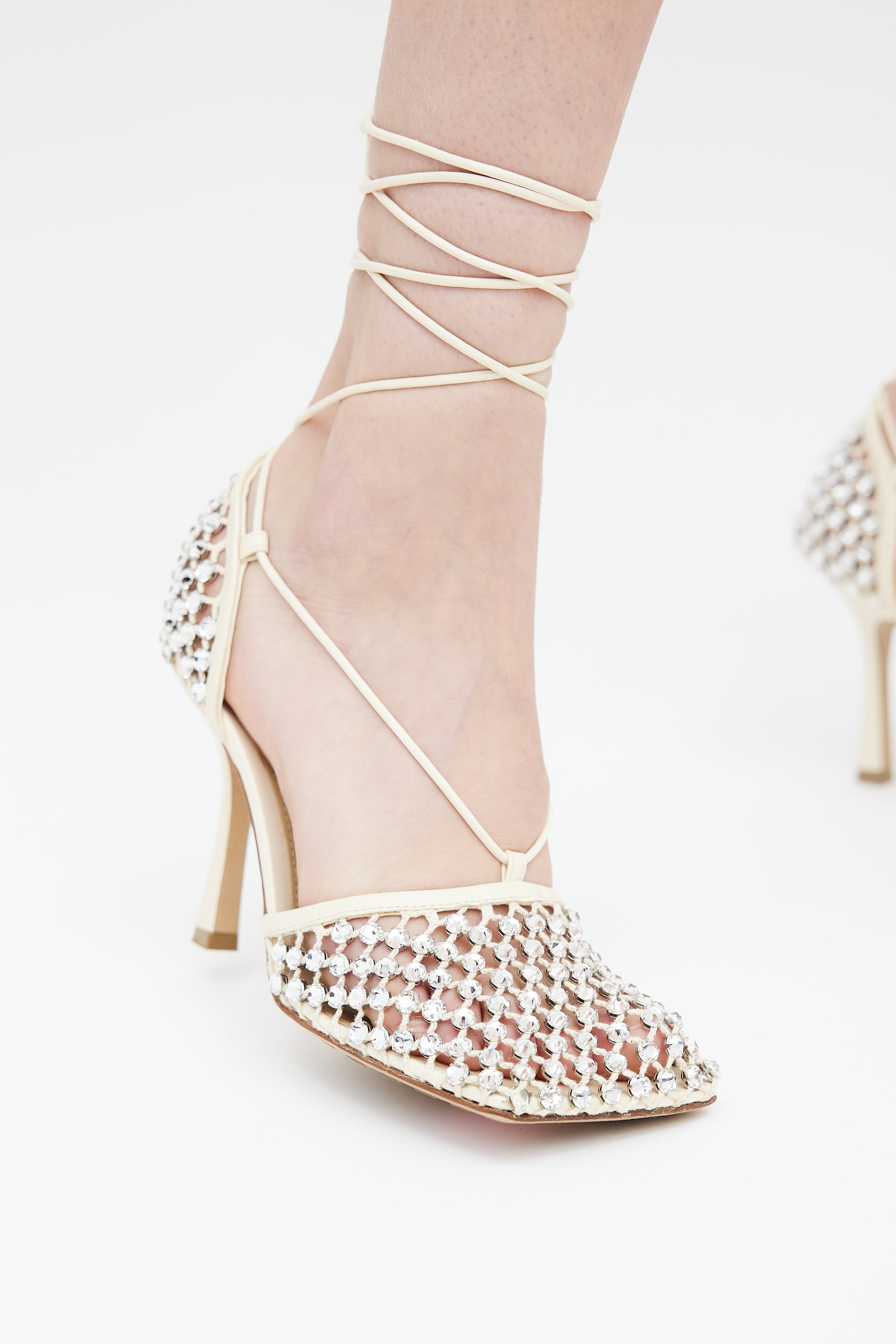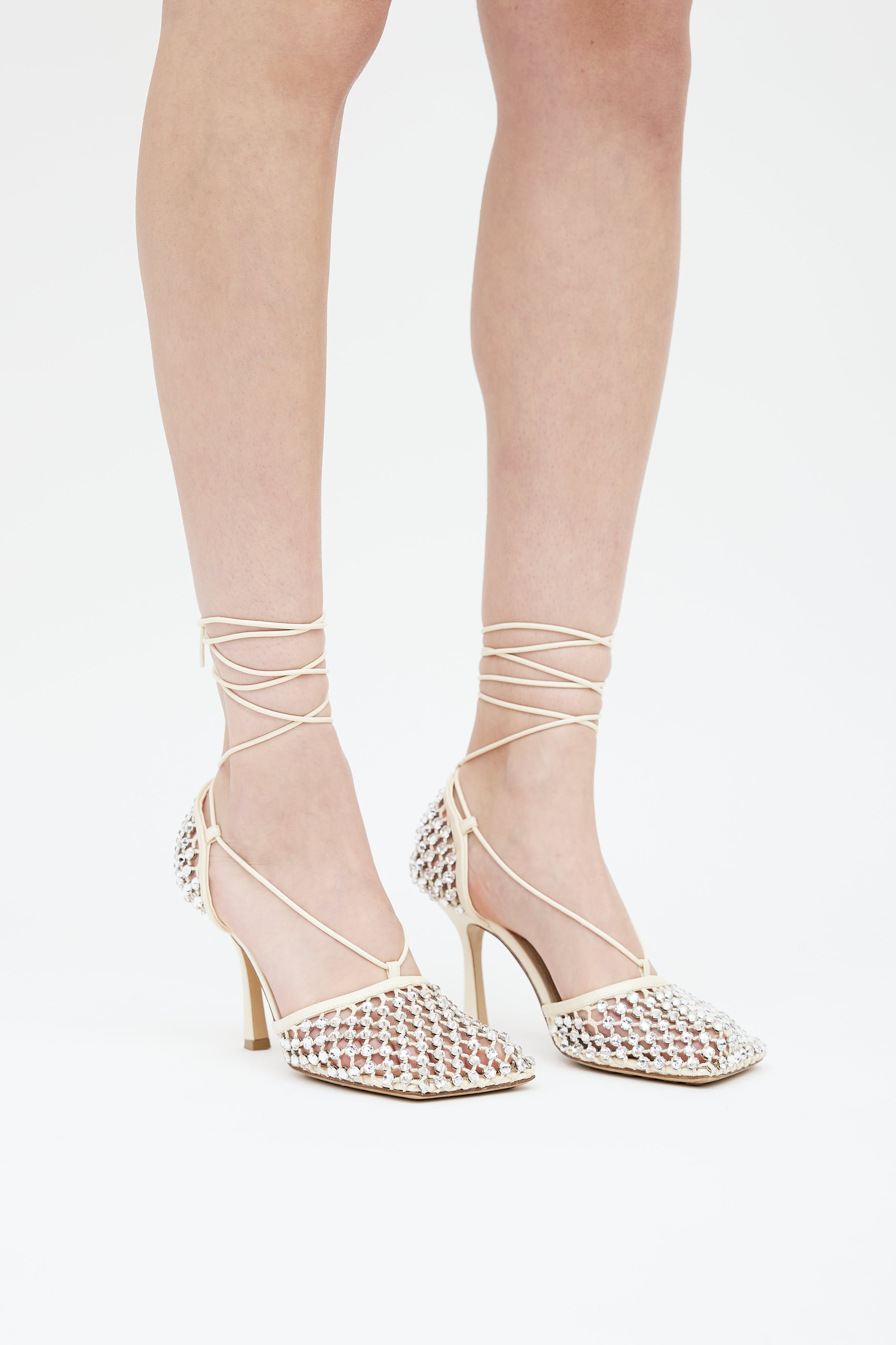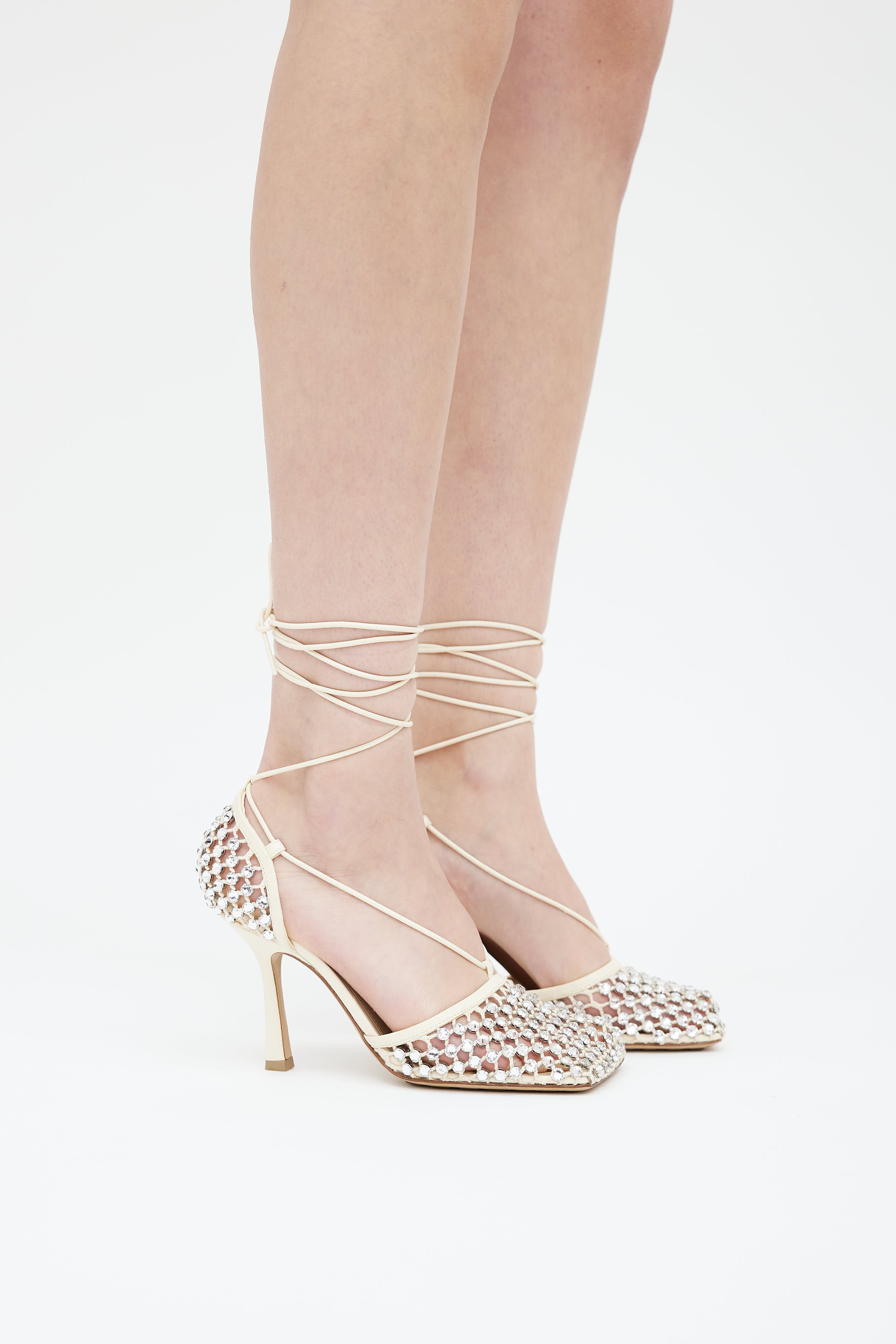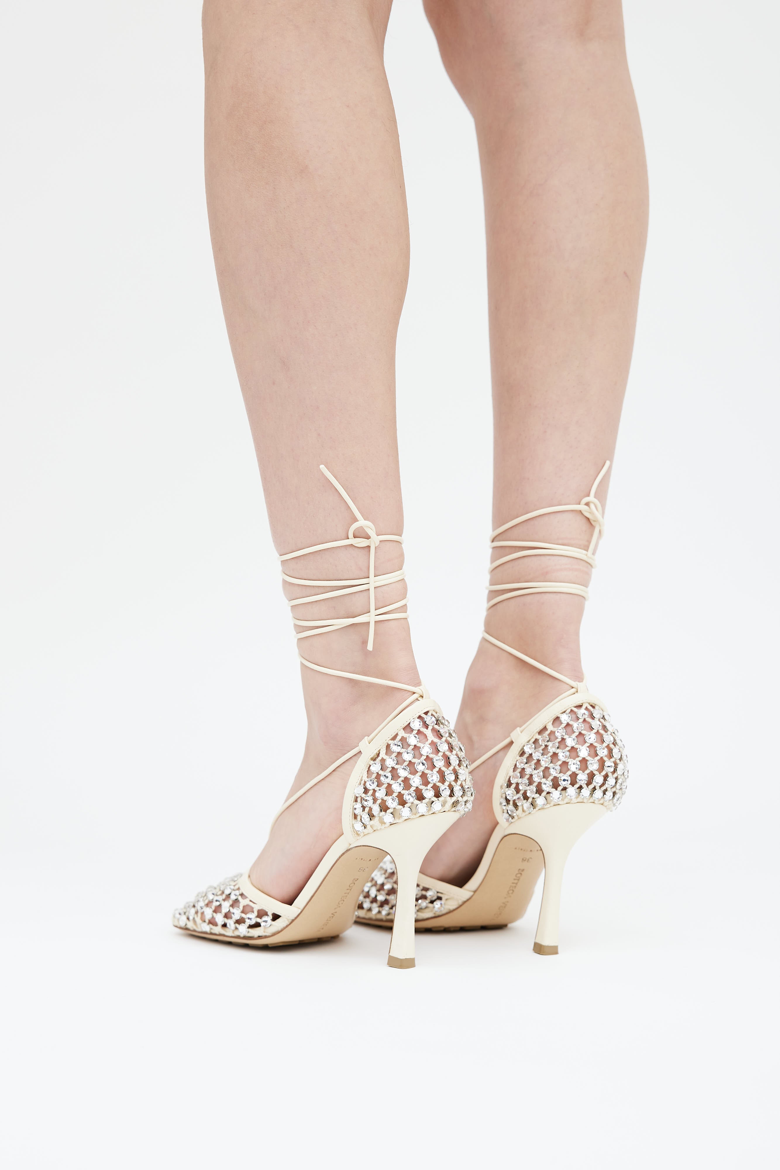 Pre-owned Bottega Veneta cream leather sparkle stretch heel featuring lace up at ankle, square toe, mesh toe and counter with silver diamante detailing, stiletto heel and leather insole. Comes with original dust bag.