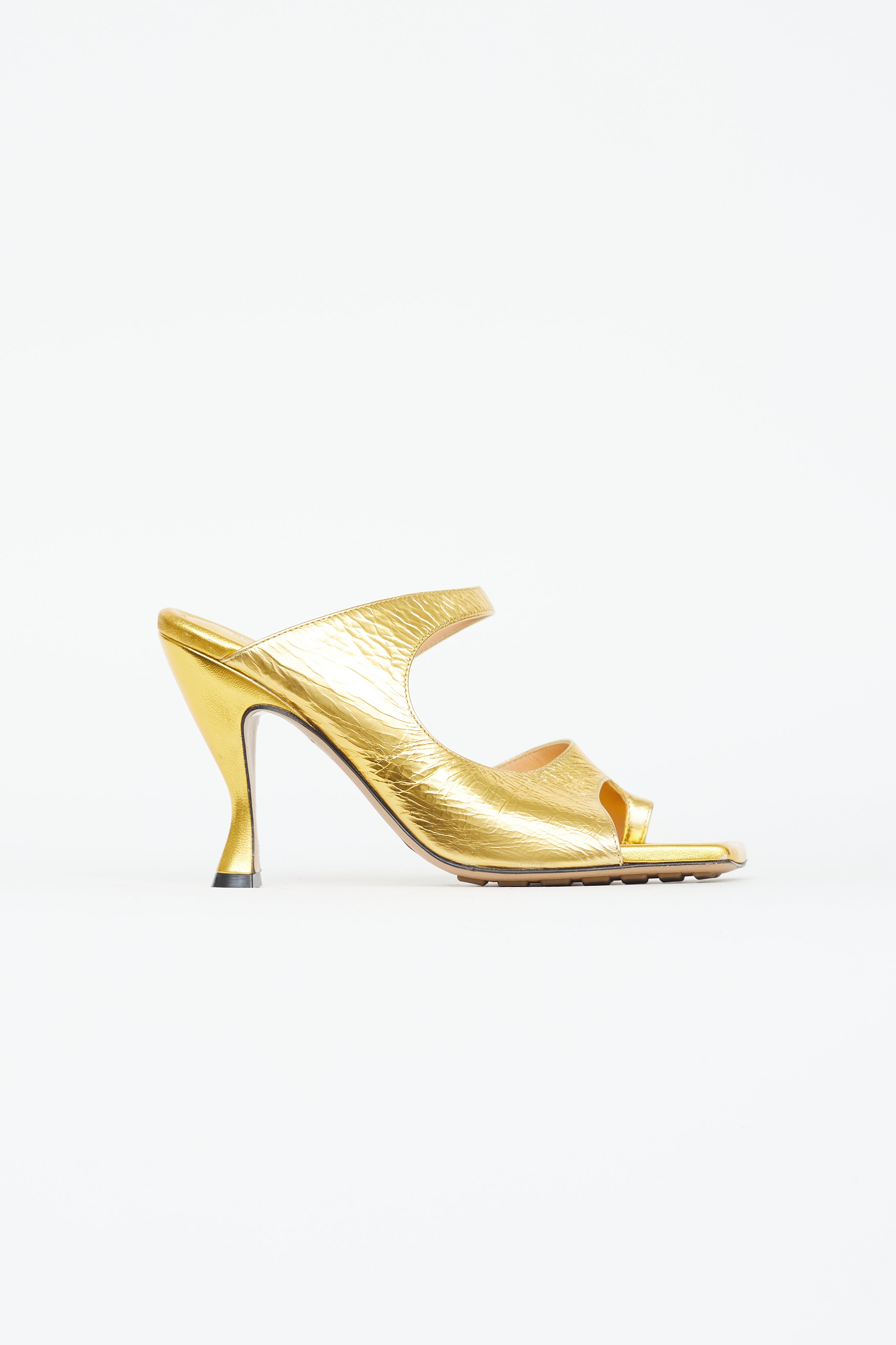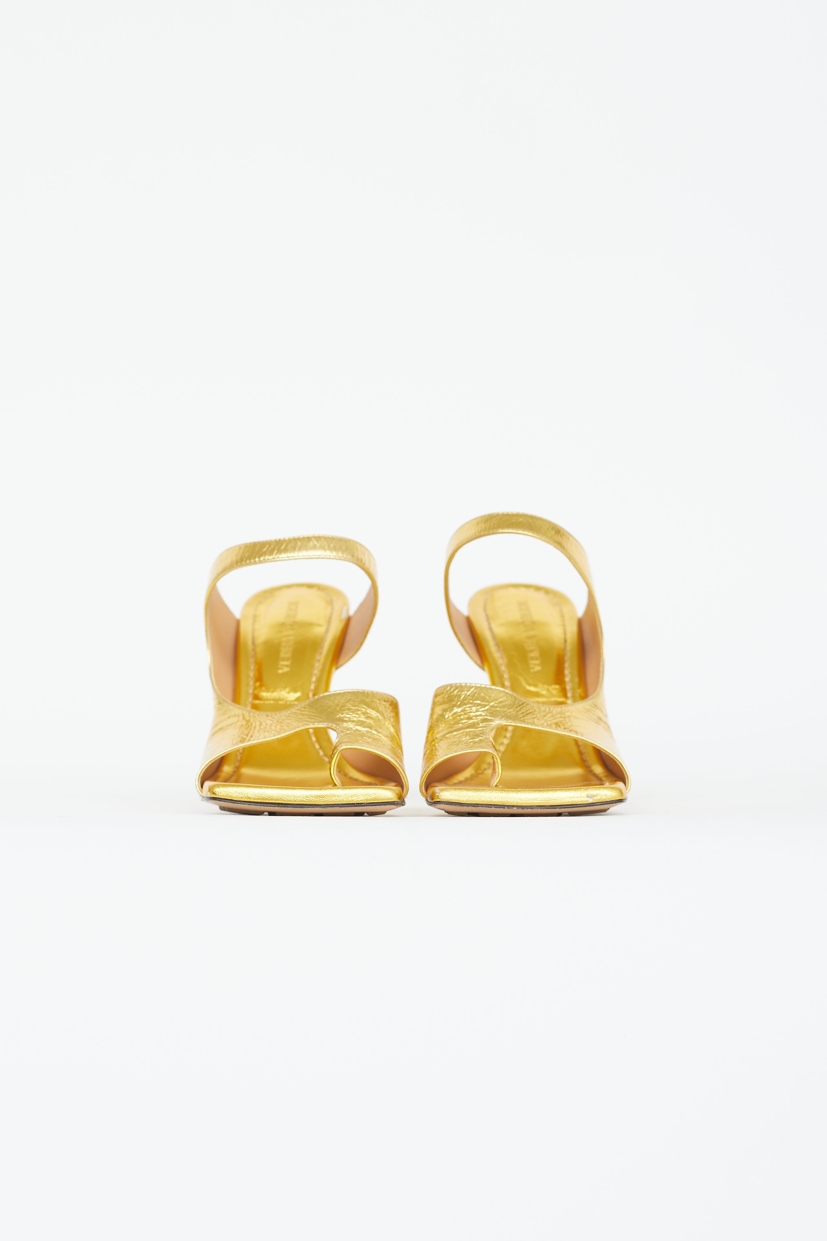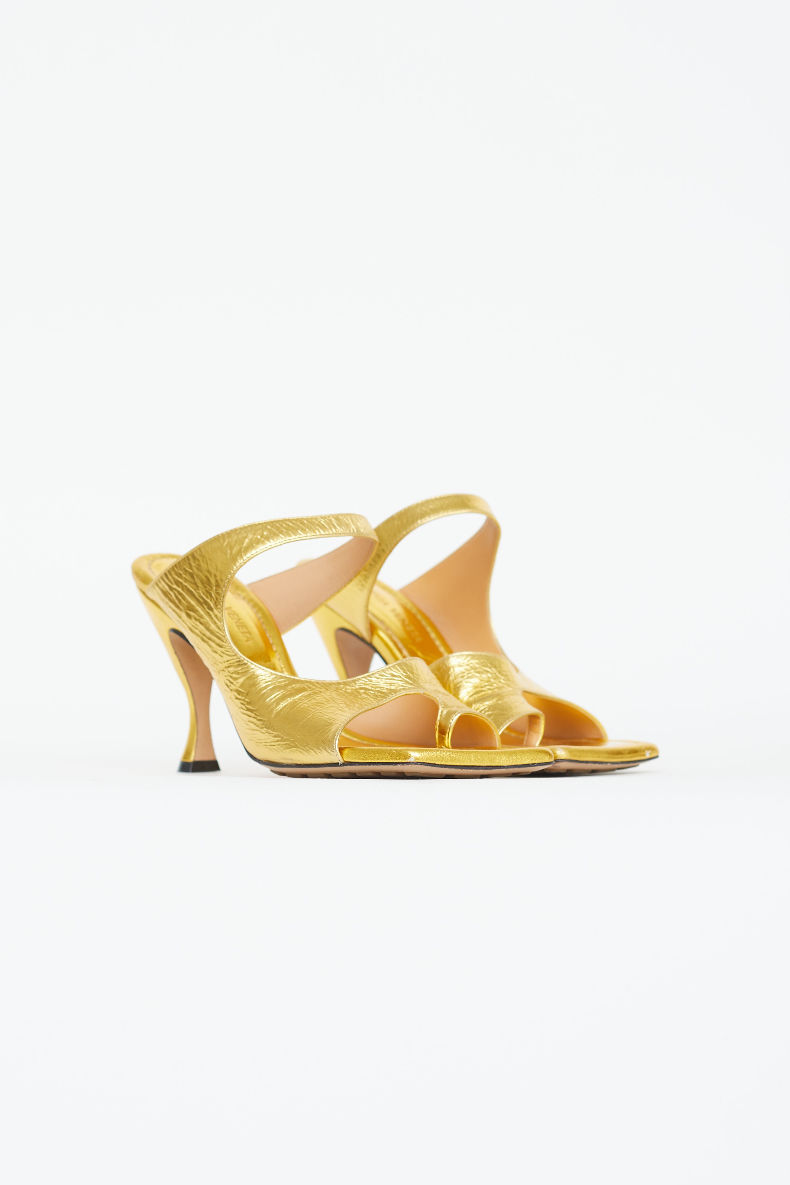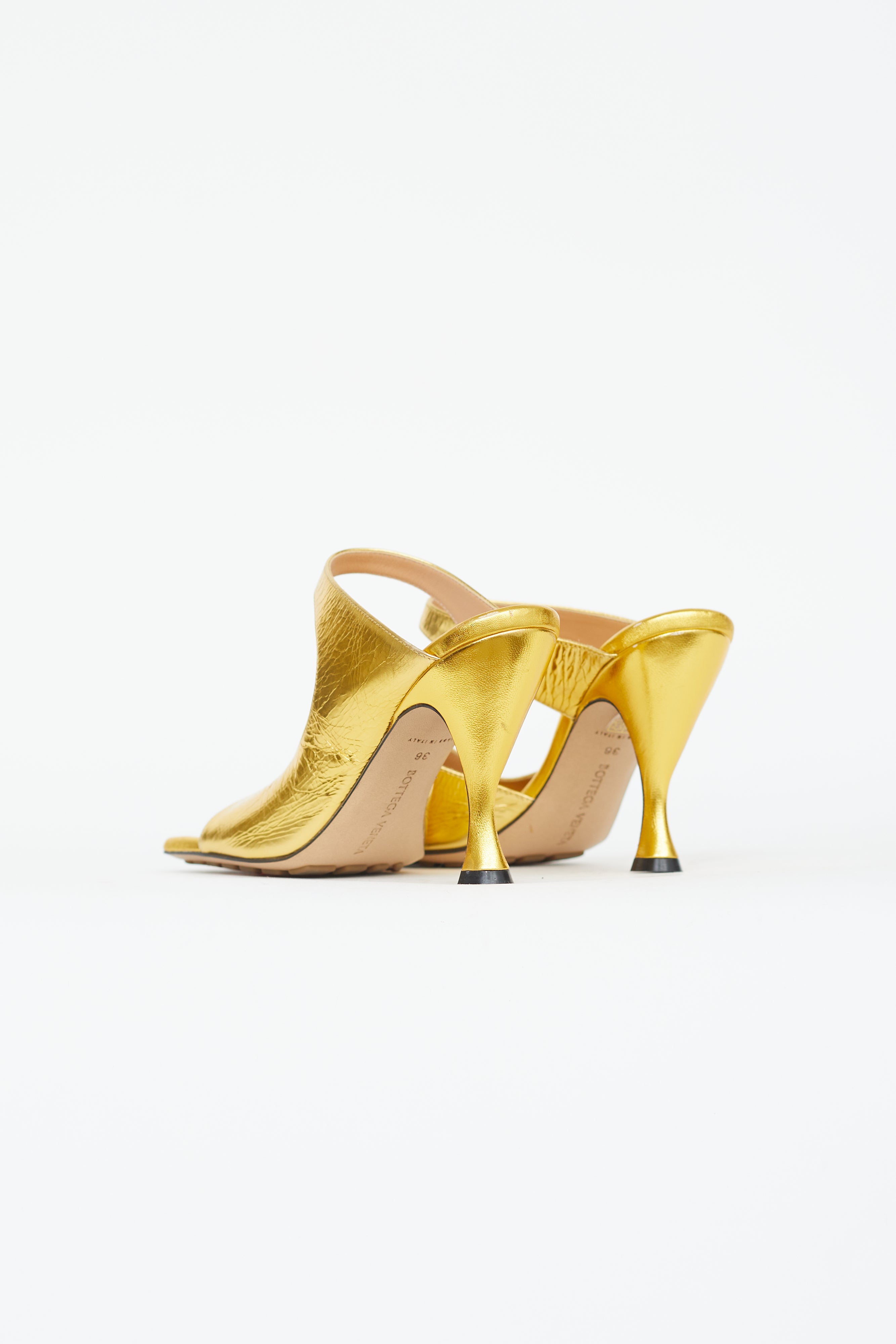 Pre-owned Bottega Veneta Vitello mule in gold lamé featuring squared toe, comma heel, strap at vamp and toe, rubber padding at outsole.