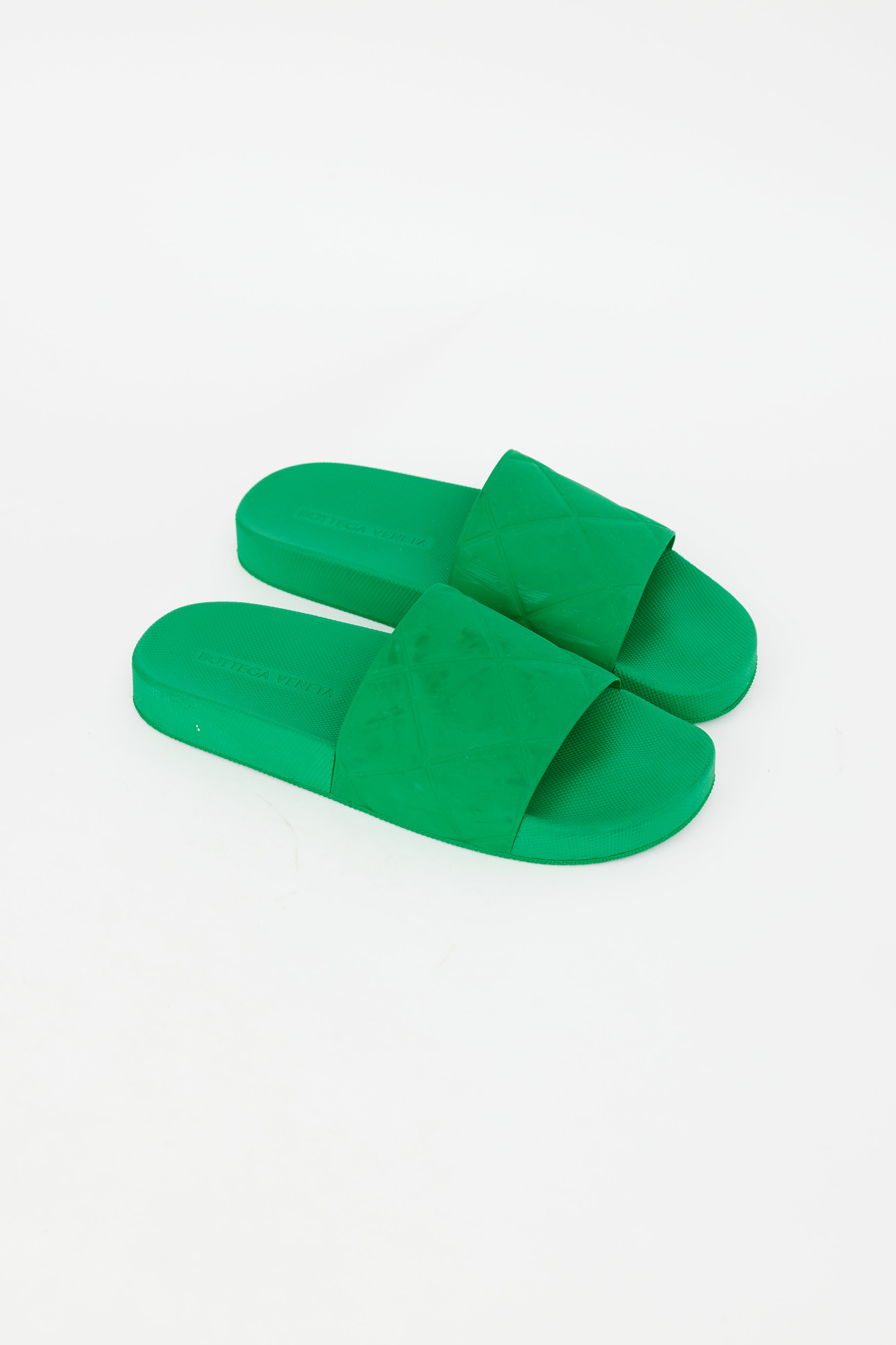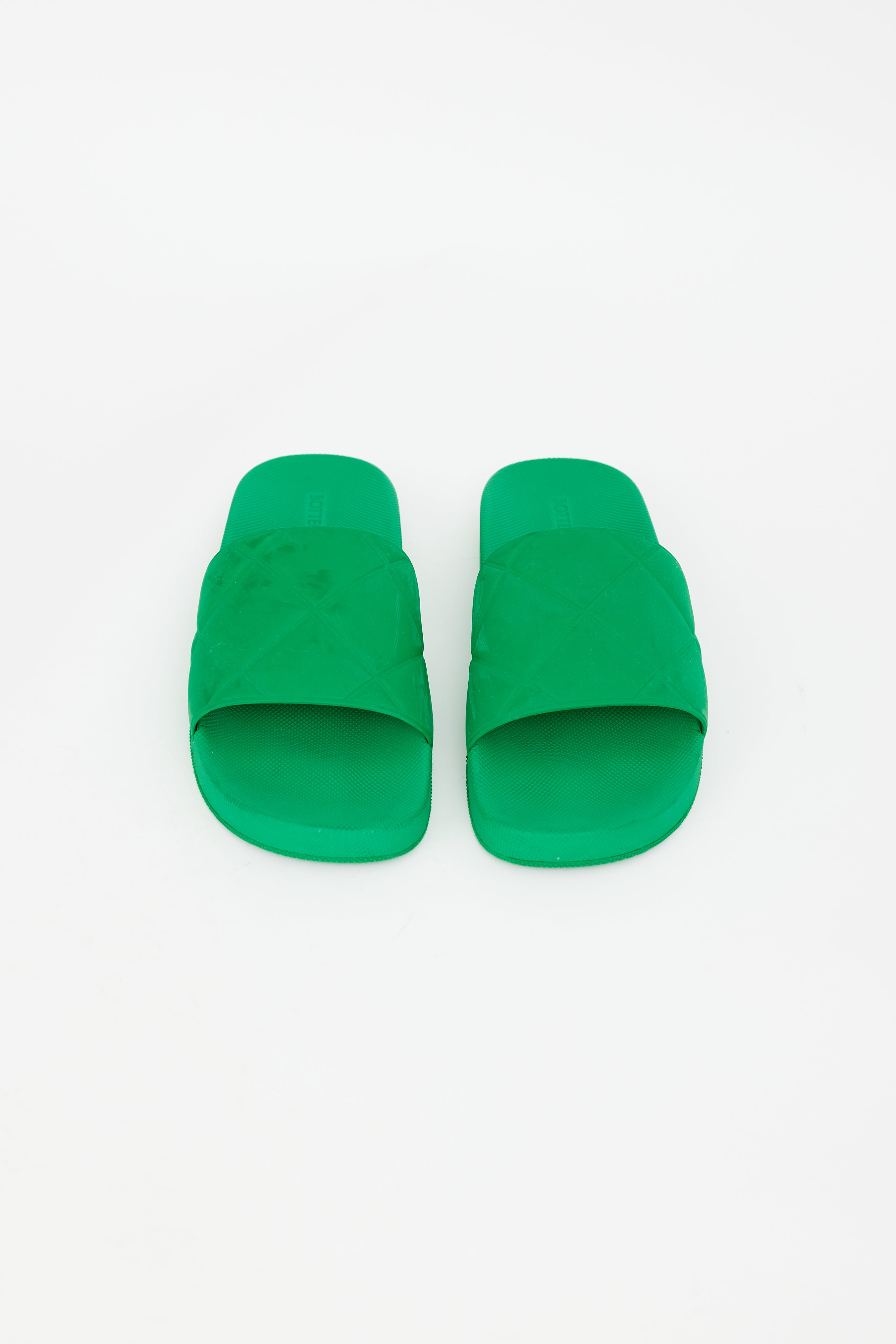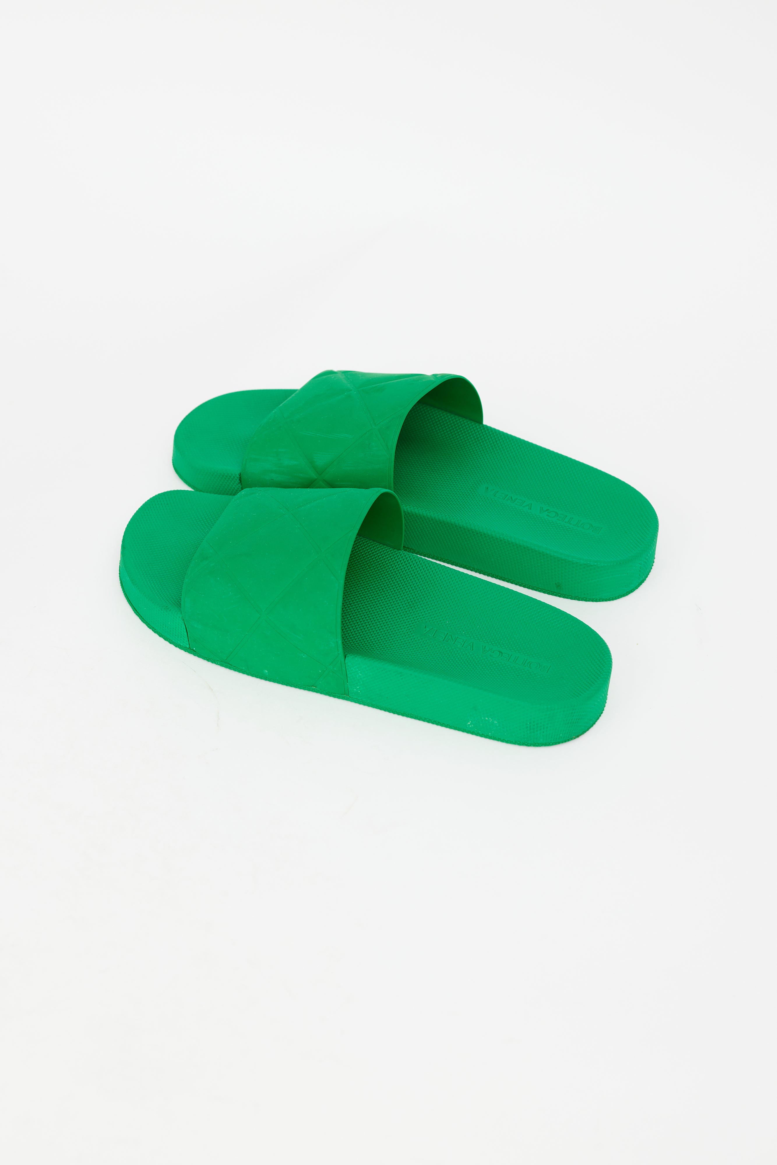 Pre-owned Bottega Veneta green rubber slide featuring a rounded square toe, quilted rubber strap, and textured insole.