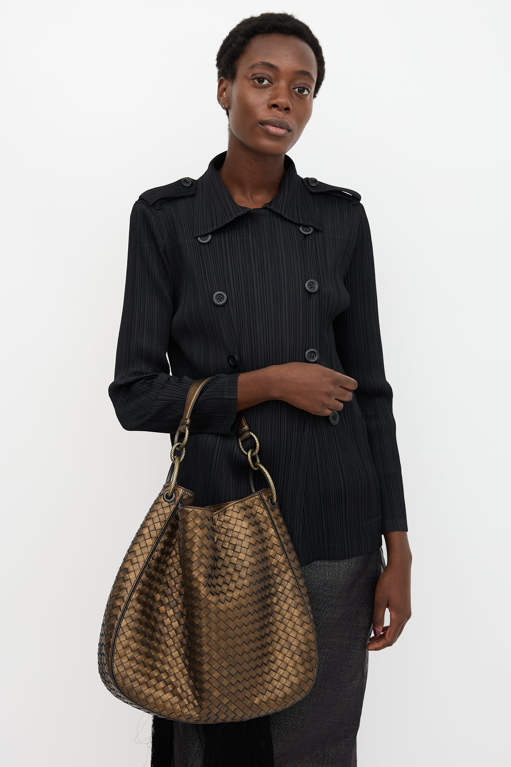 Pre-owned Bottega Veneta bronze leather Loop shoulder bag featuring Intrecciato weave, gold tone hardware with reptile motif, fixed shoulder strap, open compartment, suede lining, and interior compartment includes one main pocket, two slip pockets, and one zip pockets. Includes original dust bag.