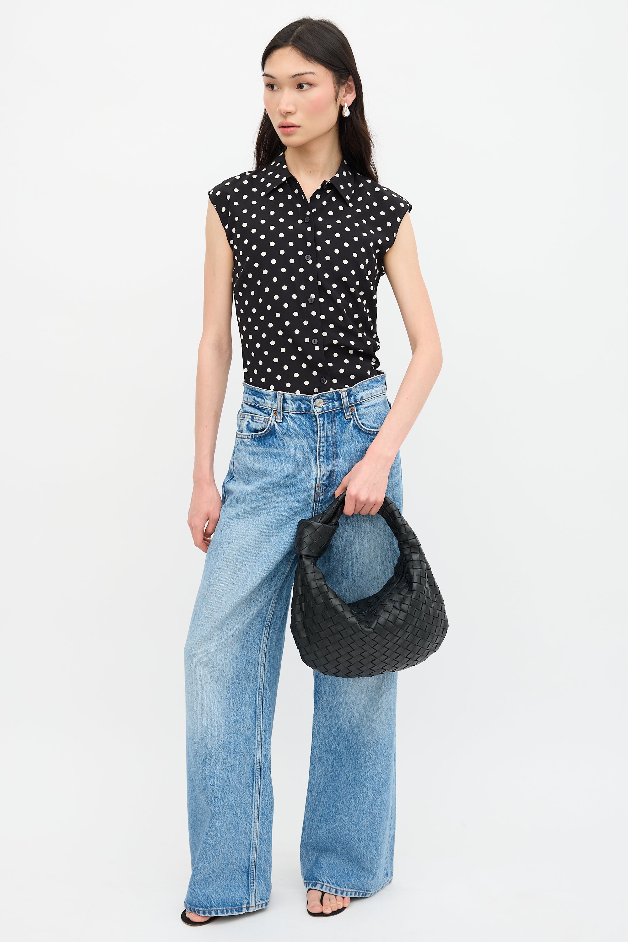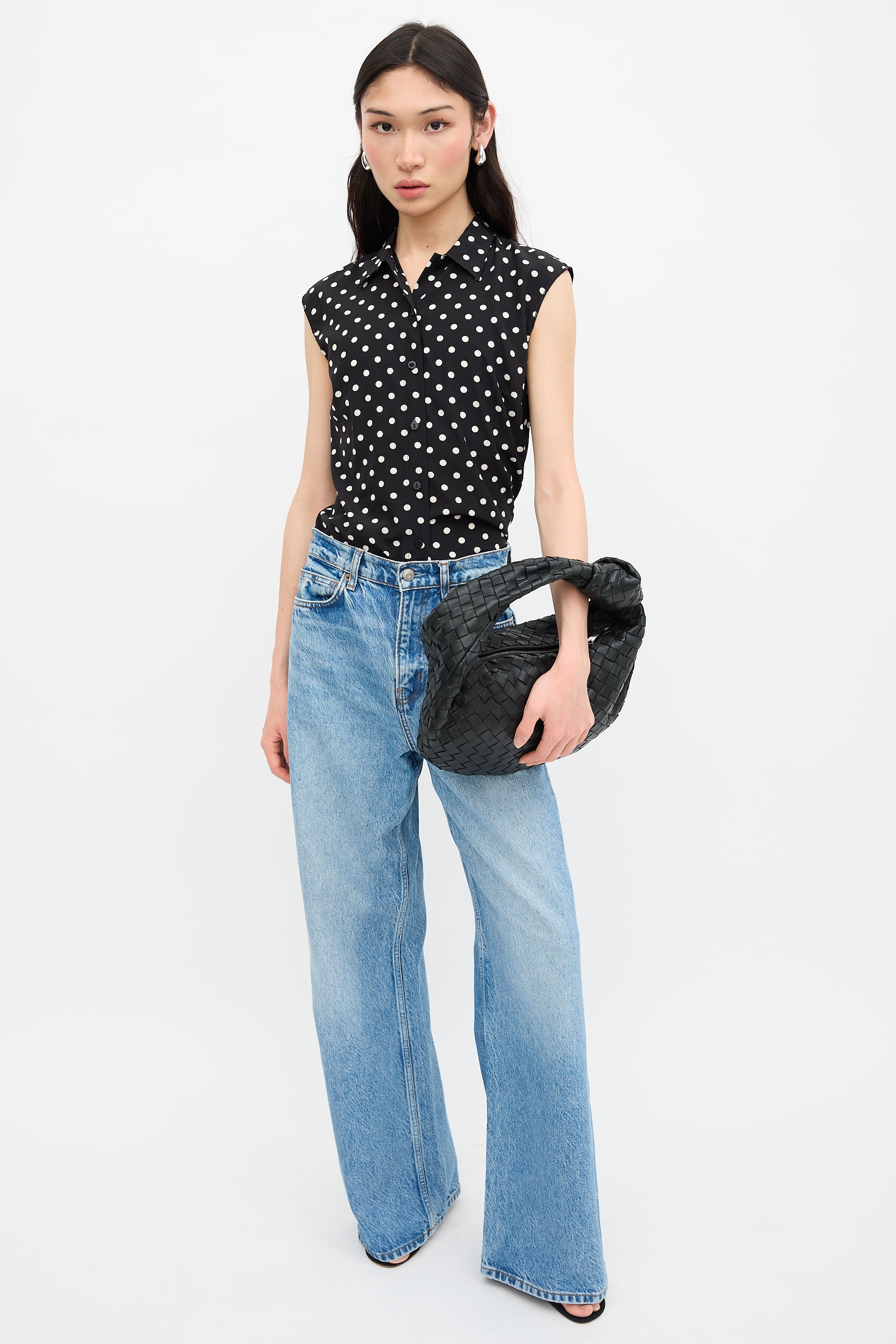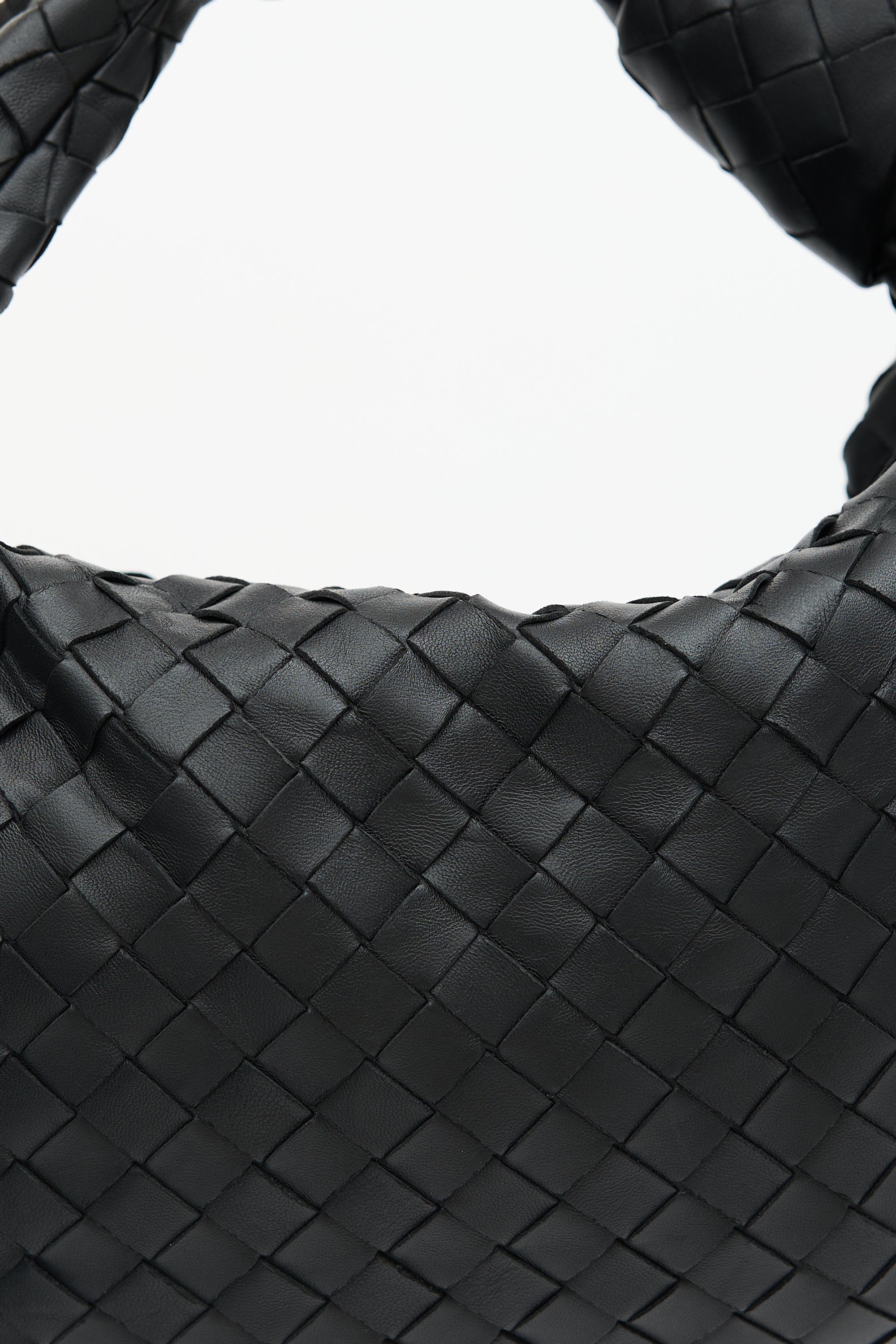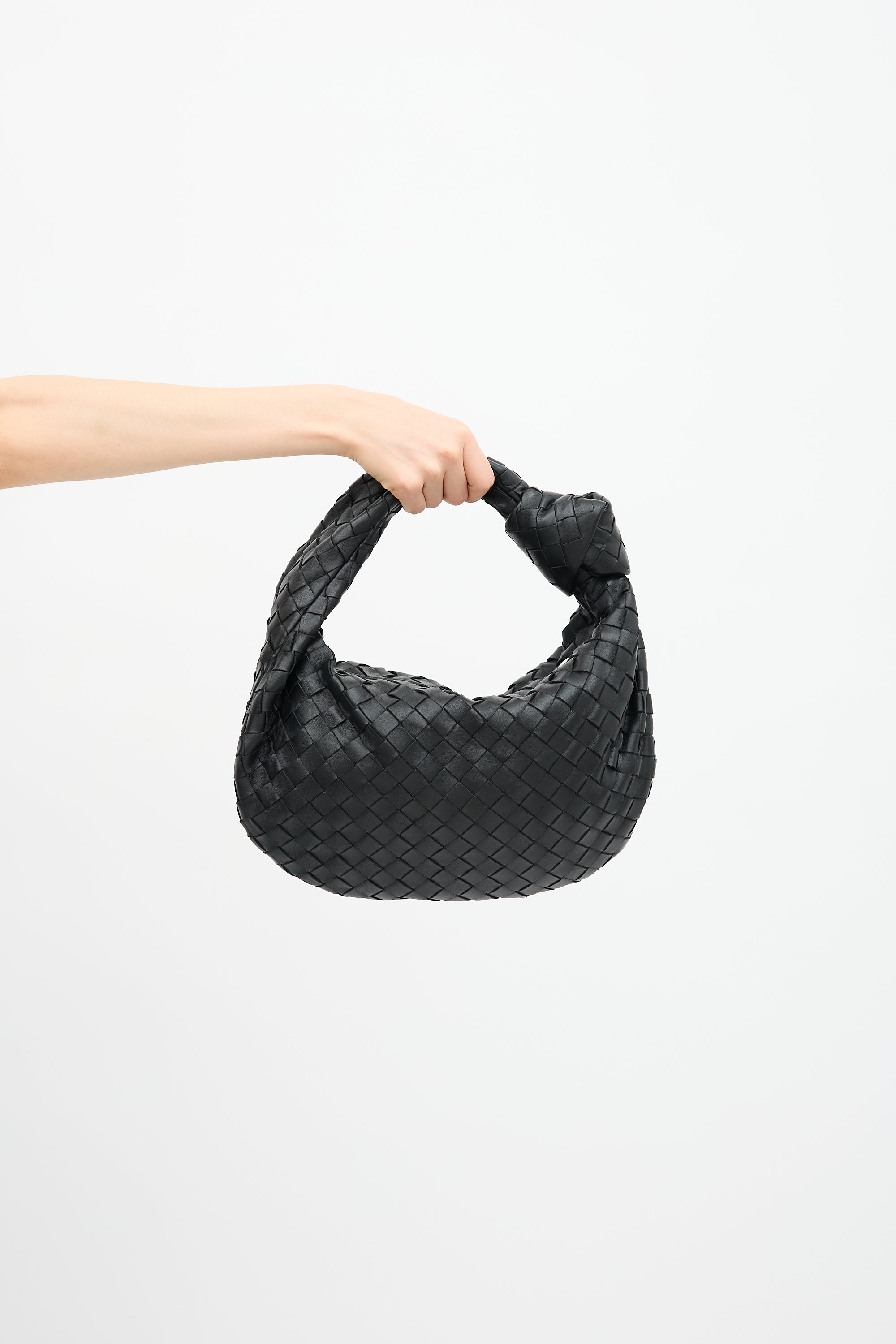 Pre-owned Bottega Veneta black Teen Jodie handbag featuring signature Intrecciato woven leather body, knotted strap, silver tone top zip closure, and one lined main compartment. Comes with original dustbag.