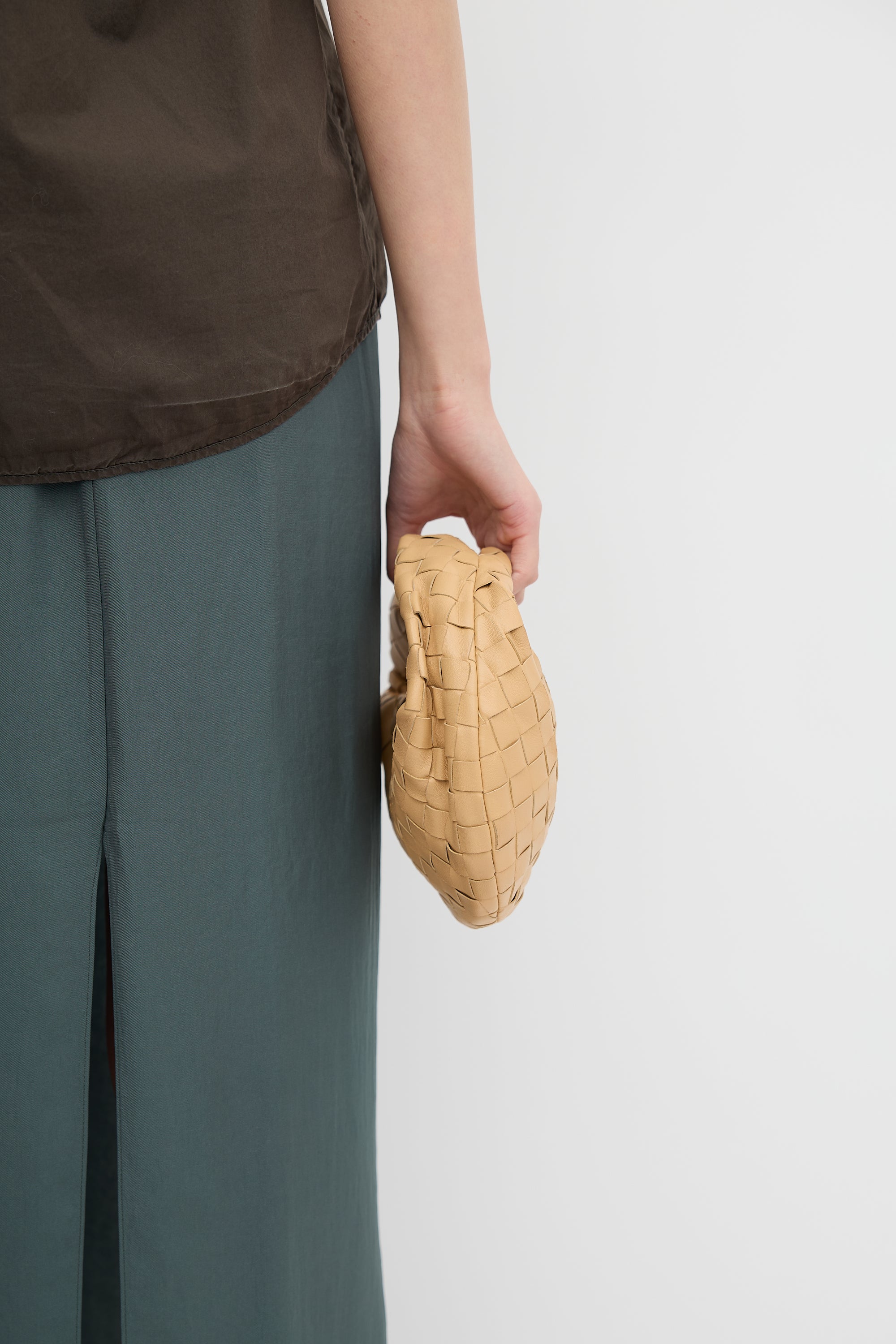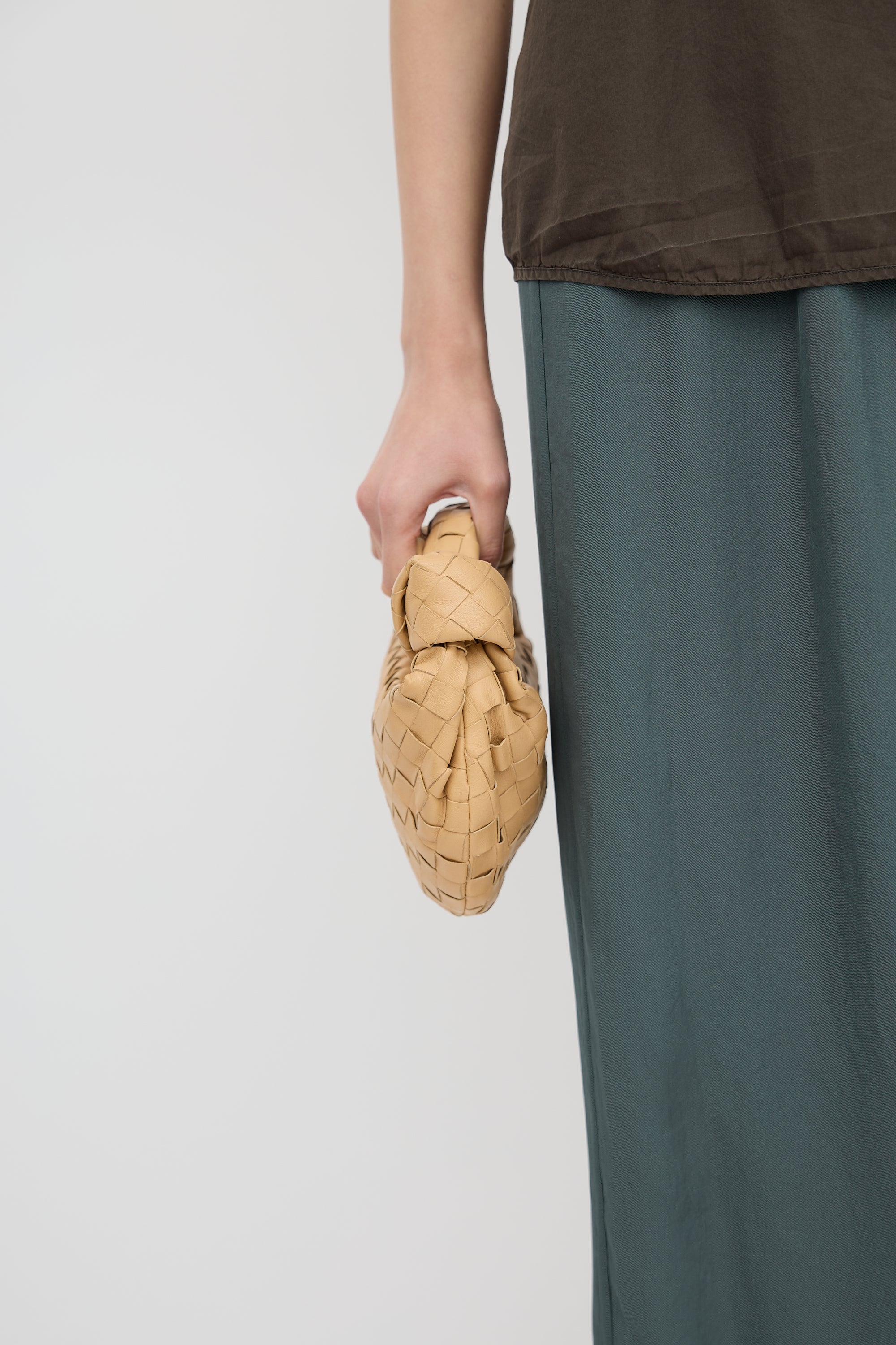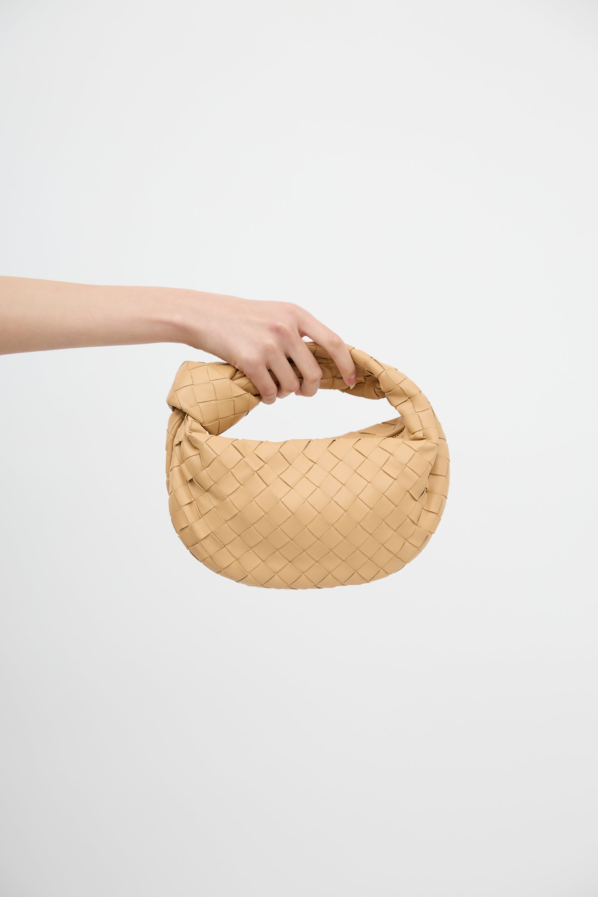 Pre-owned Bottega Veneta beige leather mini Jodie handbag featuring signature Intrecciato woven exterior, knotted top handle, top zip closure, and one lined main compartment.
