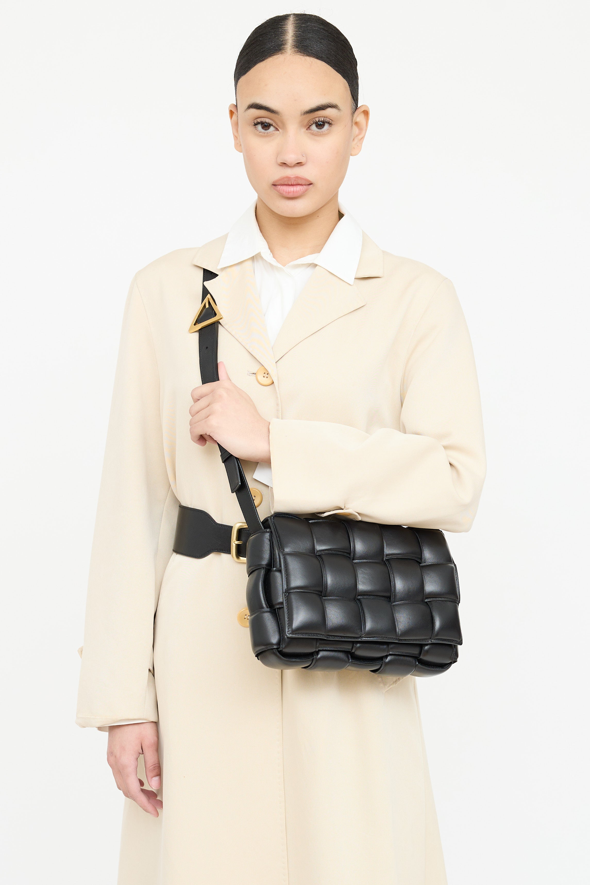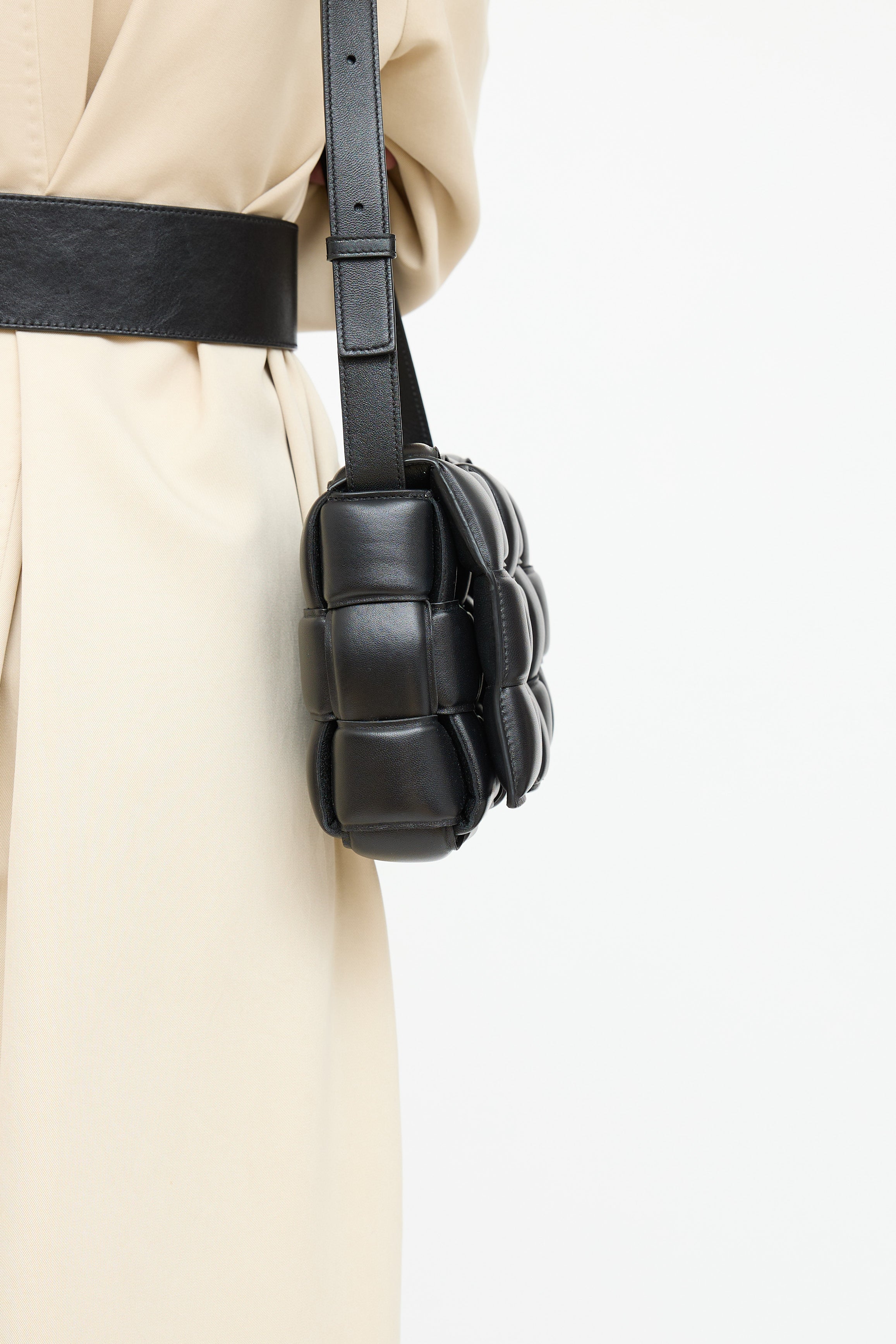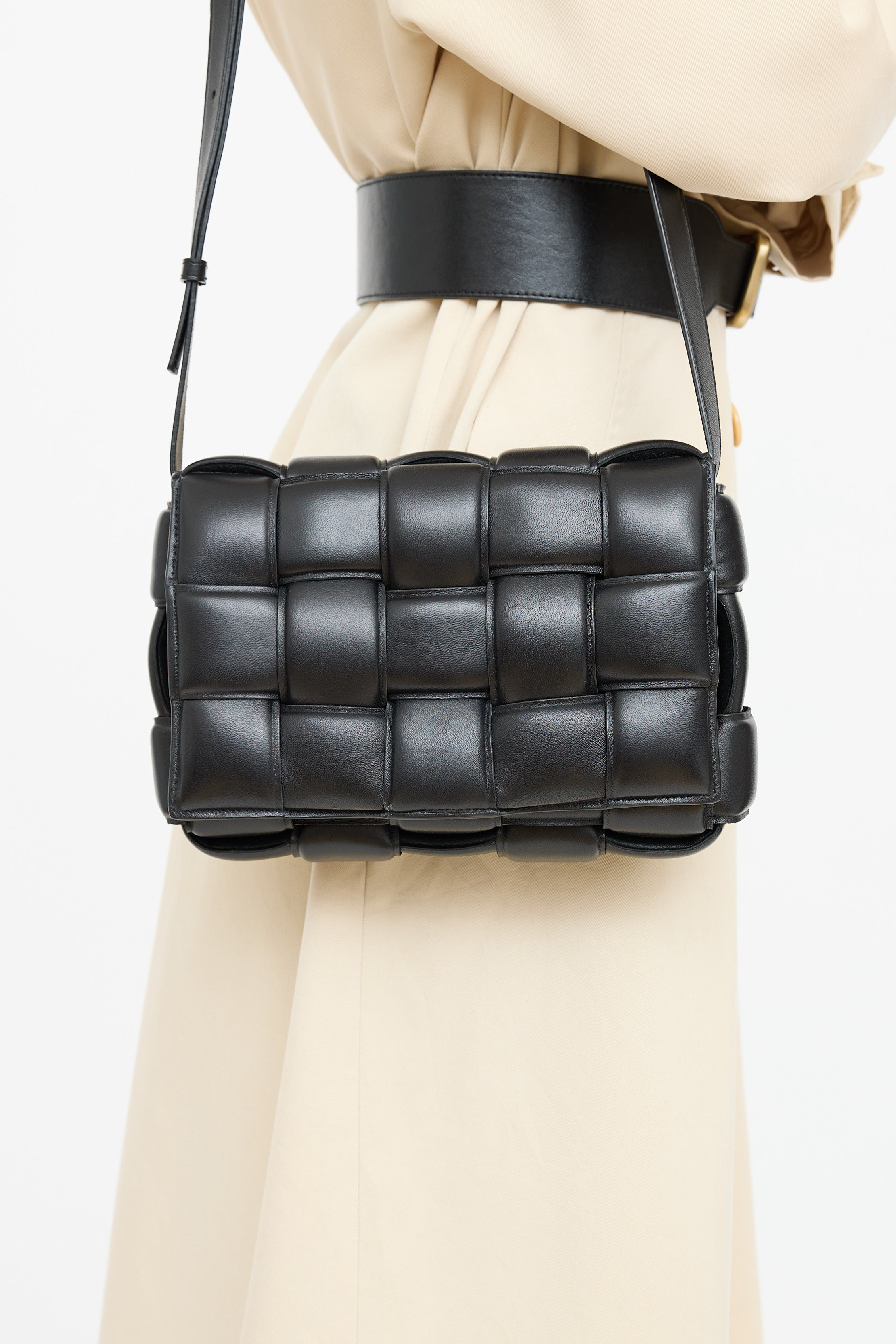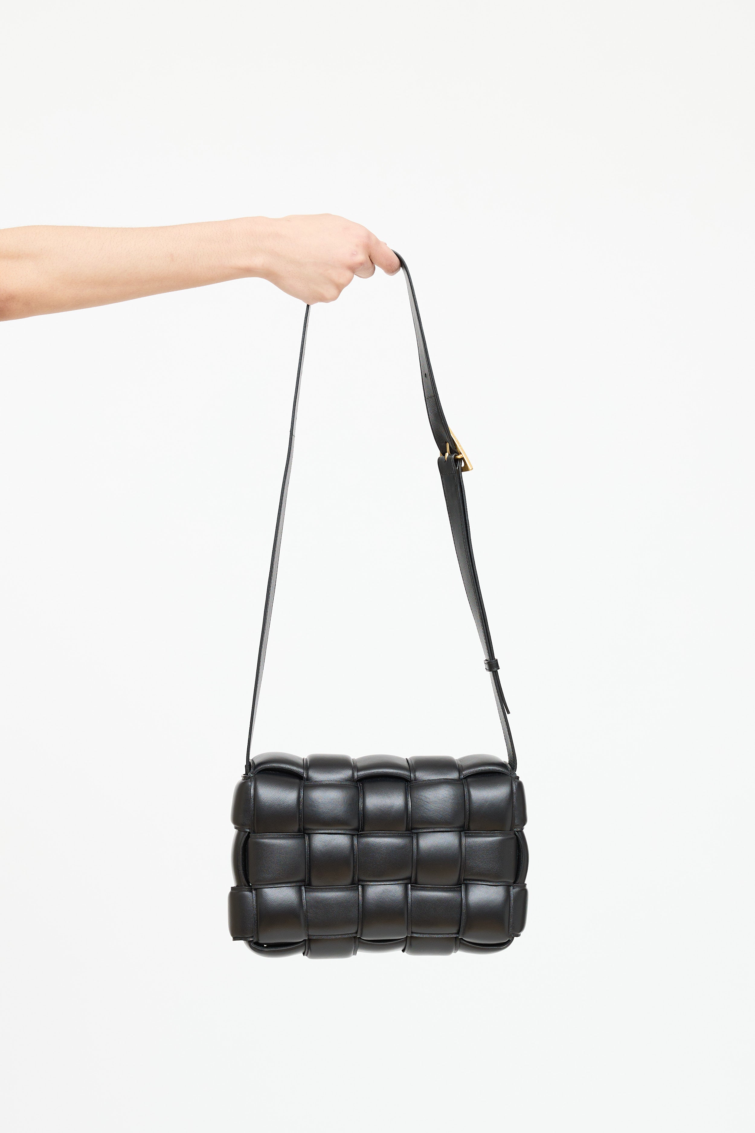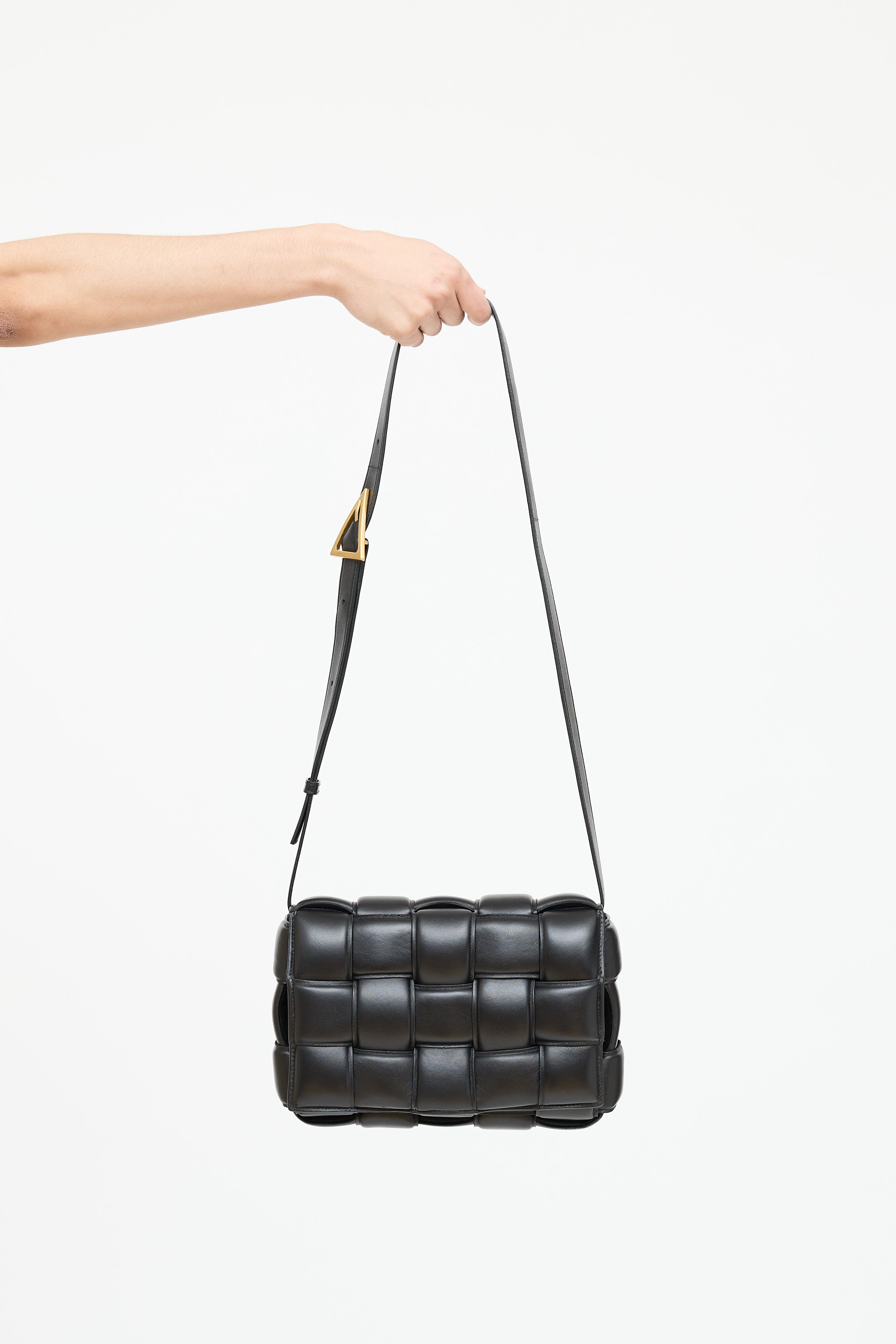 Pre-owned Bottega Veneta black leather padded Cassette bag featuring woven Intrecciato body, gold tone hardware, flat adjustable shoulder strap with triangle buckle, front flap with etched logo plaque at slide closure, and one main compartment with one zip pocket.