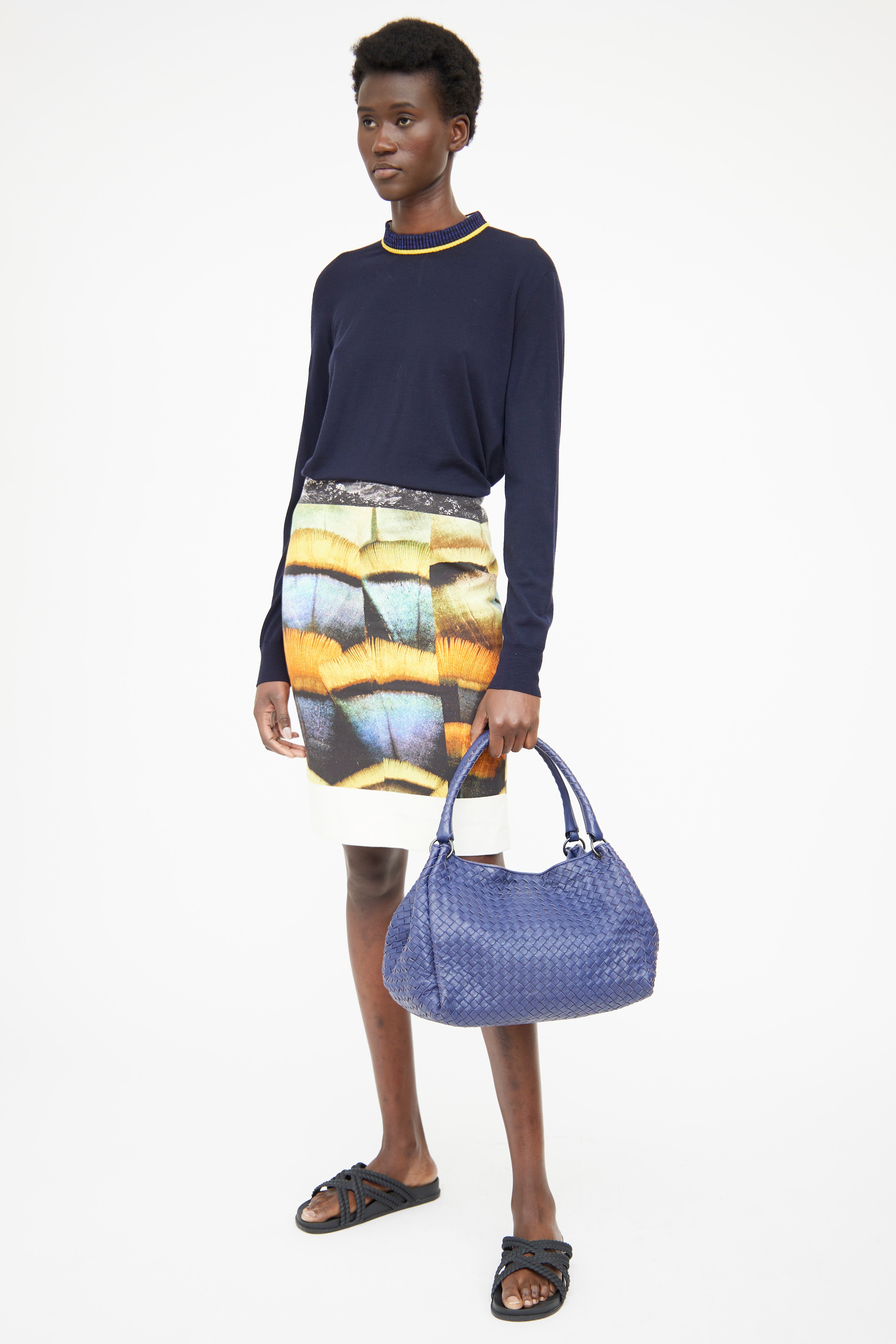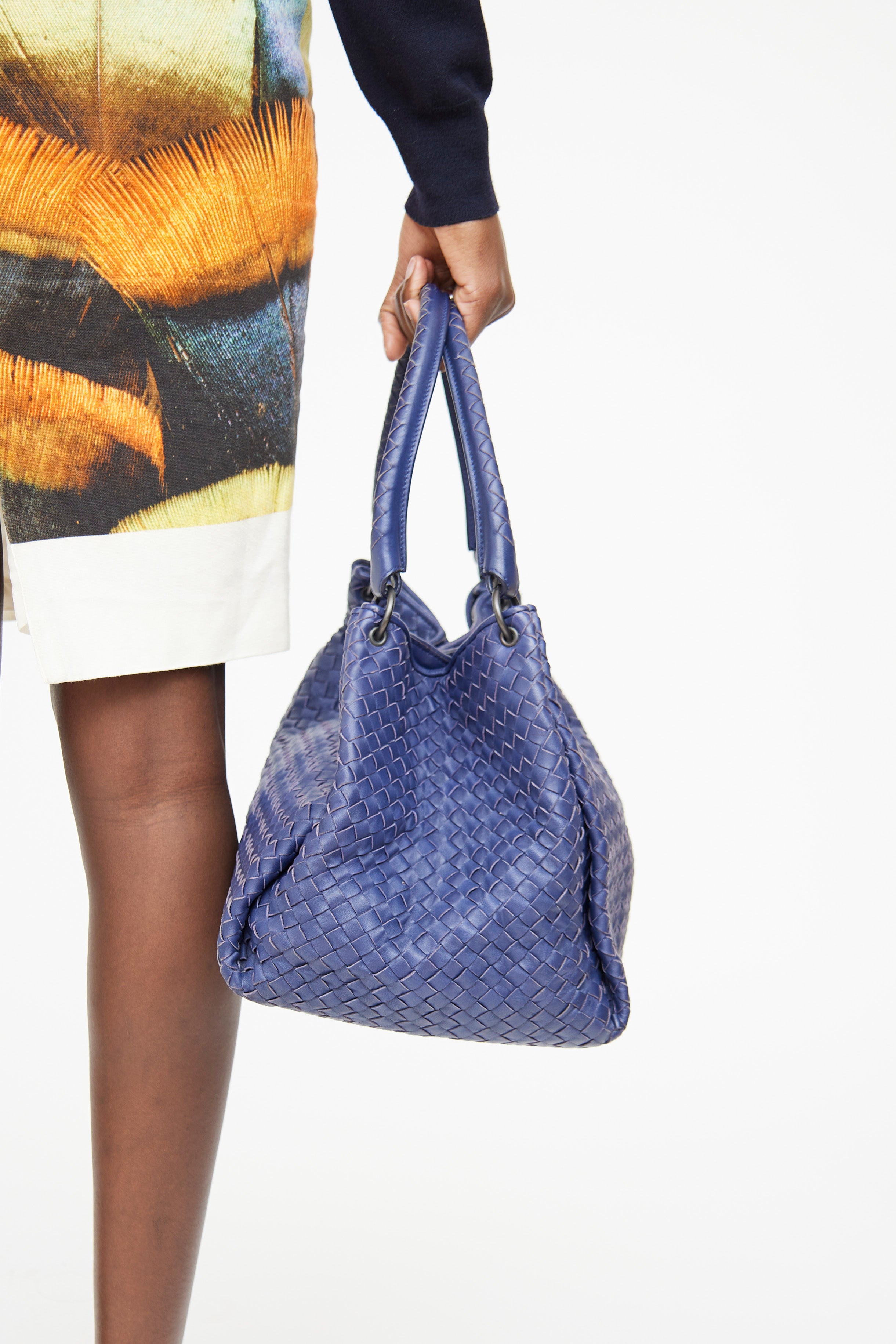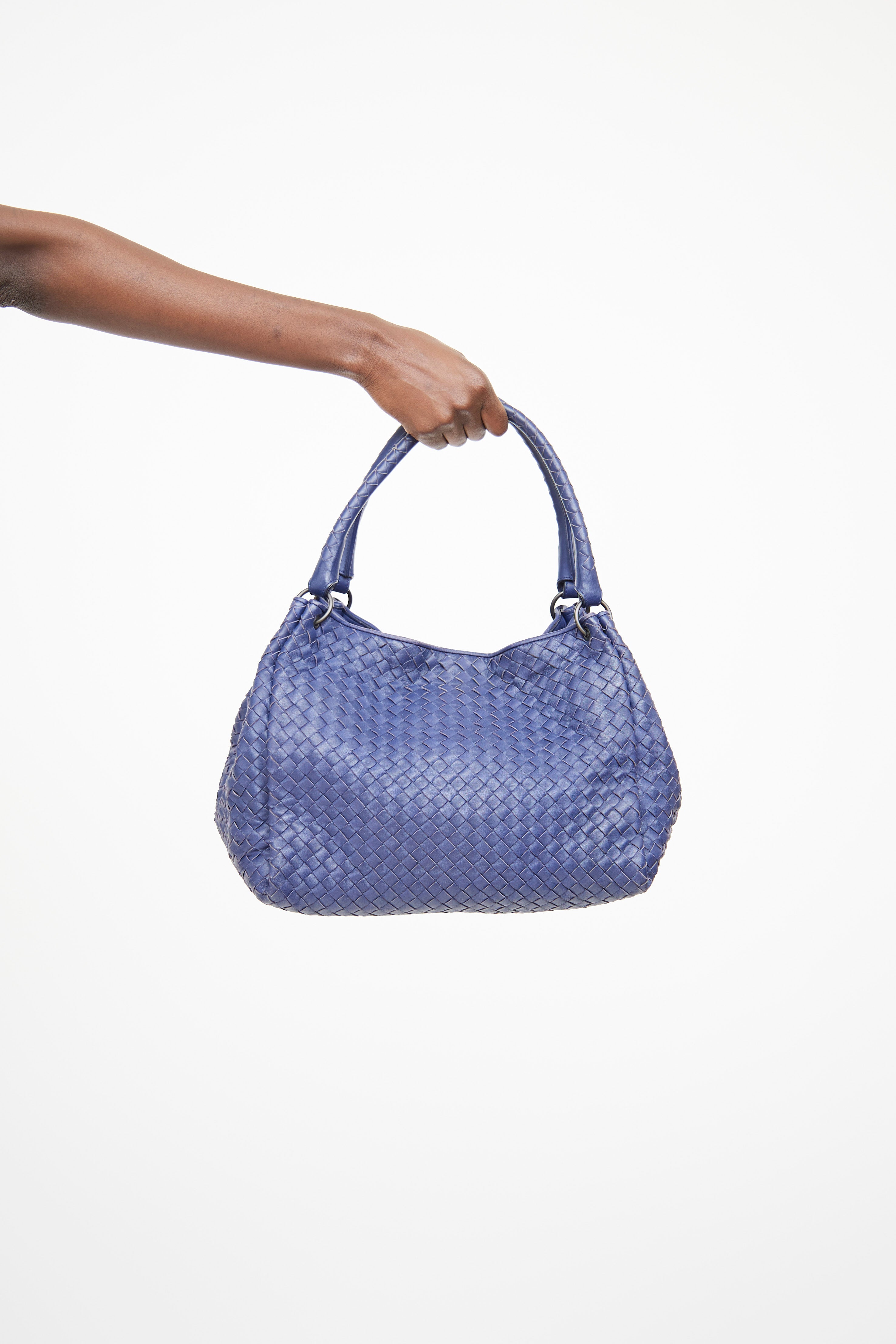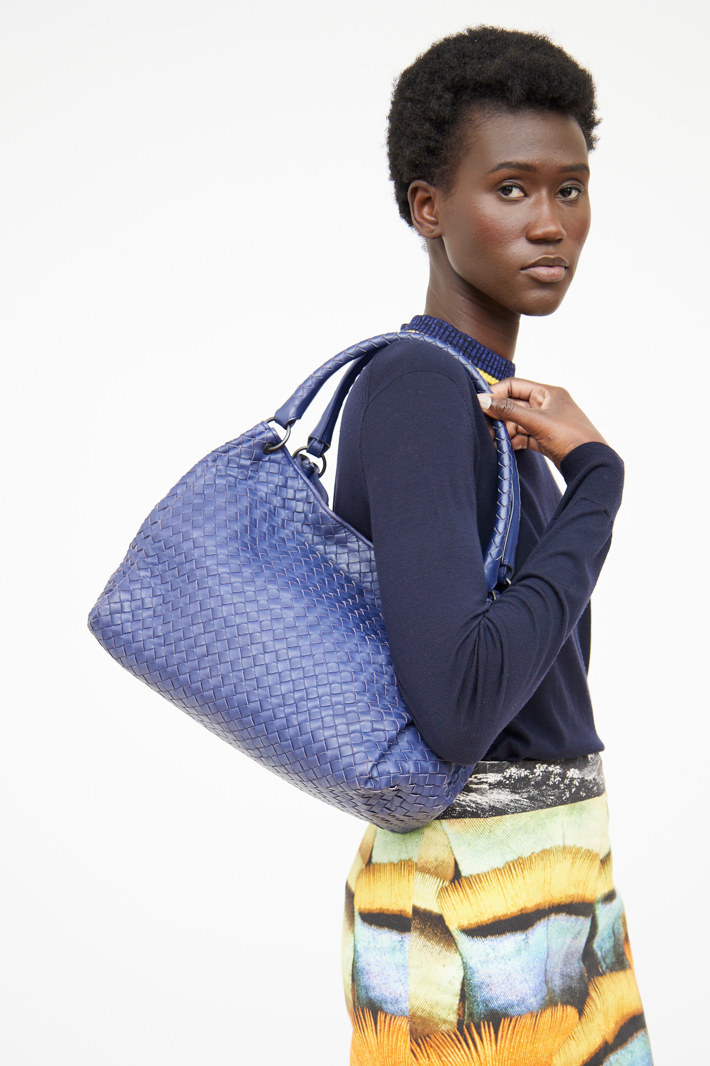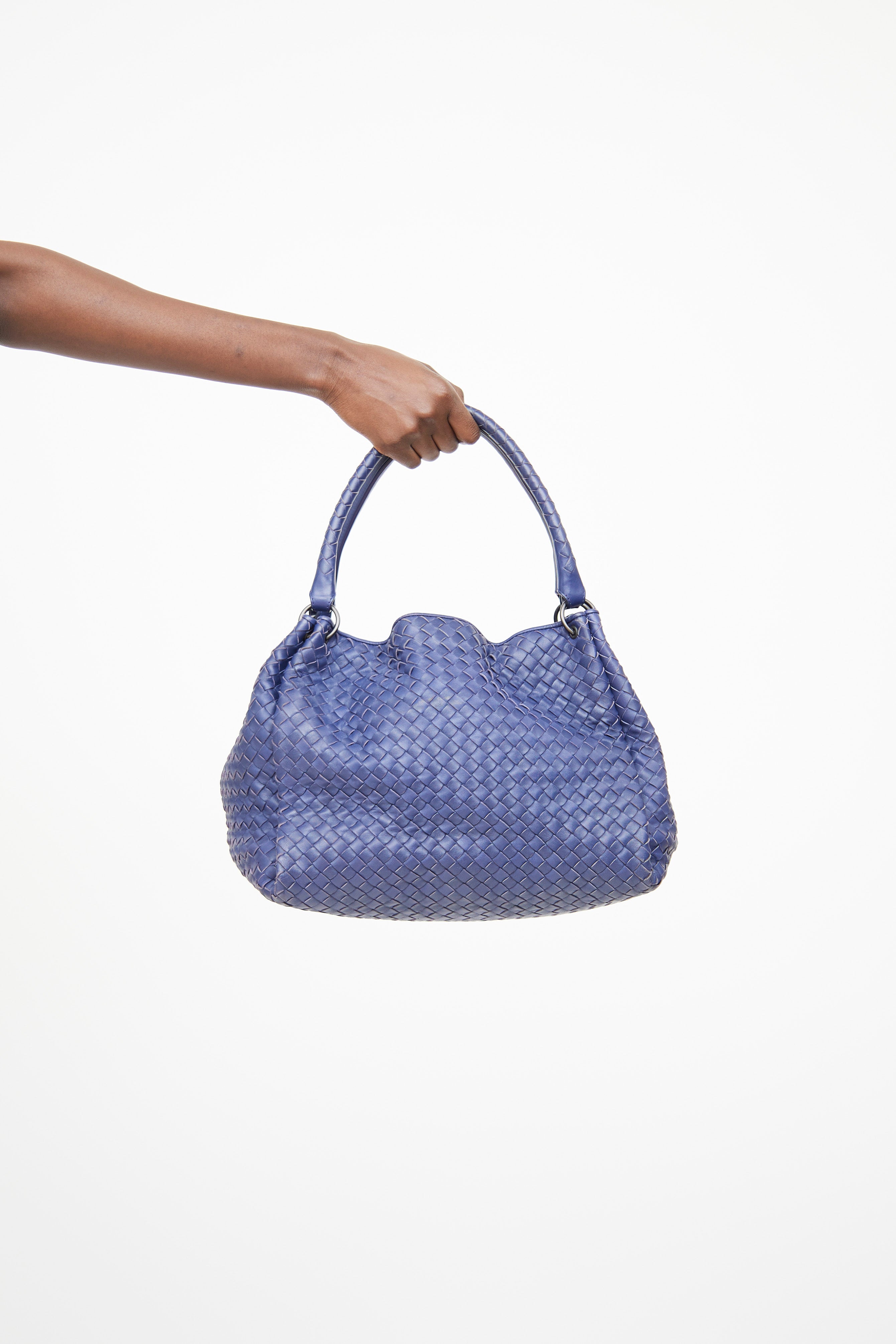 Pre-owned Bottega Veneta Navy Nappa Parachute bag featuring dual rolled top handles, top snap closure opening, interwoven detailing throughout, square structured base, suede lined interior, interior zip pocket, and a interior slip pocket.