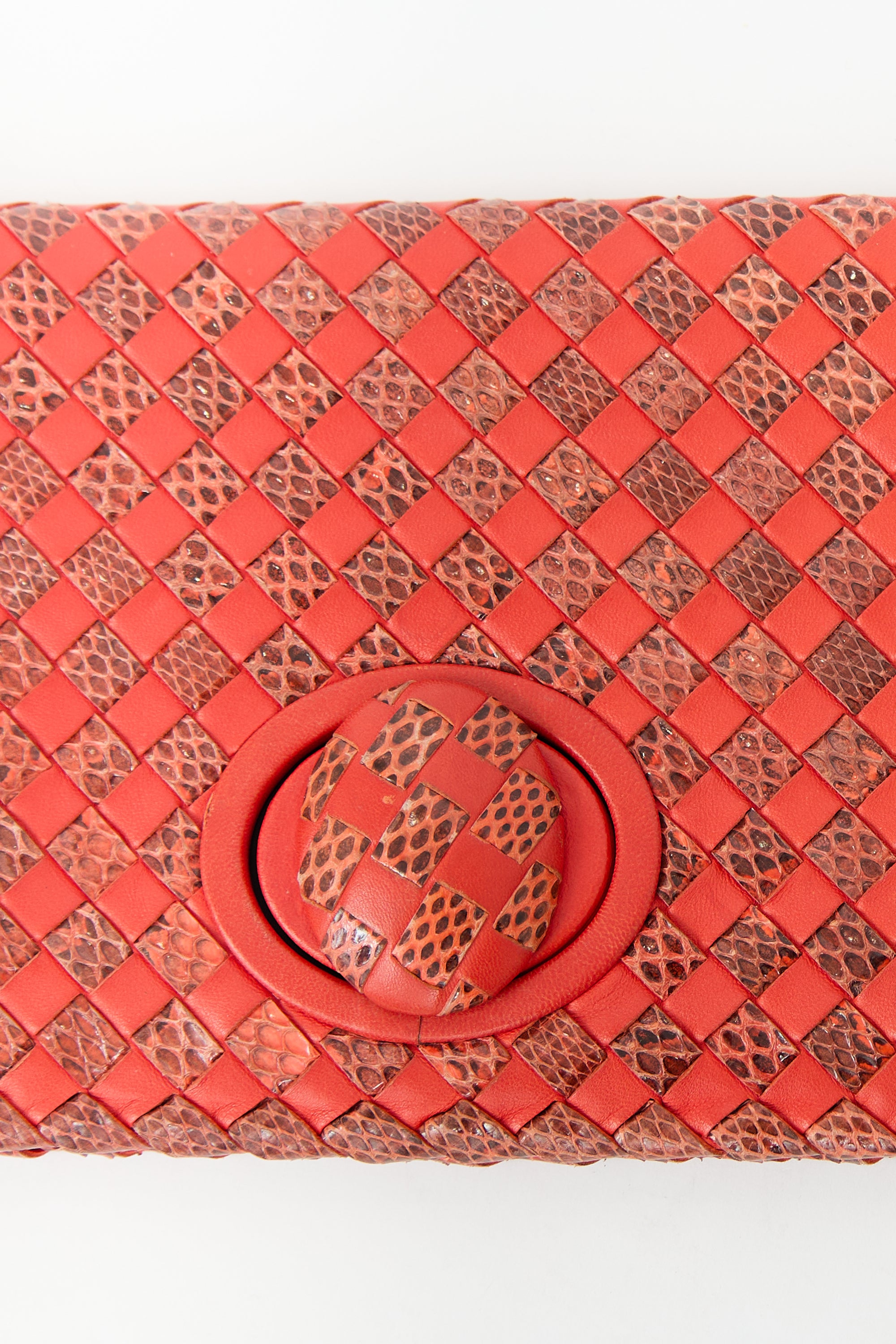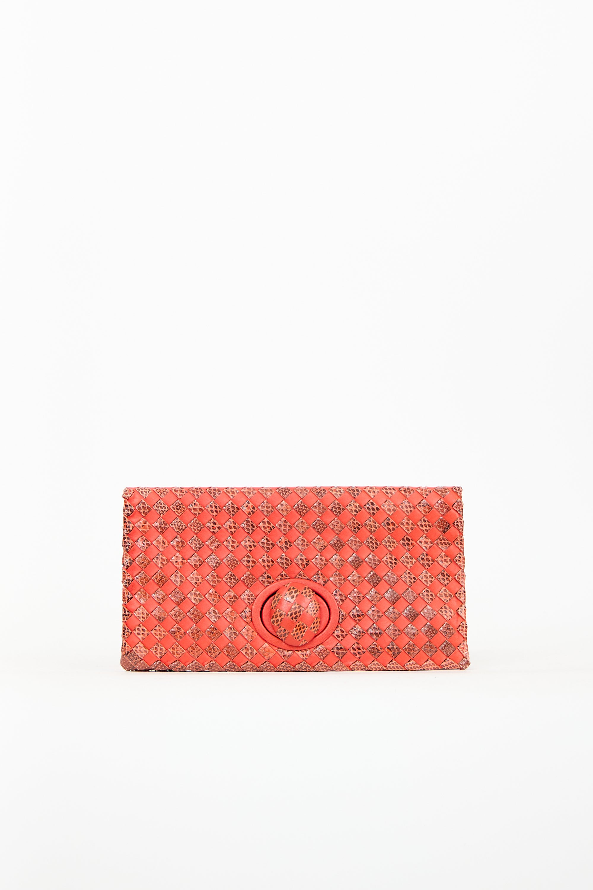 Pre-owned Bottega Veneta orange leather clutch featuring snakeskin leather intrecciato, front flap with oval turn lock closure, one zip pocket, and one lined main compartment.