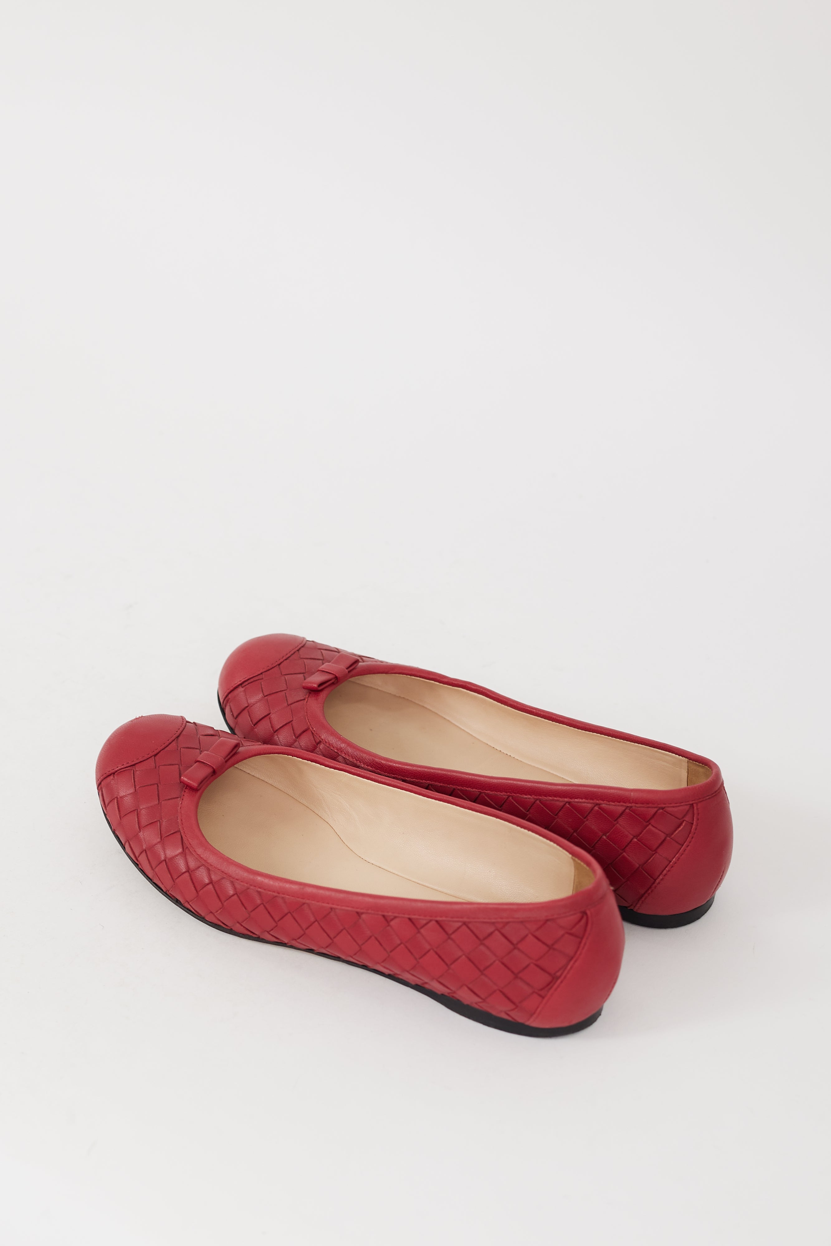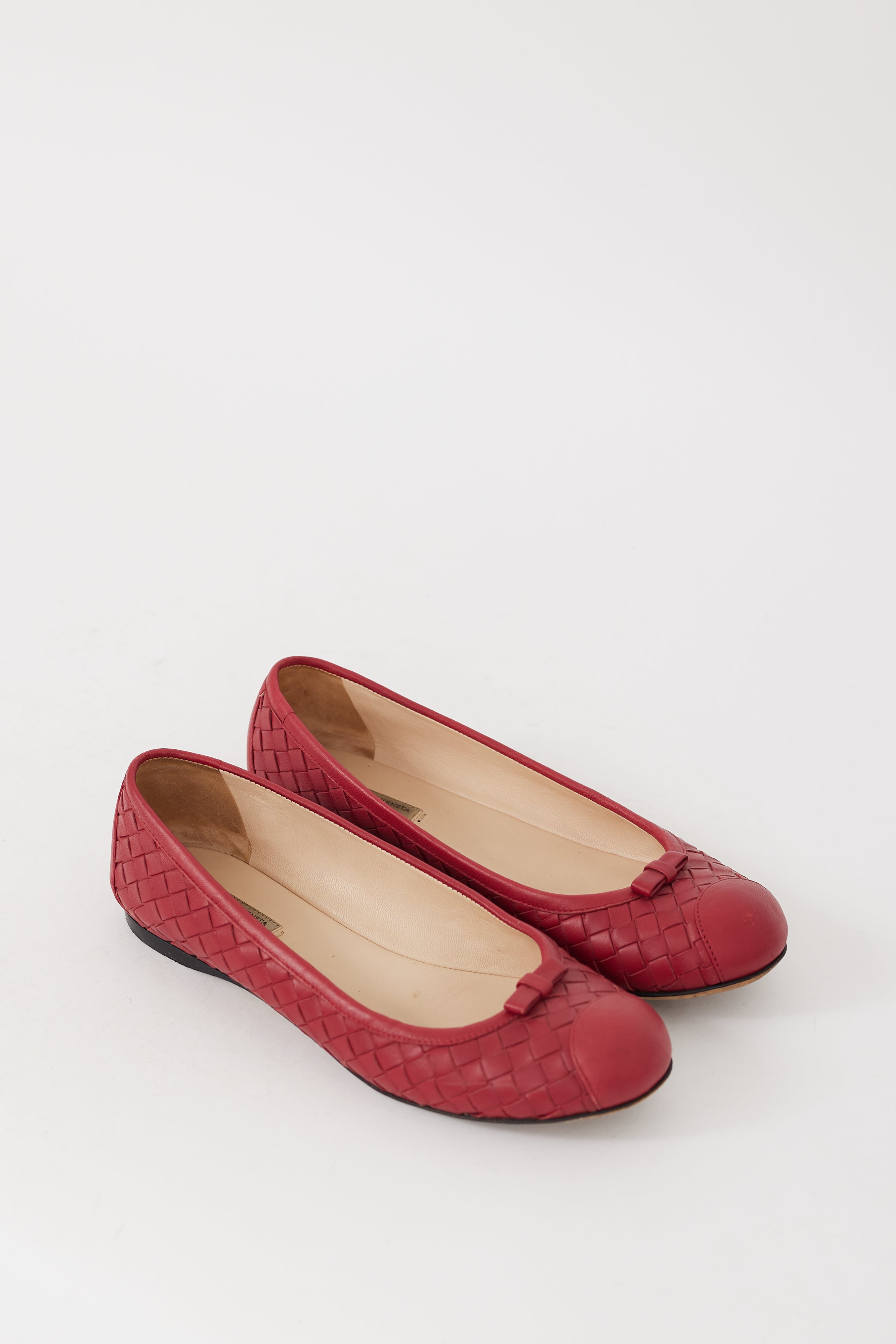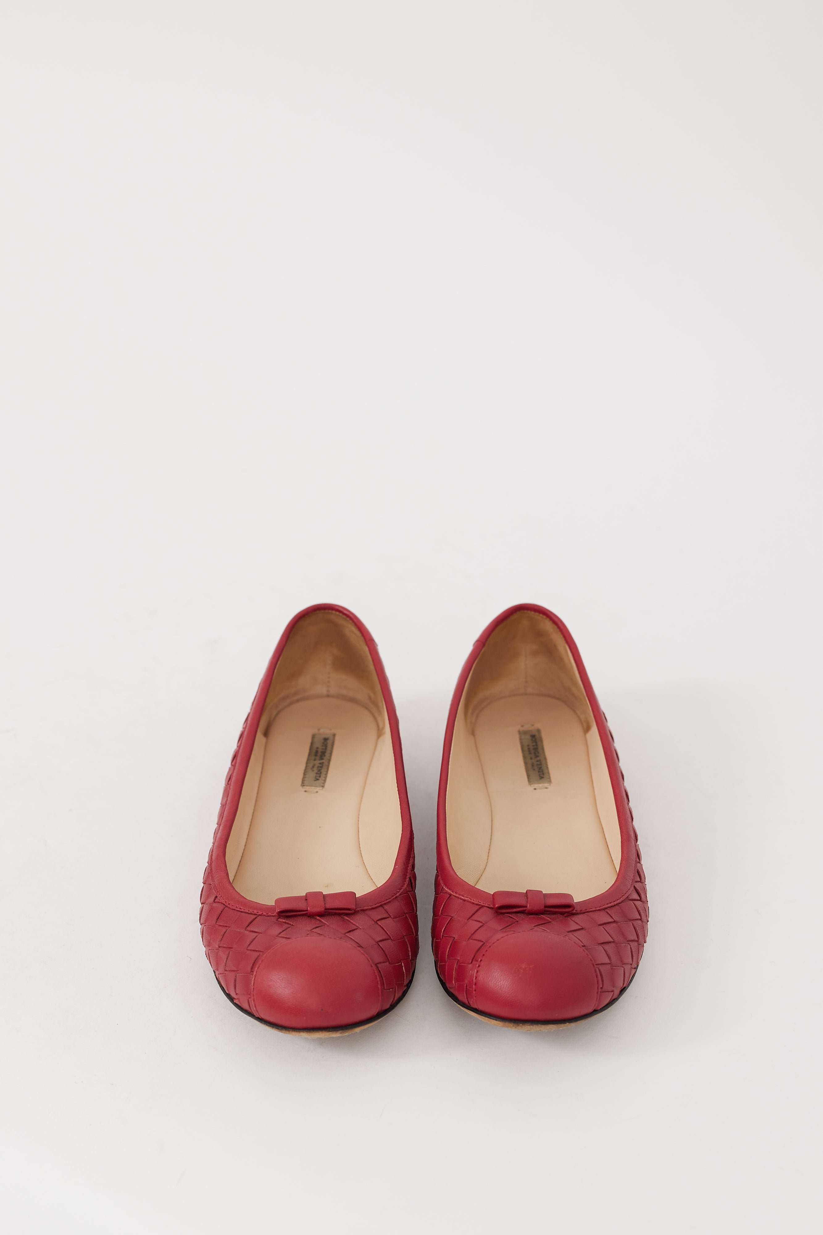 Pre-owned Bottega Veneta red leather flats featuring an Intrecciato weave throughout, round cap toe, bow detail at vamp, and slip on entry.