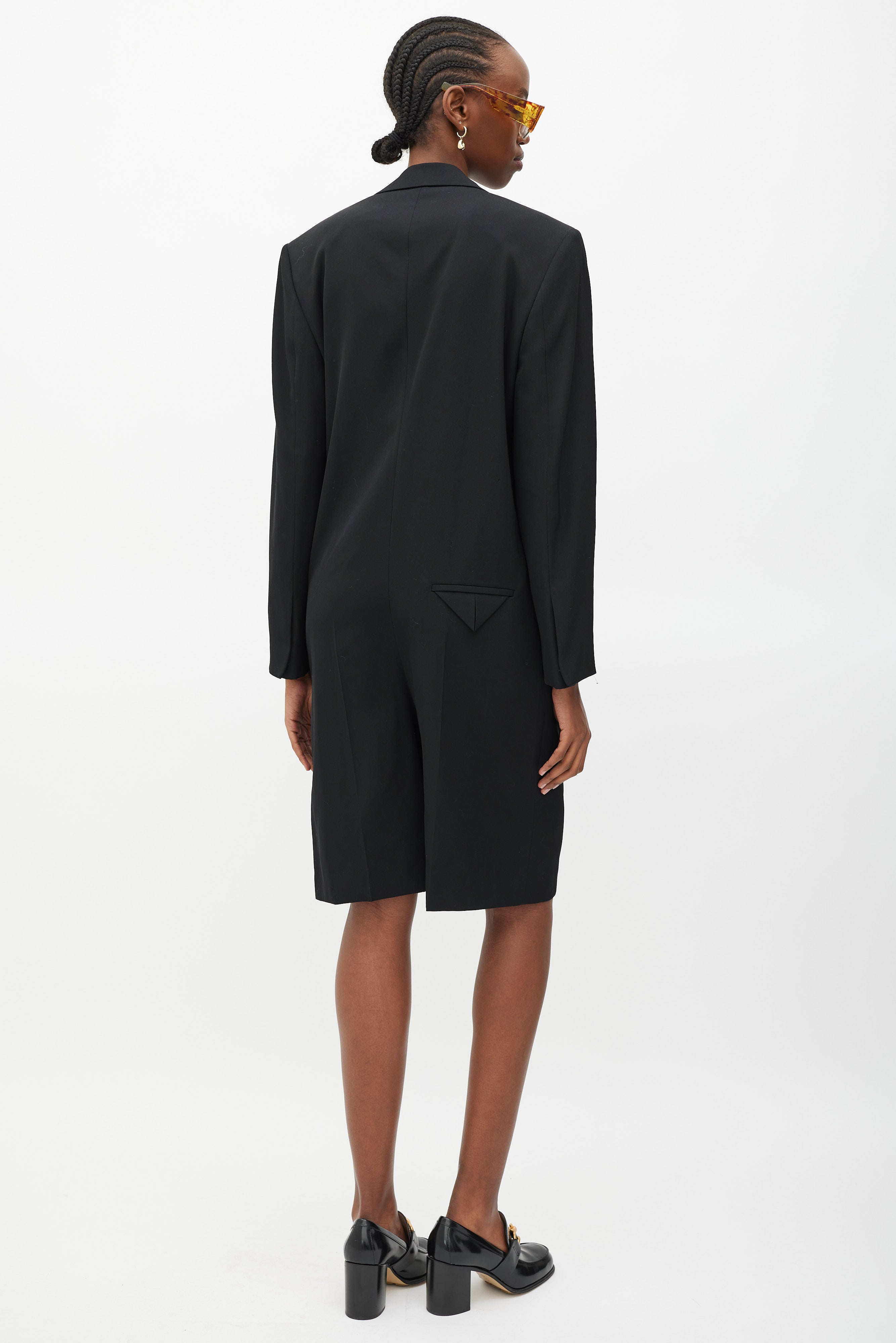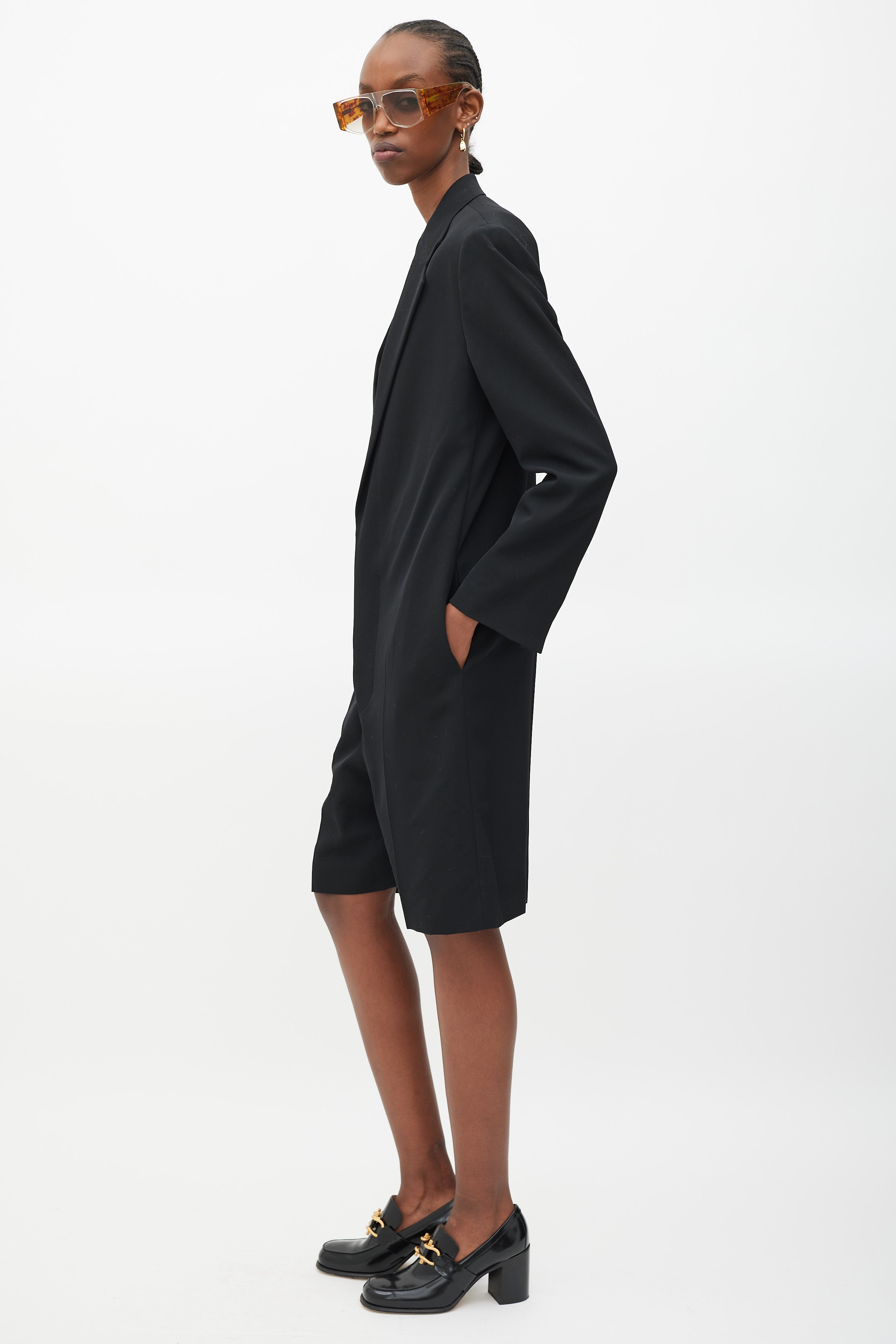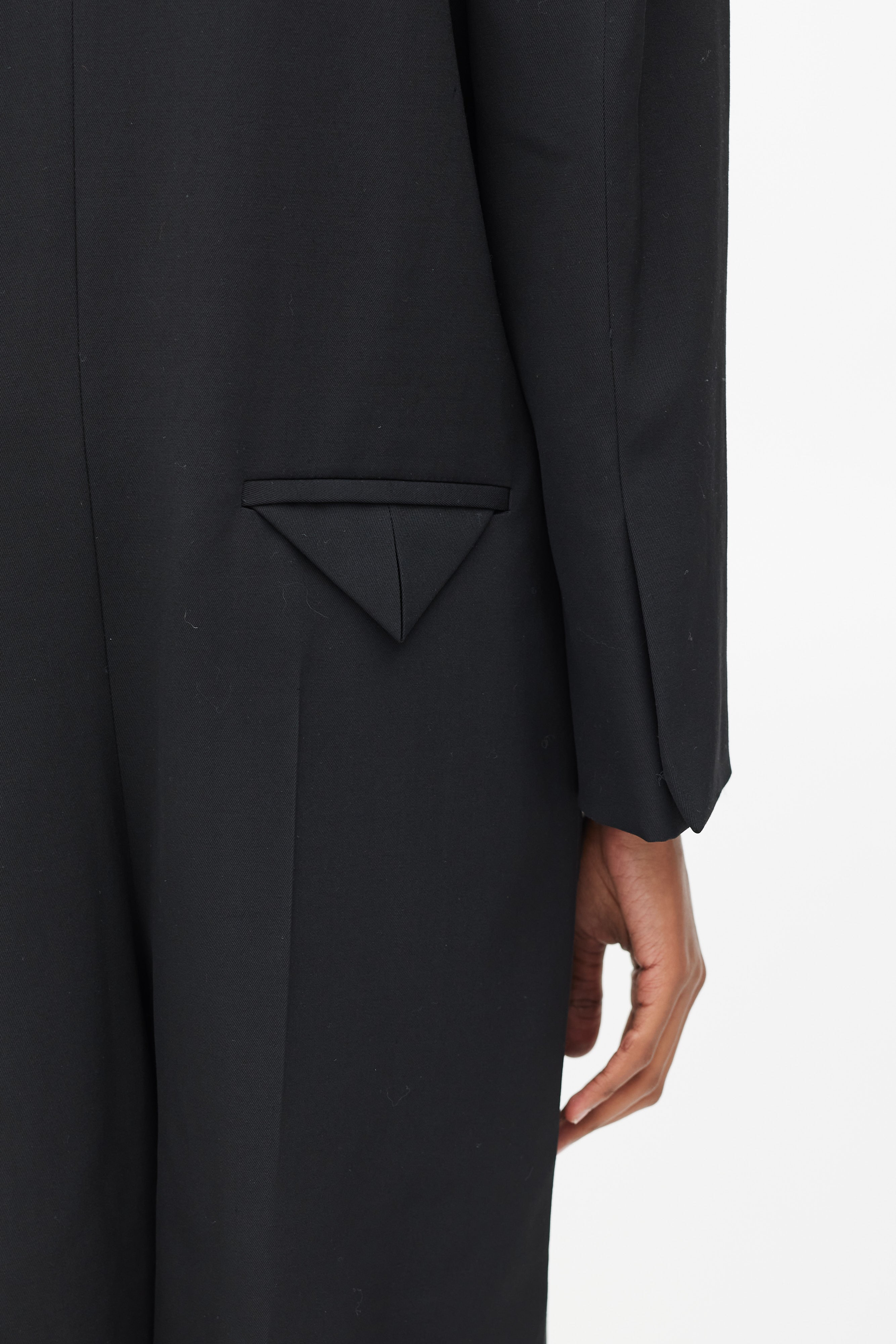 Pre-owned Bottega Veneta Spring/Summer 2020 black wool jumpsuit featuring a notched lapel, structured shoulders, long sleeves, two slip pockets at hip, triangular flap pocket at back, and concealed button up closure. Lined.