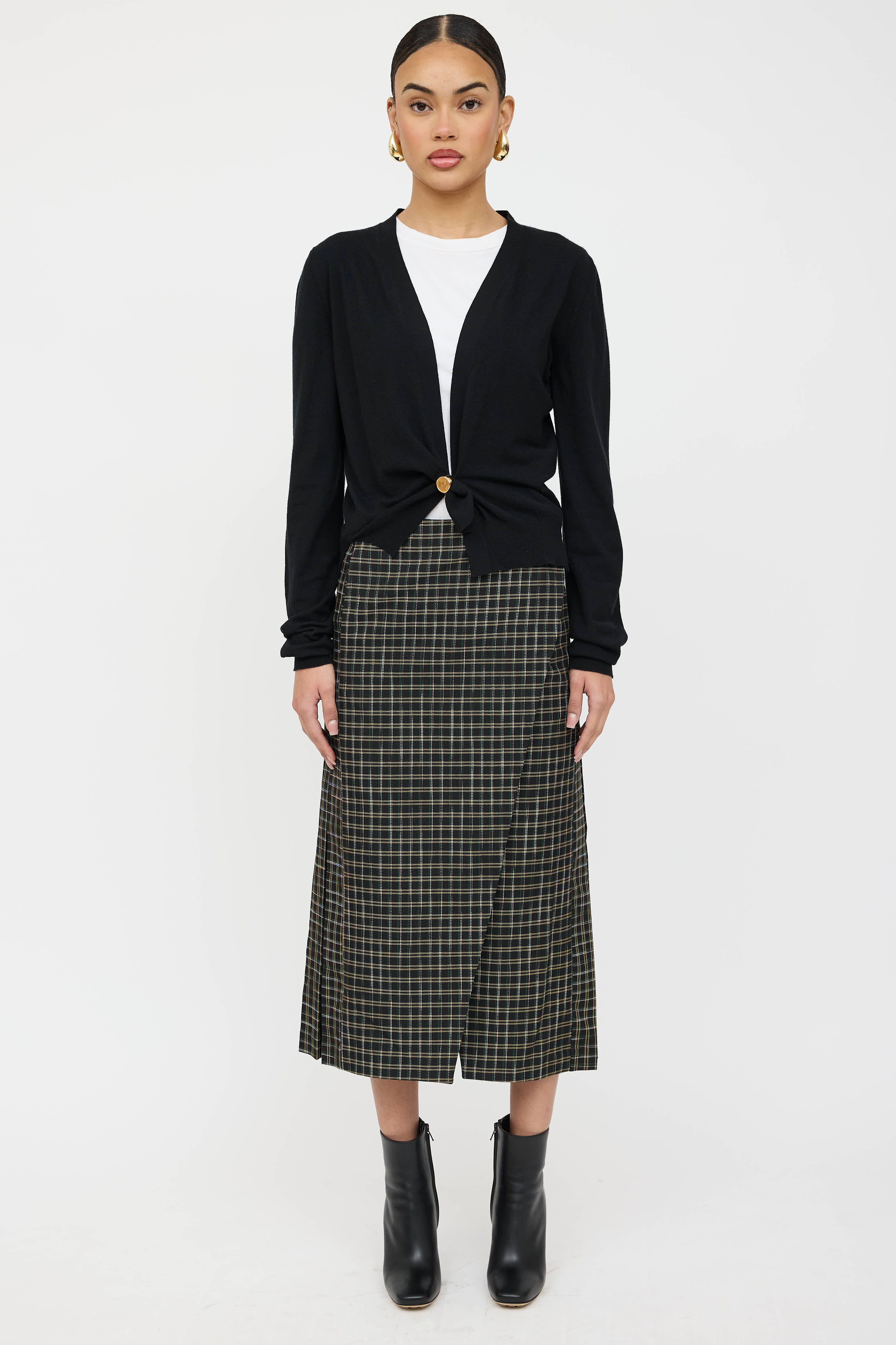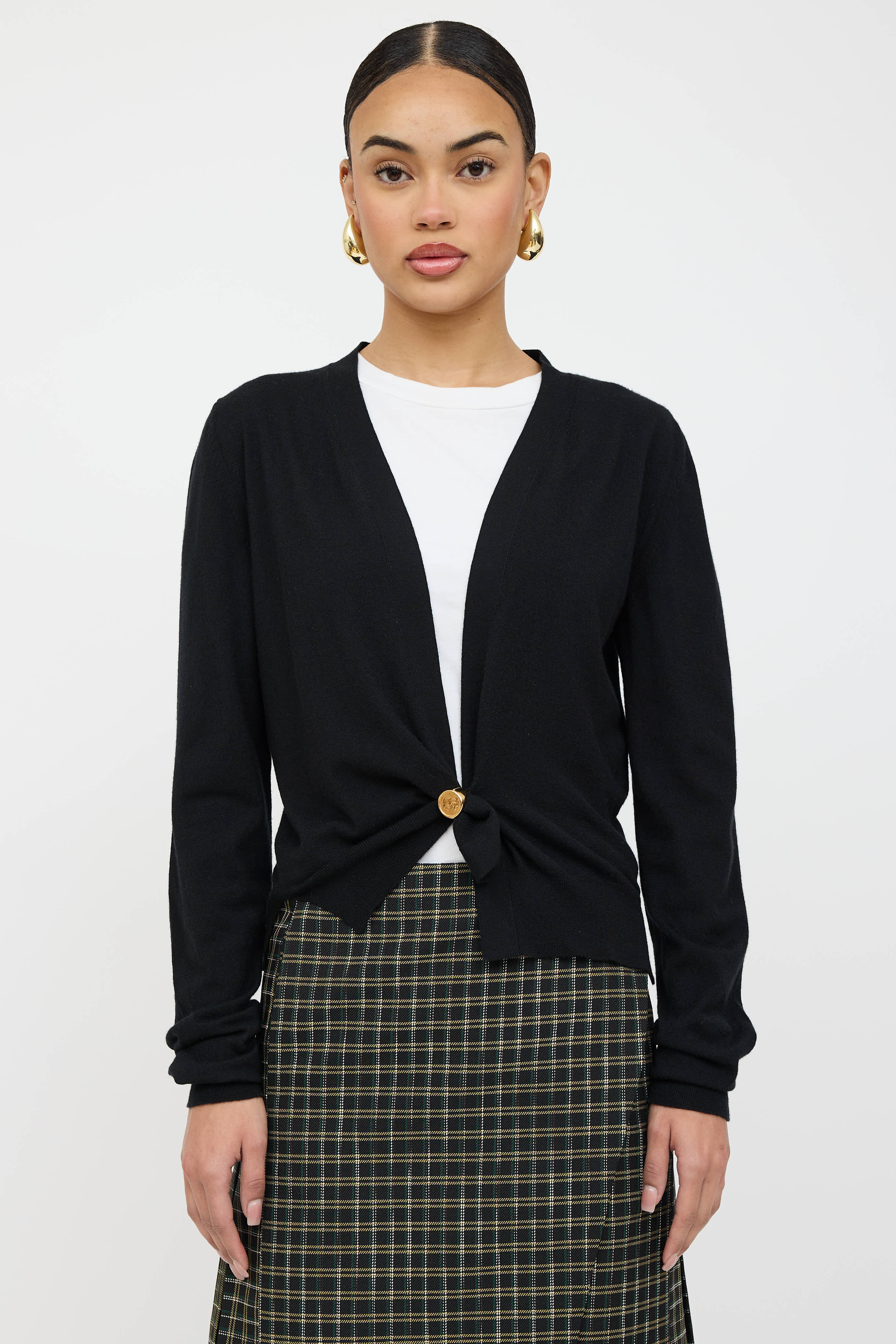 Pre-owned Bottega Veneta Spring Summer 2020 black cashmere knit cardigan featuring a V-neckline, long sleeves, asymmetrical ribbed hem, and gold tone signet ring tie closure.