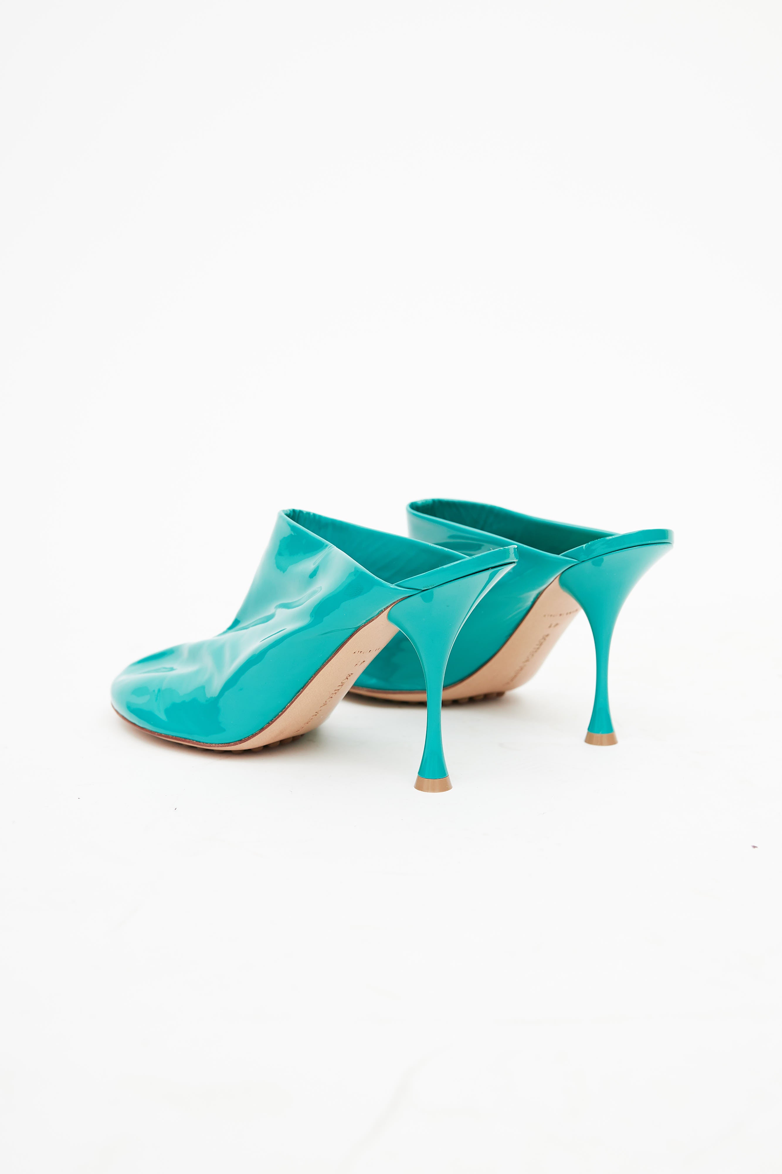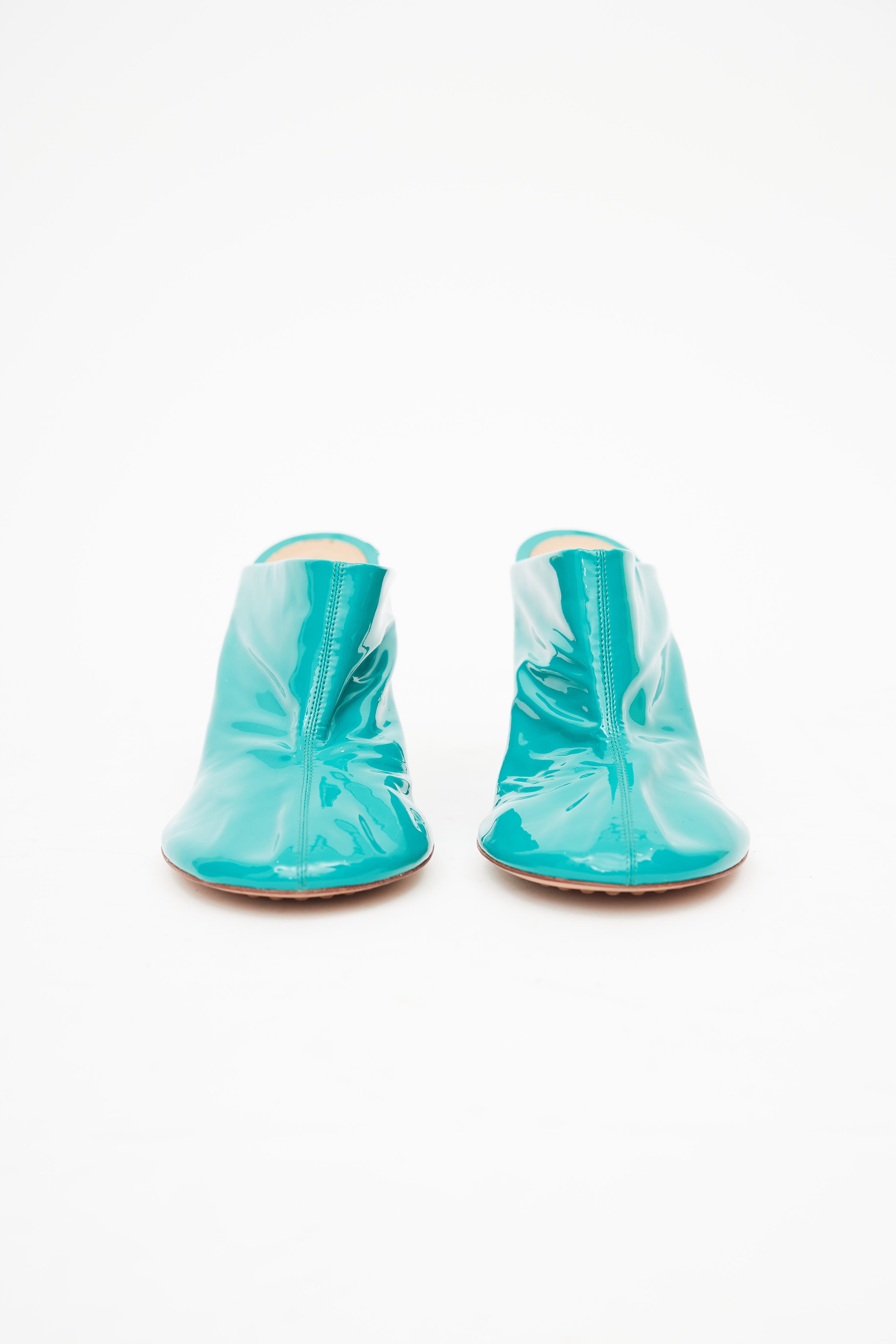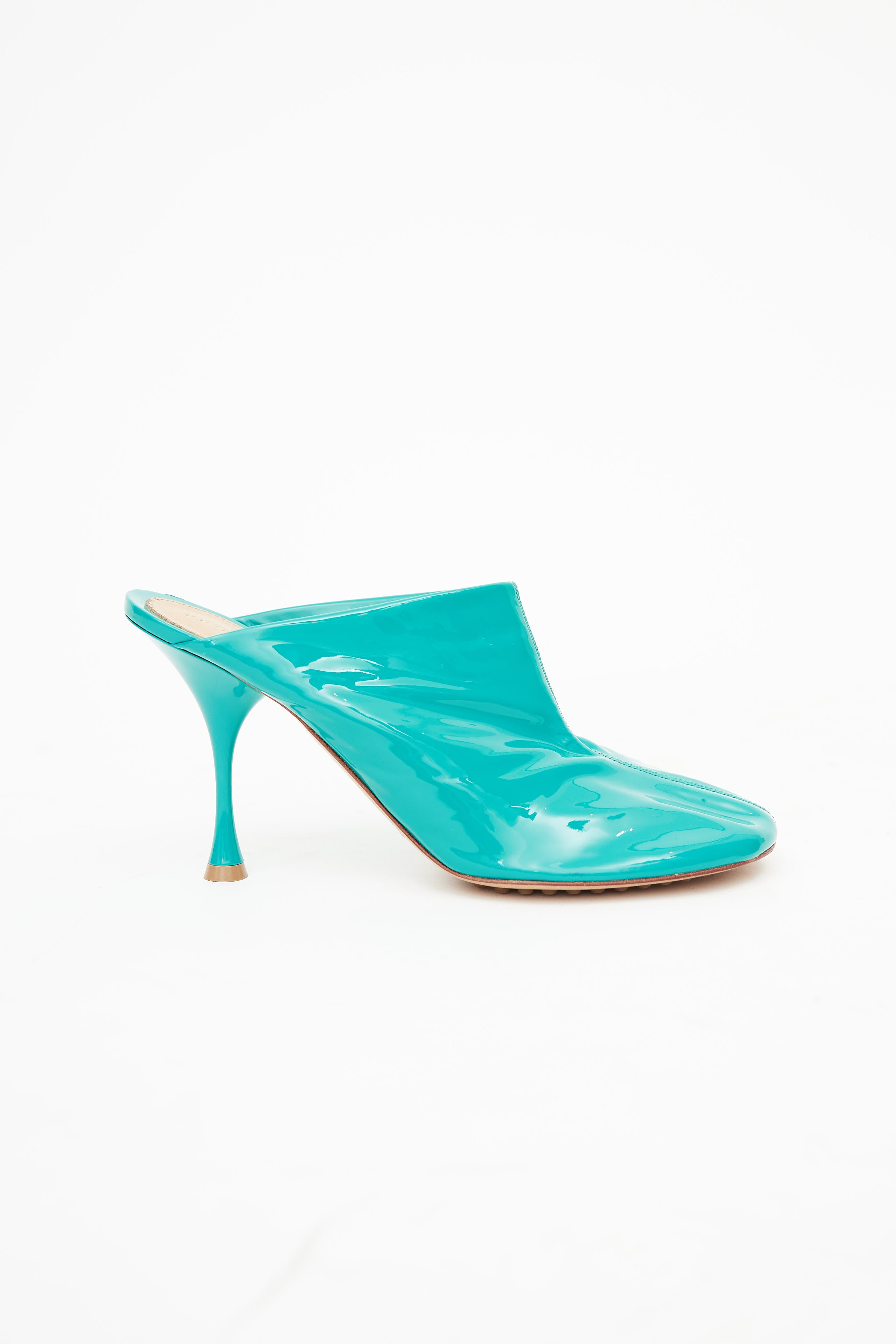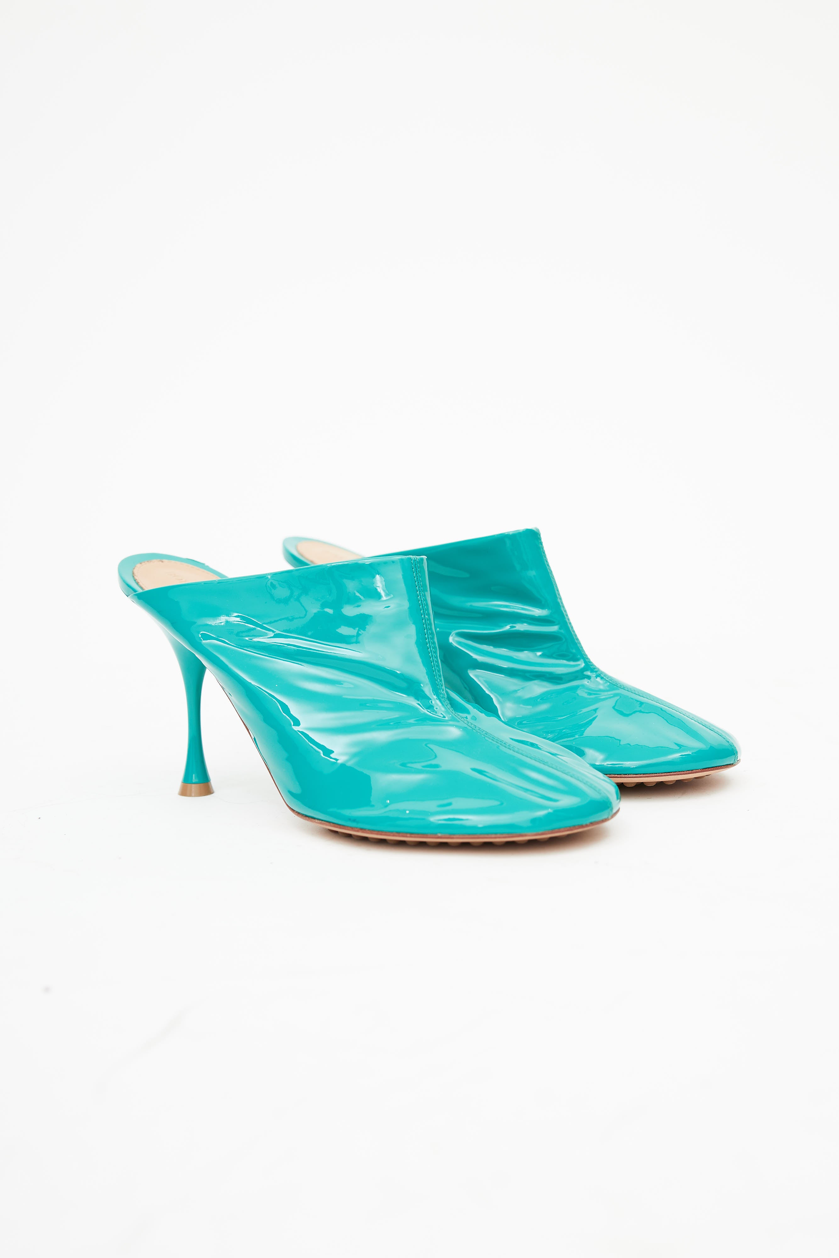Pre-owned Bottega Veneta Dot Sock mules in turquoise patent leather featuring rounded toe, center seam stitch, flared stiletto heel, slip on styling with brown insole, stamped logo and grip soles.