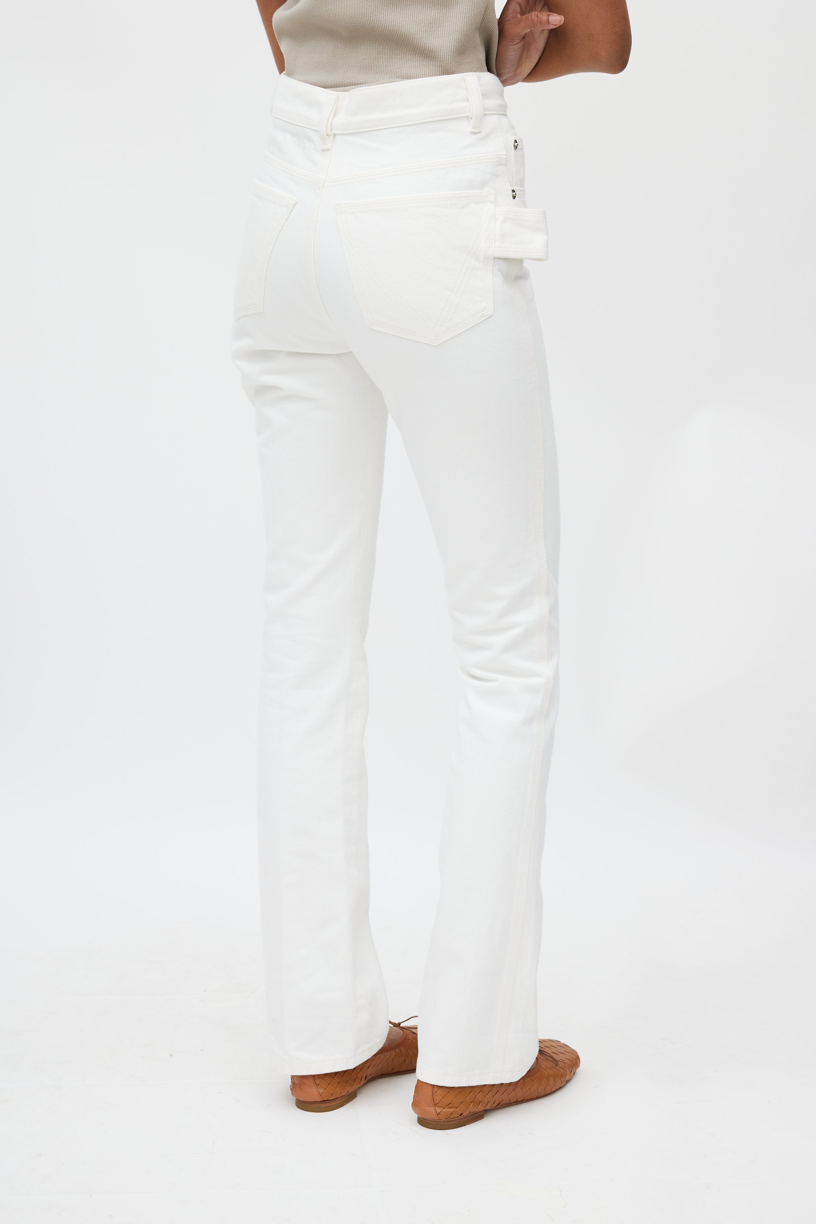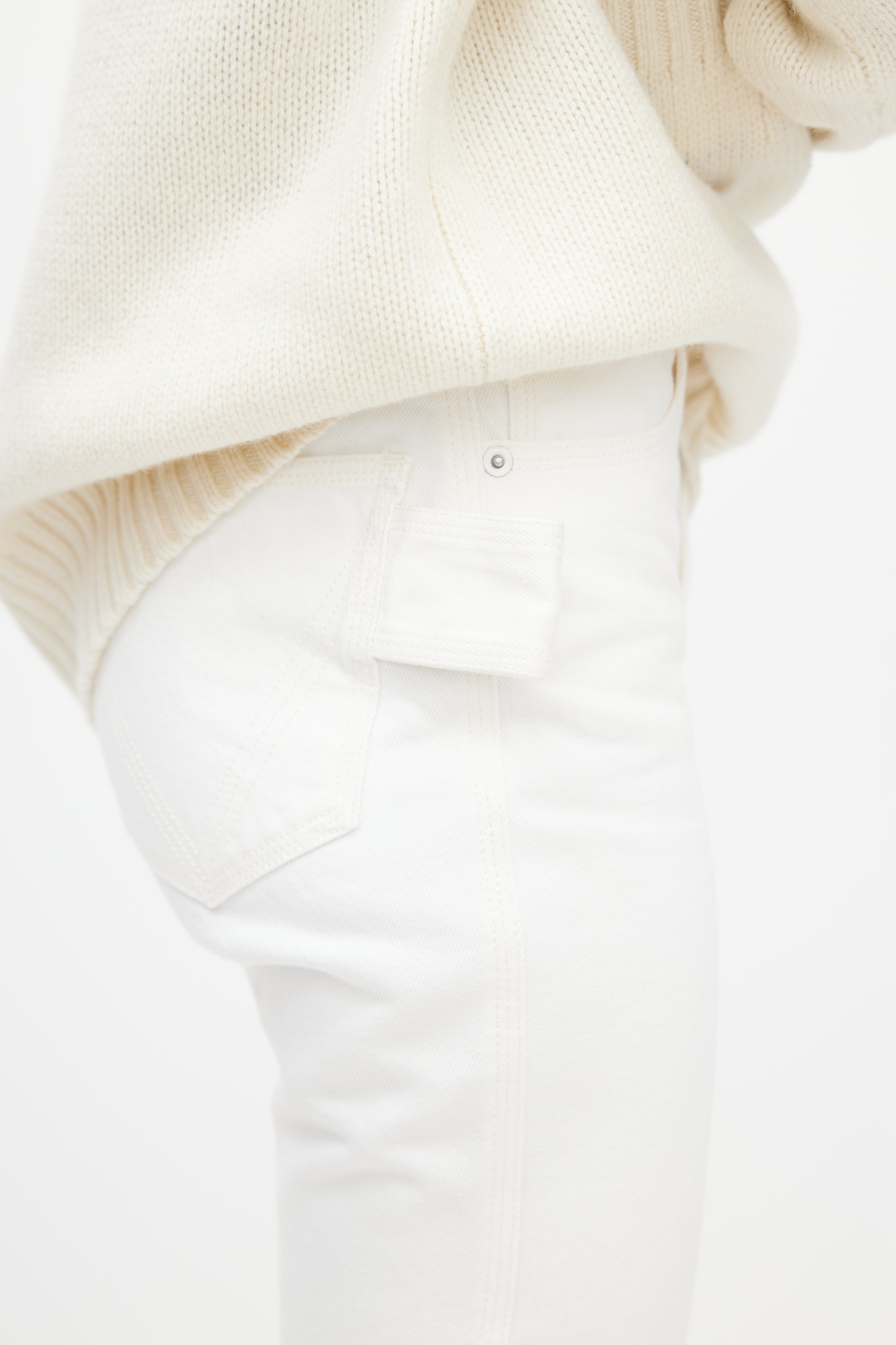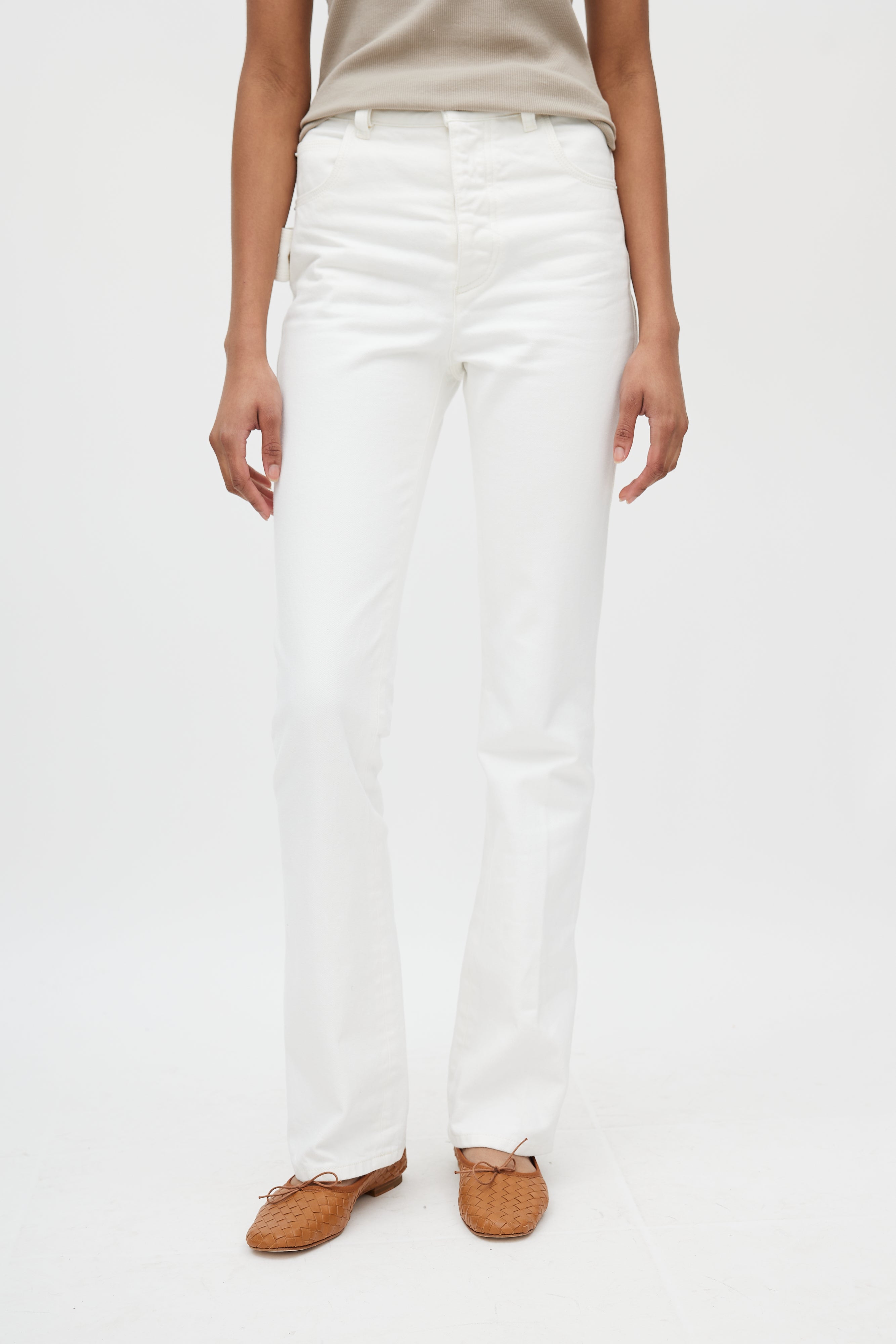 Pre-owned Bottega Veneta white jeans featuring five pocket styling, flared leg, carpenter loop at side, and button fly closure.
