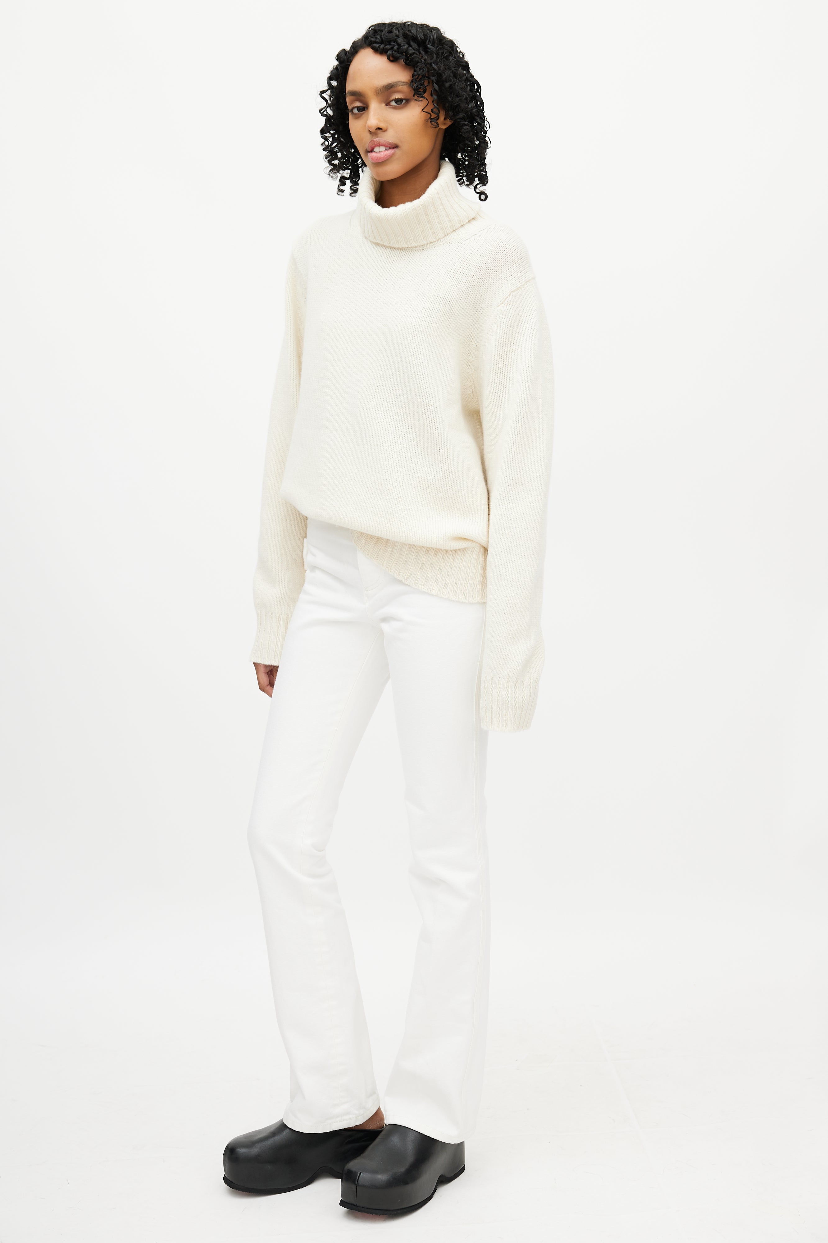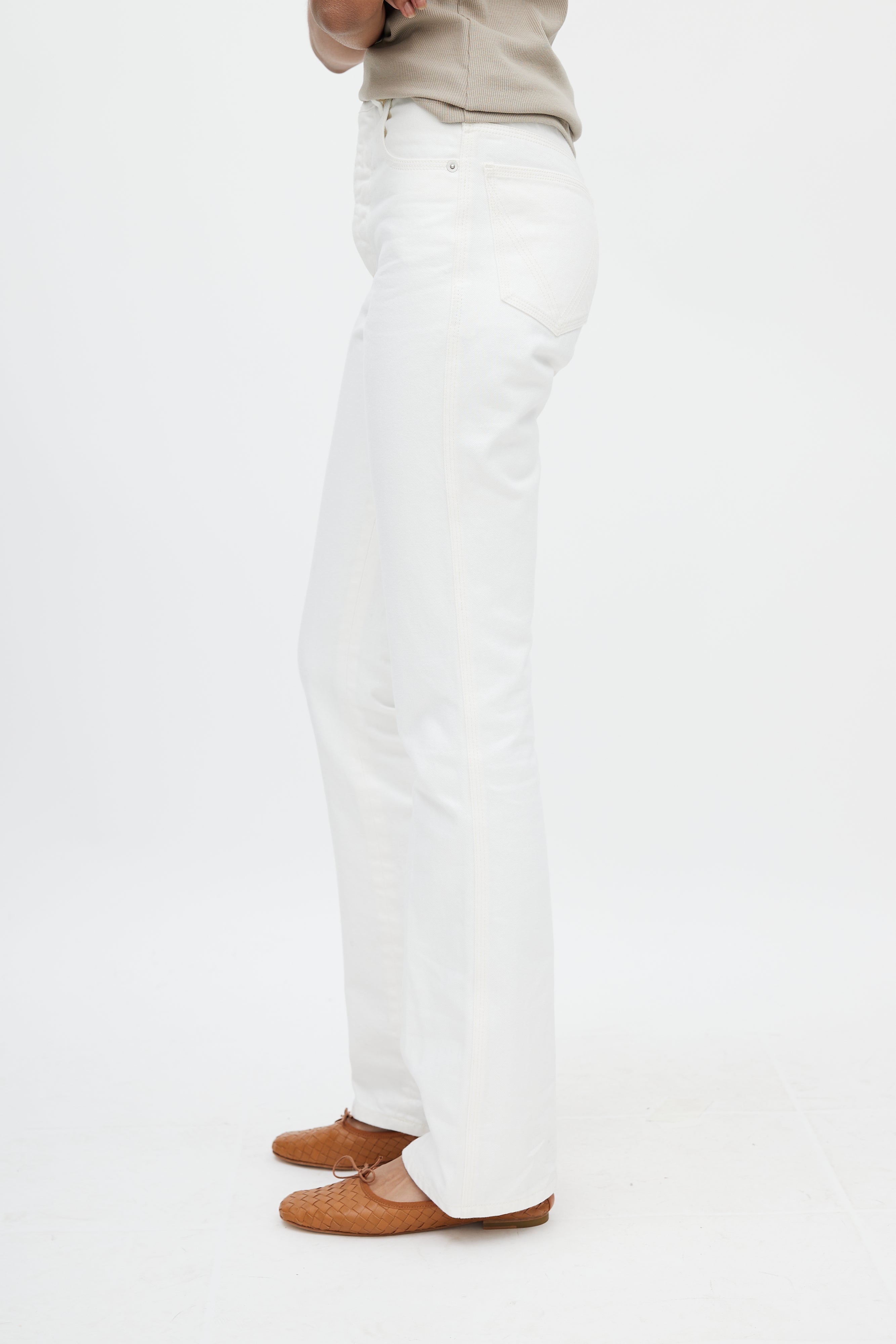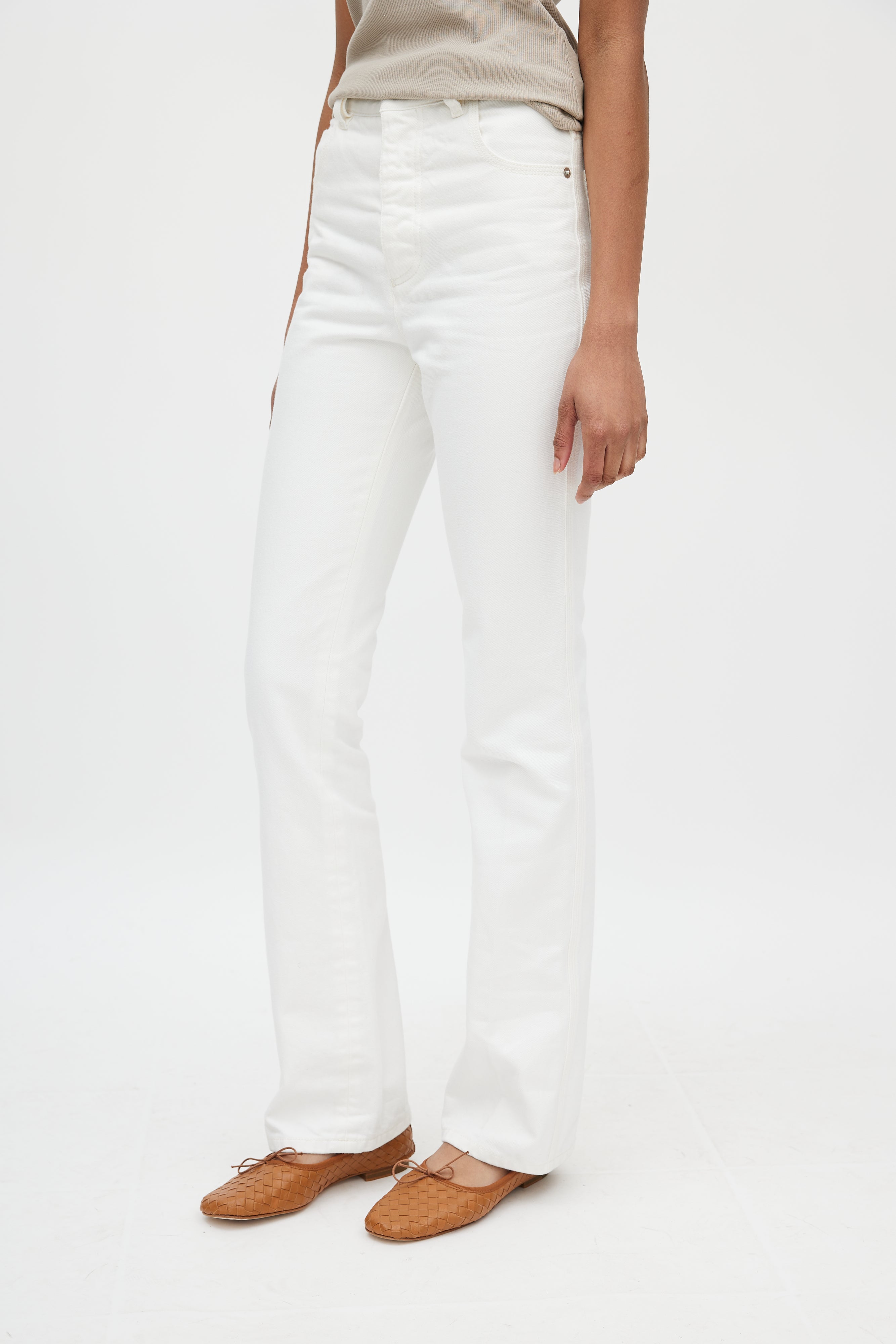 Pre-owned Bottega Veneta white jeans featuring five pocket styling, flared leg, carpenter loop at side, and button fly closure.
