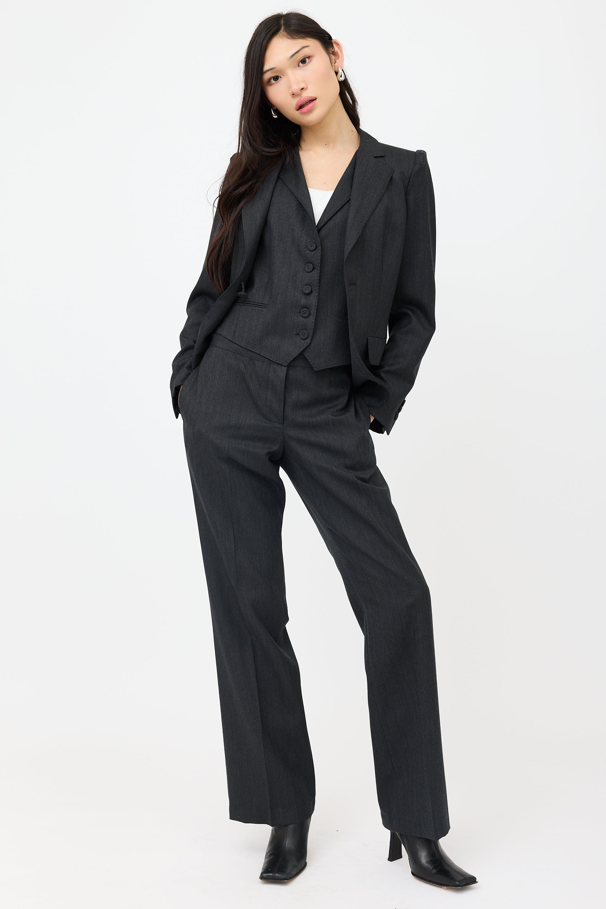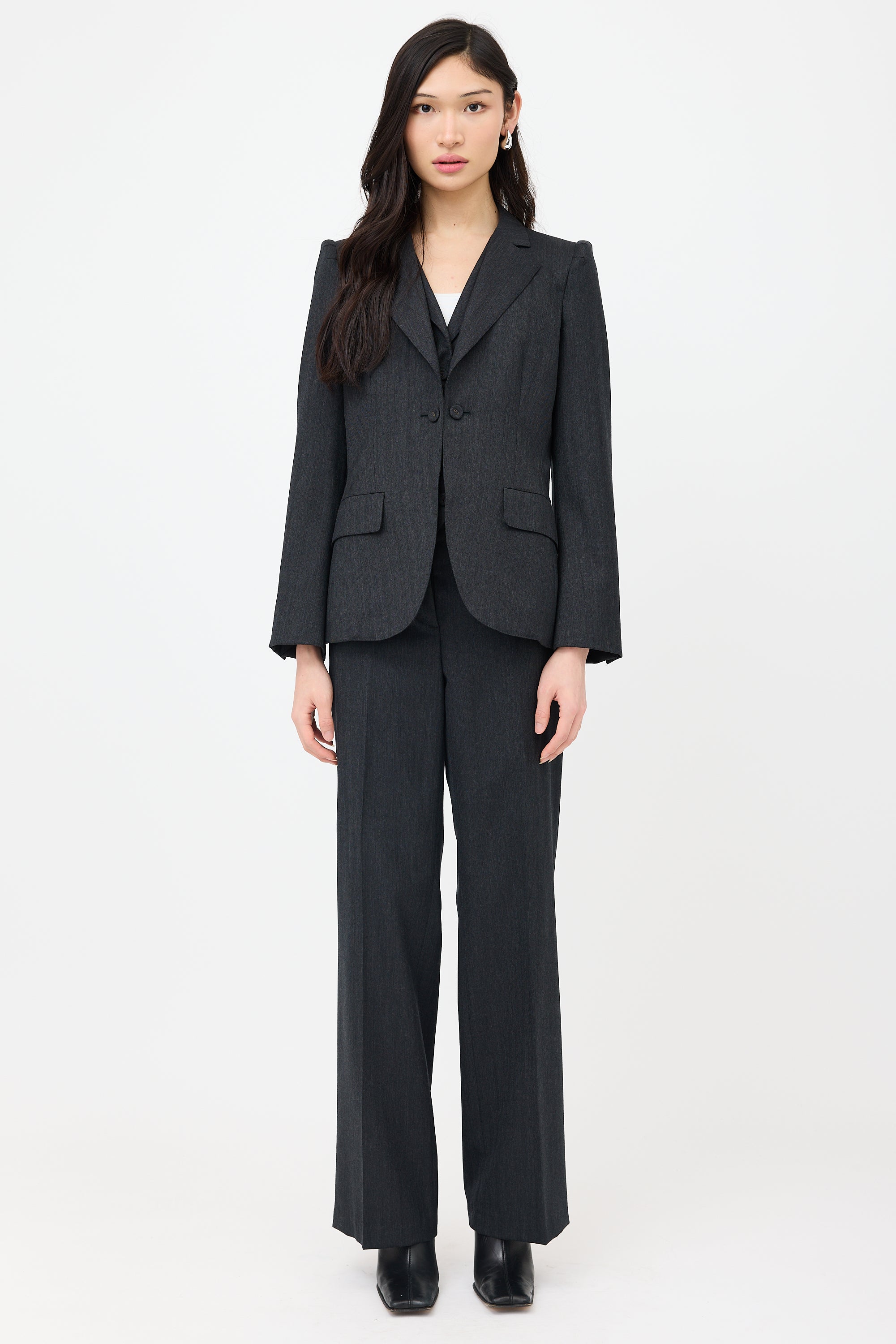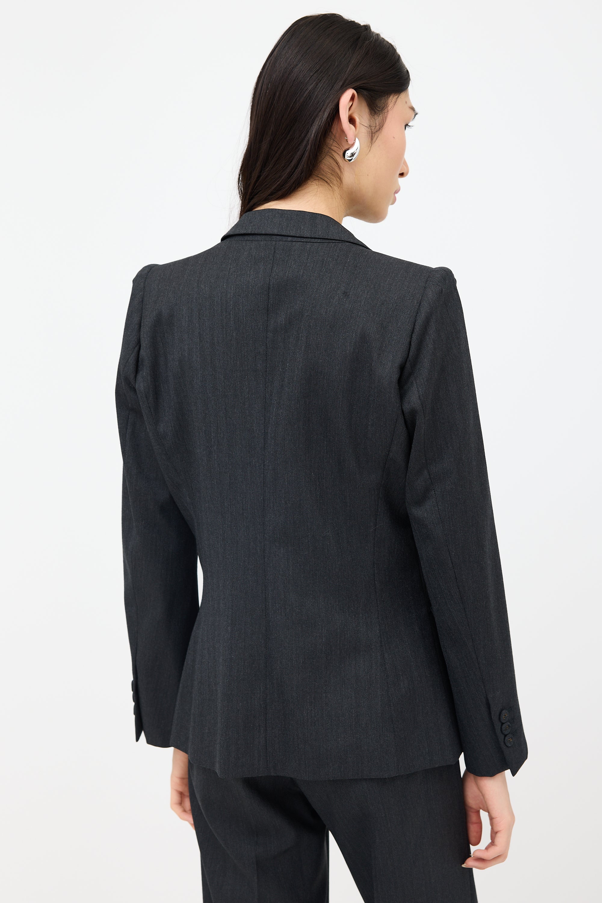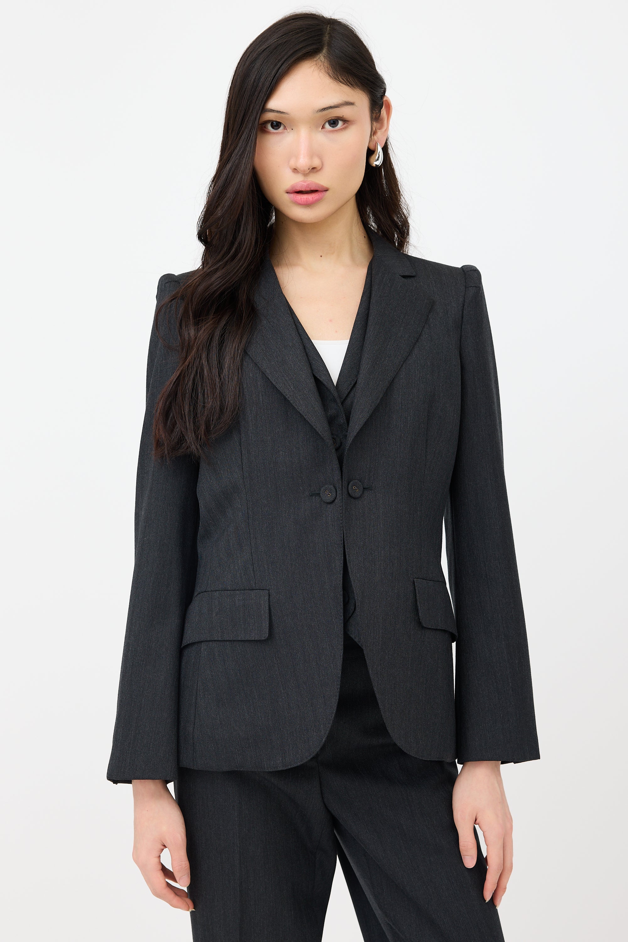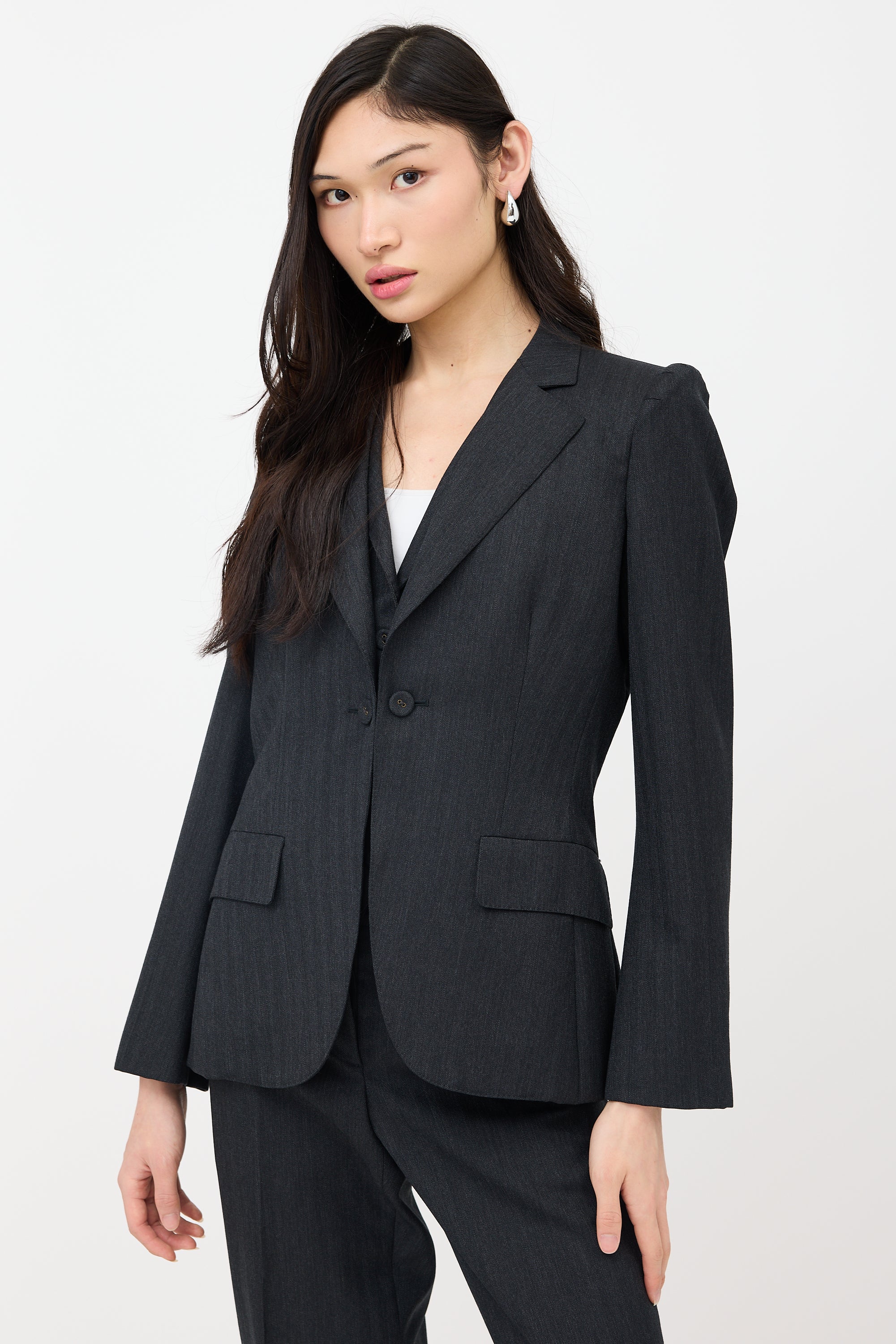 Pre-owned Bottega Veneta grey wool blazer featuring a tonal Herringbone pattern, notched lapels, single button front, padded shoulders, and two welt pockets. Lined.