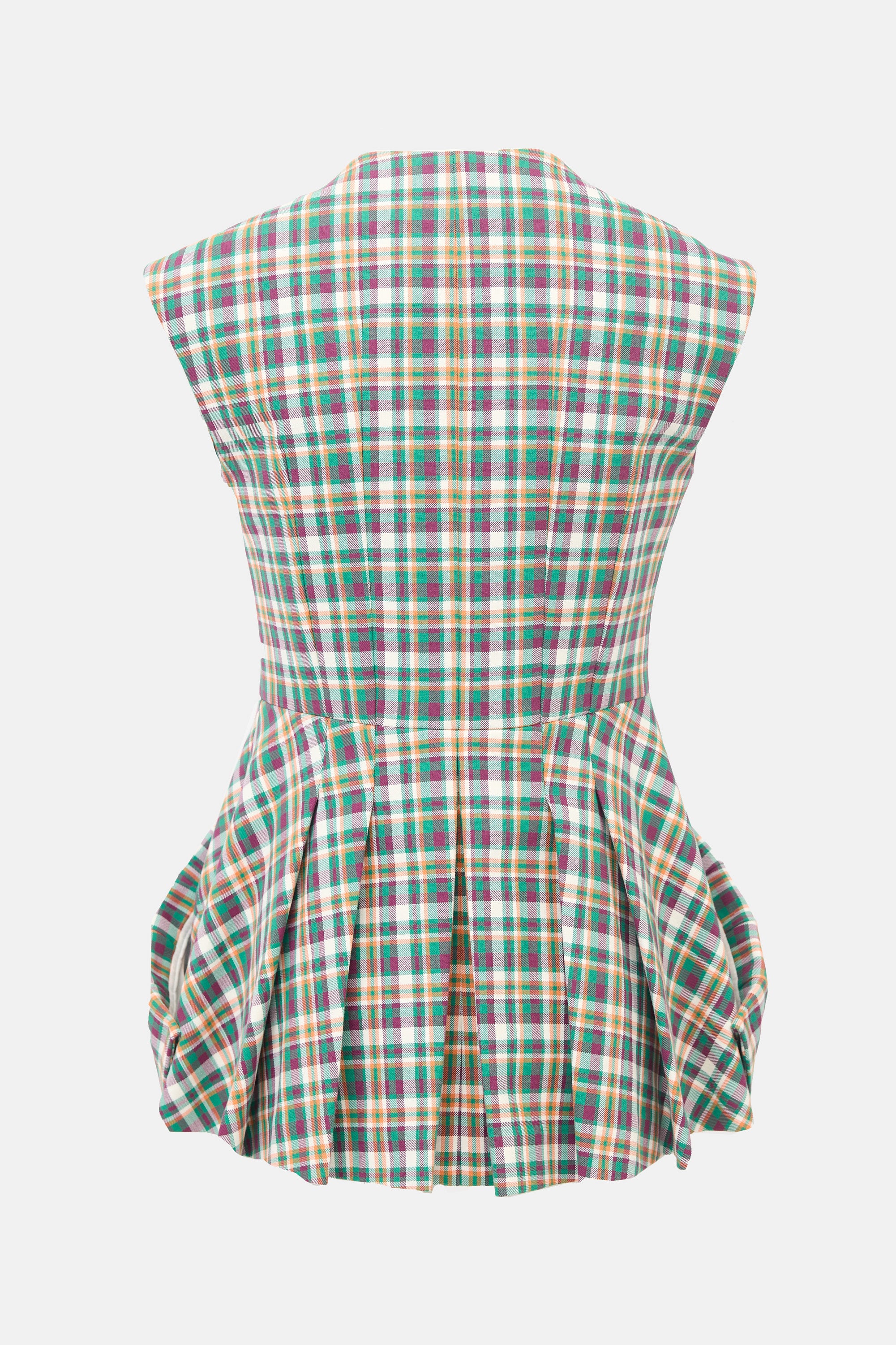 Pre-owned Dior Cruise 2016 green, purple, and orange plaid top featuring square neckline, two flap pockets at chest, concealed button front, pleated peplum hem, and two slip pockets with flaps at front. Raf Simons era design.