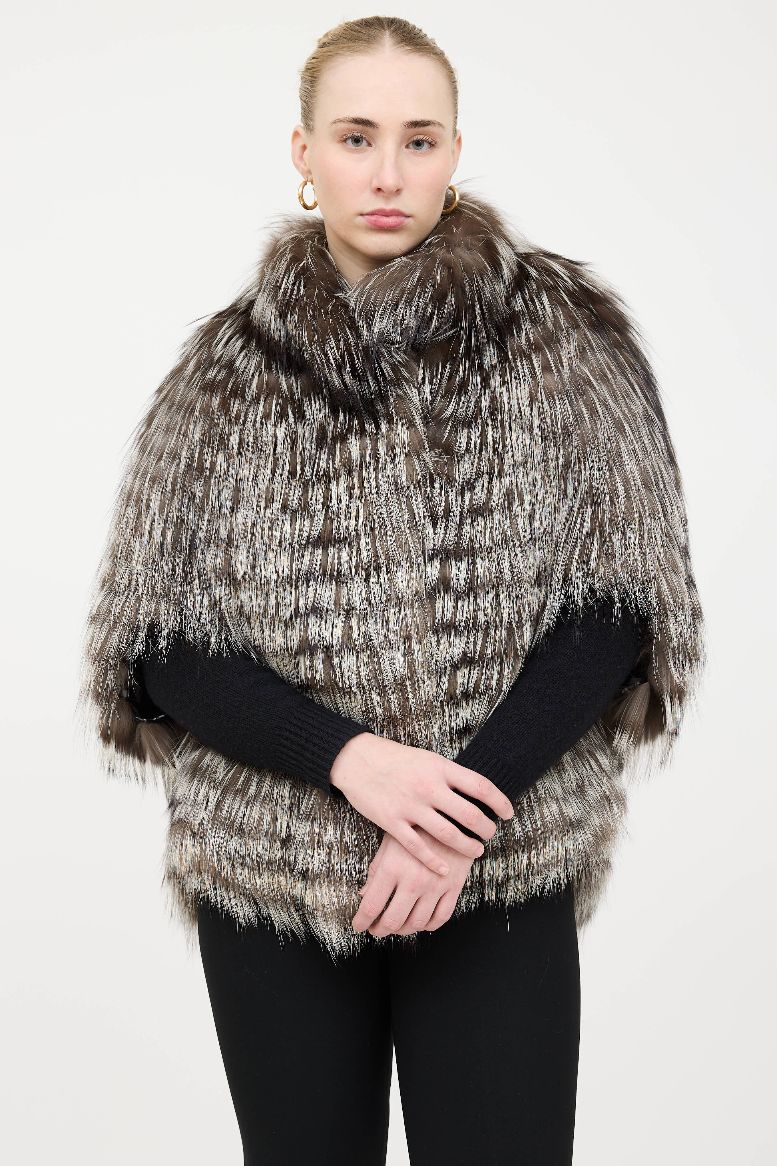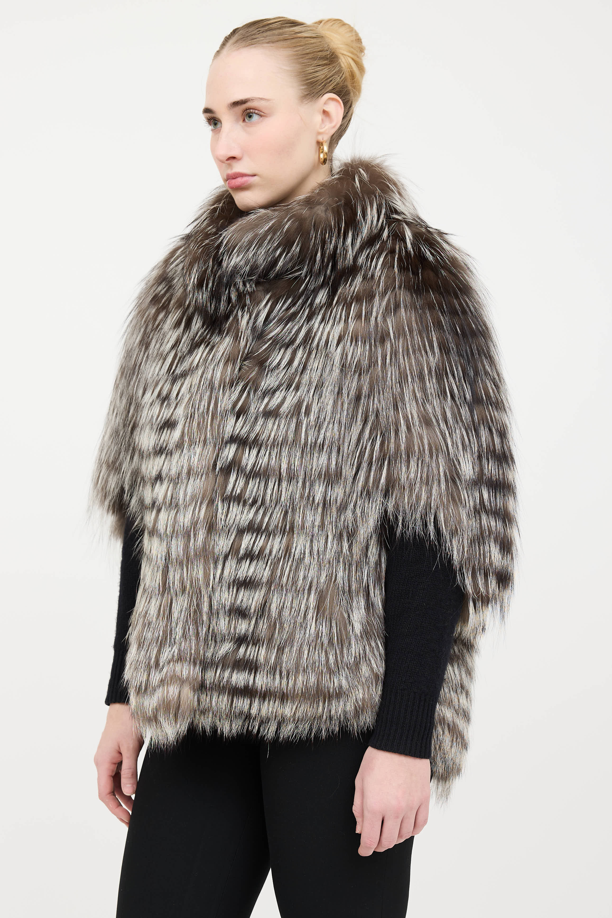 Pre-owned VSP Archive silver fox fur jacket featuring stand collar, hook and eye closure, and slit pockets at side. Lined.