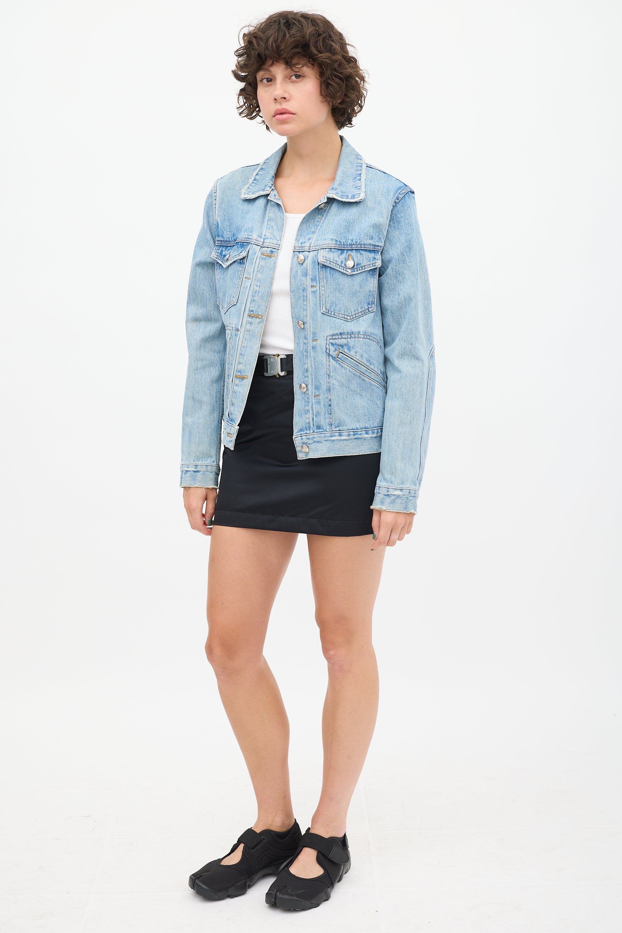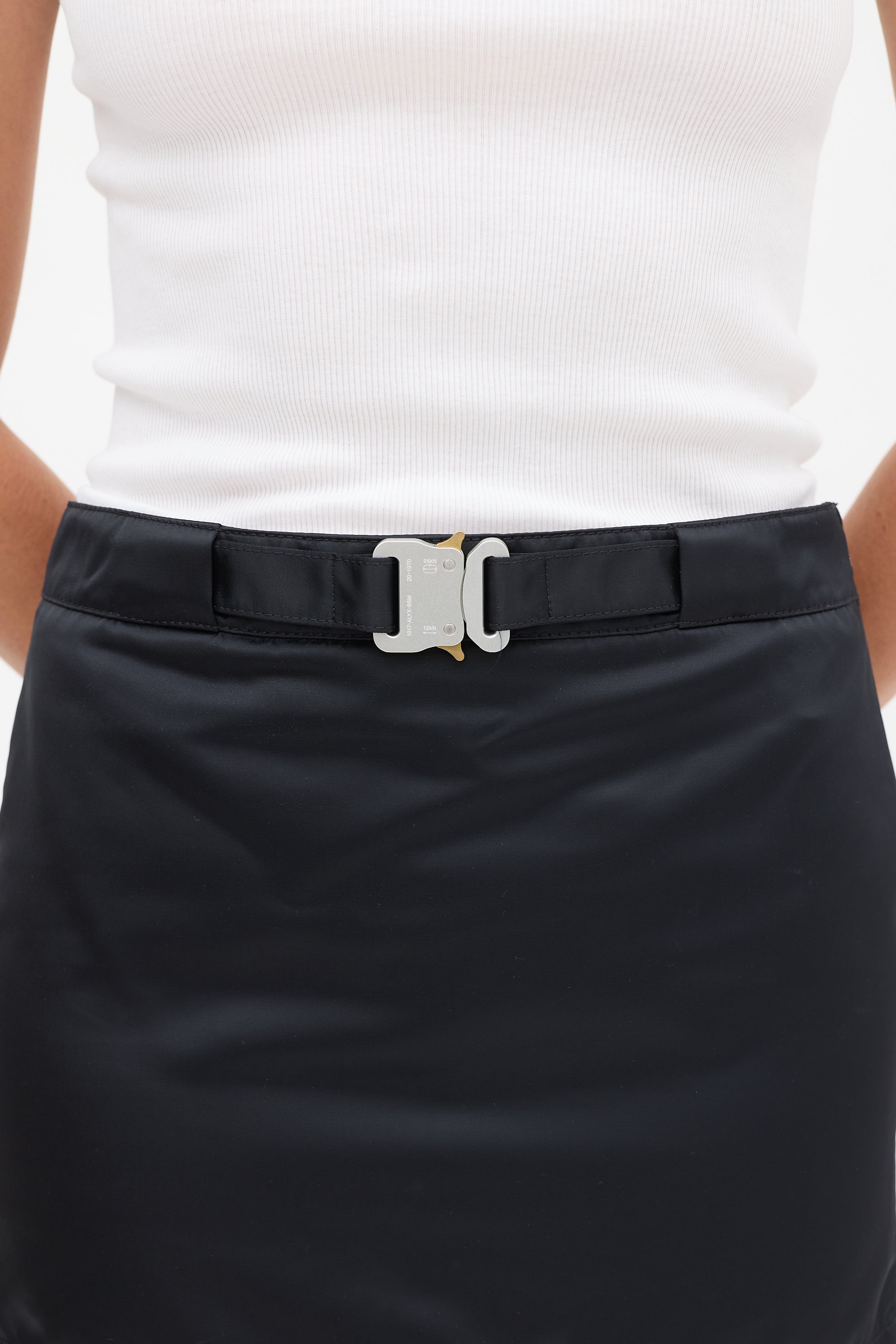 Pre-owned 1017 Alyx 9SM black nylon skirt featuring an adjustable silver tone belt at waist, darted back, and side zip closure. Lined.
