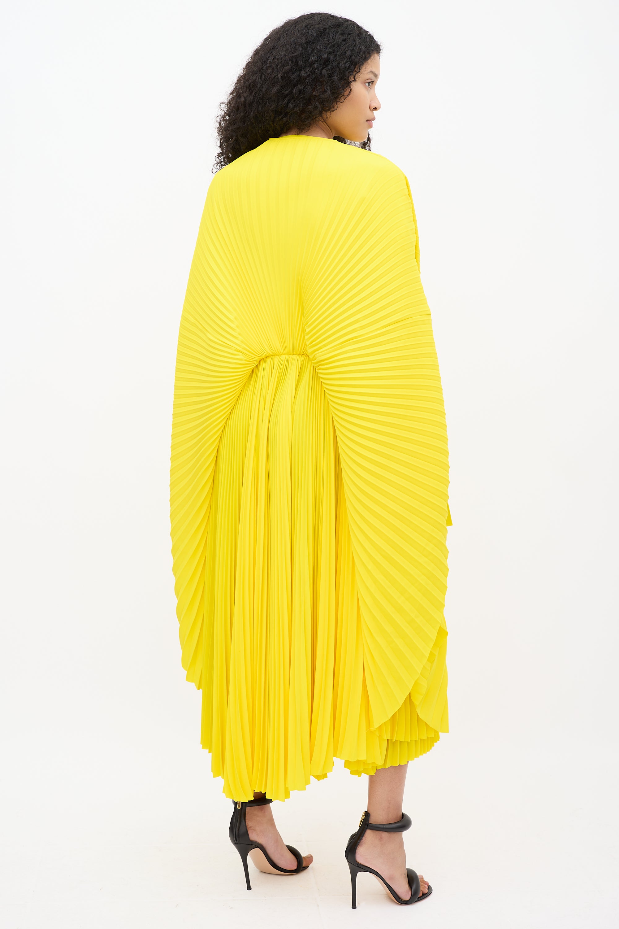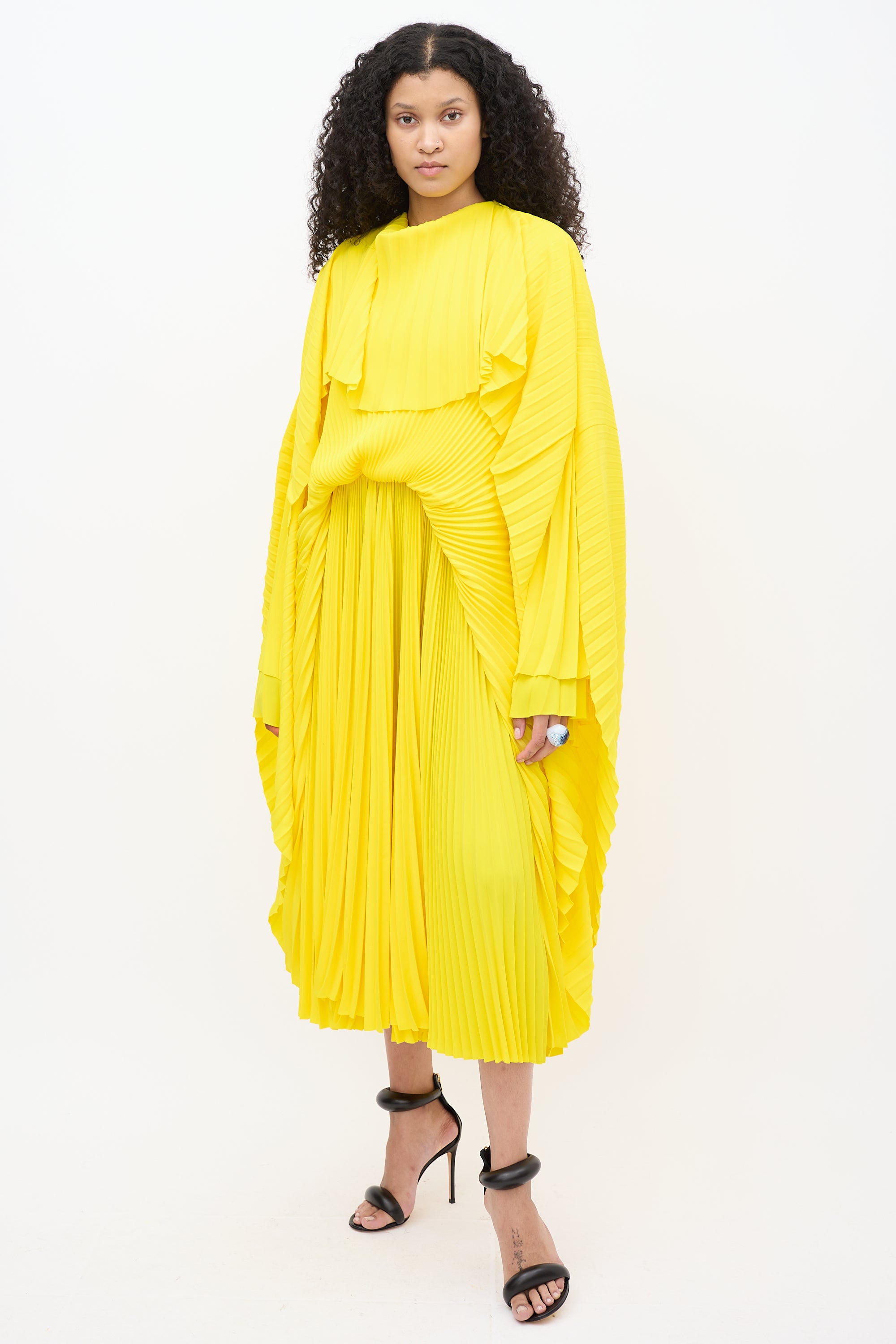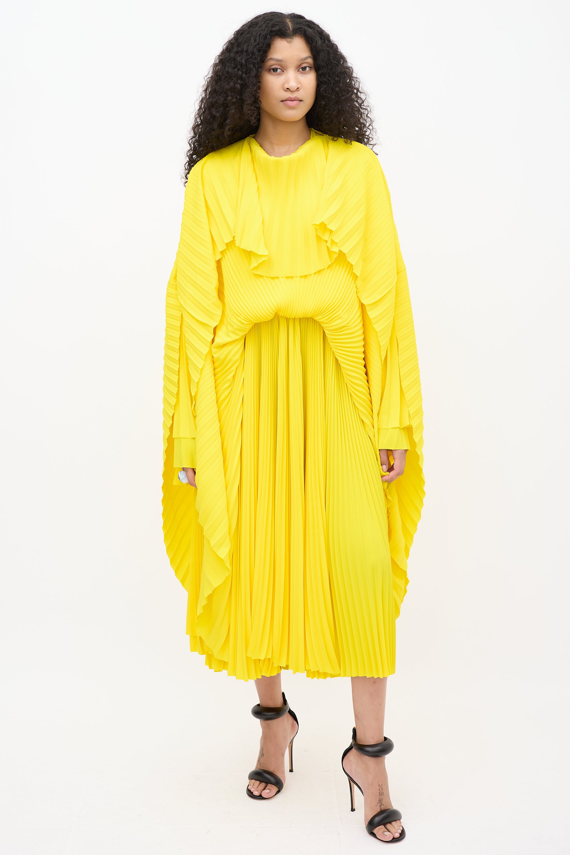 Resort 2022 Balenciaga yellow dress featuring pleated detailing throughout, round neckline, long cape sleeves, zip at shoulder, asymmetrical overlay, and zip closure at side. Lined. Look 3 from "Clones" runway collection.