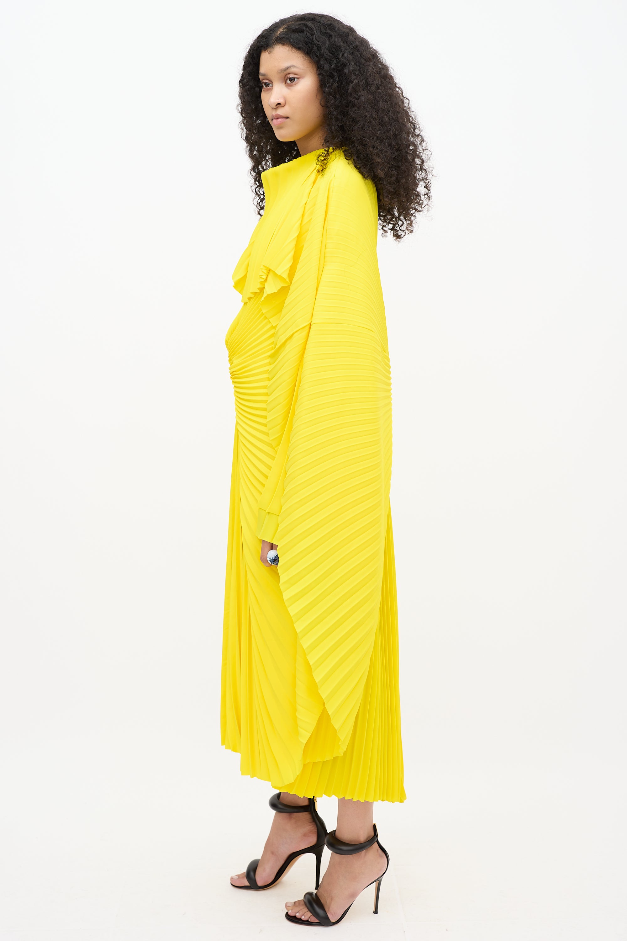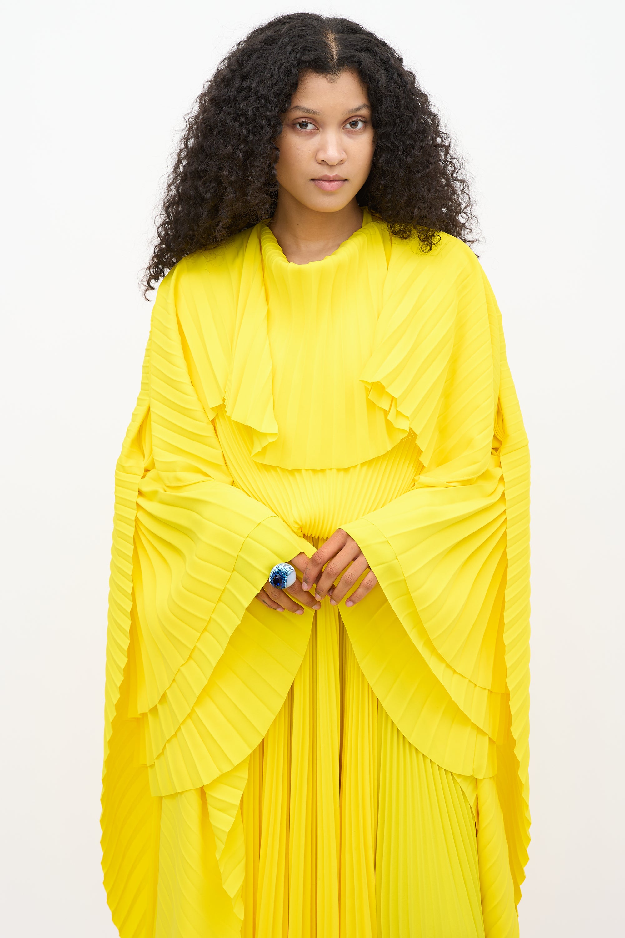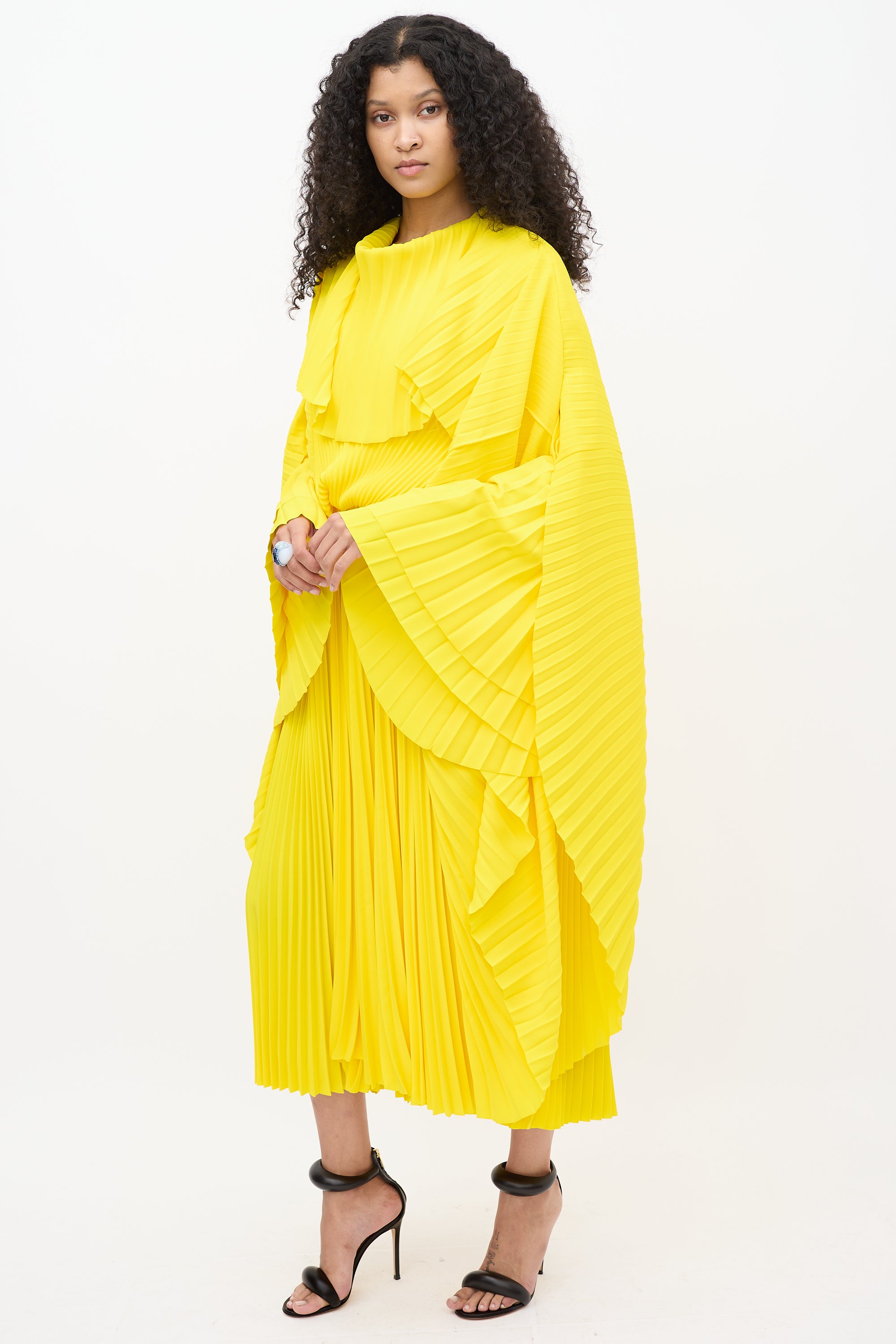 Resort 2022 Balenciaga yellow dress featuring pleated detailing throughout, round neckline, long cape sleeves, zip at shoulder, asymmetrical overlay, and zip closure at side. Lined. Look 3 from "Clones" runway collection.