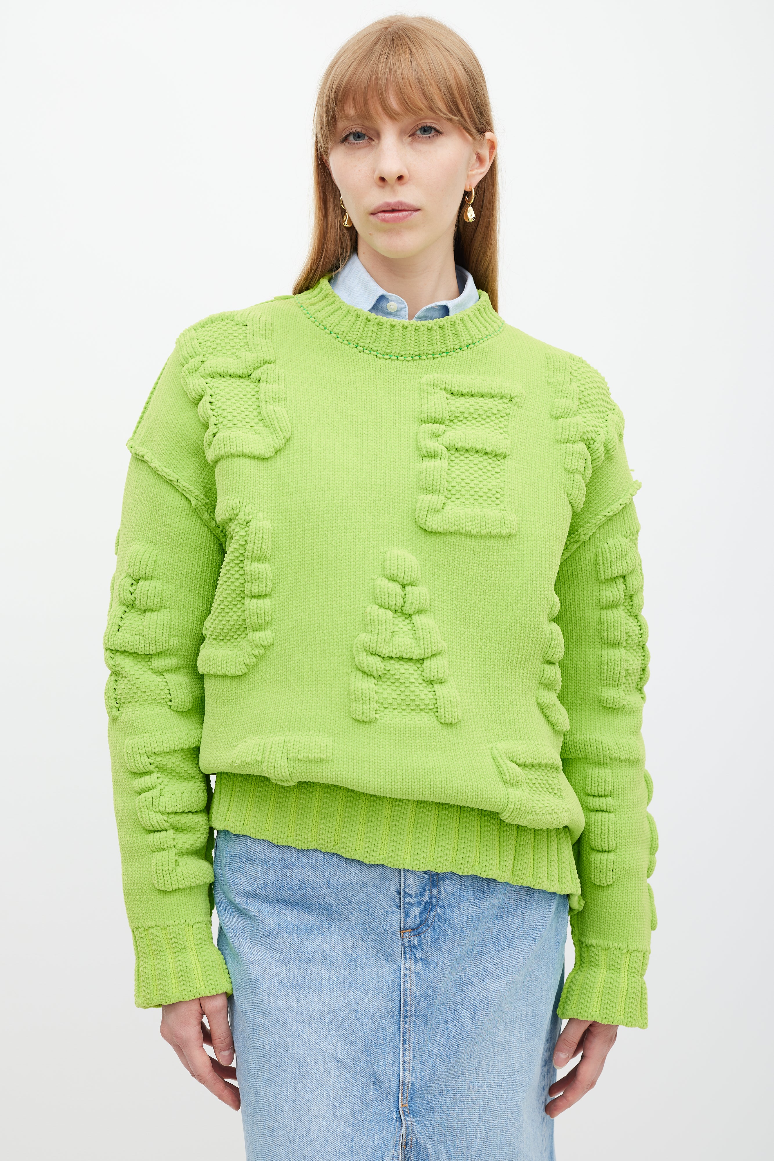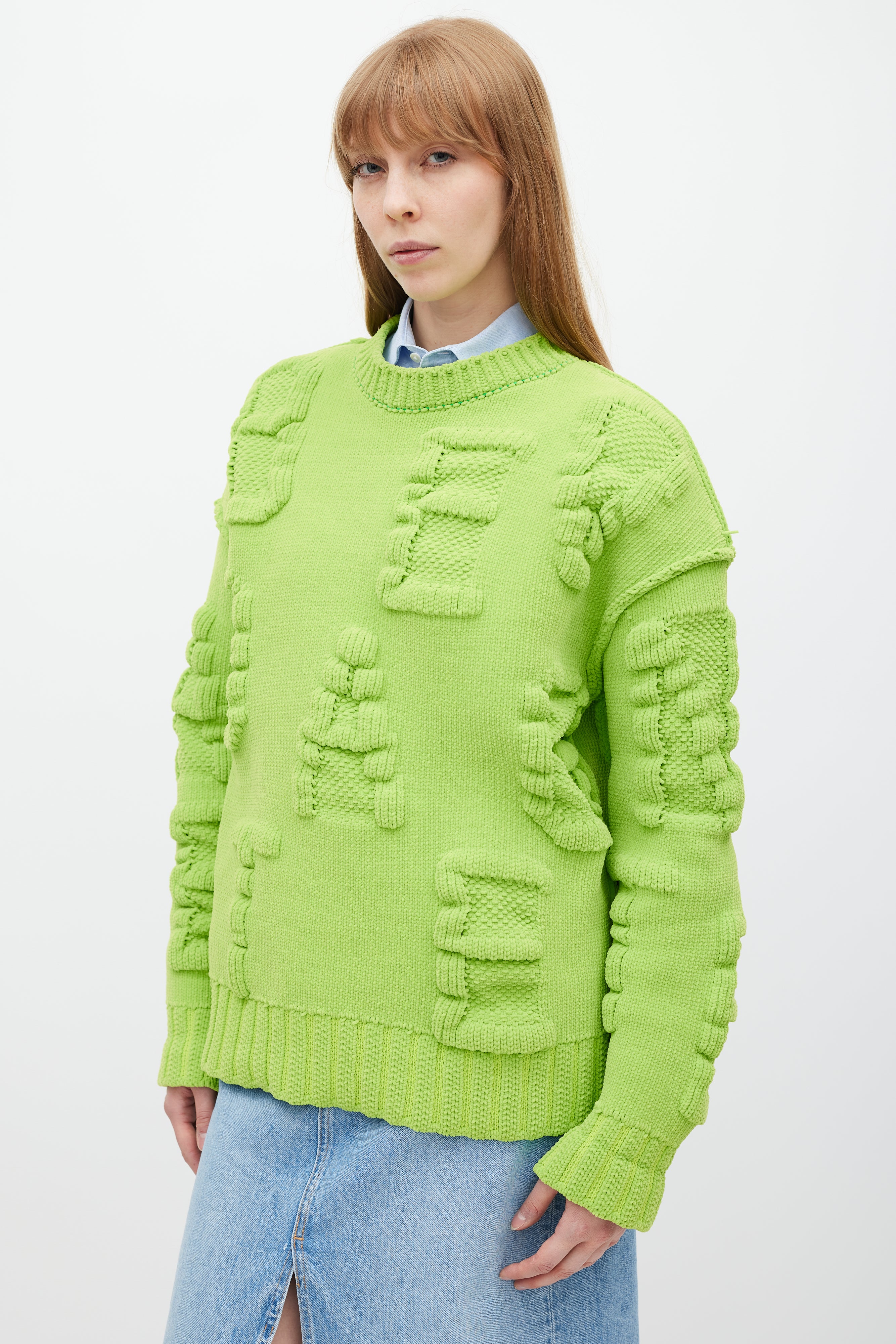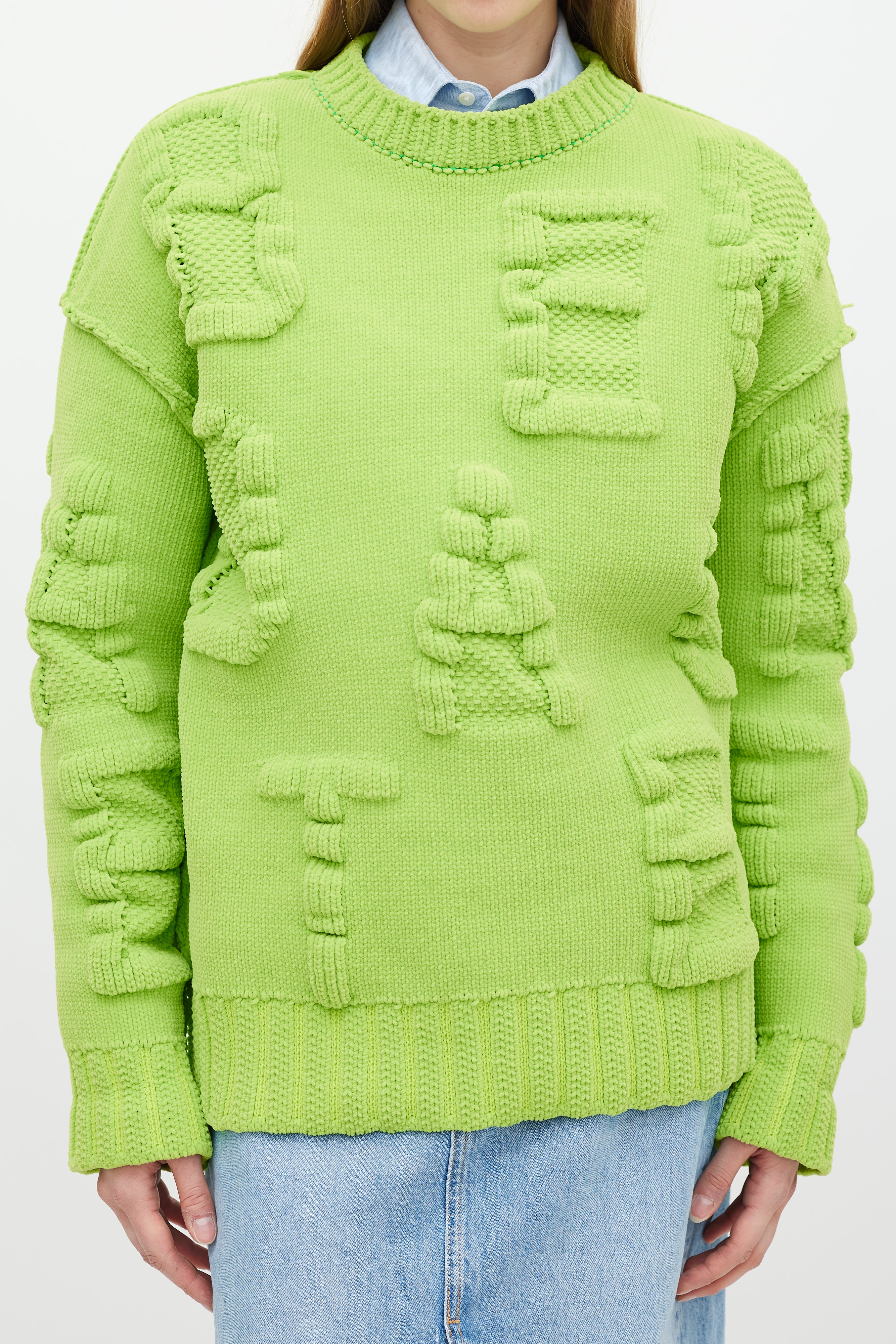 Pre-owned Bottega Veneta caterpillar green chenille Alphabet letter sweater featuring a round neck, 3D knit logo lettering throughout, inverted seams, long sleeves, and ribbing at neck, hem, and cuffs.