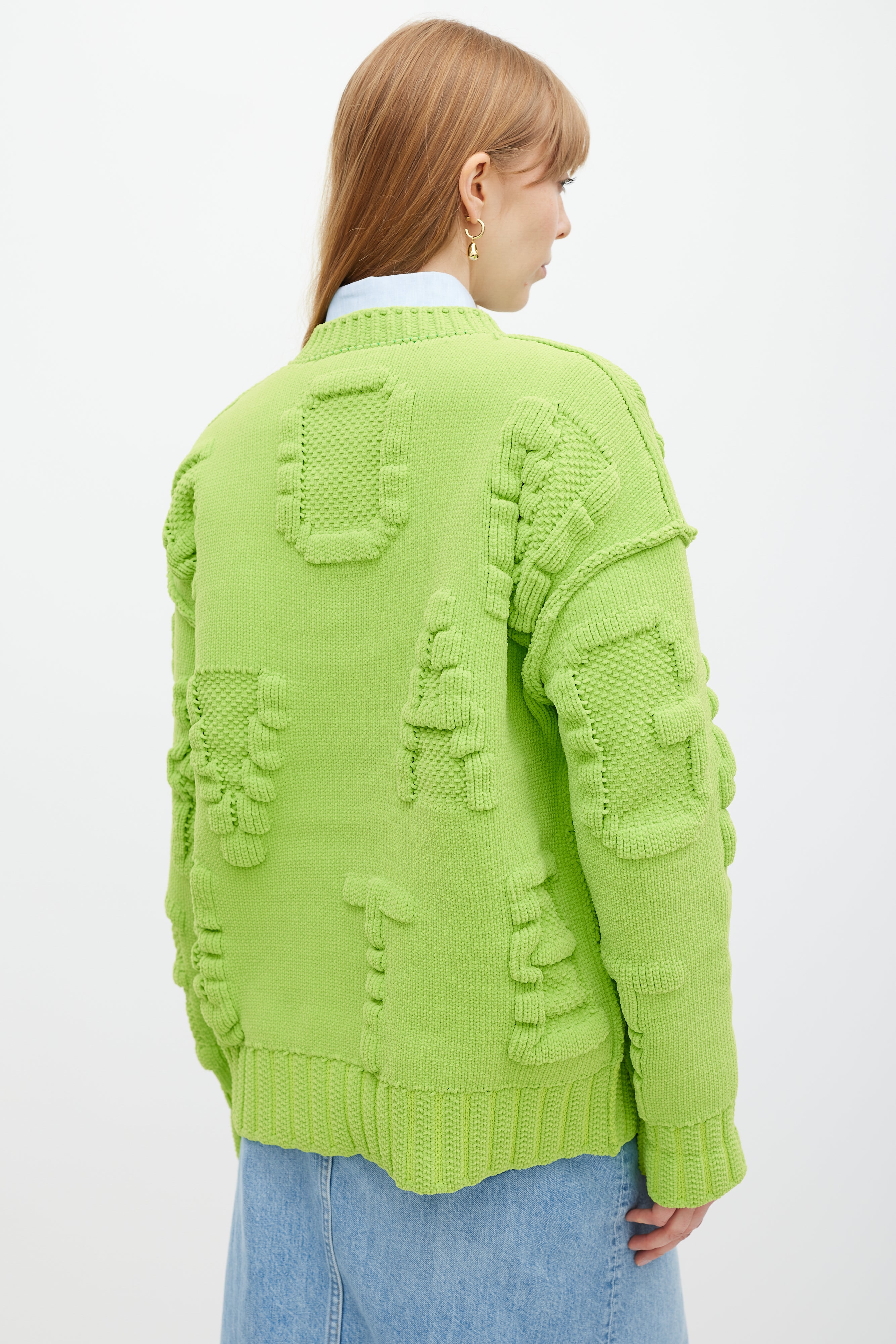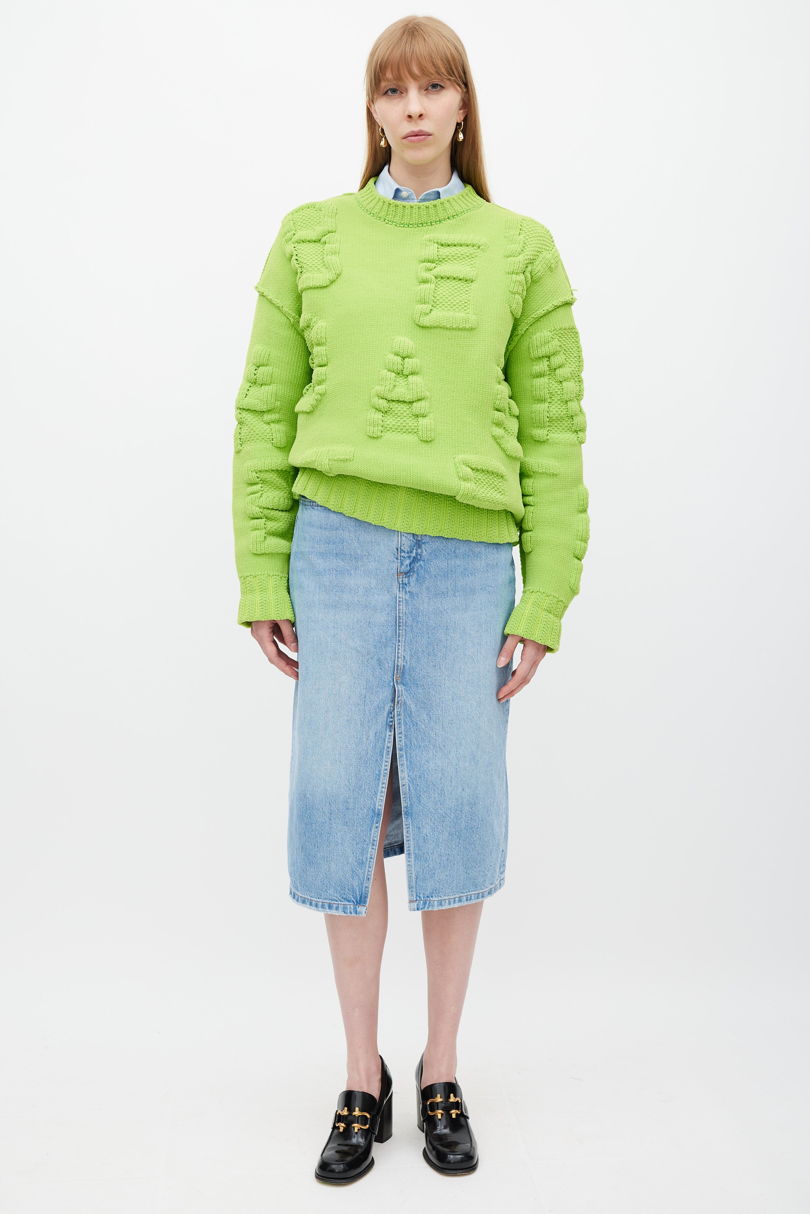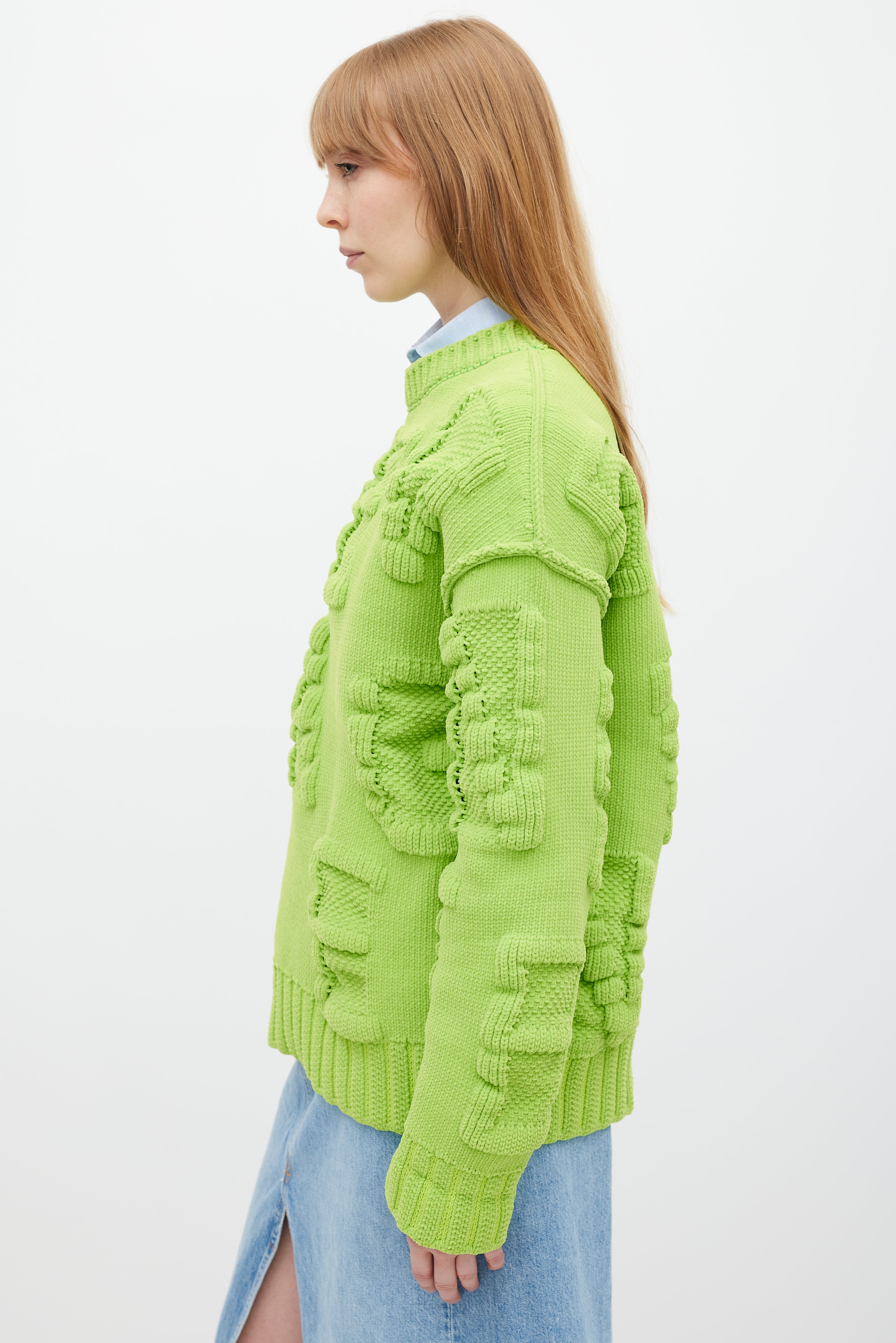 Pre-owned Bottega Veneta caterpillar green chenille Alphabet letter sweater featuring a round neck, 3D knit logo lettering throughout, inverted seams, long sleeves, and ribbing at neck, hem, and cuffs.