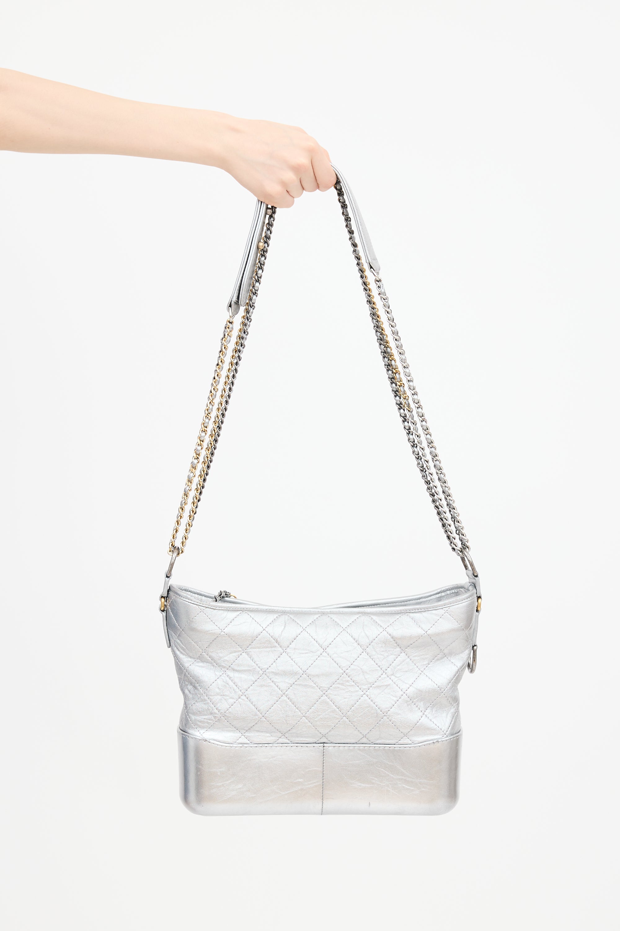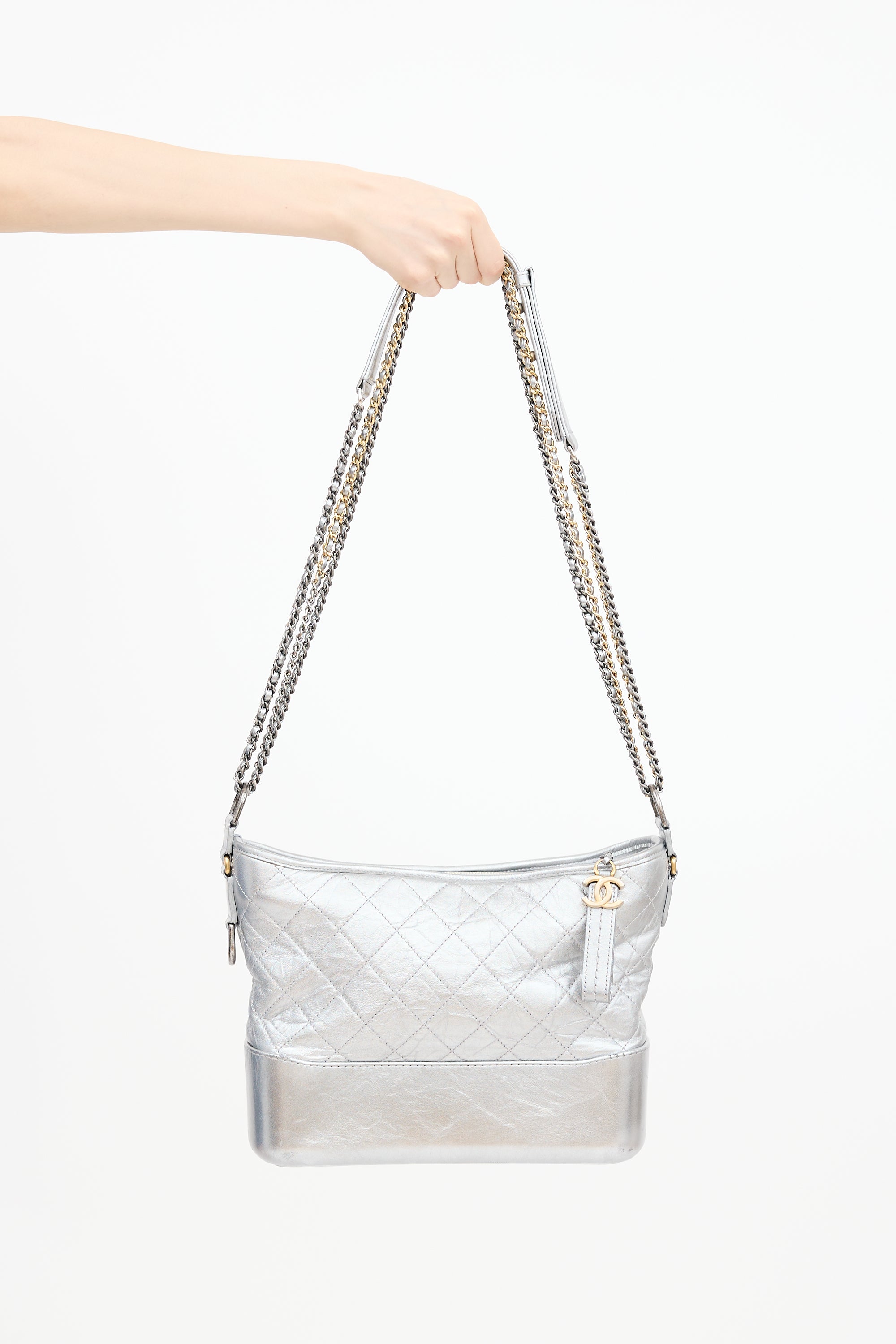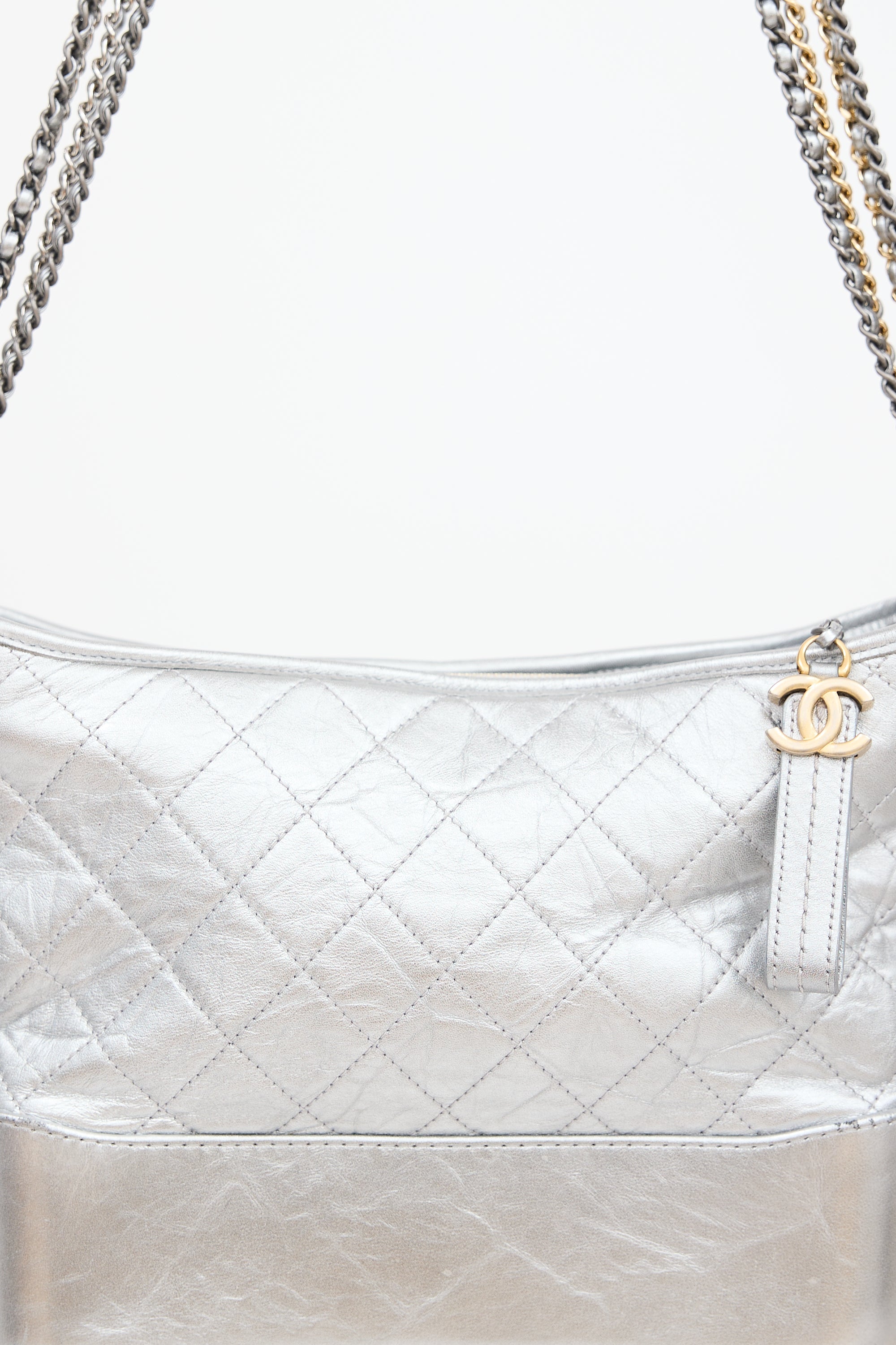 Pre-owned Chanel silver leather Gabrielle bag featuring diamond quilt stitching, three chain shoulder straps with one adjustable strap, top zip closure with CC logo hardware, and one lined main compartment with one zip pocket and two slip pockets. Comes with original dust bag and box.