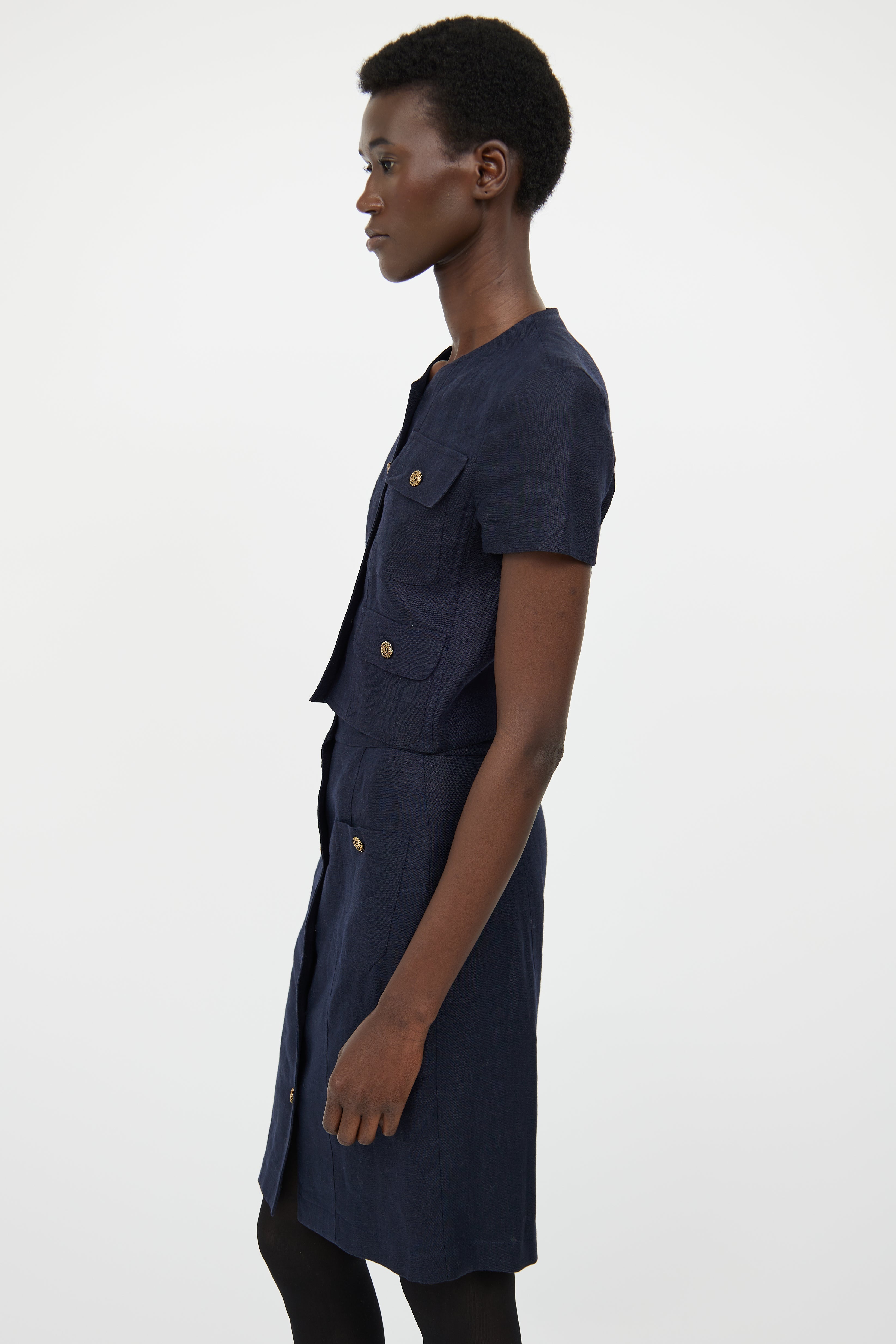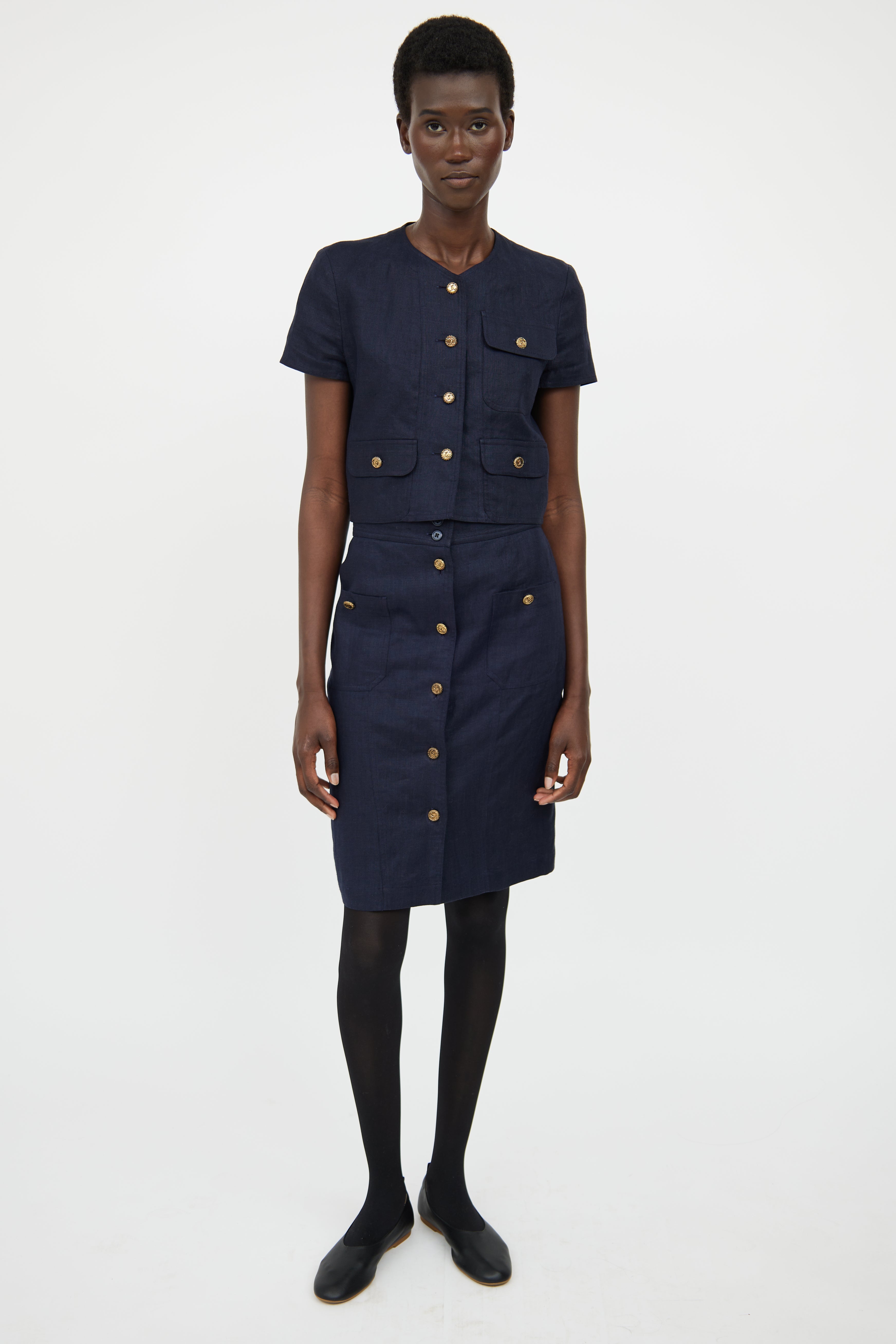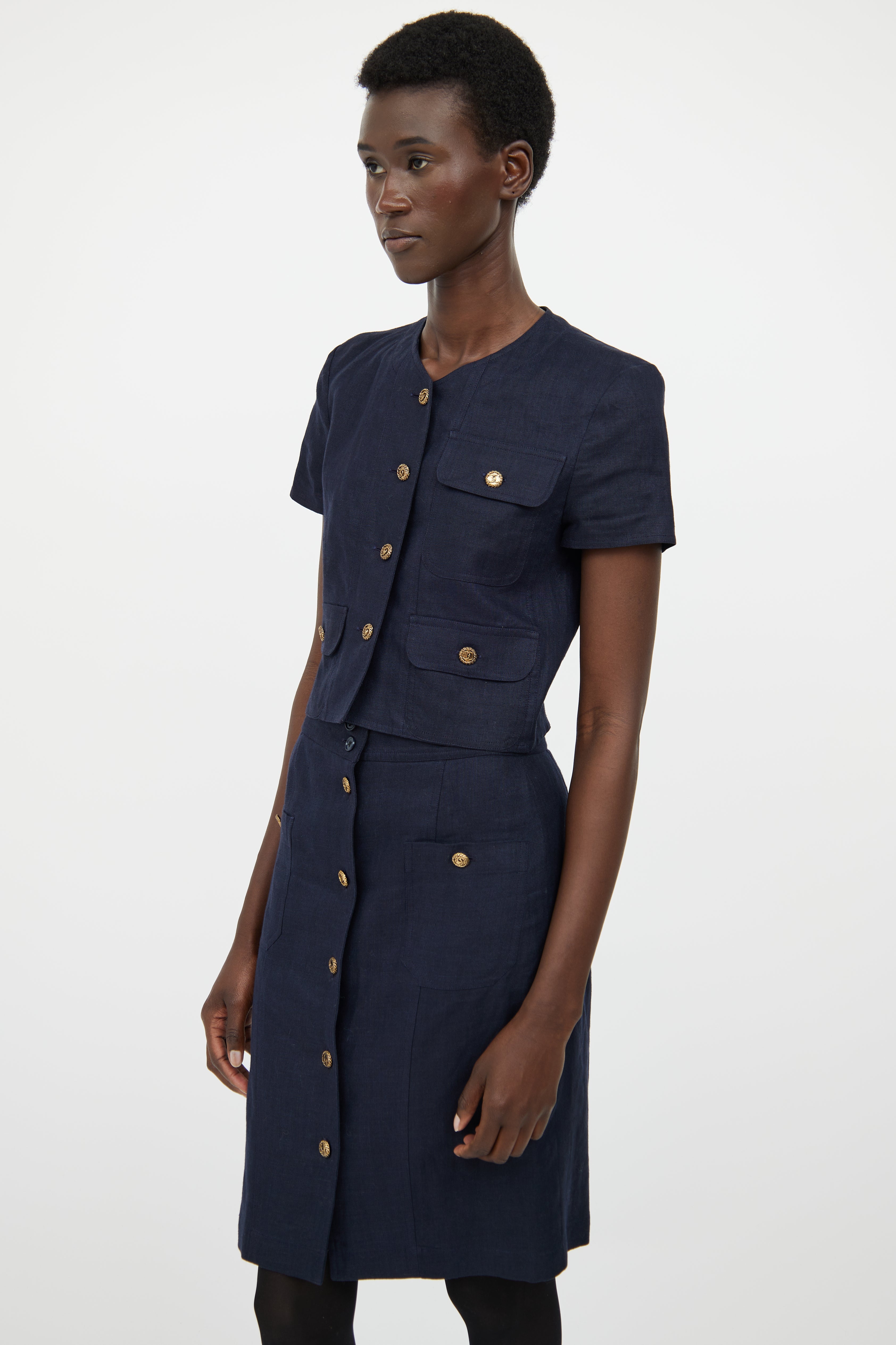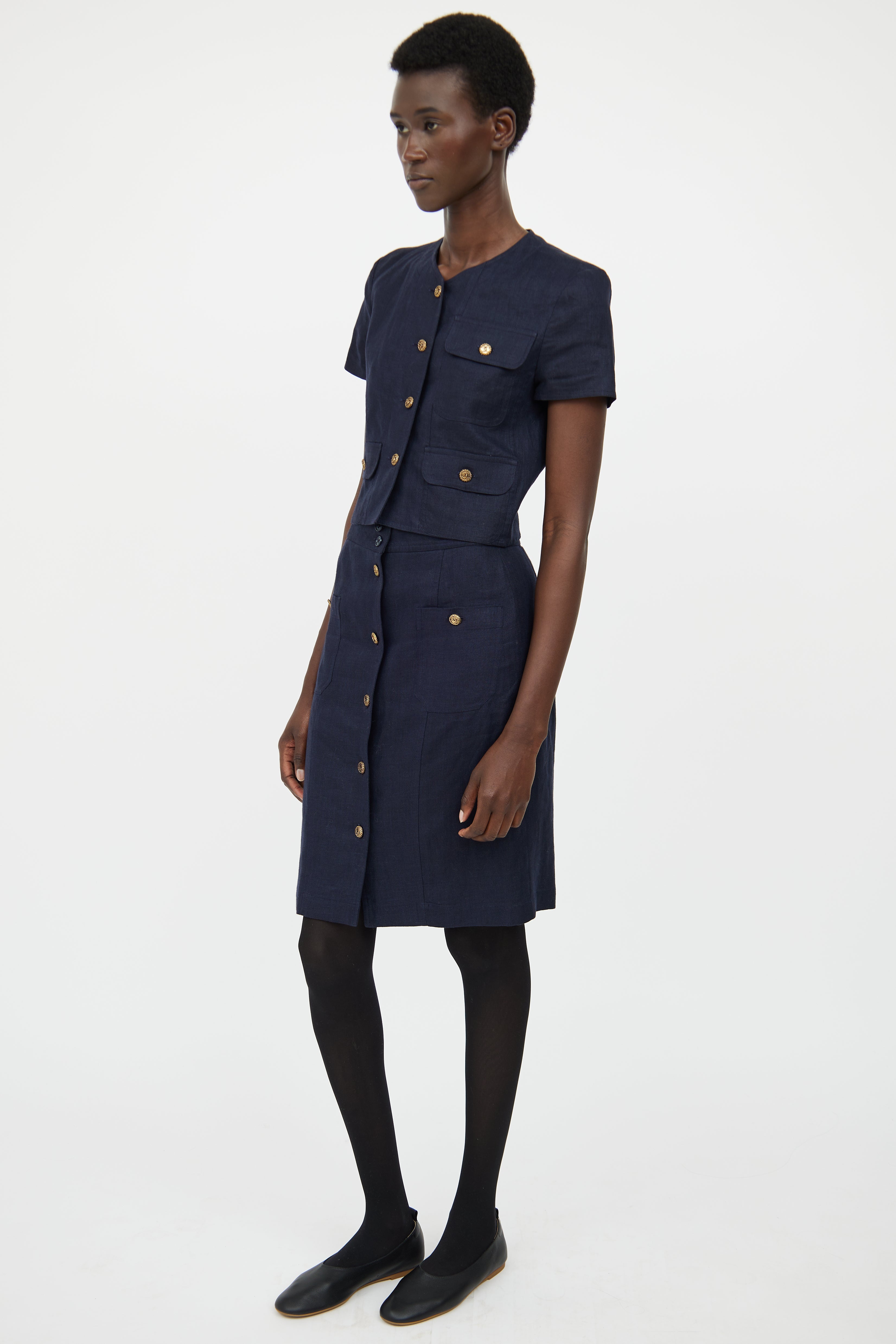 Pre-owned Chanel navy short sleeve top featuring round neckline, gold tone CC stamped button up, single flap pocket with button closure on left chest, and dual flap pockets with button closure on waist. Pencil skirt featuring waist band with navy button detail, gold tone CC stamped button up front, and dual slip pockets with button closure on front. Fully lined skirt.